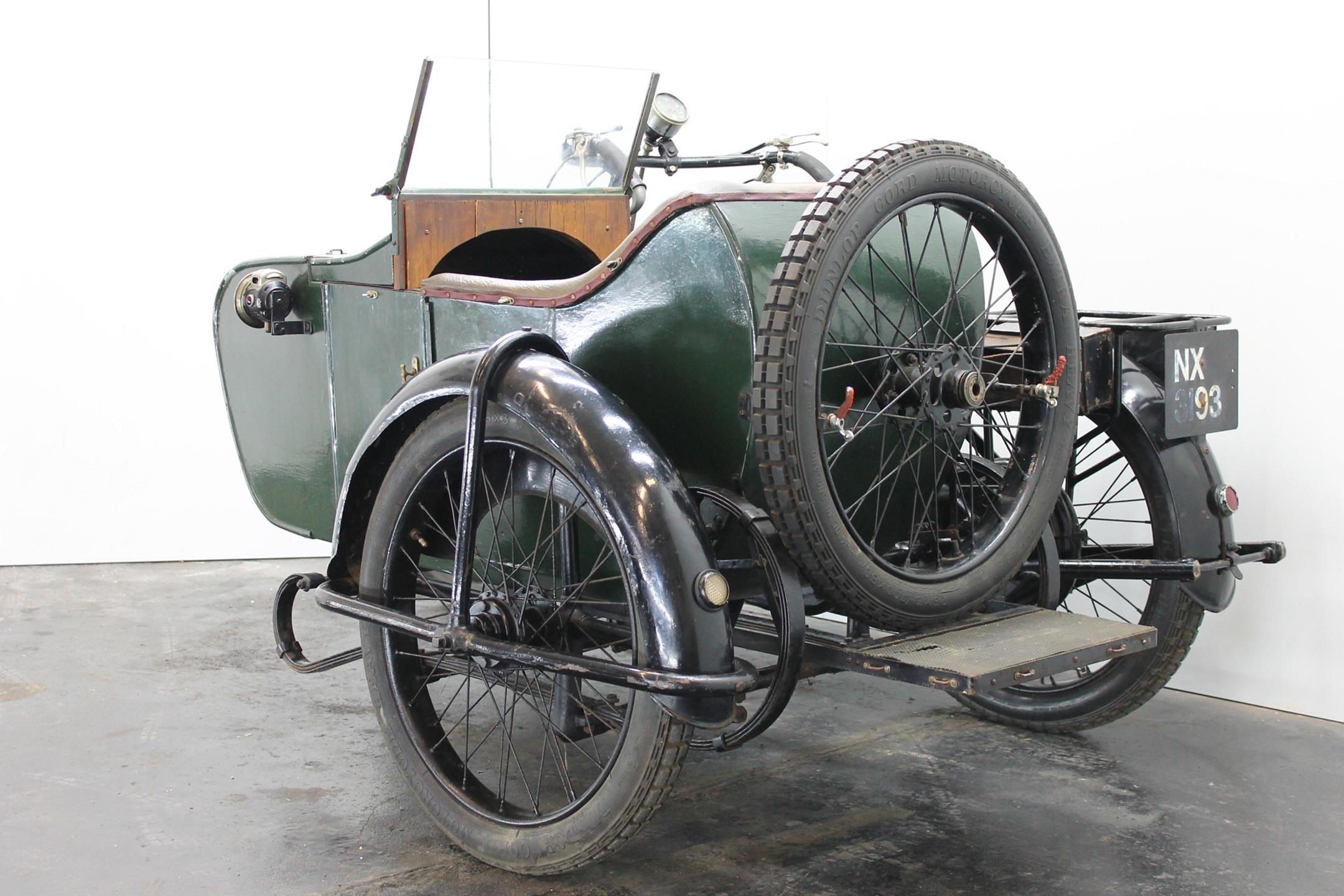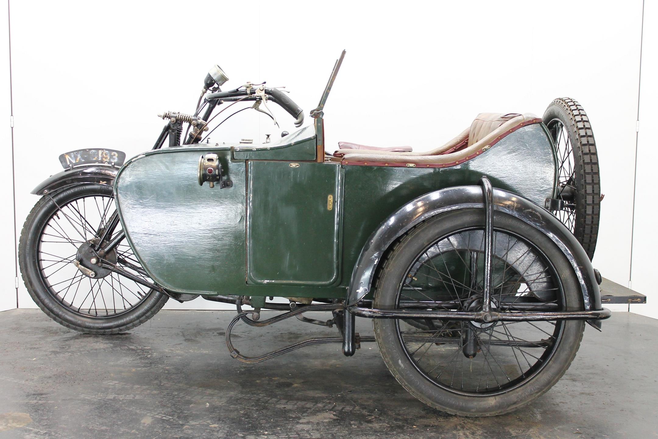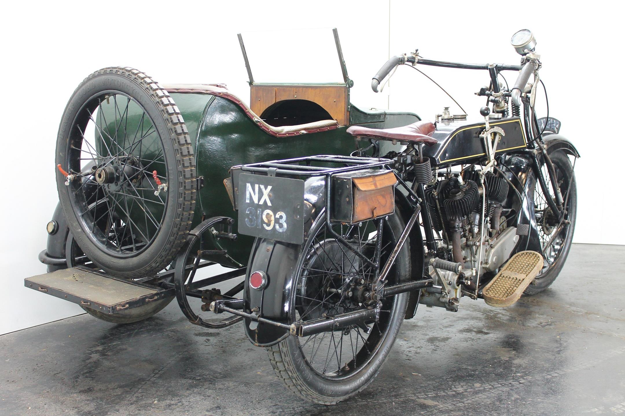 This comfortable 1924 AJS combination is fitted with a Amac carburetor, Smiths speedo, Thompson Bennet magneto and a spare wheel on the sidecar. This 800cc V-twin bears a lot of patina and is lovely running condition.