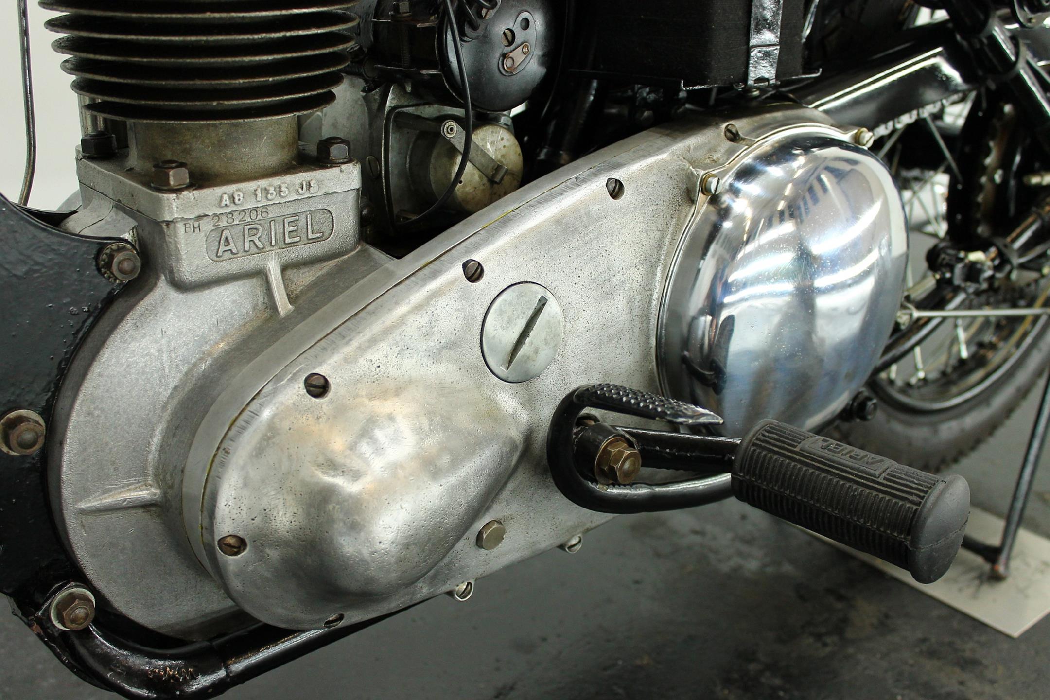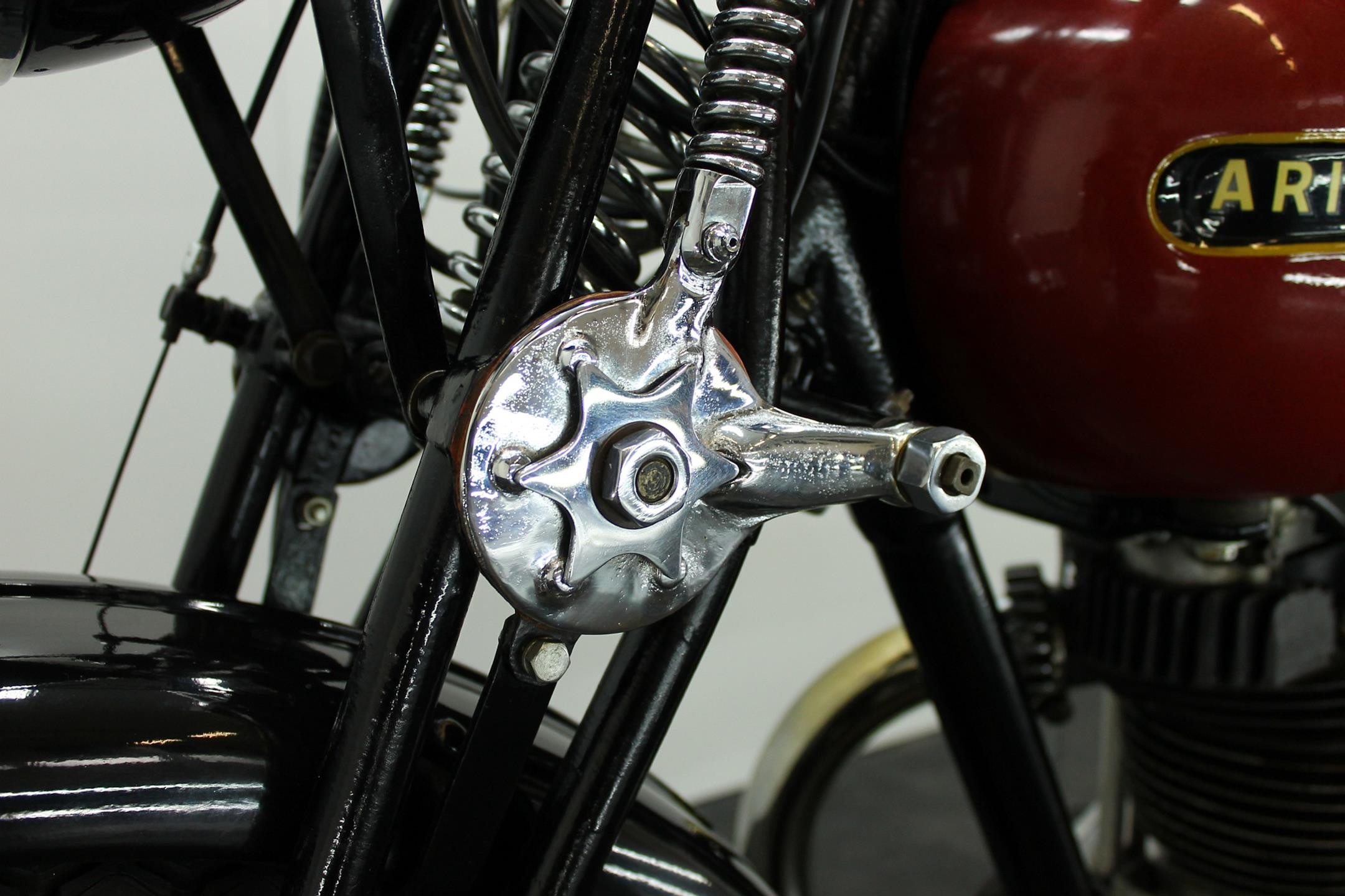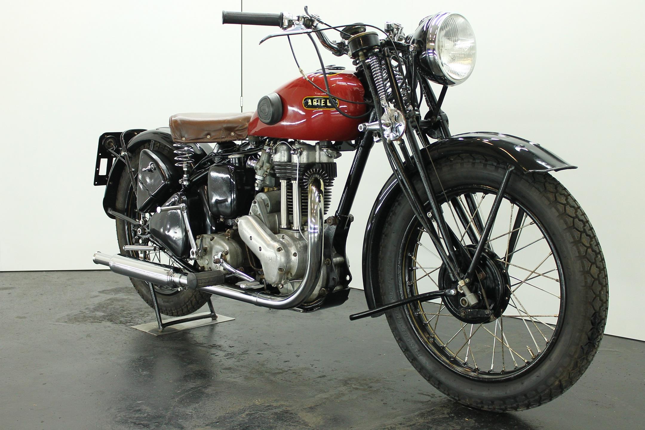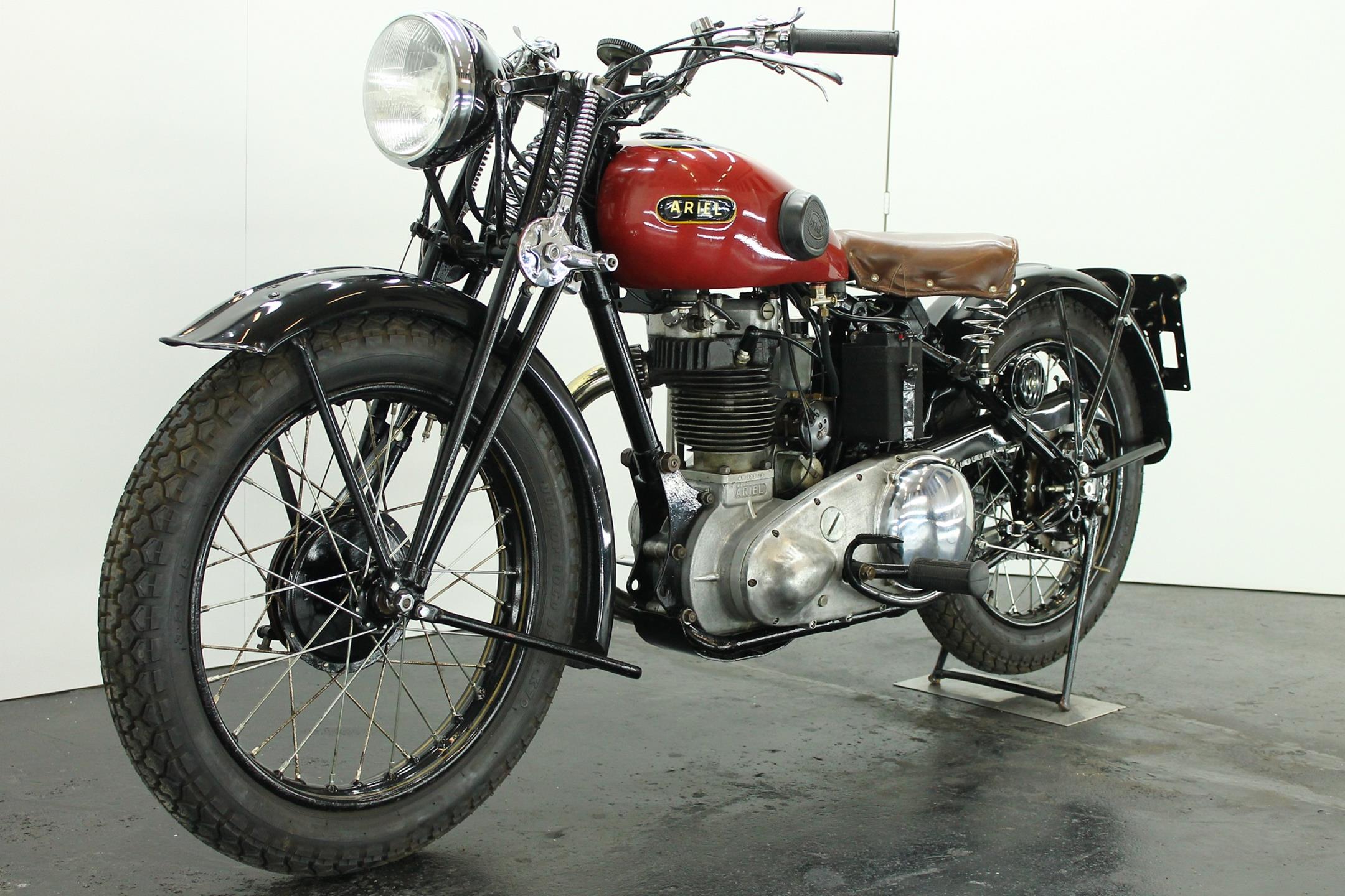 The Ariel W/NG entered service with the British Army in 1940. It was based on a racing version of the civilian Ariel NG. The French Army actually received a small number of early production models prior to the British Army. The French Ariel W/NGs were all found in their original shipping crates in a warehouse in Ostend, France in 1945. They were returned to England and sold as surplus shortly after the end of World War II. The military Ariel W/NGs were manufactured with increased ground clearance as well as modifications to a number of internal and external components. The crankcase, gearbox, chain-case cover and timing-cover were produced in pressed-steel as opposed to light-alloys used in the civilian models (light-alloys became a priority material in the production of military aircraft). The dry-clutch had an extra plate added to increase durability. The rear sub-frame was altered to lower the rear wheel and the front fork girders were extended, resulting in the Ariel W/NG’s aforementioned increased ground clearance. These modifications and the W/NG’s relatively light weight resulted in very good off-road performance. The Ariel W/NG was produced in large numbers for the British Army, Navy and Home Guard units. VH & VG (500 OHV singles), NH & NG (350 OHV singles), and even the VB (598 cc or 36.5 cu in SV single) models were put into military service. Ariel produced the model W/NG from 1940-44.