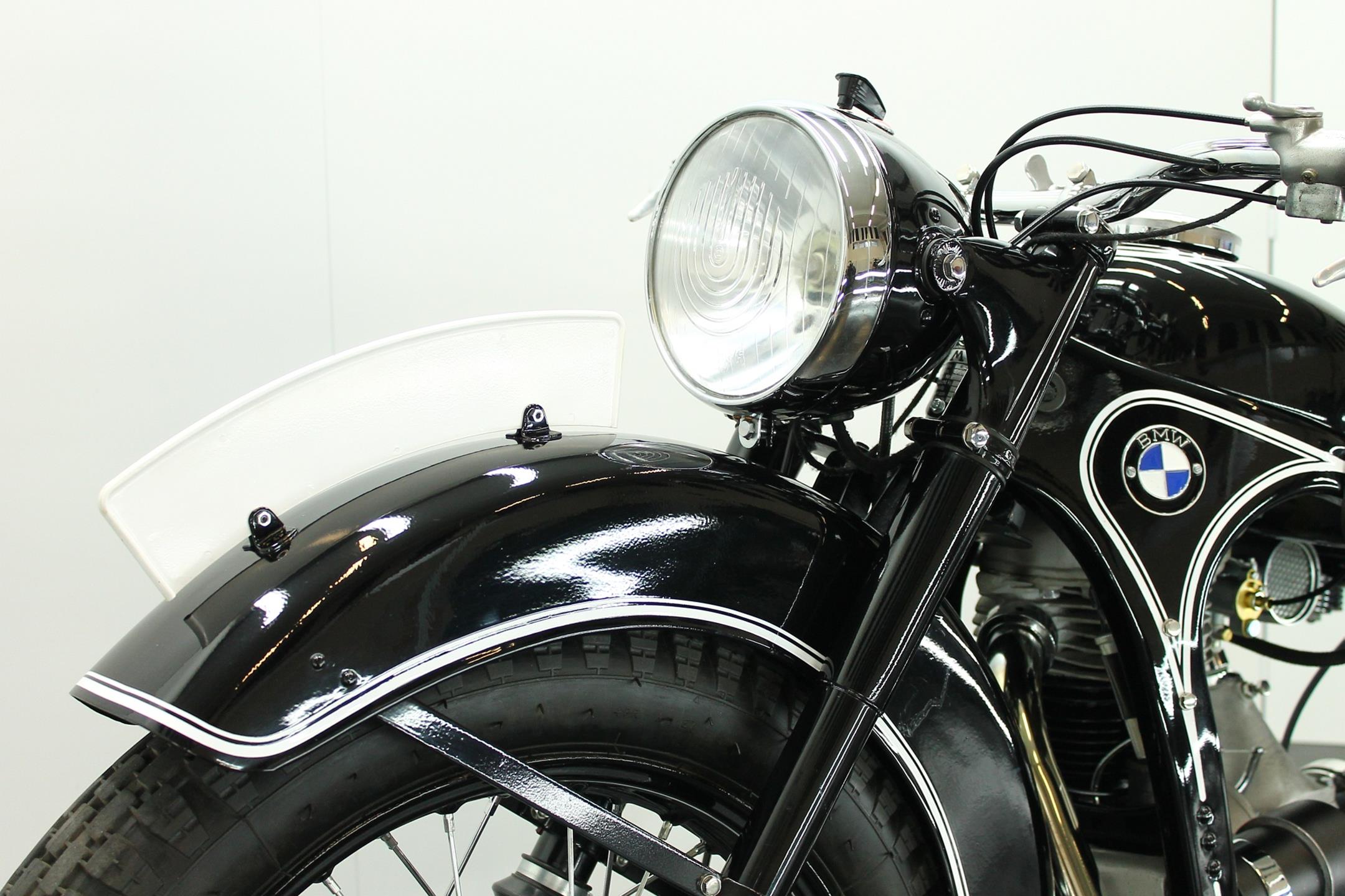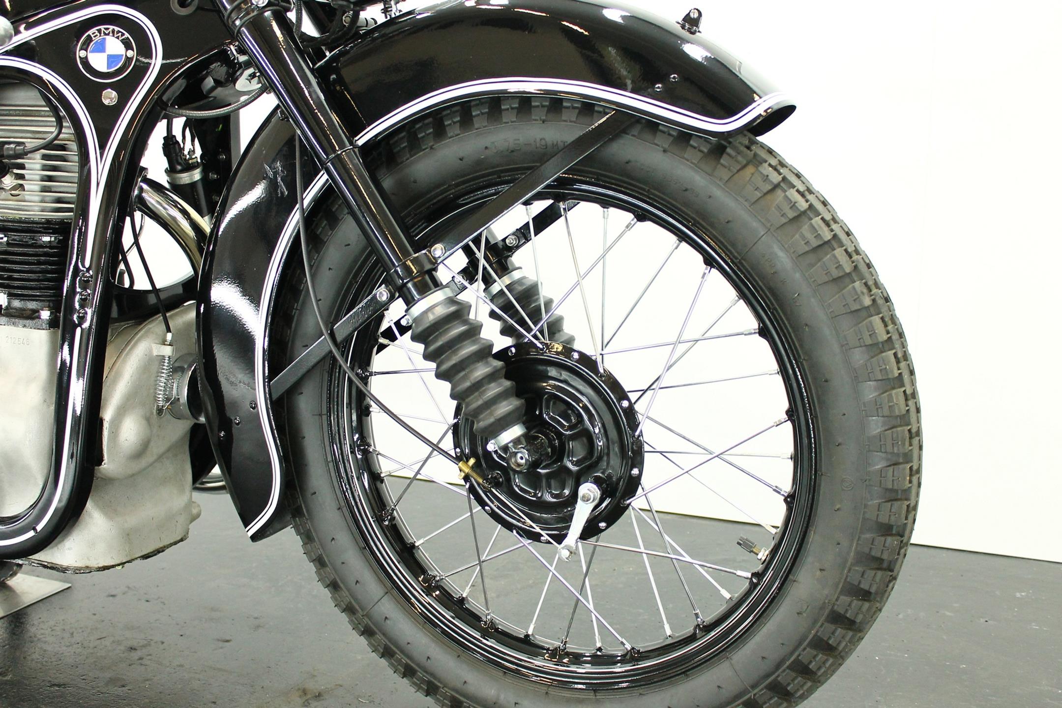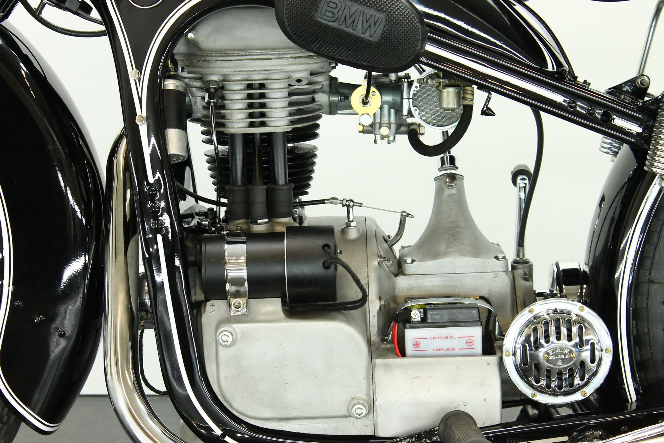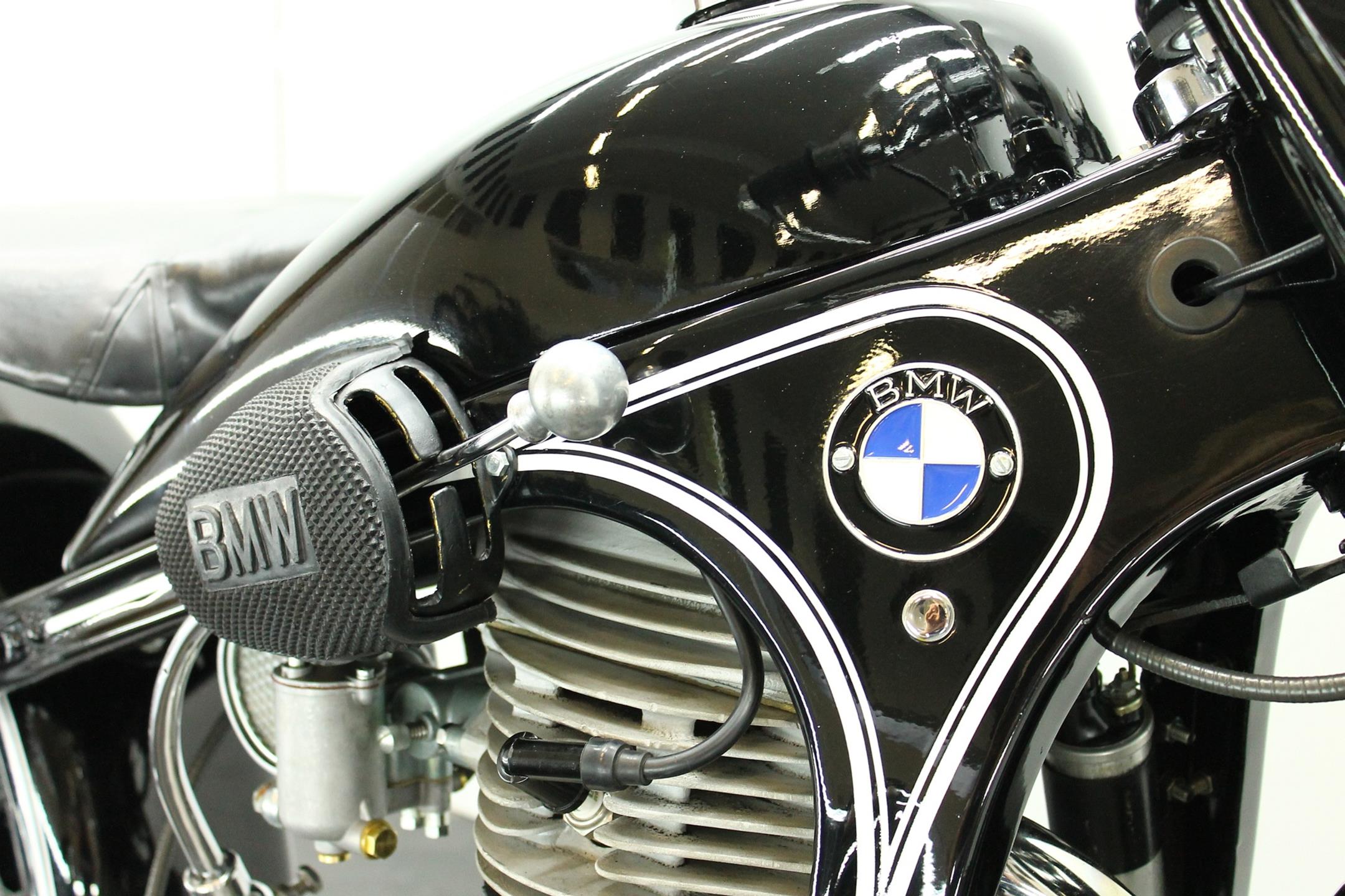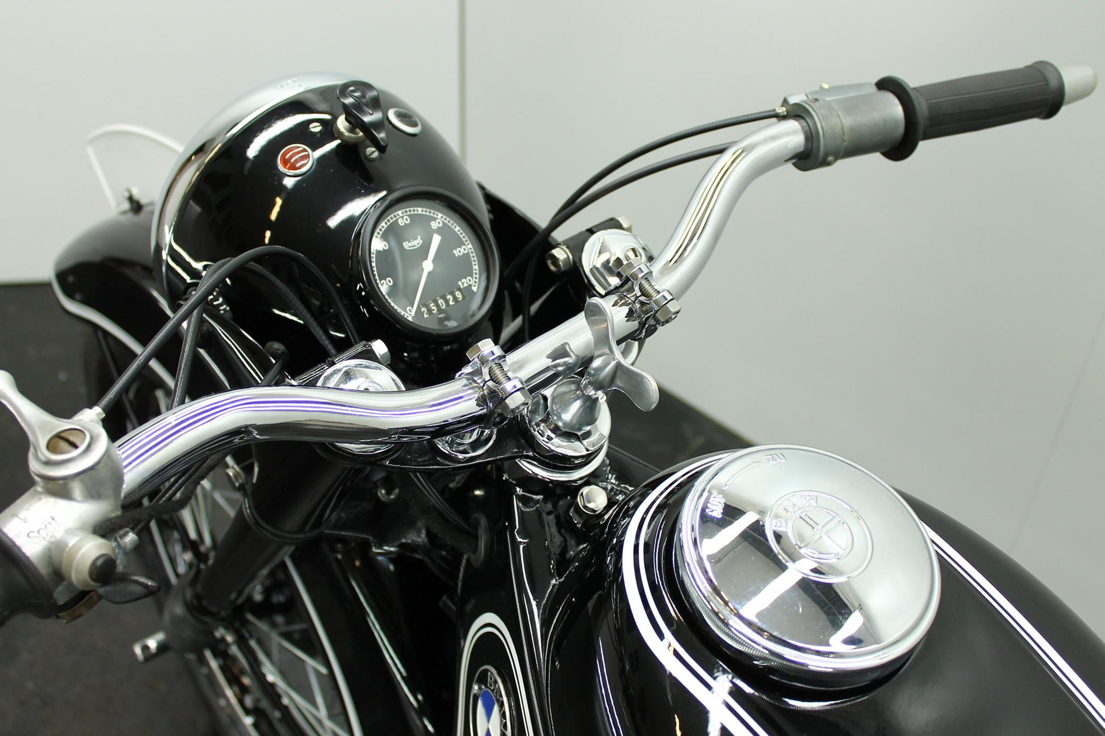 The BMW is a nice older restoration. This well running motorcycle is equipped with a complete Bosch electrics and a Veigel speedo.
