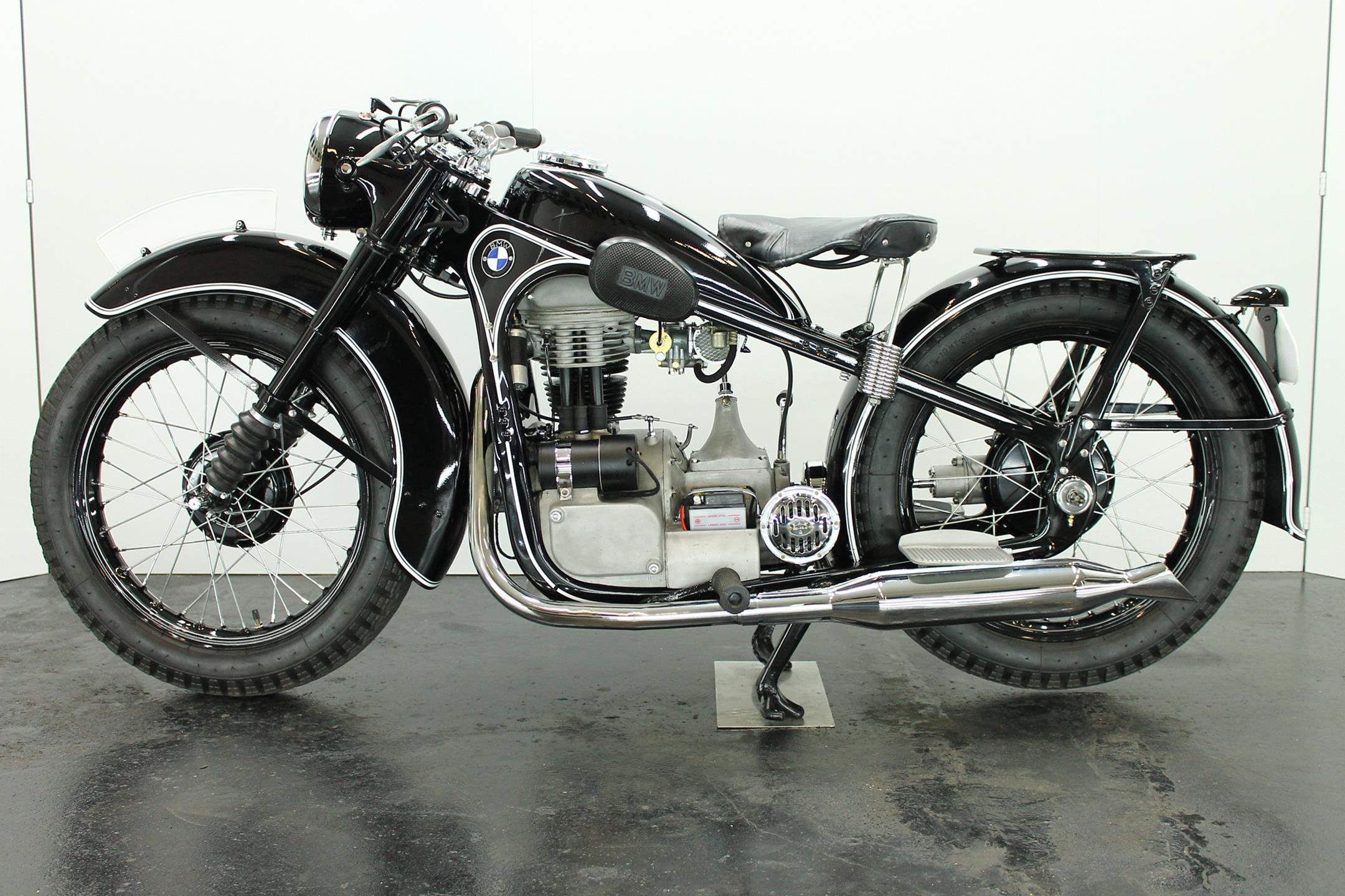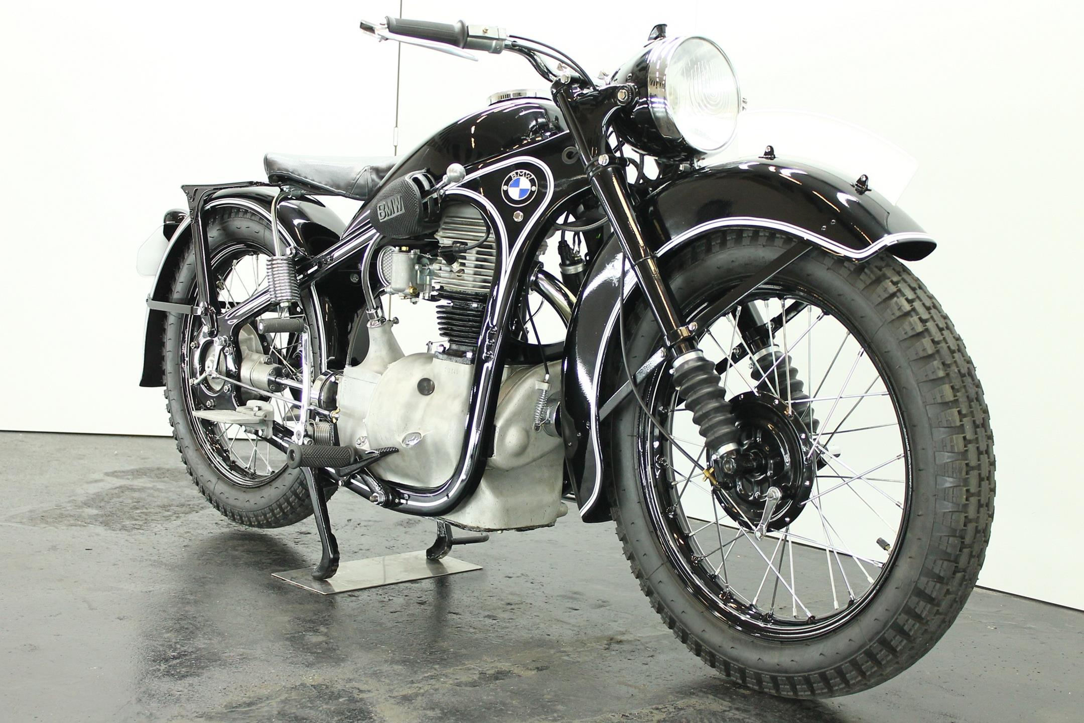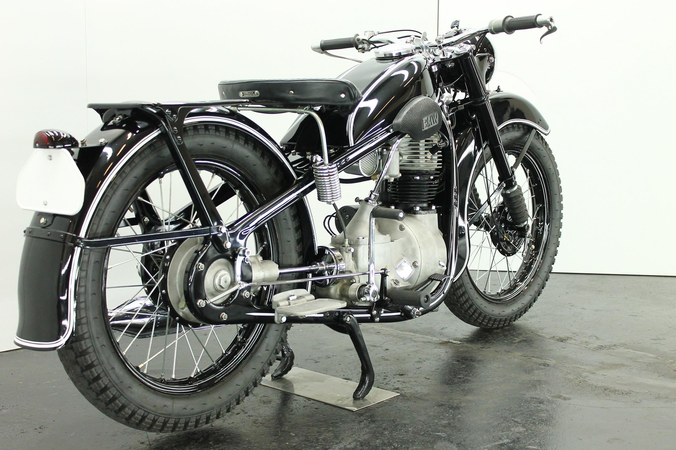 After World War II, BMW no longer made R35 motorcycles. "Eisenacher Motorenwerk" (EMW) was an East German manufacturer of automobiles and motorcycles based in Eisenach, then East Germany. It made R35s essentially identical to the pre-war BMW R35. One of the pre-World-War-II BMW factories was located in Eisenach, which after the war was taken over by the Soviets as it was located in the Soviet occupation zone. The factory continued producing cars and motorcycles using the BMW logo, but after a lawsuit in 1952 it had to change the name to EMW instead. The EMW logo was also similar, but instead of the blue BMW used, EMW used red. After the R3 with its 300cc engine had enjoyed very little commercial success, BMW introduced a new single-cylinder model in 1937, the R35. Its engine was derived from the 400cc R4, but by reducing the bore the displacement was decreased to 350cc. The R35 also developed 14 horsepower and like the R4 had a top speed of 100km/h. The suspension had in the meantime been modernized. The frame was still made from massive-looking pressed steel sections but the antiquated leaf spring at the front was now replaced by a modern telescopic fork. In contrast to the exclusive "Boxer" models, however, there was no hydraulic damping. By the close of production, the R35 was the most successful model in BMW's motorcycle history and when you see the bikes today, it's easy to understand where the appeal lies.