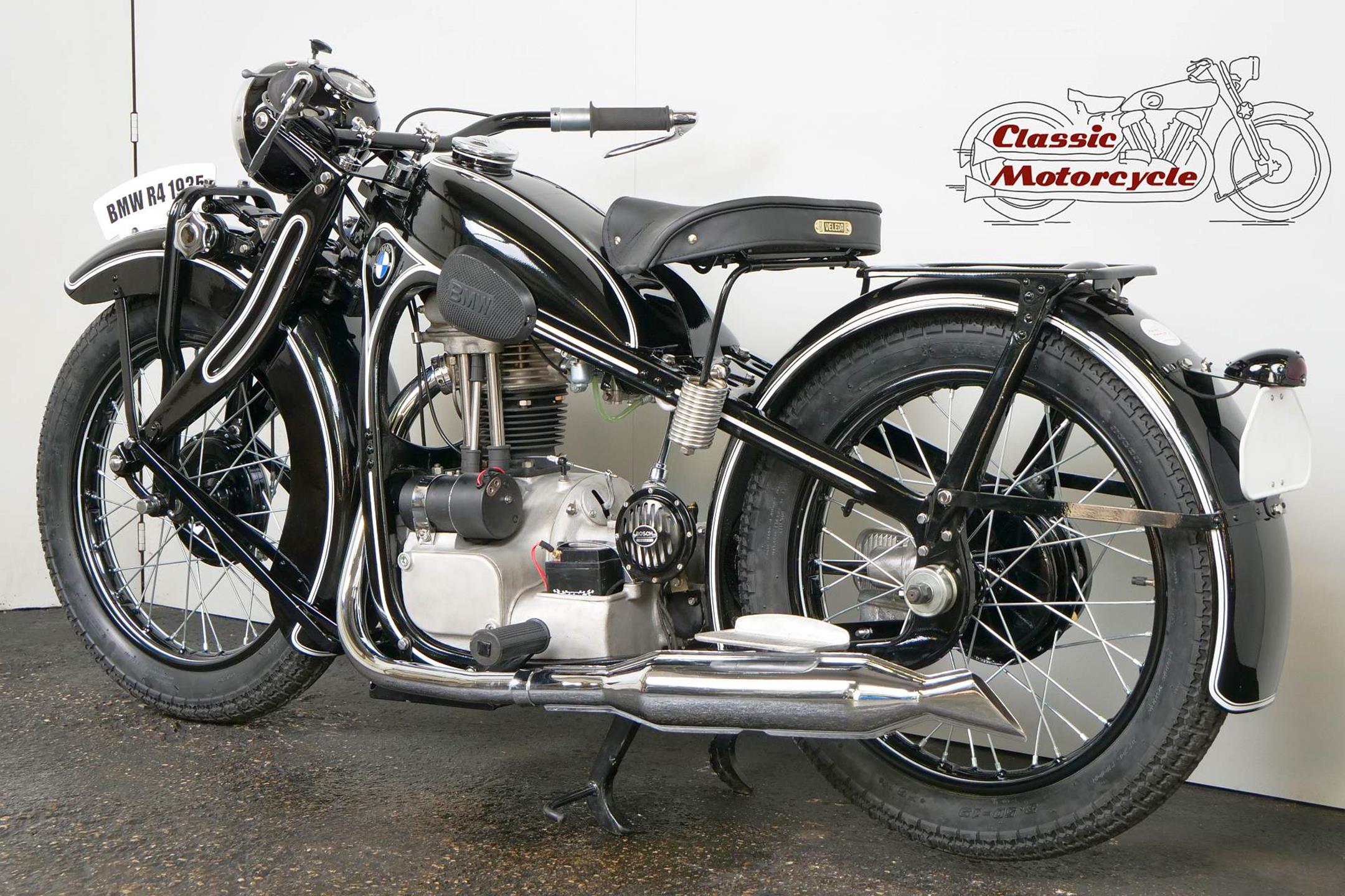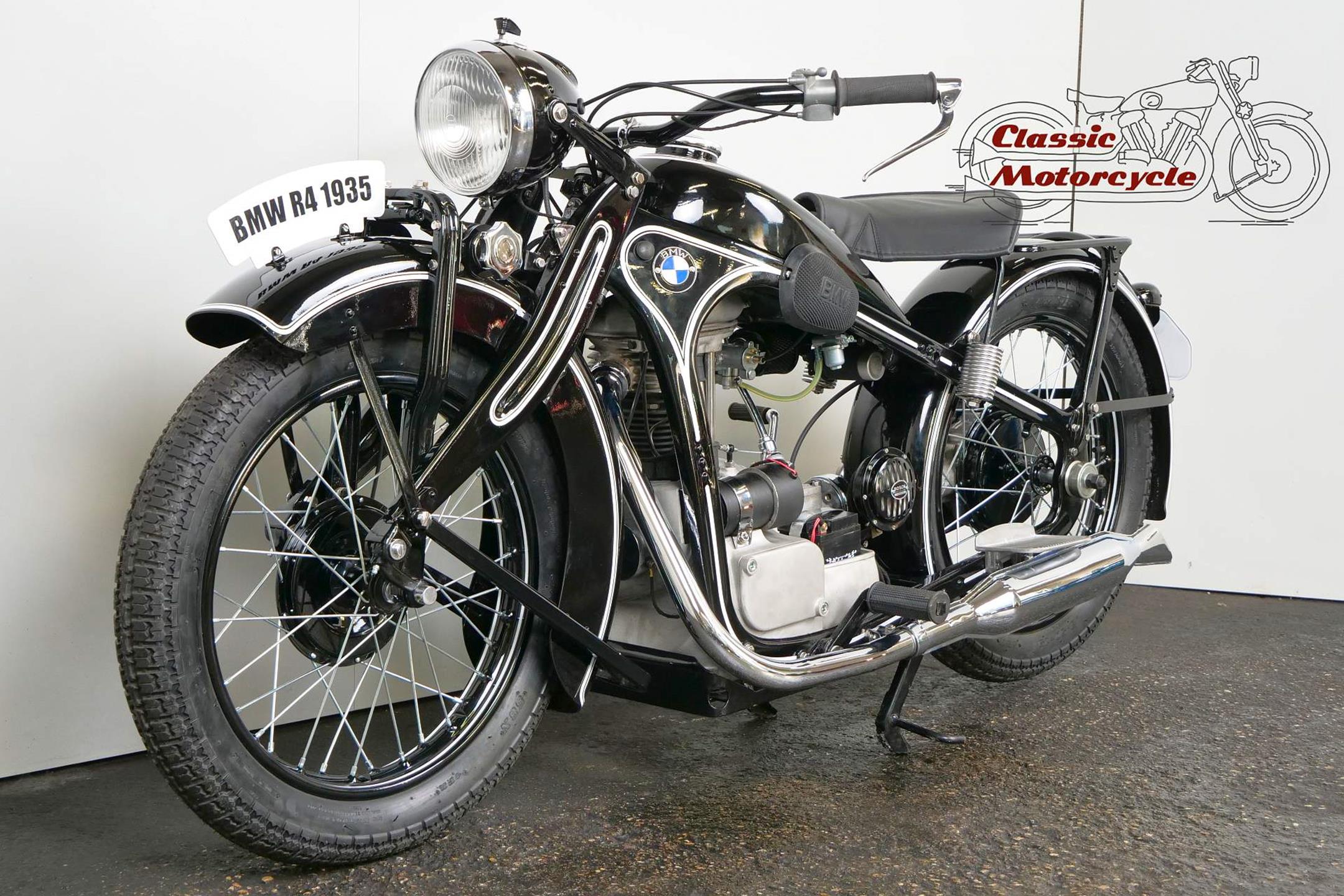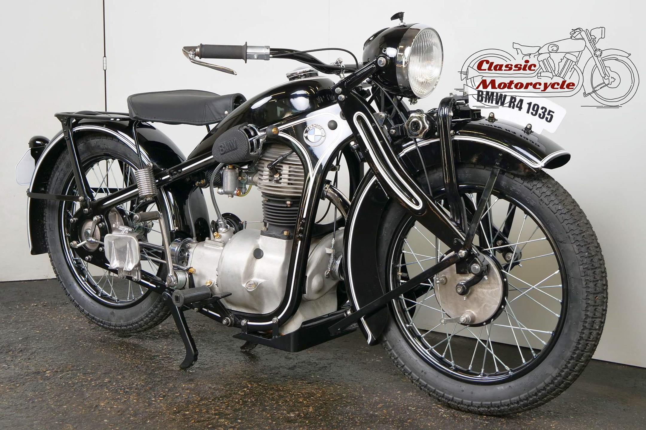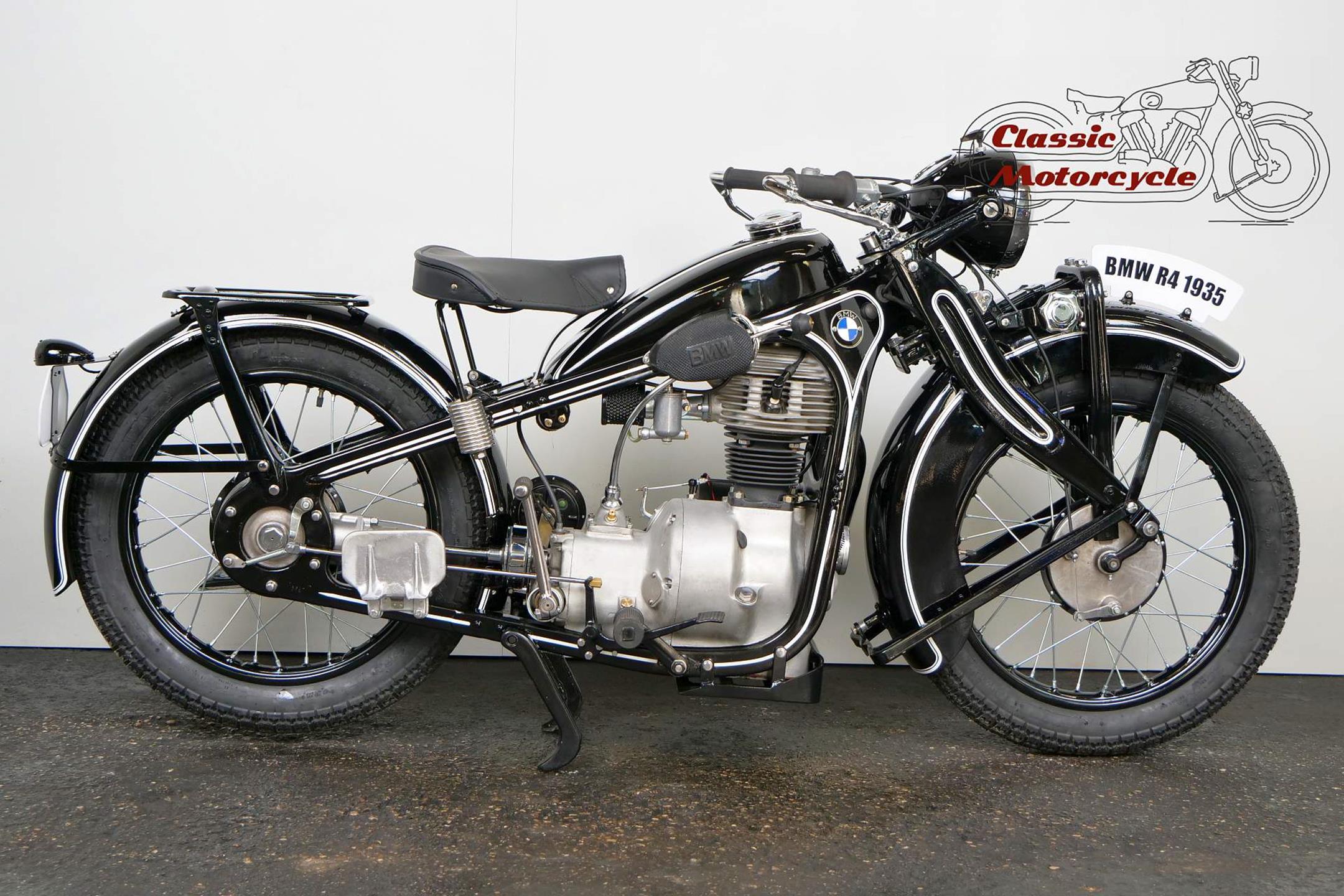 Introduced in 1932 and intended to bridge the gap between the 'budget' BMW R2 198cc single and the expensive twins, the R4 looked much like the former, whose channel-section steel frame and running gear it used almost unaltered. The 398cc overhead-valve engine featured enclosed valve gear and produced 12bhp, gaining an extra two horsepower in 1933 when the BMW R4 was updated to Series 2 specification with revised styling and a four-speed gearbox. A new cylinder head, tidier engine casings and changes to the toolbox and generator locations were introduced as the rugged R4 - a favourite with police forces and the German Army - progressed through to Series 5 before production ceased in 1936. BMW produced 15,295 R4 motorcycles using innovative mass production techniques, setting new standards of design and quality. Pressed steel frame and components were quick and easy to stamp out and assemble, reducing manufacturing costs.