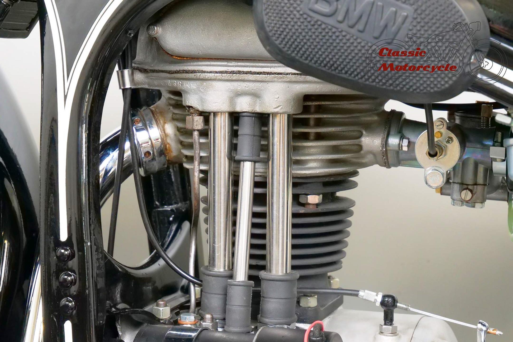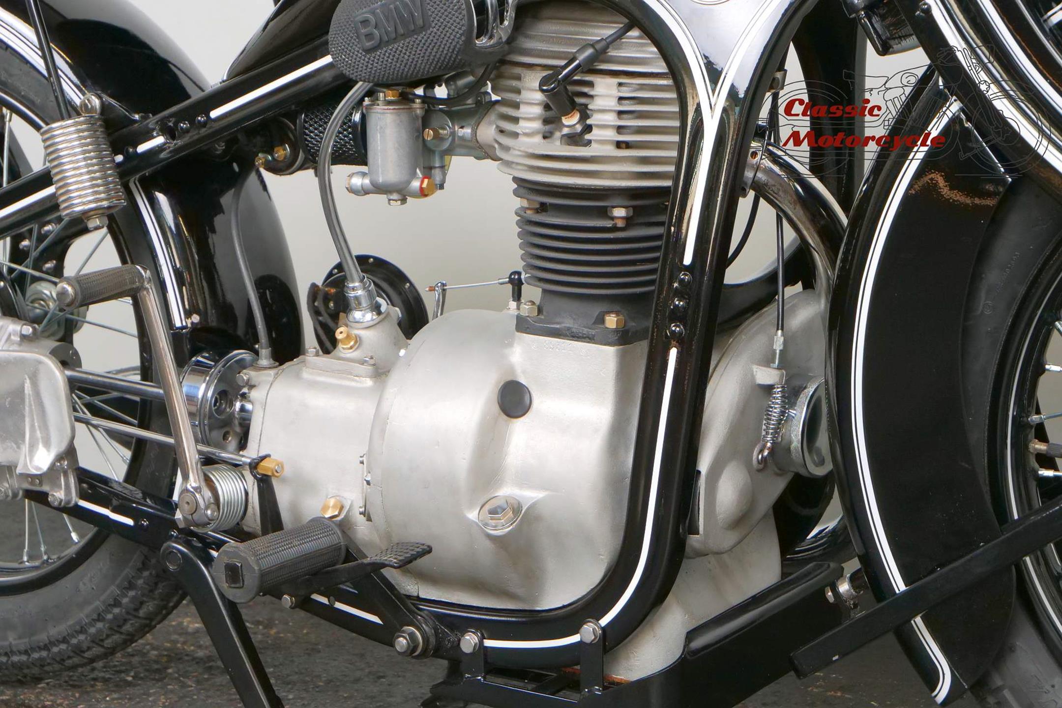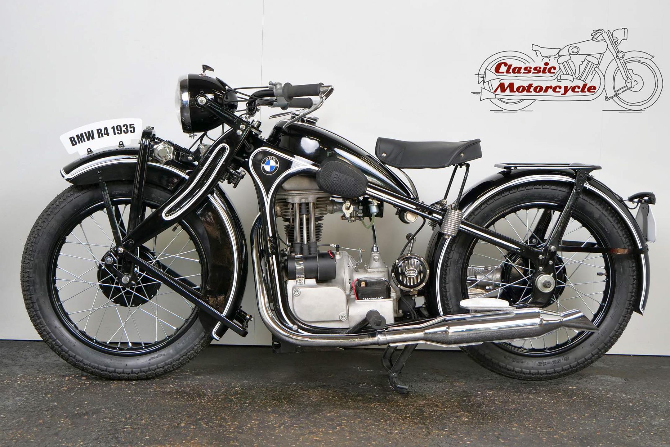 Introduced in 1932 and intended to bridge the gap between the 'budget' BMW R2 198cc single and the expensive twins, the R4 looked much like the former, whose channel-section steel frame and running gear it used almost unaltered. The 398cc overhead-valve engine featured enclosed valve gear and produced 12bhp, gaining an extra two horsepower in 1933 when the BMW R4 was updated to Series 2 specification with revised styling and a four-speed gearbox. A new cylinder head, tidier engine casings and changes to the toolbox and generator locations were introduced as the rugged R4 - a favourite with police forces and the German Army - progressed through to Series 5 before production ceased in 1936. BMW produced 15,295 R4 motorcycles using innovative mass production techniques, setting new standards of design and quality. Pressed steel frame and components were quick and easy to stamp out and assemble, reducing manufacturing costs.