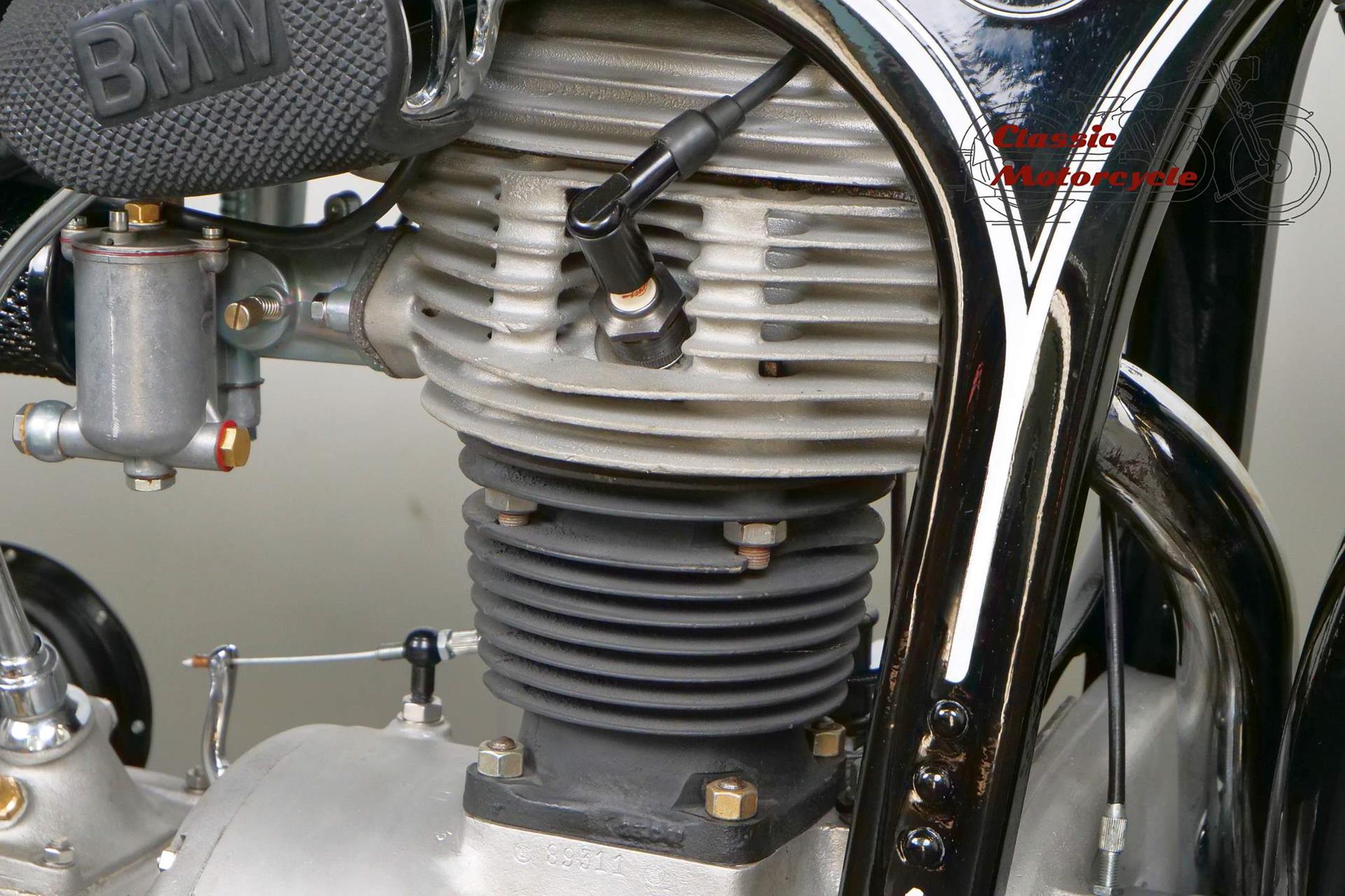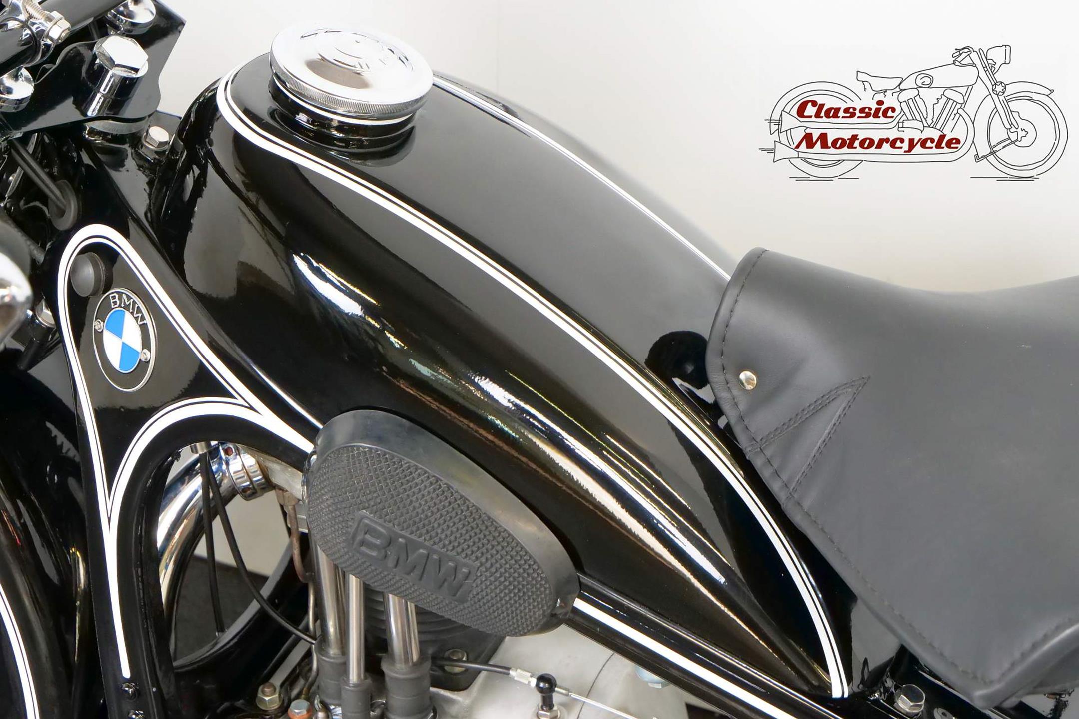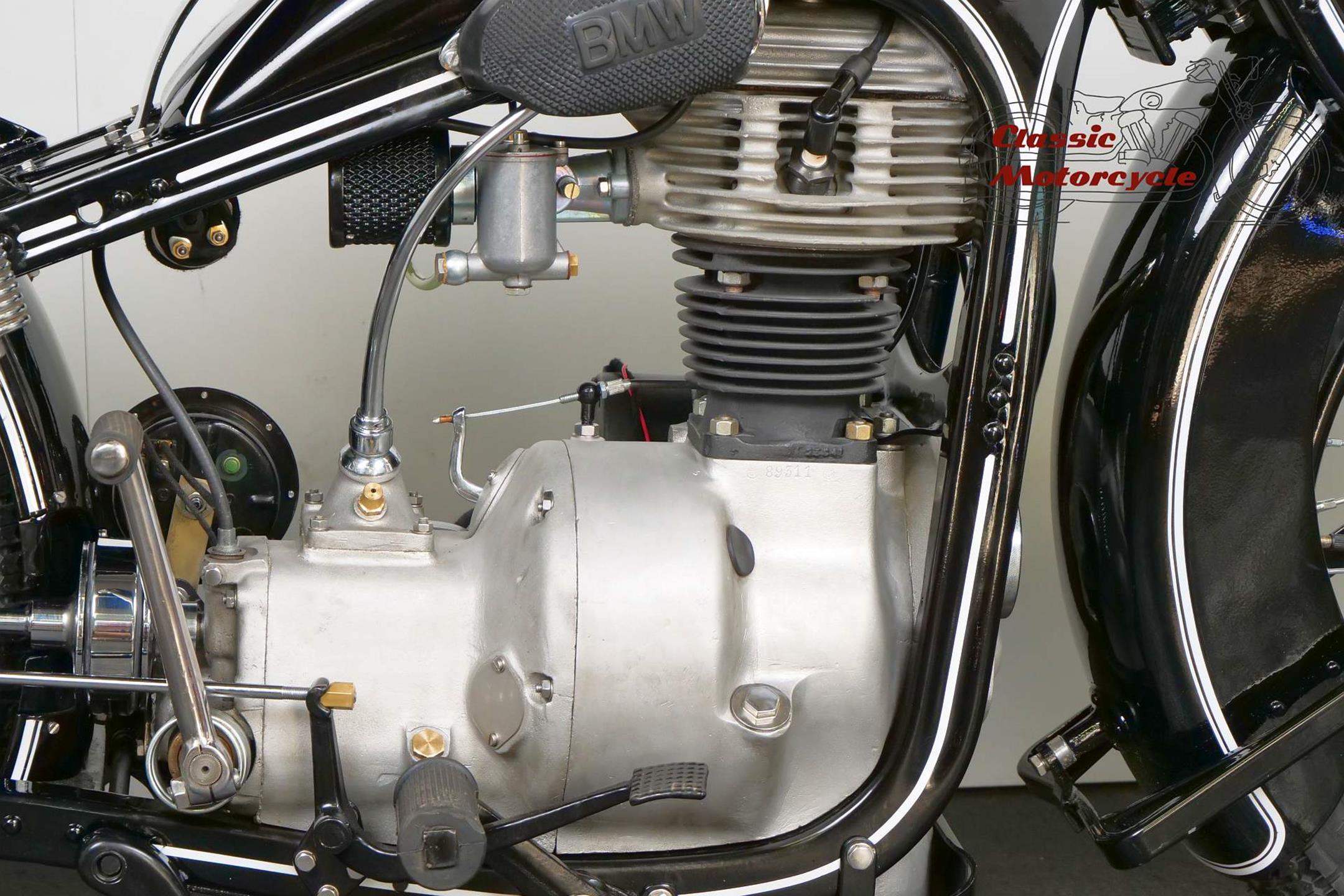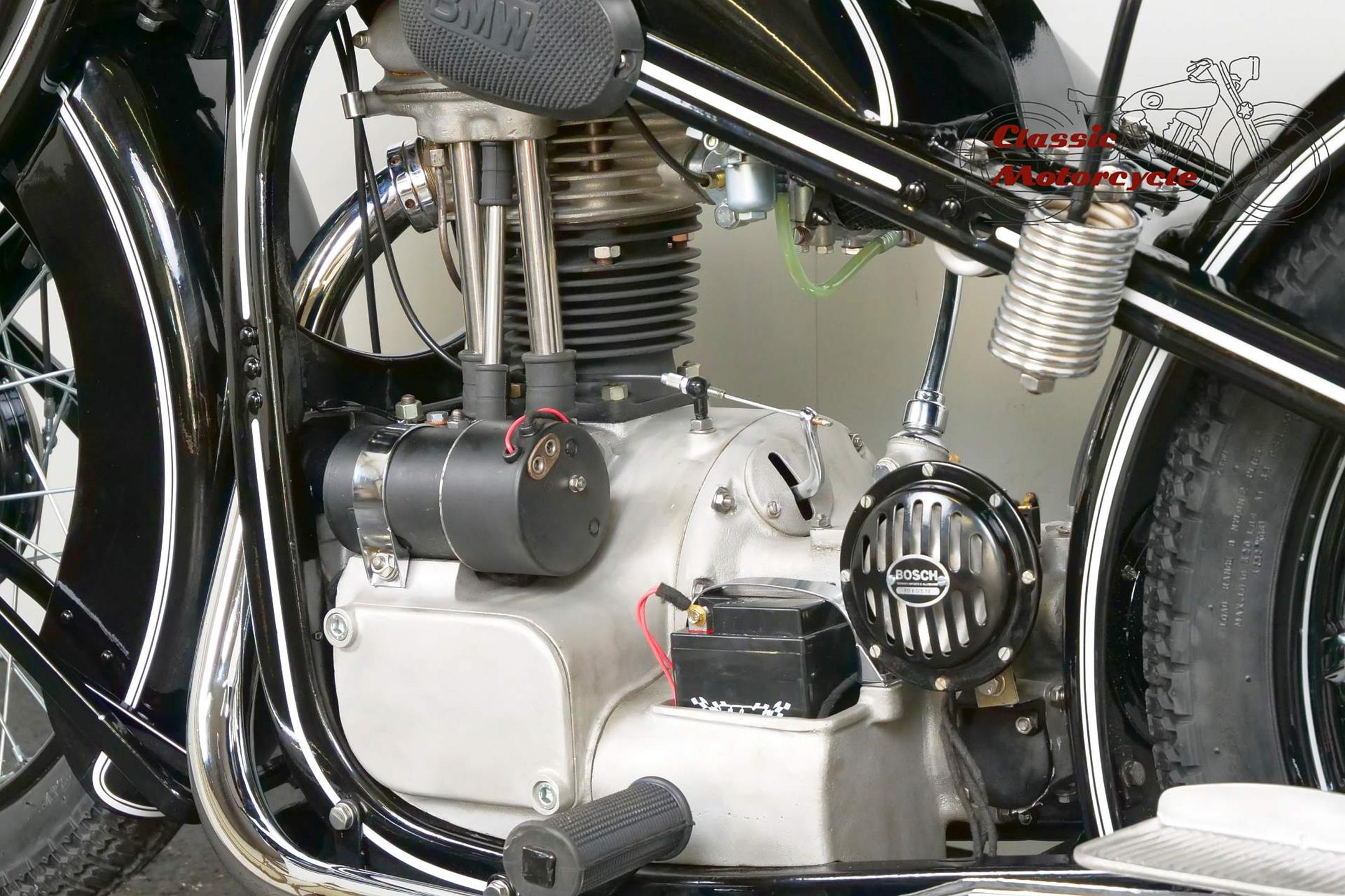 Introduced in 1932 and intended to bridge the gap between the 'budget' BMW R2 198cc single and the expensive twins, the R4 looked much like the former, whose channel-section steel frame and running gear it used almost unaltered. The 398cc overhead-valve engine featured enclosed valve gear and produced 12bhp, gaining an extra two horsepower in 1933 when the BMW R4 was updated to Series 2 specification with revised styling and a four-speed gearbox. A new cylinder head, tidier engine casings and changes to the toolbox and generator locations were introduced as the rugged R4 - a favourite with police forces and the German Army - progressed through to Series 5 before production ceased in 1936. BMW produced 15,295 R4 motorcycles using innovative mass production techniques, setting new standards of design and quality. Pressed steel frame and components were quick and easy to stamp out and assemble, reducing manufacturing costs.