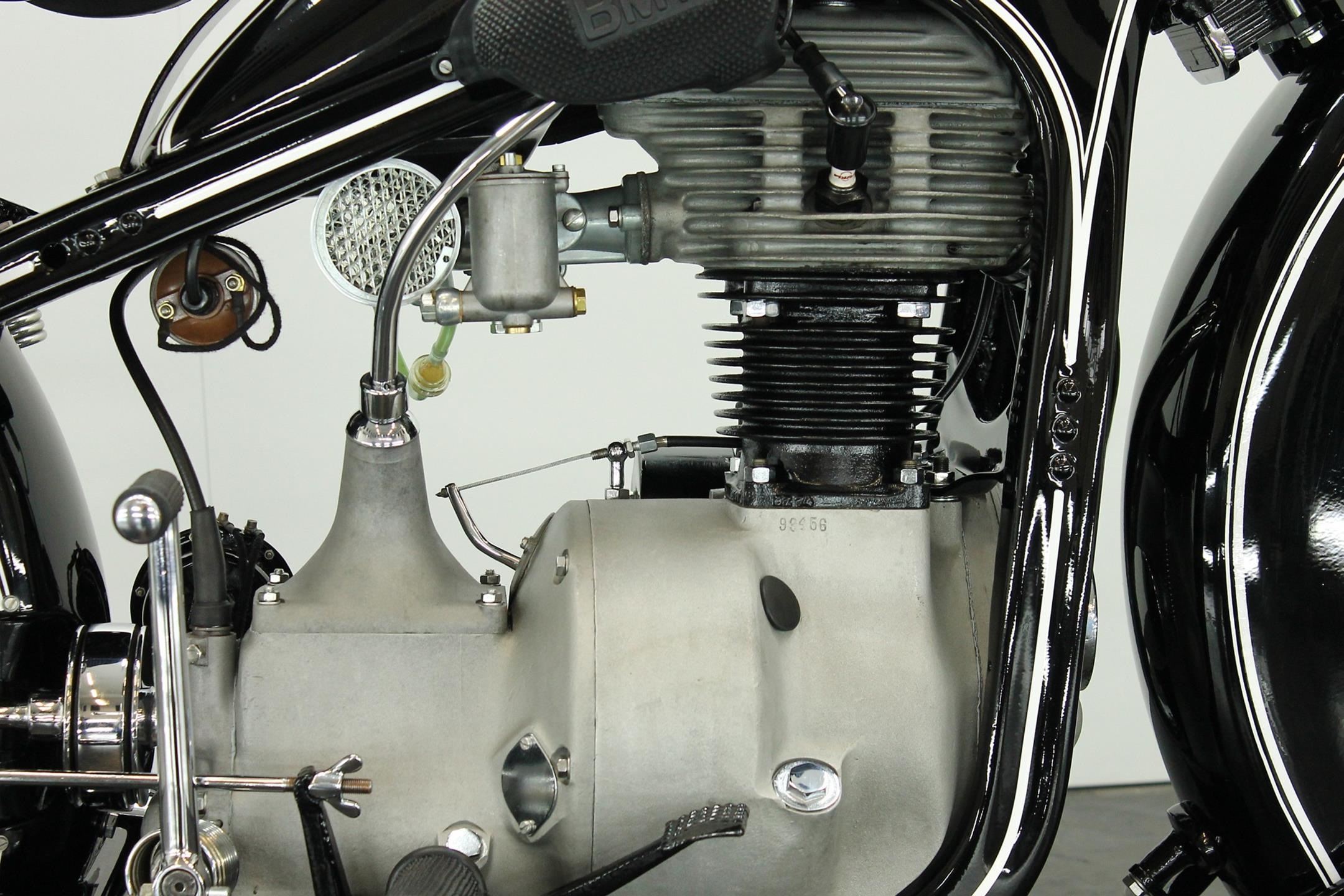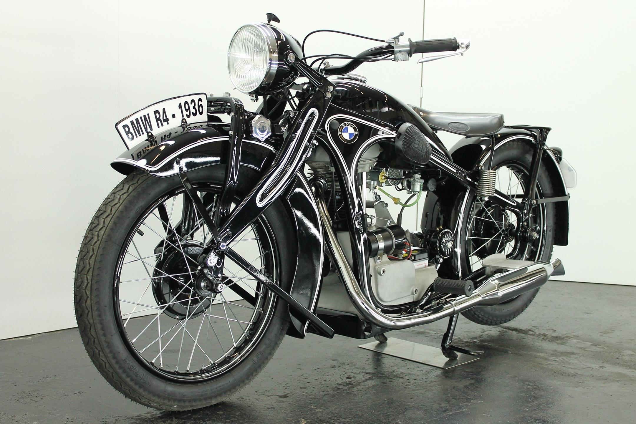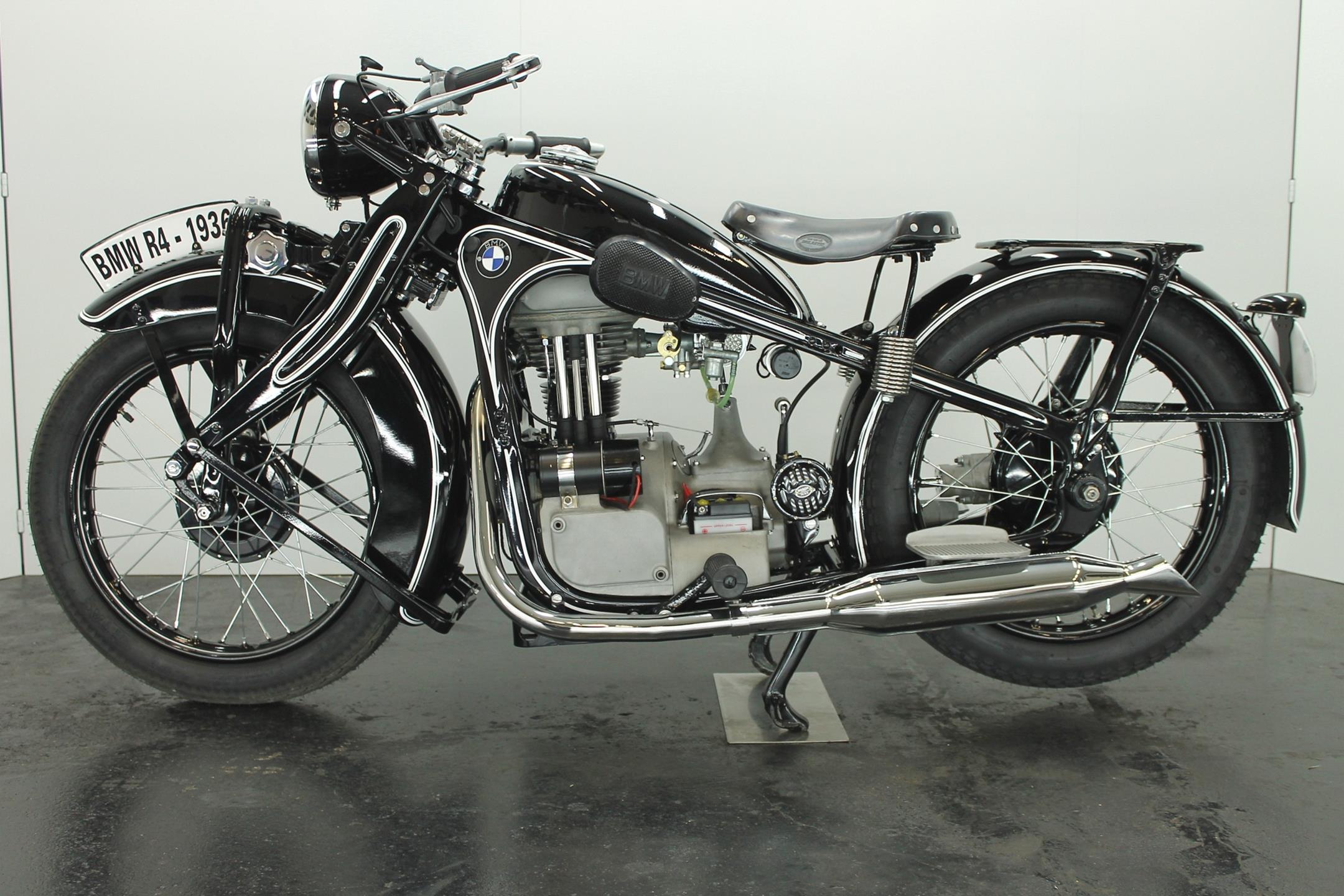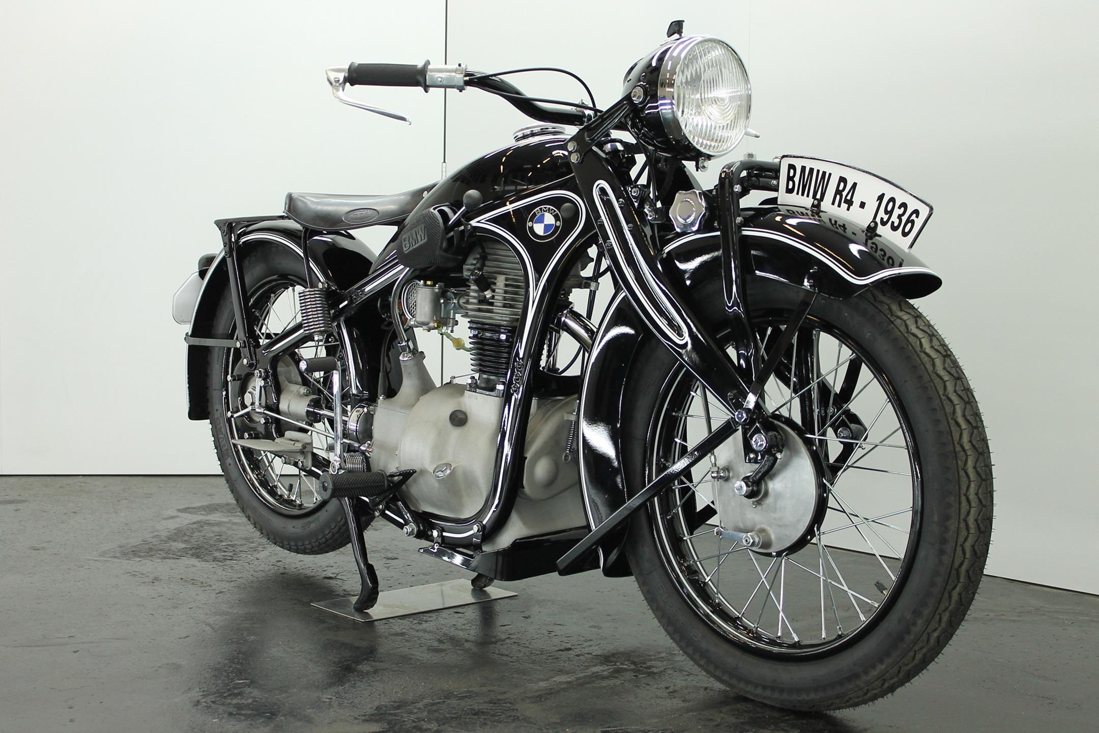 Introduced in 1932 and intended to bridge the gap between the 'budget' BMW R2 198cc single and the expensive twins, the R4 looked much like the former, whose channel-section steel frame and running gear it used almost unaltered. The 398cc overhead-valve engine featured enclosed valve gear and produced 12bhp, gaining an extra two horsepower in 1933 when the BMW R4 was updated to Series 2 specification with revised styling and a four-speed gearbox. A new cylinder head, tidier engine casings and changes to the toolbox and generator locations were introduced as the rugged R4 - a favourite with police forces and the German Army - progressed through to Series 5 before production ceased in 1936. BMW produced 15,295 R4 motorcycles using innovative mass production techniques, setting new standards of design and quality. Pressed steel frame and components were quick and easy to stamp out and assemble, reducing manufacturing costs.