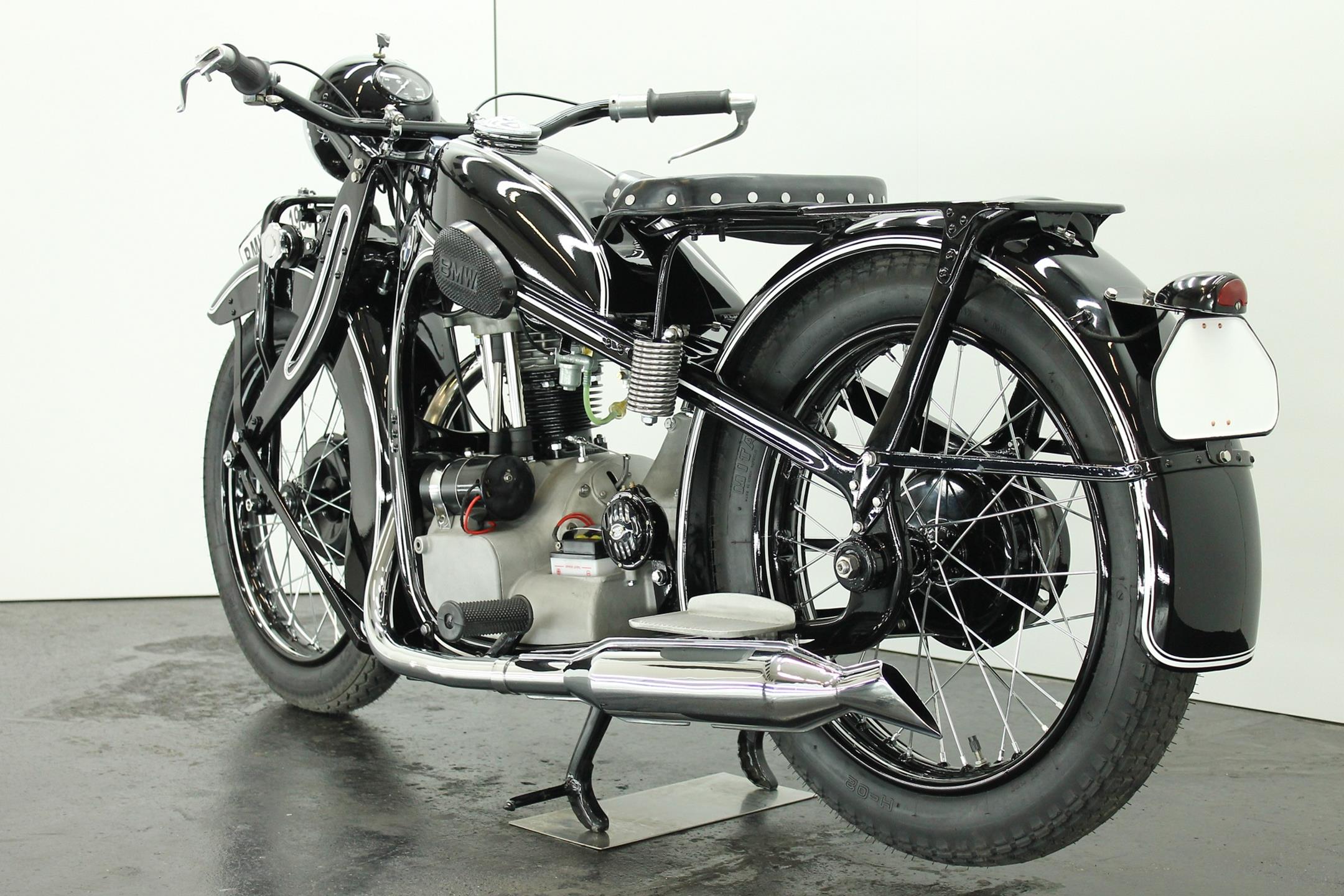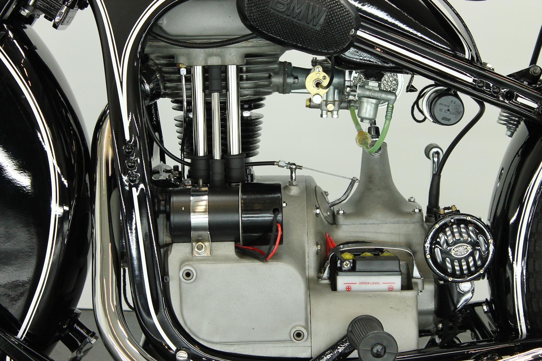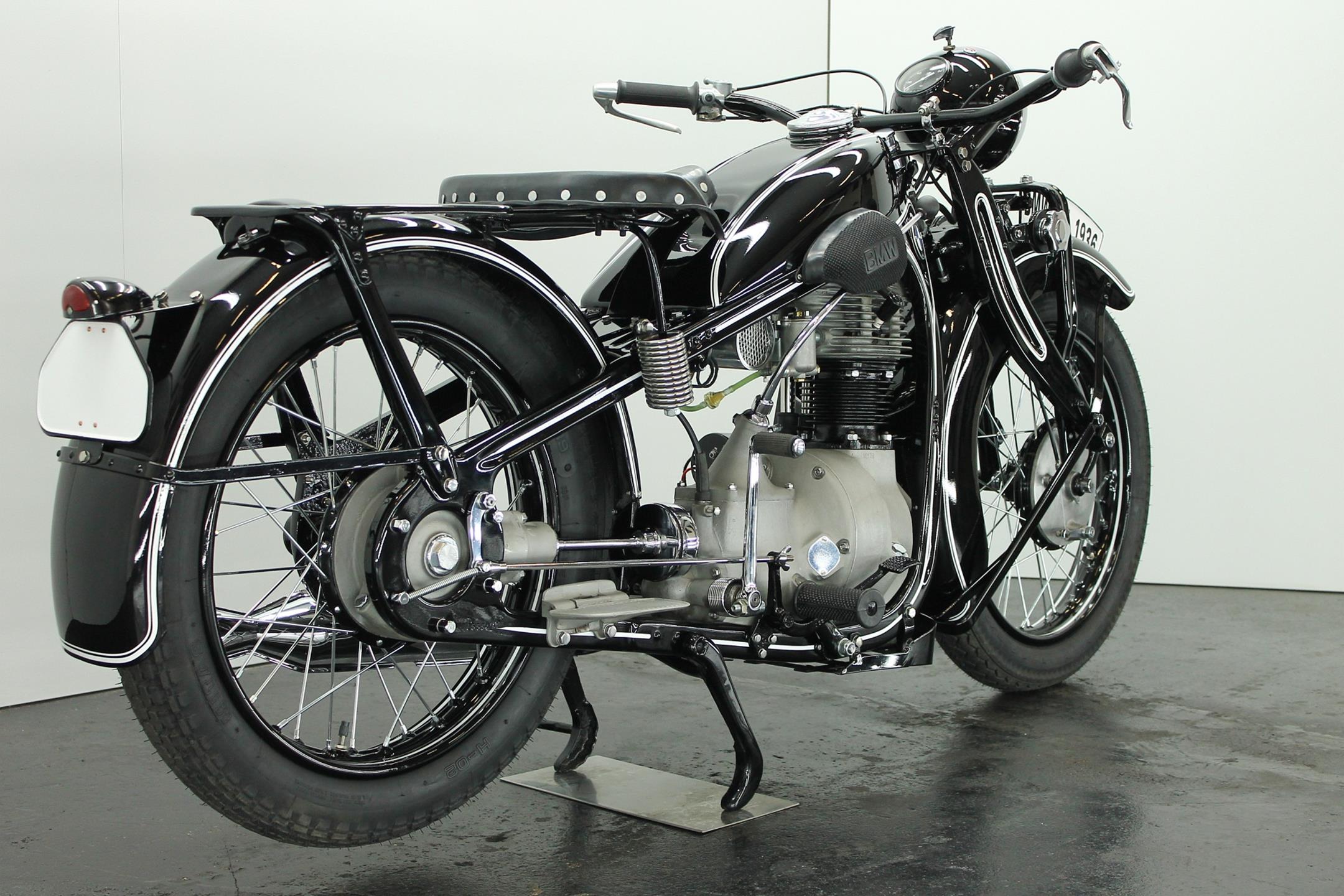 Introduced in 1932 and intended to bridge the gap between the 'budget' BMW R2 198cc single and the expensive twins, the R4 looked much like the former, whose channel-section steel frame and running gear it used almost unaltered. The 398cc overhead-valve engine featured enclosed valve gear and produced 12bhp, gaining an extra two horsepower in 1933 when the BMW R4 was updated to Series 2 specification with revised styling and a four-speed gearbox. A new cylinder head, tidier engine casings and changes to the toolbox and generator locations were introduced as the rugged R4 - a favourite with police forces and the German Army - progressed through to Series 5 before production ceased in 1936. BMW produced 15,295 R4 motorcycles using innovative mass production techniques, setting new standards of design and quality. Pressed steel frame and components were quick and easy to stamp out and assemble, reducing manufacturing costs.