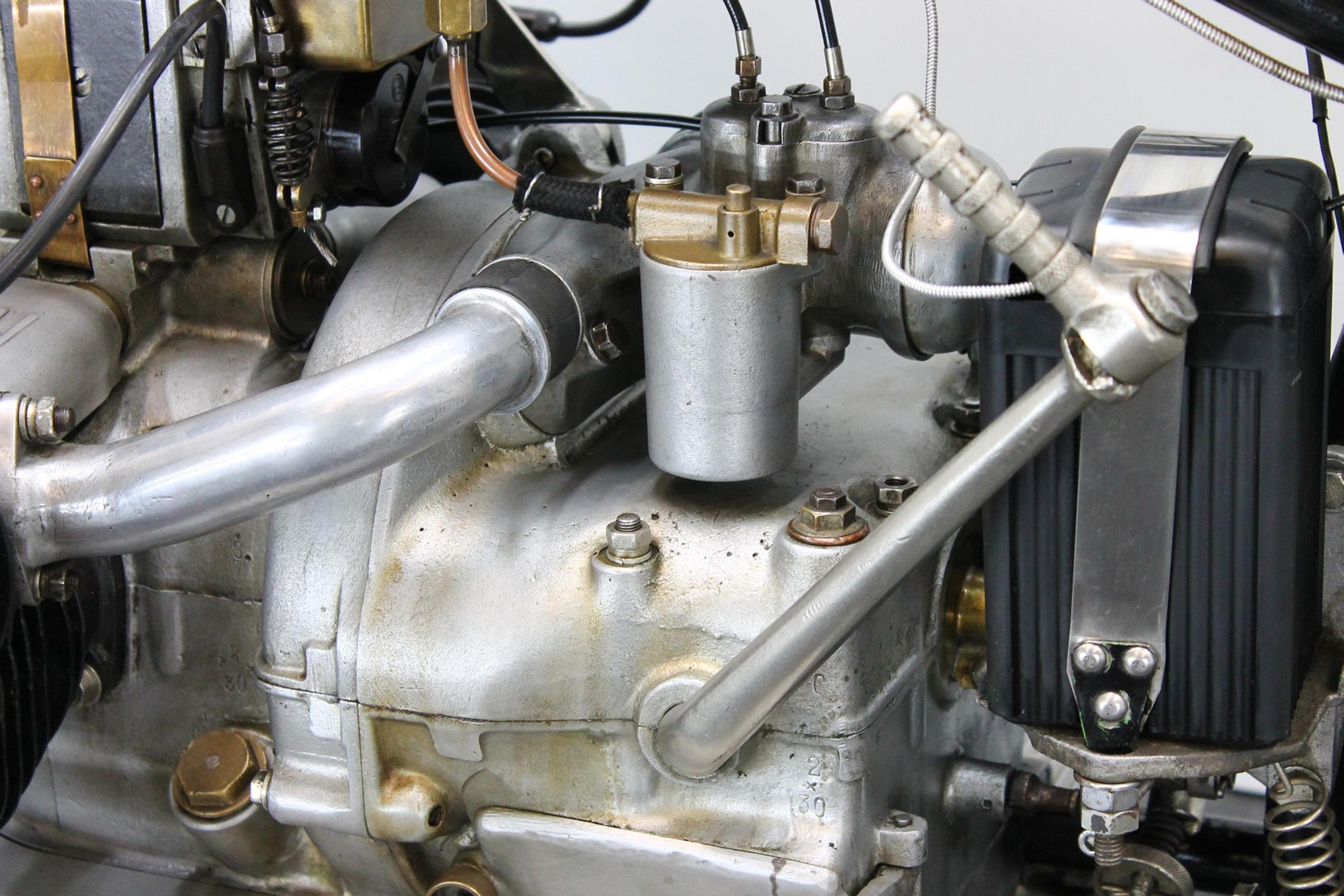 This handsome R42 spent his whole life in Germany and comes with Germany papers (copy) of the “französischen Besatzungszone”, original dealer plate of Folville & Mettenheimer, original Bosch lighting set, Bosch horn, Bosch MagDyno, recently overhauled OTA speedo, Lepper seat, many of pic. of the original condition + during restoration and a certificate of the BMW Archiv in Germany. This rare and original flat tank BMW has been produced 2 lasted years and runs great with its 500cc transverse engine.