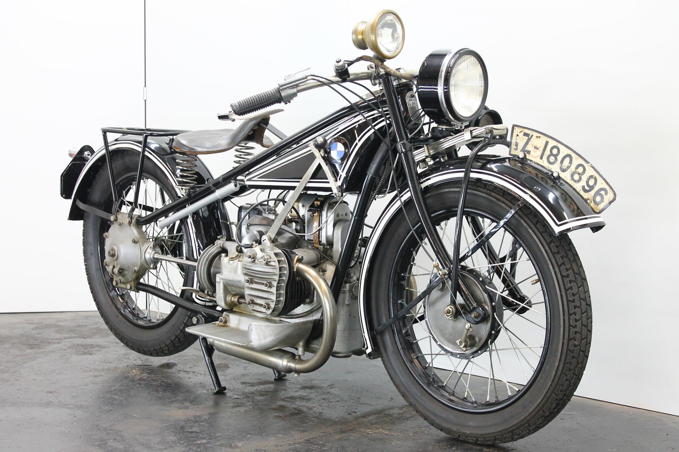 It was designer Max Fitz, forbidden by treaty from working on aircraft engines following World War I, who came up with the blueprint for BMW motorcycles that the company follows to this day, 90 years after the first R32 was produced. That first bike featured his now-familiar transverse-mounted "boxer" motor, its twin cylinders jutting out into the cooling breeze. Also present from the beginning was shaft final drive; BMW's attention to engineering and focus on solid build quality was already readily apparent. The R42, introduced three years later in 1926, moved the brand more firmly down the road to profitability and success. Its redesigned and more powerful 500cc engine, now with aggressively finned detachable alloy heads, made the bike a better tourer. With the engine repositioned in the frame for improved weight distribution, stronger, straighter front downtubes could be employed, sharpening the bike's handling. Braking too was improved; gone was the arcane block-and-pulley type rear brake, replaced by a drum on the driveshaft gripped by external contracting bands. Stylistically, the R32's quaint valanced fenders gave way to simpler, more modern looking sheetmetal. Despite the fact that all BMW two-wheelers built up to 1941 owe much to the R42, its production lasted just three years, making this rare Bimmer among the brand's most desirable and sought-after vintage machines. BMW catalogued the R42 for 1.510 Reichsmark.