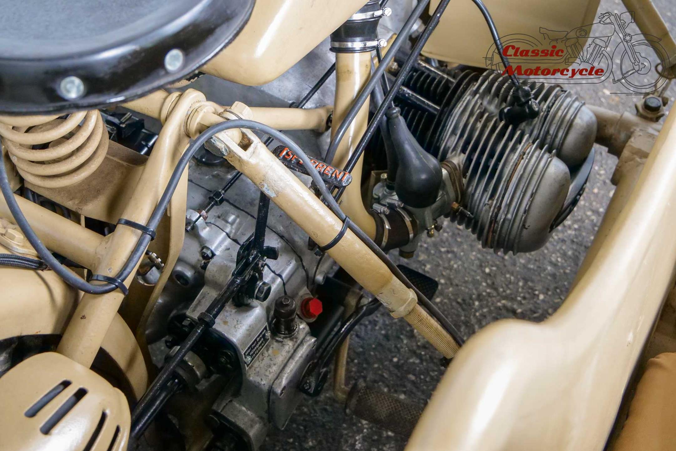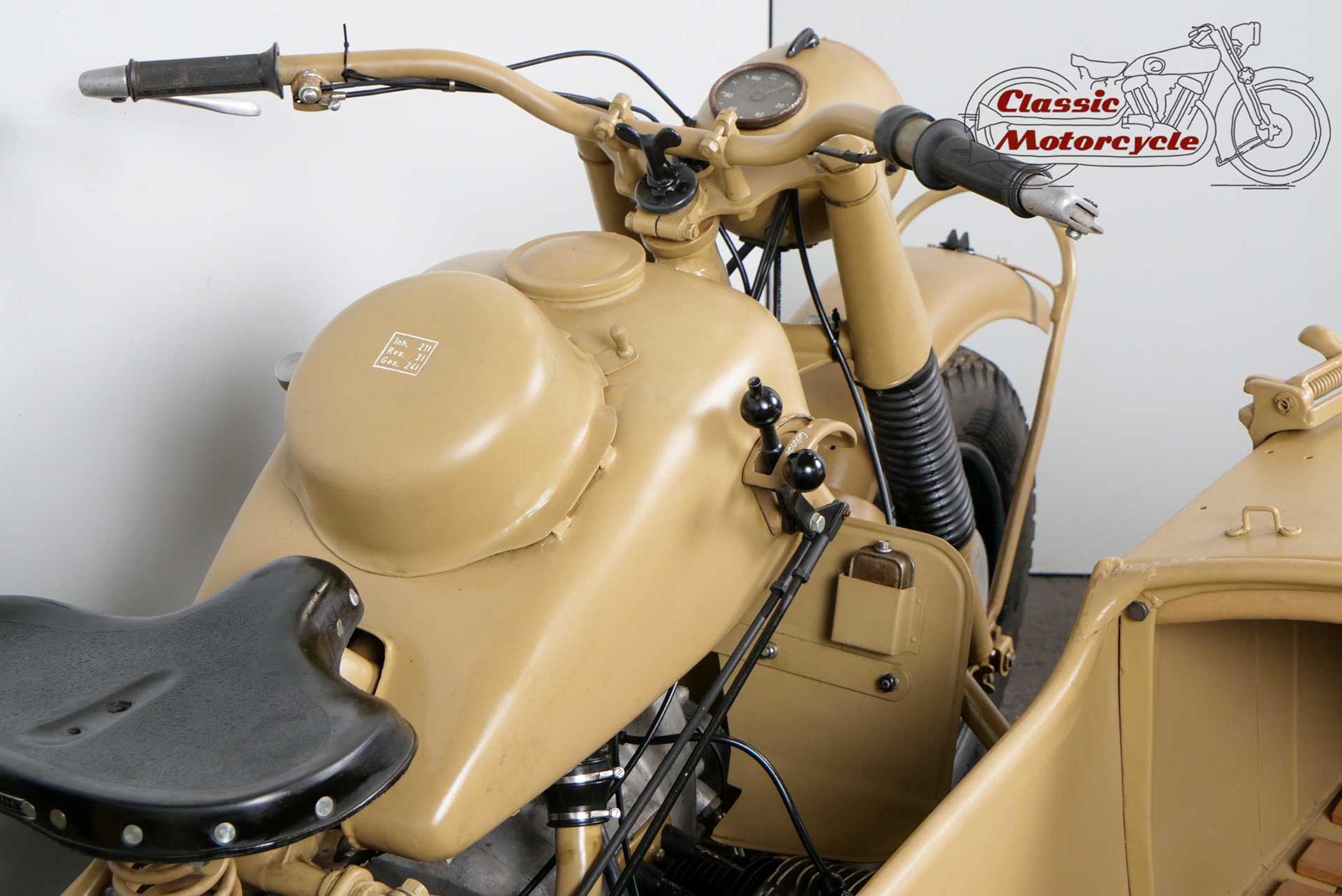 We offer here a piece of war history of the German Wehrmacht. The R75 was designed exclusively for hard war use. Whether desert sand or snow and cold the motorcycles were driven. The motorcycle was produced on 31.5.1943 and delivered on 15.6.1943 to the Heereszeugamt Chemnitz, Germany. The price at that time was 2.630 Reichsmark. The combination was restored in 2010 and has a certificate from BMW. She runs smoothly and is ready to ride.