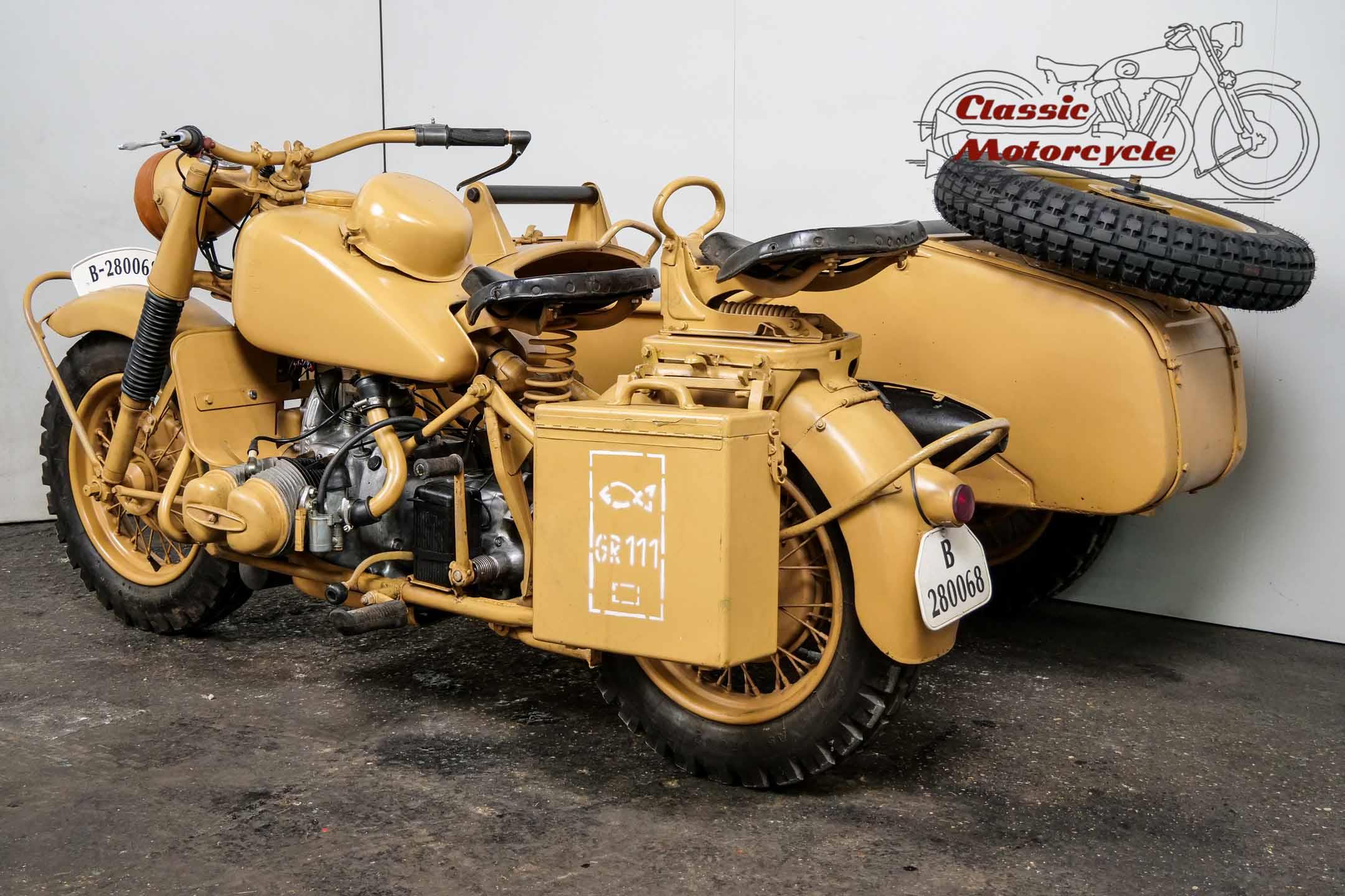 The R75 represented the spearhead of the super-heavy combinations at BMW. The construction was intended exclusively for hard wartime use. Accordingly, the machines were considered very robust and almost indestructible. This piece of war history was produced on June 15, 1943 and delivered to the Army Stuff Office in Chemnitz, Germany, on the same day. The crankshaft was completely overhauled last year. Nothing stands in the way of a longer trip. The R75 is ready to drive.