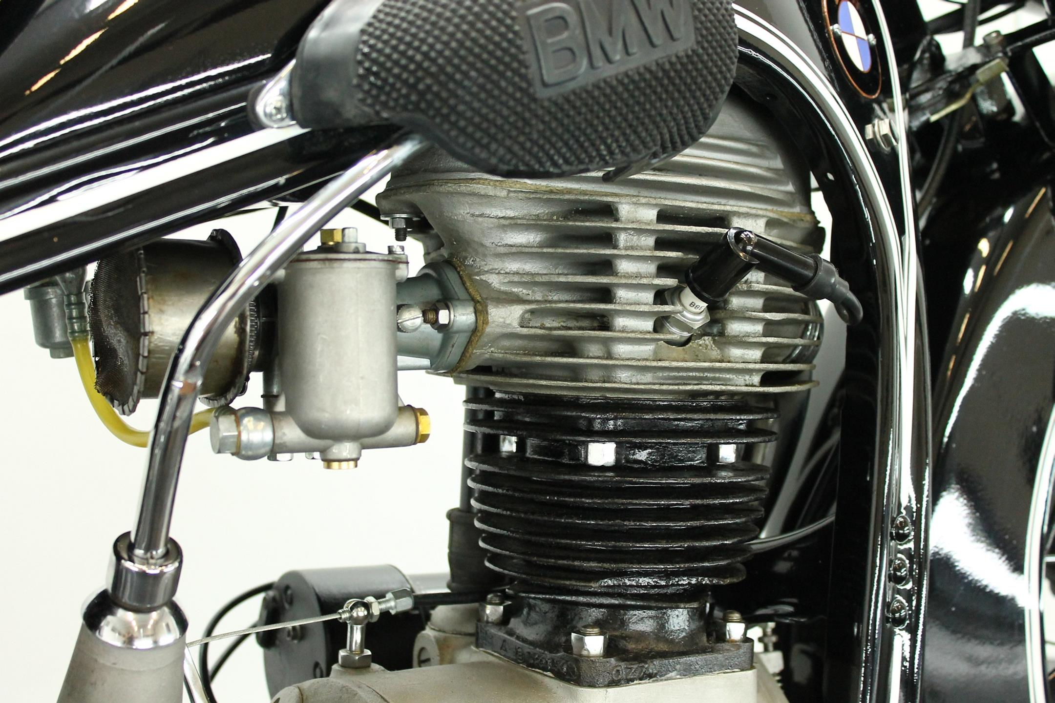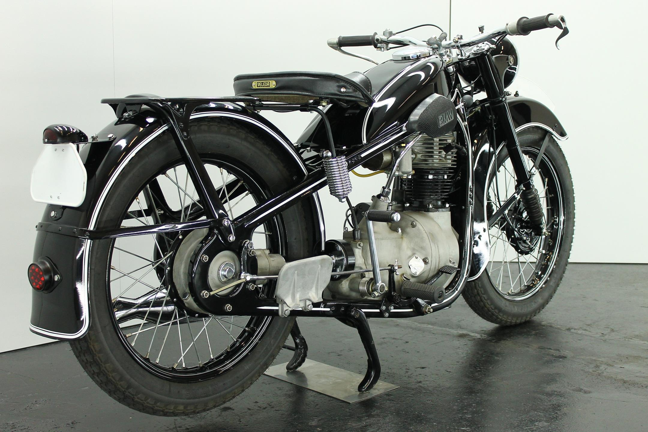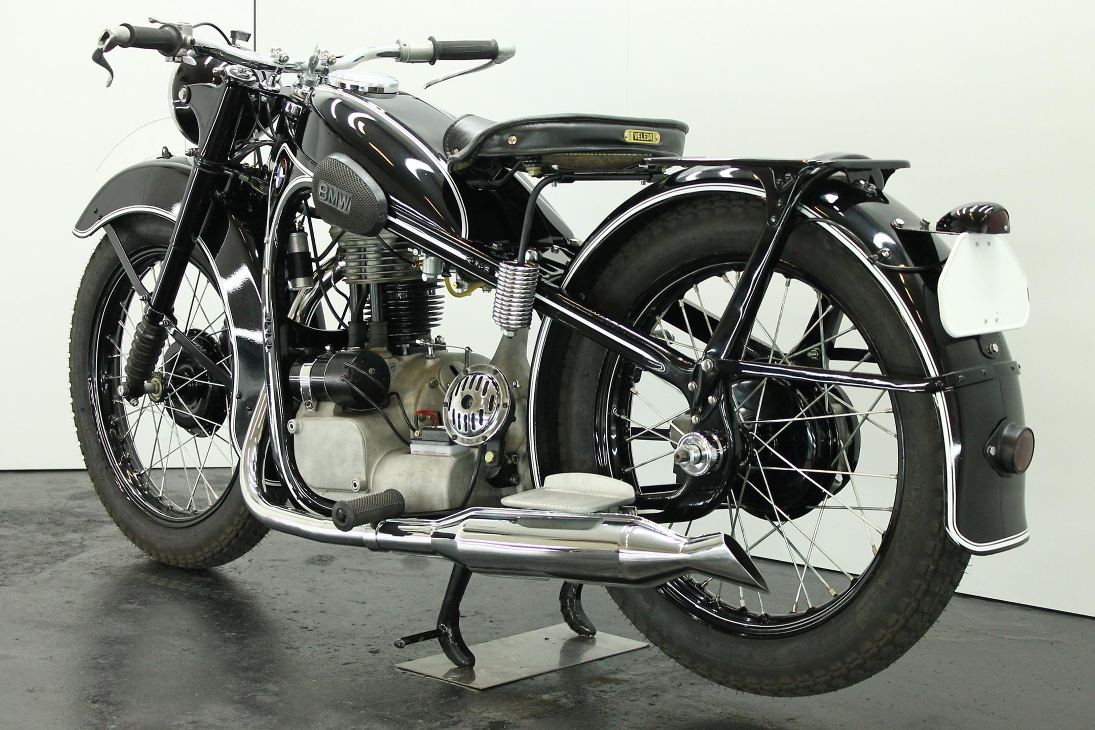 BMW made a host of successful shaft-driven, single-cylinder motorcycles. Starting with the first model, the 250cc 1925 R39, there came the R2 series, the R35, the R20, the R24, R25 series, the R26, and the final model, the R27. All except for the R2, R4, and R35 were 250cc models. After World War II, BMW no longer made R35 motorcycles. "Eisenacher Motorenwerk" (EMW) was an East German manufacturer of automobiles and motorcycles based in Eisenach, then East Germany. It made R35s essentially identical to the pre-war BMW R35. One of the pre-World-War-II BMW factories was located in Eisenach, which after the war was taken over by the Soviets as it was located in the Soviet occupation zone. The factory continued producing cars and motorcycles using the BMW logo, but after a lawsuit in 1952 it had to change the name to EMW instead. When the Soviets occupied the eastern sector of Germany after WWII, they took over one of BMW's factories in Eisenach and began building motorcycles and cars under the BMW marque. BMW sued successfully in 1952 and the East German factory changed it's product name to EMW, and also changed the logo design and it's colour from blue to red. After the R3 with its 300cc engine had enjoyed very little commercial success, BMW introduced a new single-cylinder model in 1937, the R35. Its engine was derived from the 400cc R4, but by reducing the bore the displacement was decreased to 350cc. The R35 also developed 14 horsepower and like the R4 had a top speed of 100km/h. The suspension had in the meantime been modernized. The frame was still made from massive-looking pressed steel sections but the antiquated leaf spring at the front was now replaced by a modern telescopic fork. In contrast to the exclusive "Boxer" models, however, there was no hydraulic damping. By the close of production, the R35 was the most successful model in BMW's motorcycle history and when you see the bikes today, it's easy to understand where the appeal lies.