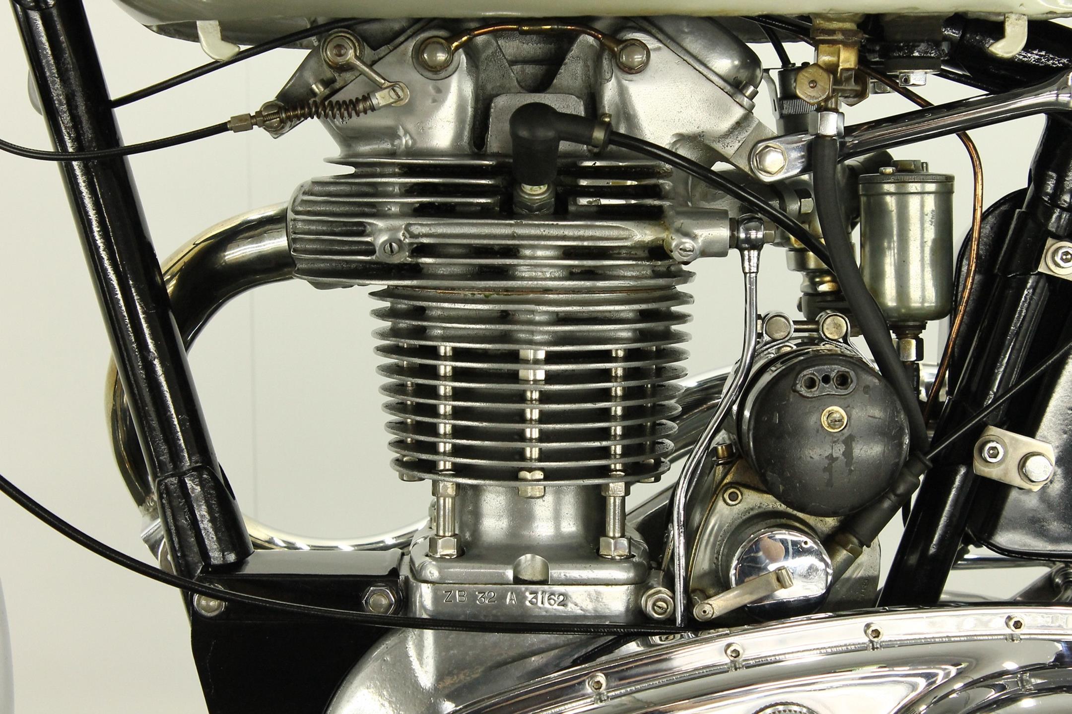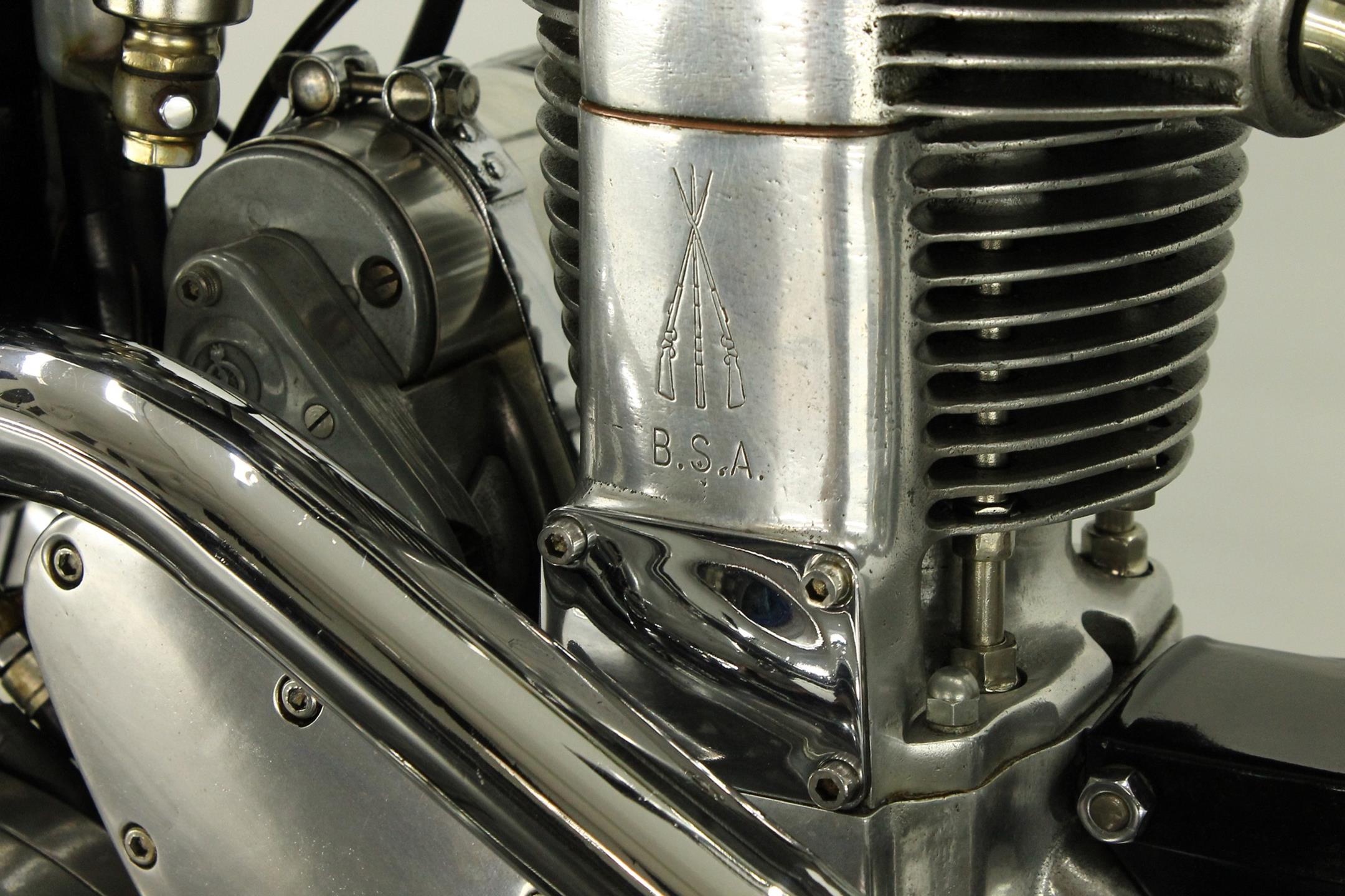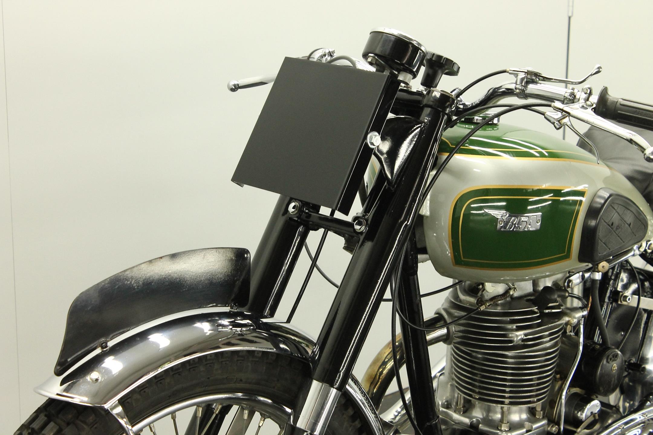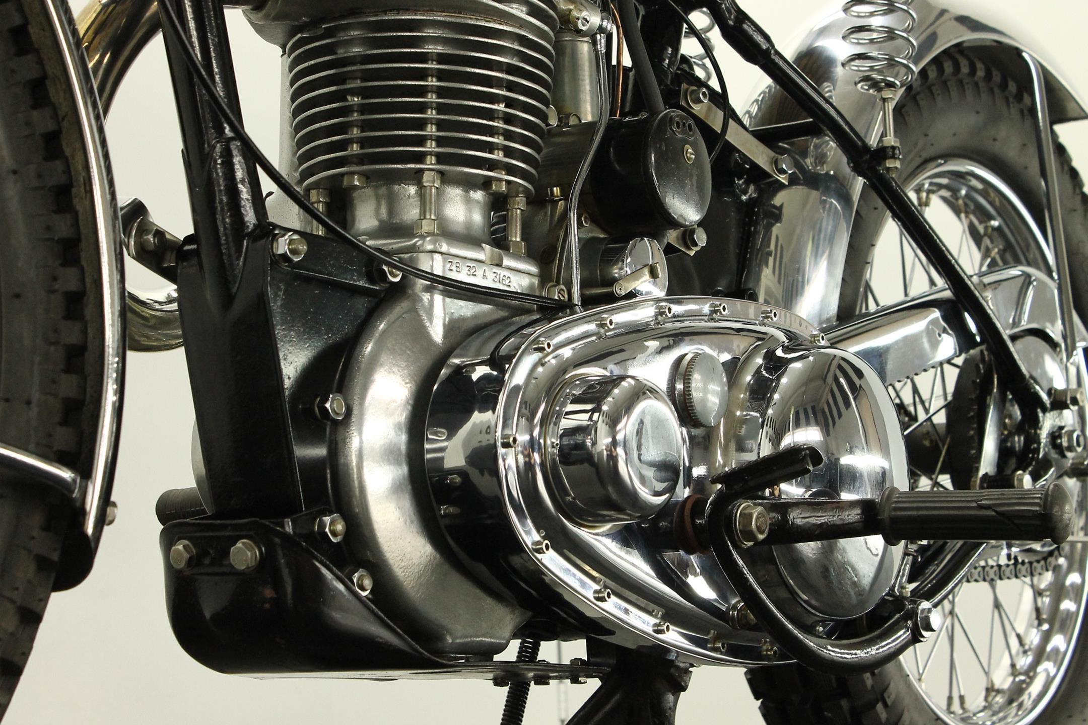 BSA's rugged, workaday B31 was manufactured from 1945 to the end of 1959, its overhead-valve engine providing the basis for the renowned Gold Star sports roadster. At the time of its introduction, the B31 was BSA's sole all-new model, joining the lightweight 'C' and heavyweight 'M' ranges carried over from pre-war days, and was produced initially with rigid frame and telescopic front fork. In January 1946 it was joined by a Competition variant, the B32, which boasted a high-level exhaust system, 21" front wheel, additional chromium plating, a crankcase shield and lowered gearing. An alloy cylinder barrel and head, broadly similar to those used on the contemporary Gold Star but retaining a separate pushrod tunnel, became available as B32 options from 1949 onwards, as did plunger rear suspension in common with the rest of the 'B' singles range.