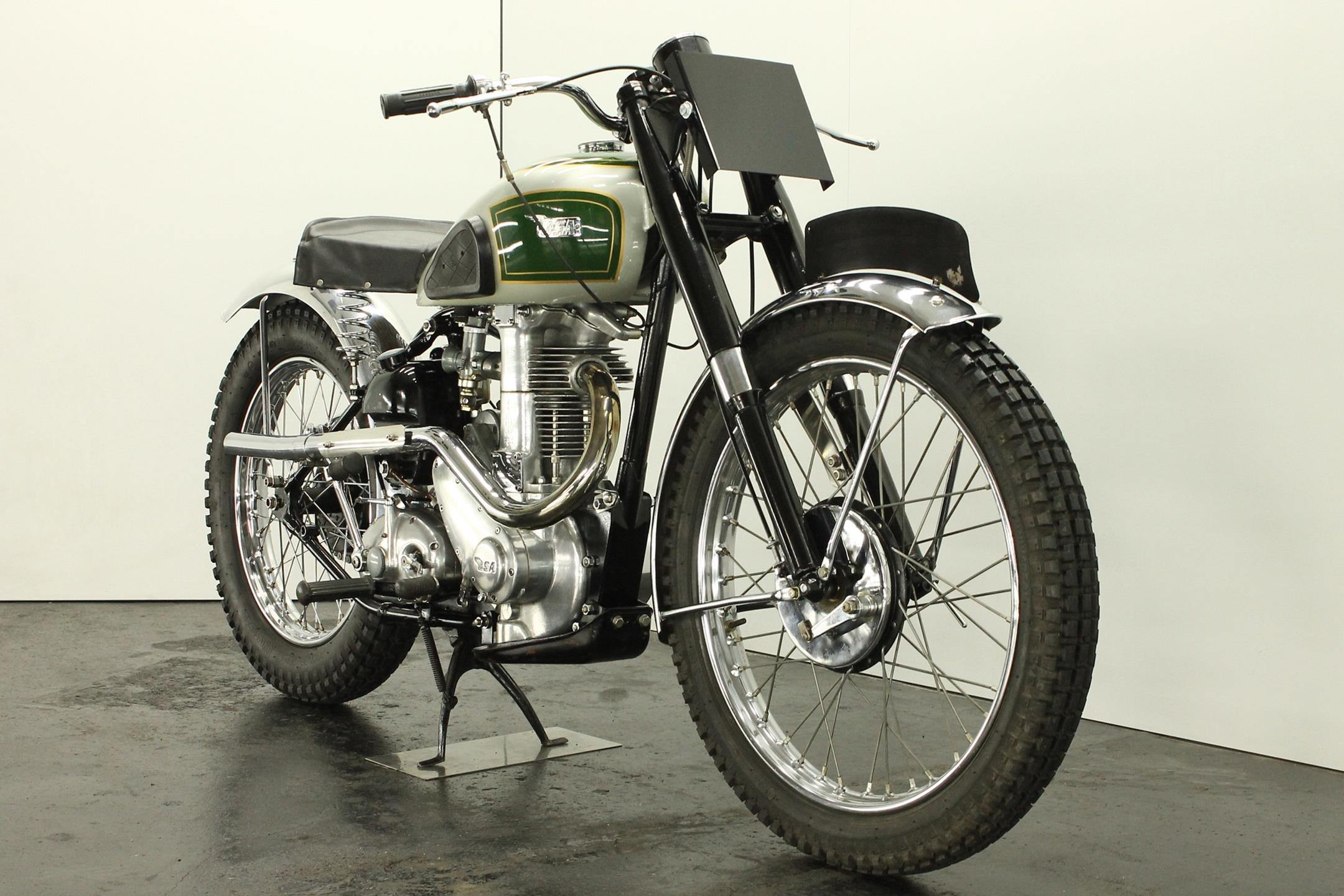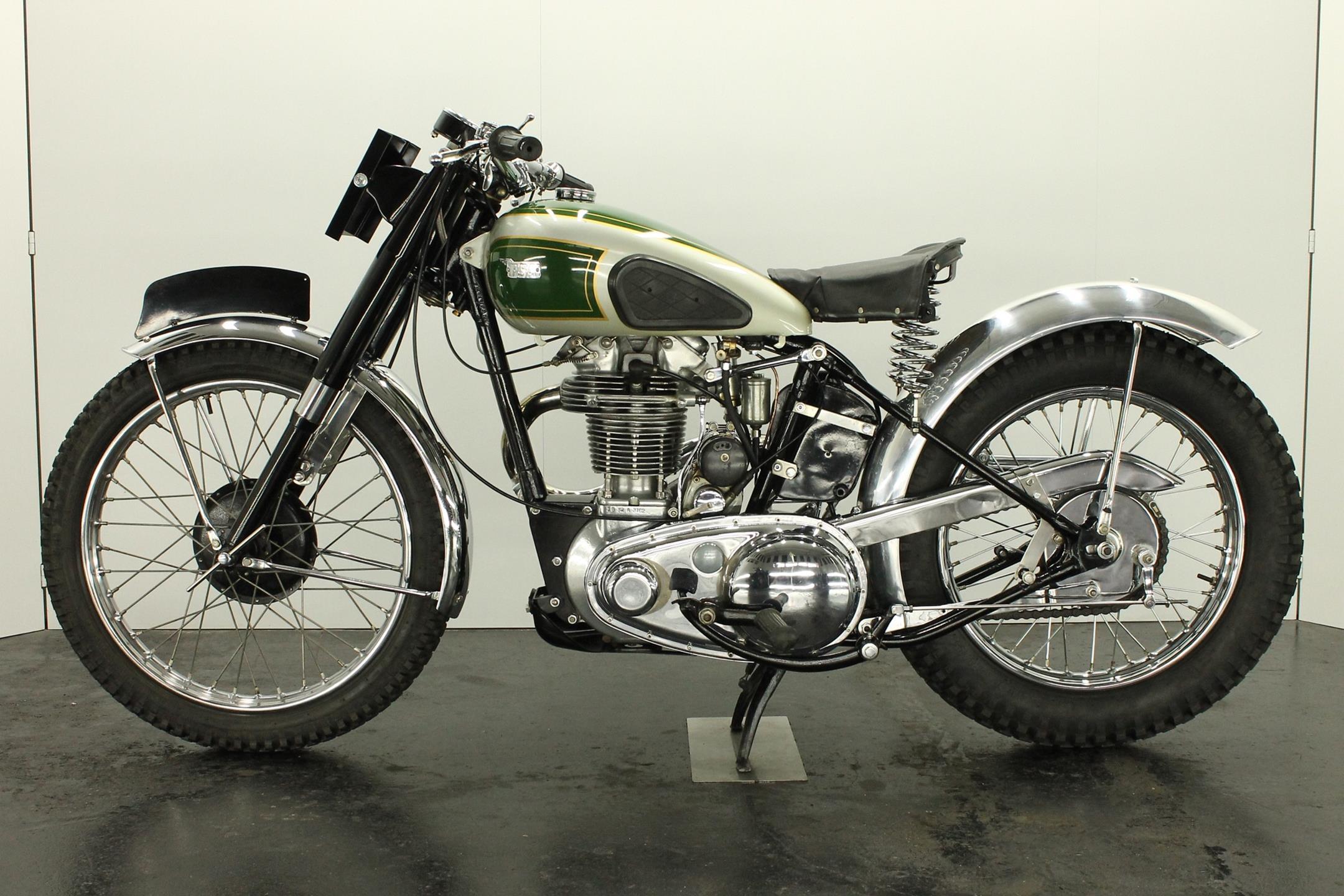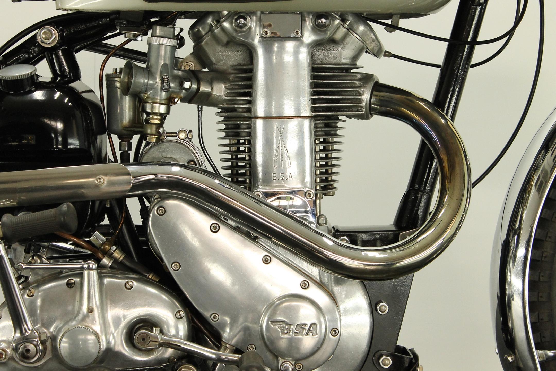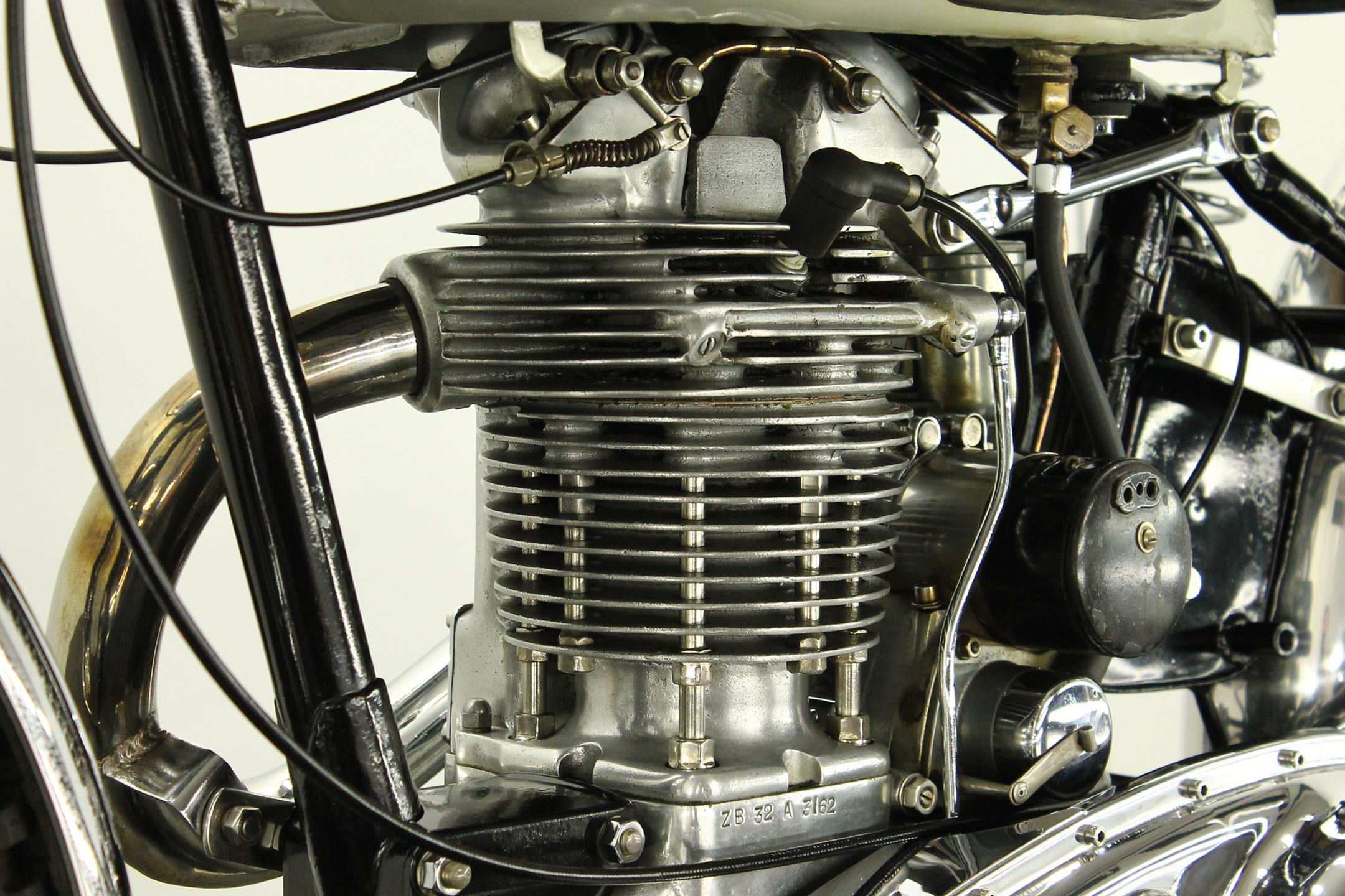 BSA's rugged, workaday B31 was manufactured from 1945 to the end of 1959, its overhead-valve engine providing the basis for the renowned Gold Star sports roadster. At the time of its introduction, the B31 was BSA's sole all-new model, joining the lightweight 'C' and heavyweight 'M' ranges carried over from pre-war days, and was produced initially with rigid frame and telescopic front fork. In January 1946 it was joined by a Competition variant, the B32, which boasted a high-level exhaust system, 21" front wheel, additional chromium plating, a crankcase shield and lowered gearing. An alloy cylinder barrel and head, broadly similar to those used on the contemporary Gold Star but retaining a separate pushrod tunnel, became available as B32 options from 1949 onwards, as did plunger rear suspension in common with the rest of the 'B' singles range.