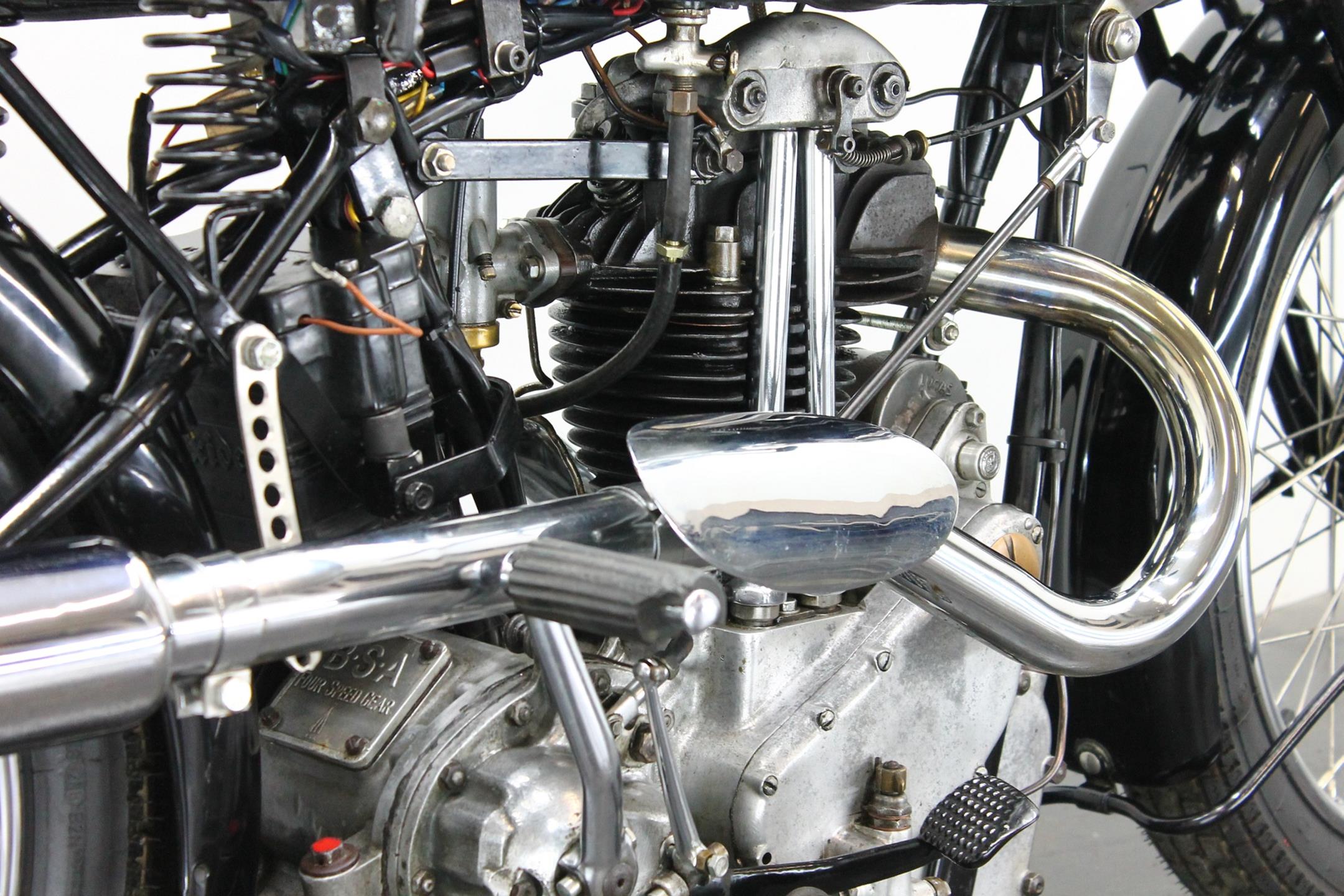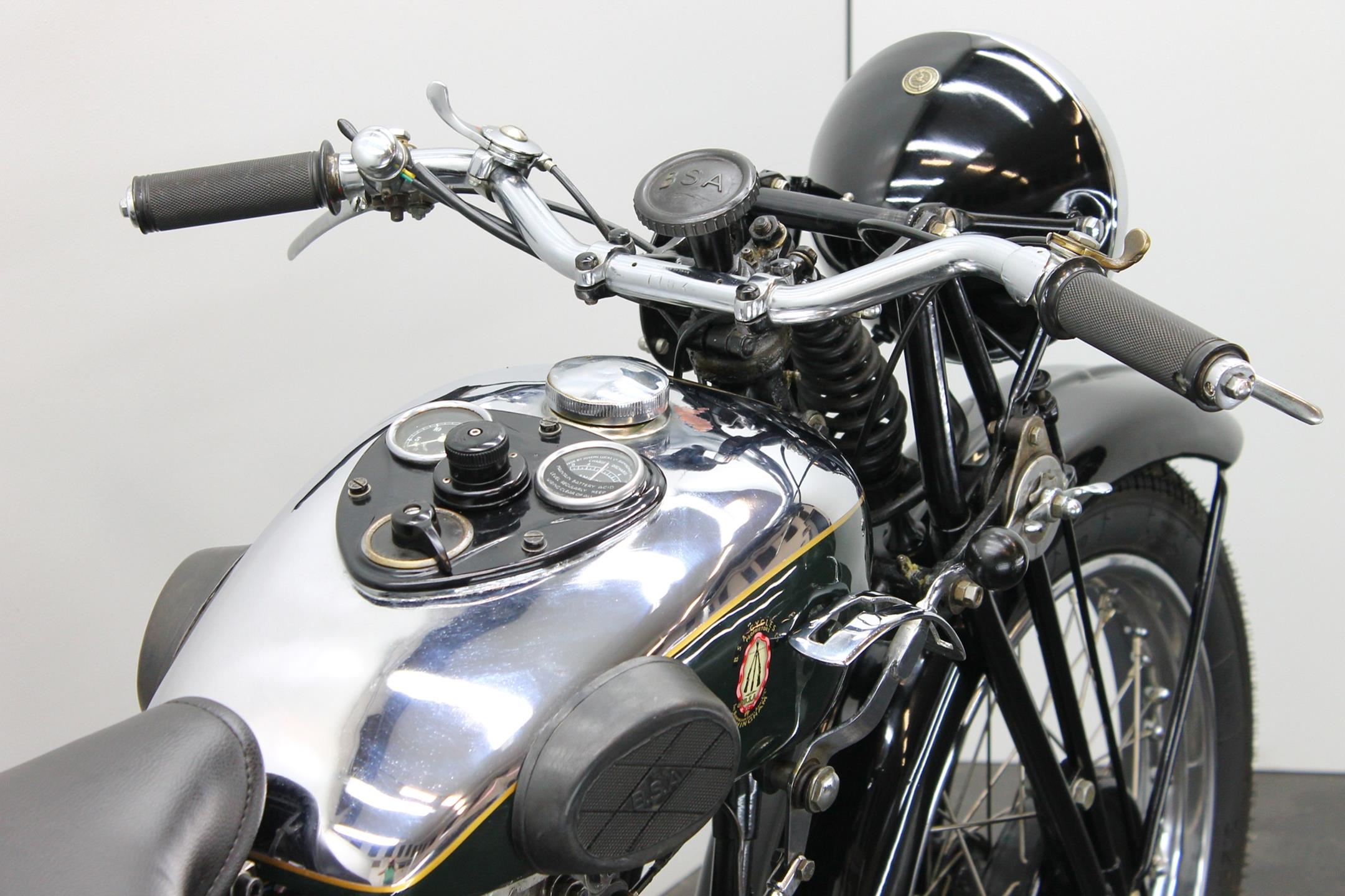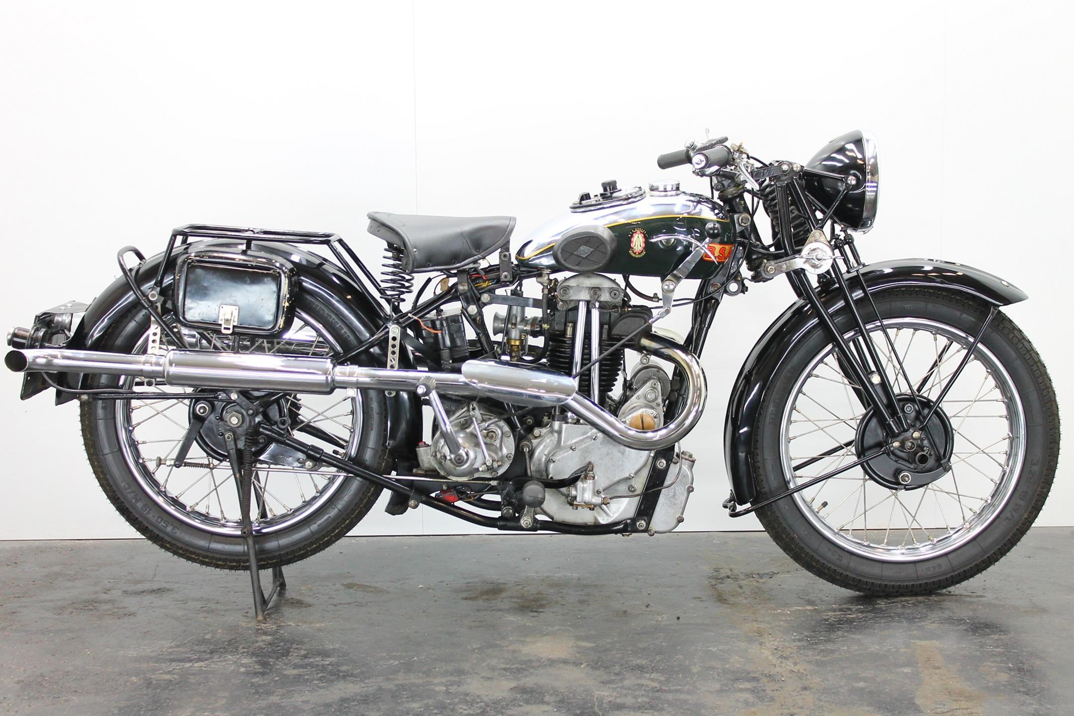 During the 1930s BSA concentrated on producing a range of dependable, well-made, competitively priced motorcycles. Its contemporary advertising slogan: 'One in Four is a BSA', reflected the Birmingham-based company's status as the world's largest motorcycle manufacturer. In 1927 BSA had introduced the influential 'Sloper' - so called because its inclined cylinder - starting a trend that saw many of its rivals launch similar machines. Nevertheless, models with vertical cylinders continued to form part of BSA's extensive range, outliving the Sloper when the fashion for inclined cylinders faded. The Depression of the early 1930s forced a cut back in the number of models, just ten being offered for 1932. Among these though, were three new 500s, one a sidevalve and two with overhead valves, all of which shared a common bottom end and the 85x88mm bore/stroke dimensions that would characterise all BSA's 500cc singles, including the legendary Gold Star, right up to the beginning of the unit-construction era in the 1960s. The two new ohv 500s were typed W32-7, the sports version being given the name 'Blue Star', a title that was also applied to the equivalent 250 and 350 models. Both featured engines having vertical cylinders and magneto ignition carried in conventional cycle parts with rigid frames and girder front forks. The Blue Star came with a tuned engine incorporating a high-compression piston and 'hotter' cams, twin-port cylinder which makes it a very sporty and powerful bike with 28hp! Originally an optional extra, a full electric lighting system became standard equipment for 1934. The W32-7 Bluestar model were available in two versions: hand gear change or foot gear change. This bike is manufactured in first year of production of Bluestar line.