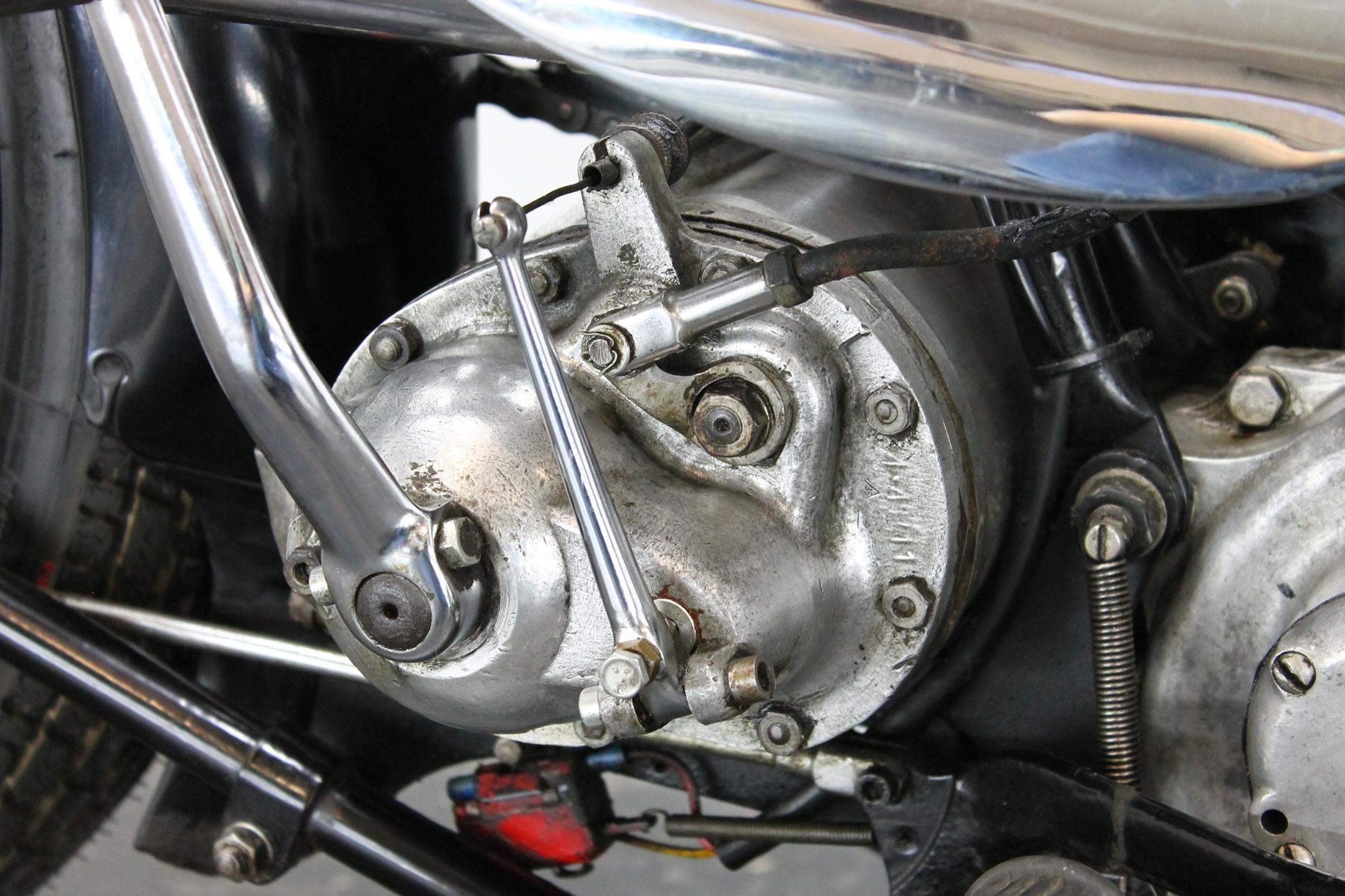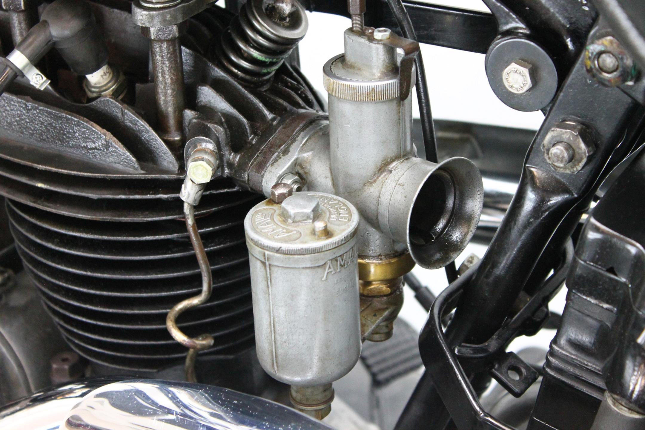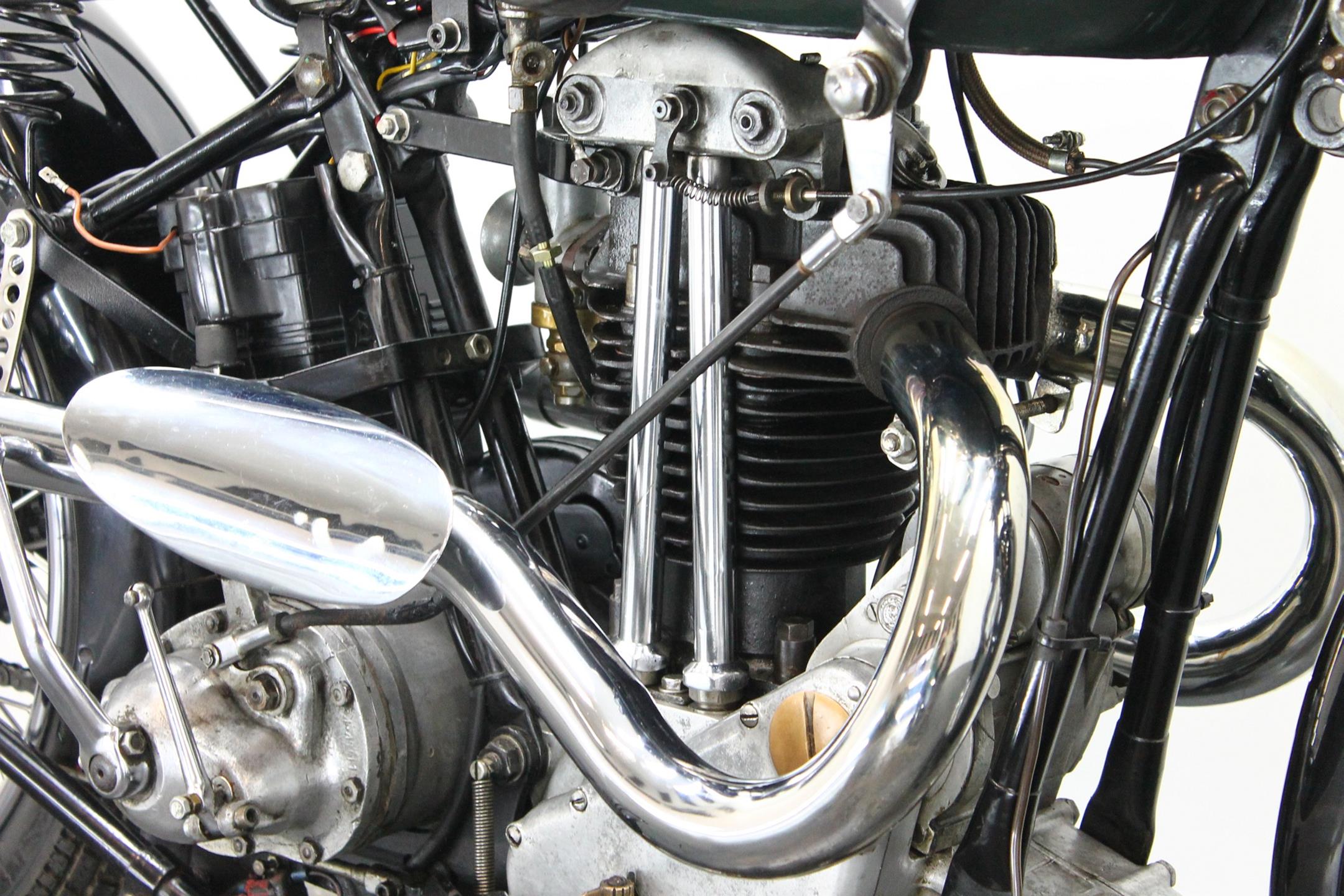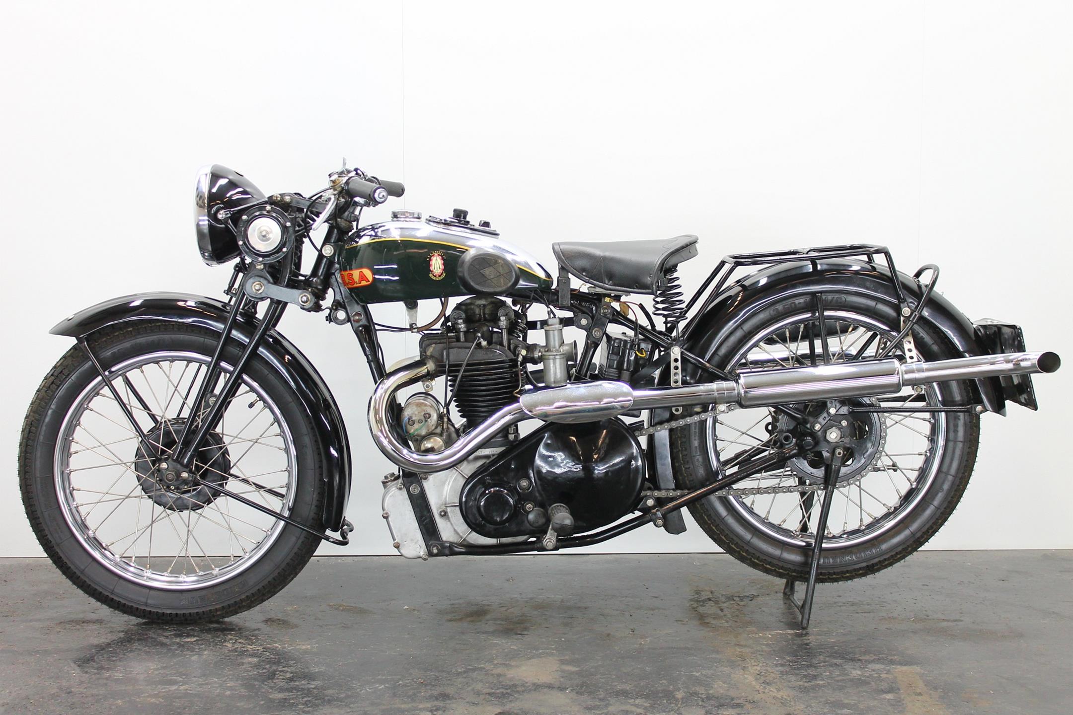 During the 1930s BSA concentrated on producing a range of dependable, well-made, competitively priced motorcycles. Its contemporary advertising slogan: 'One in Four is a BSA', reflected the Birmingham-based company's status as the world's largest motorcycle manufacturer. In 1927 BSA had introduced the influential 'Sloper' - so called because its inclined cylinder - starting a trend that saw many of its rivals launch similar machines. Nevertheless, models with vertical cylinders continued to form part of BSA's extensive range, outliving the Sloper when the fashion for inclined cylinders faded. The Depression of the early 1930s forced a cut back in the number of models, just ten being offered for 1932. Among these though, were three new 500s, one a sidevalve and two with overhead valves, all of which shared a common bottom end and the 85x88mm bore/stroke dimensions that would characterise all BSA's 500cc singles, including the legendary Gold Star, right up to the beginning of the unit-construction era in the 1960s. The two new ohv 500s were typed W32-7, the sports version being given the name 'Blue Star', a title that was also applied to the equivalent 250 and 350 models. Both featured engines having vertical cylinders and magneto ignition carried in conventional cycle parts with rigid frames and girder front forks. The Blue Star came with a tuned engine incorporating a high-compression piston and 'hotter' cams, twin-port cylinder which makes it a very sporty and powerful bike with 28hp! Originally an optional extra, a full electric lighting system became standard equipment for 1934. The W32-7 Bluestar model were available in two versions: hand gear change or foot gear change. This bike is manufactured in first year of production of Bluestar line.