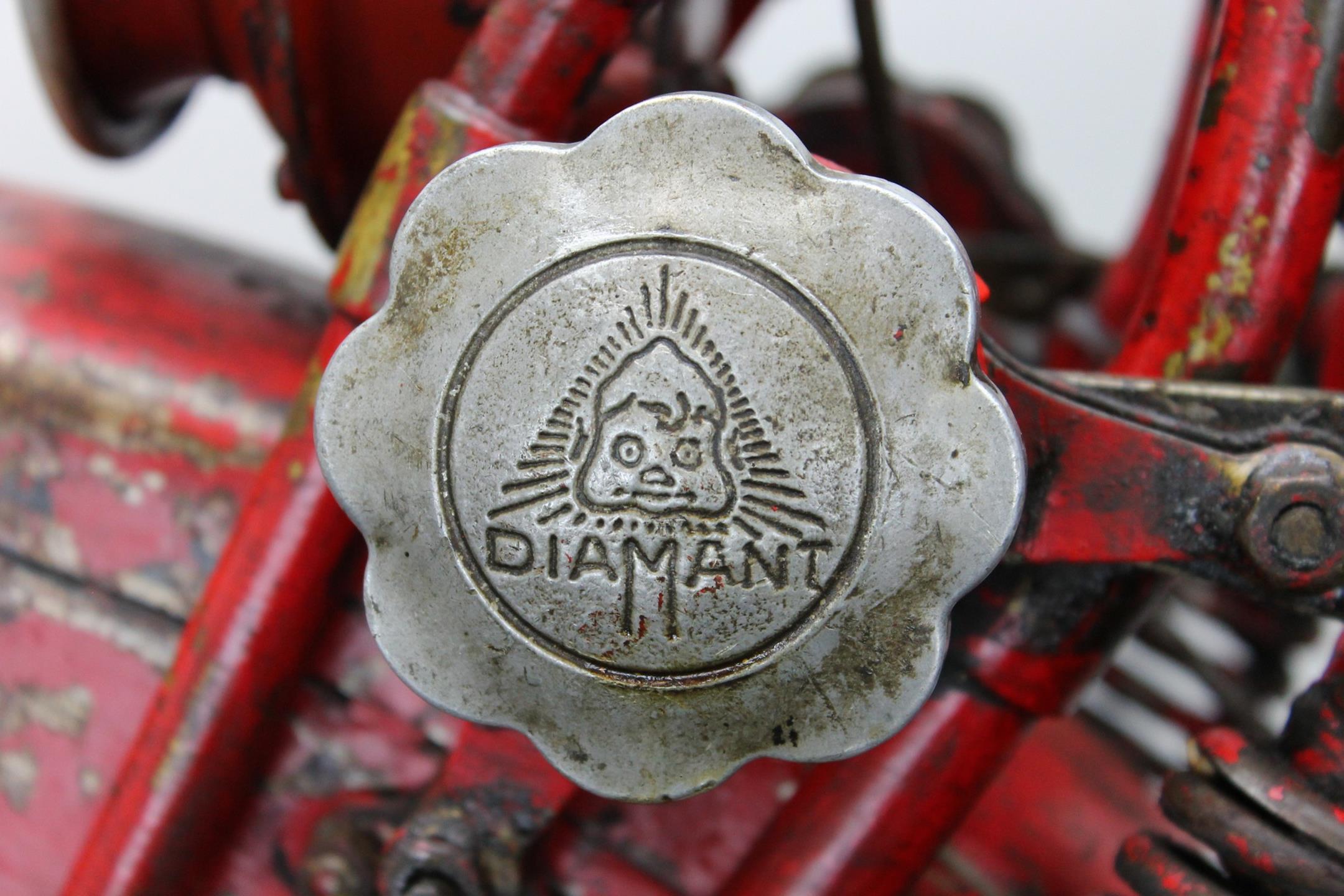 In 1885 the brothers Nevoigt founded a business for the production of steel quills and knitting machines. They choose “Diamant” (diamond) as their brand name, which ist still used on the most famous product range of the company: bicycles. Today, it is the oldest surviving bike manufacturer in Germany. From 1903 to 1908 around 300 Diamant motorbycicles had been build. With motorcycles becoming very popular in the 1920s the company launchd new four-stroke models. A 350 and a 500cc ohv-model was successfully entered in various race events and sold rather well. More economical sidevalve versions were availiable for less ambitious riders. Diamant motorcycles stood out of the competitors for two reasons: One is the colourful paint scheme ranging from orange on black to two-tone blue and chromium finish. The other ist the trademark logo of a boy’s face, still used today. In 1928 the company was taken over by Opel who had their famous cadmium-plated “Motoclub” bikes manufactured in Saxony until 1930. Built by Elite-Diamant for Opel – The Motoclub. One year later Diamant offered 74cc and 98cc Sachs-engined motorbycicles. Being tax-exempt, these small machines becam hugely popular in Germany, with more than 90 manufacturers trying to secure a share in the market. It is estimated that Diamant sold more than 17.000 units until 1942.