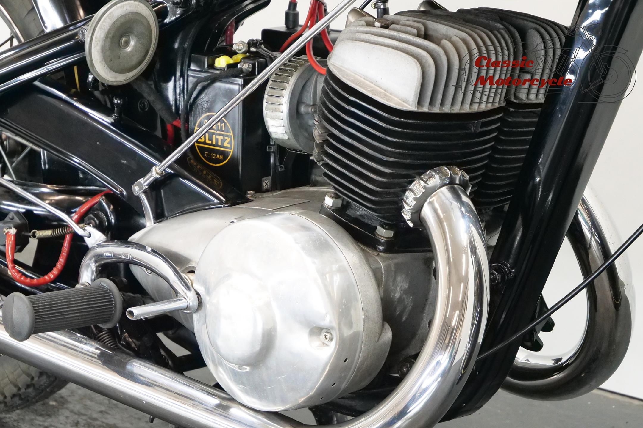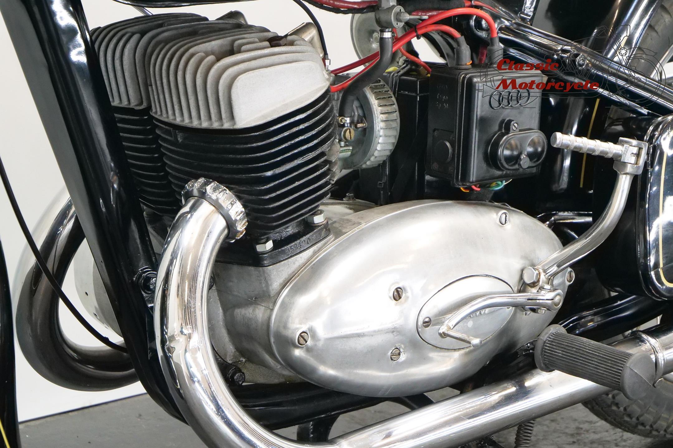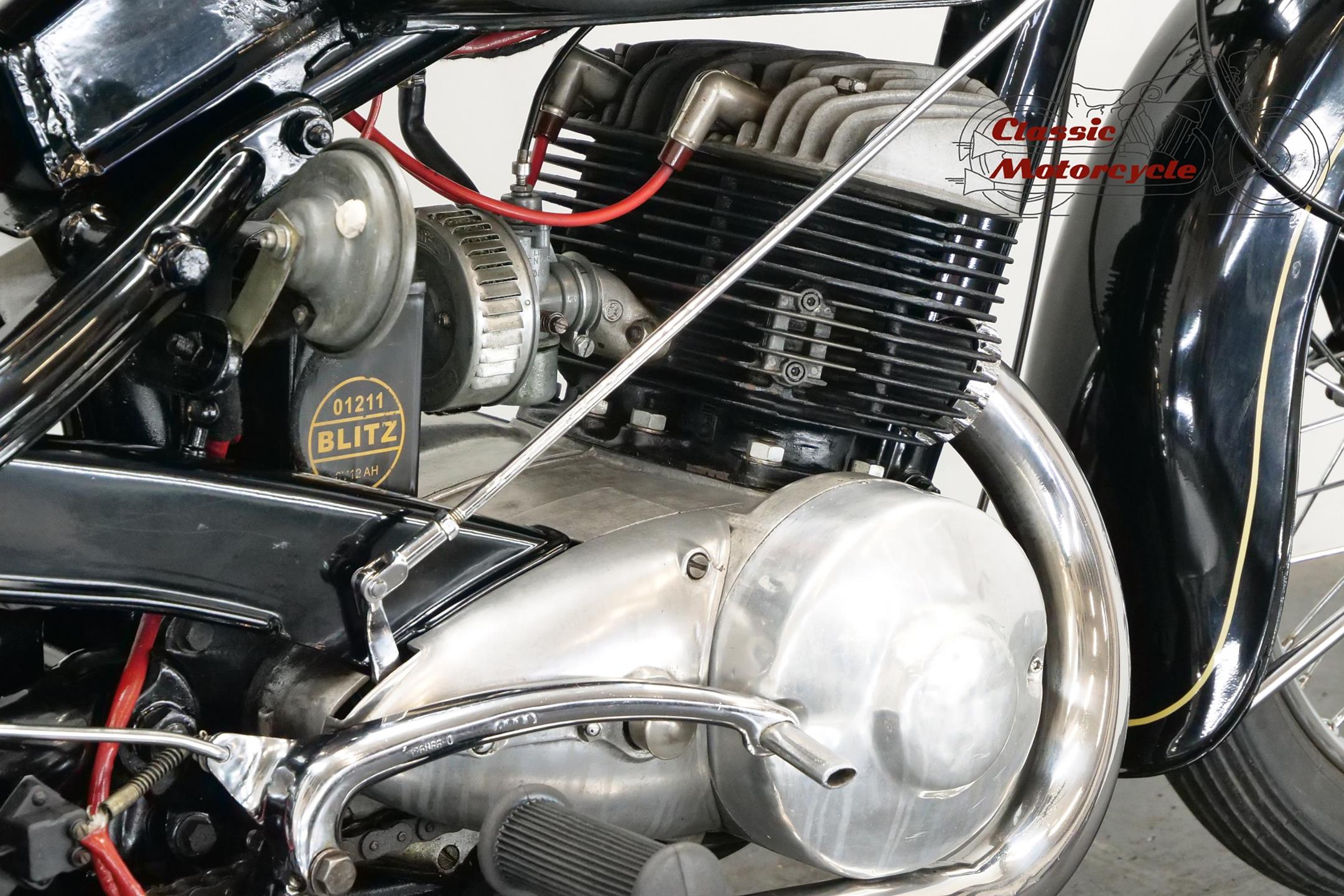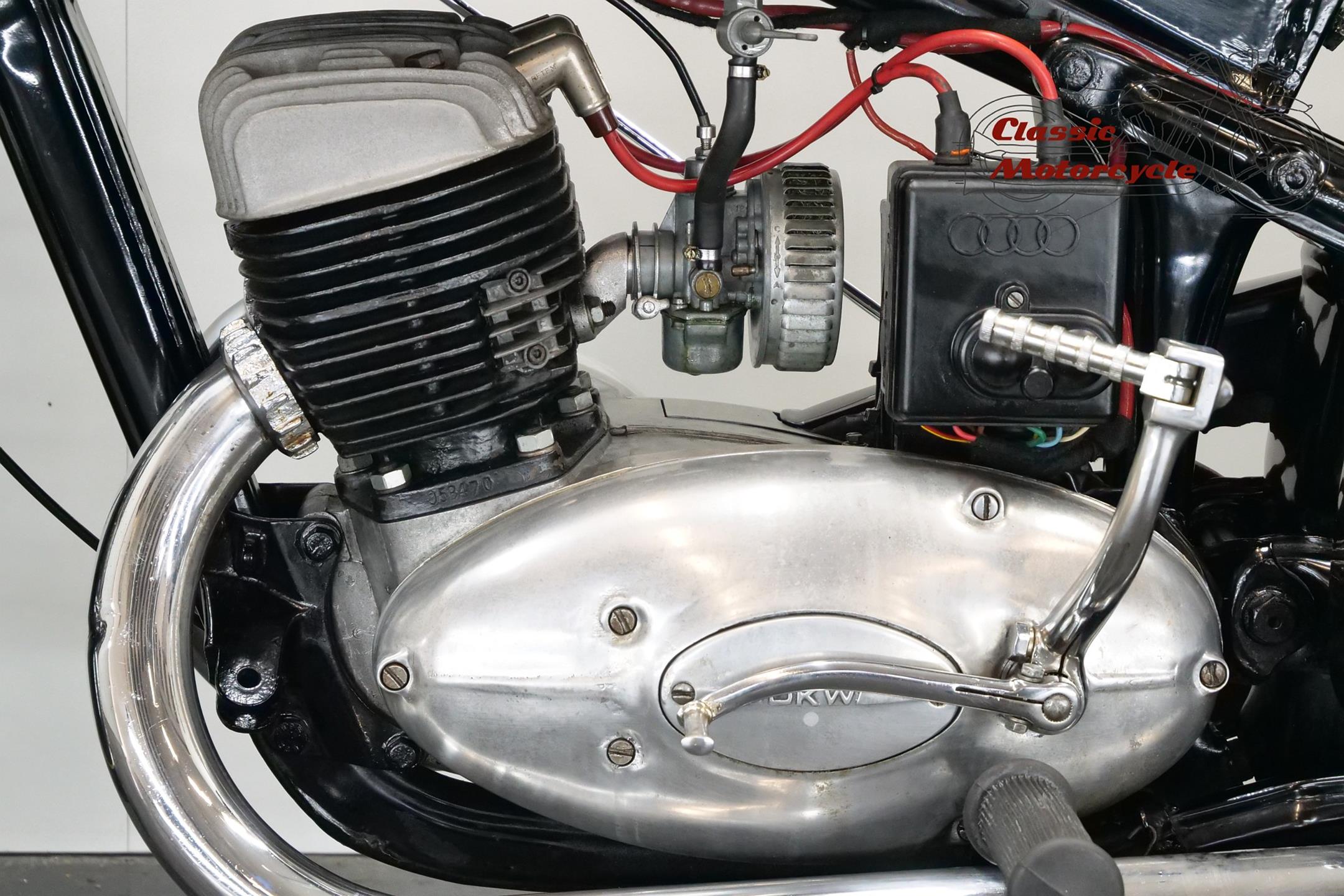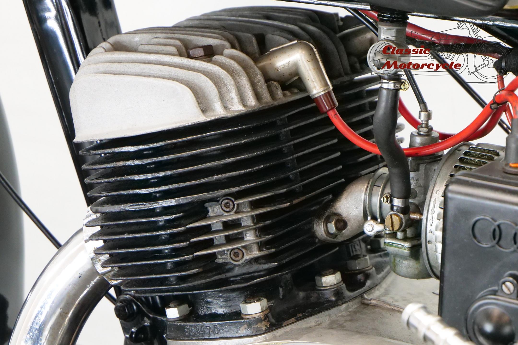 DKW was founded in Zschopau in 1919 by Danish engineer Jorgen Rasmussen and built its first motorcycle power unit, a single-cylinder, clip-on engine for bicycle attachment, in 1921. Designed by Hugo Ruppe, this 122cc motor was a two-stroke, and DKW would remain faithful to this engine type from then on, becoming world leaders in two-stroke design in the 1930s thanks to the prescient adoption of the Schnuerle loop-scavenge system. The latter used flat-topped pistons rather than the then-conventional deflector-crown type, relying on carefully angled transfer ports to direct the incoming charge around the cylinder. DKW was Continental Europe’s largest motorcycle maker at this time, manufacturing a huge and diverse range of road bikes during the 1930s, the NZ500 being one of the fastest and most powerful. An air-cooled twin of advanced design featuring swinging-arm rear suspension, the NZ500 employed engine dimensions of 64x76mm bore/stroke (for a capacity of 489cc) and produced 18.5hp. Representing the pinnacle of pre-war DKW motorcycle design, approximately 4,200 of these rare and desirable models were made between 1939 and 1942, almost all of which were supplied to Hitler’s SS.