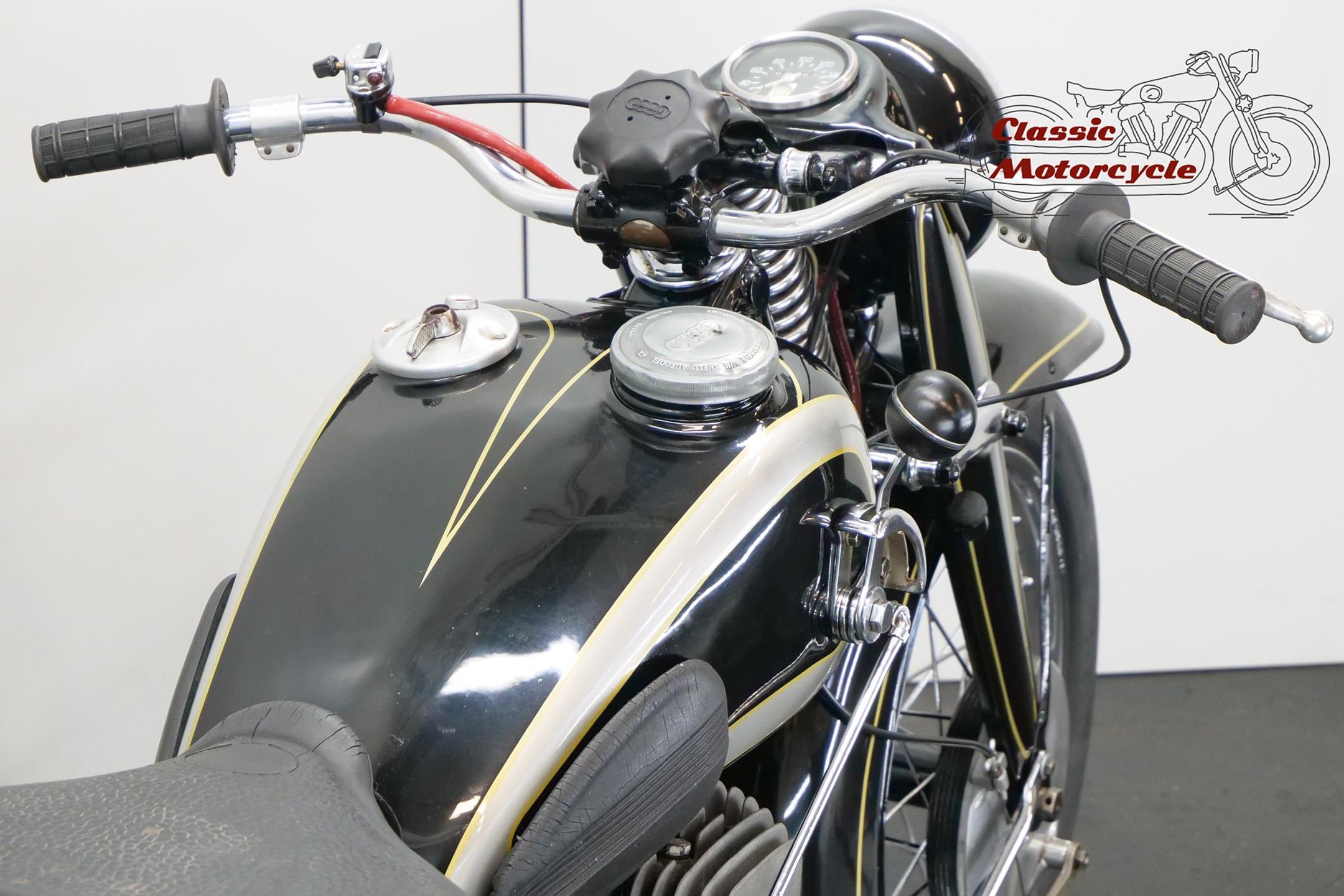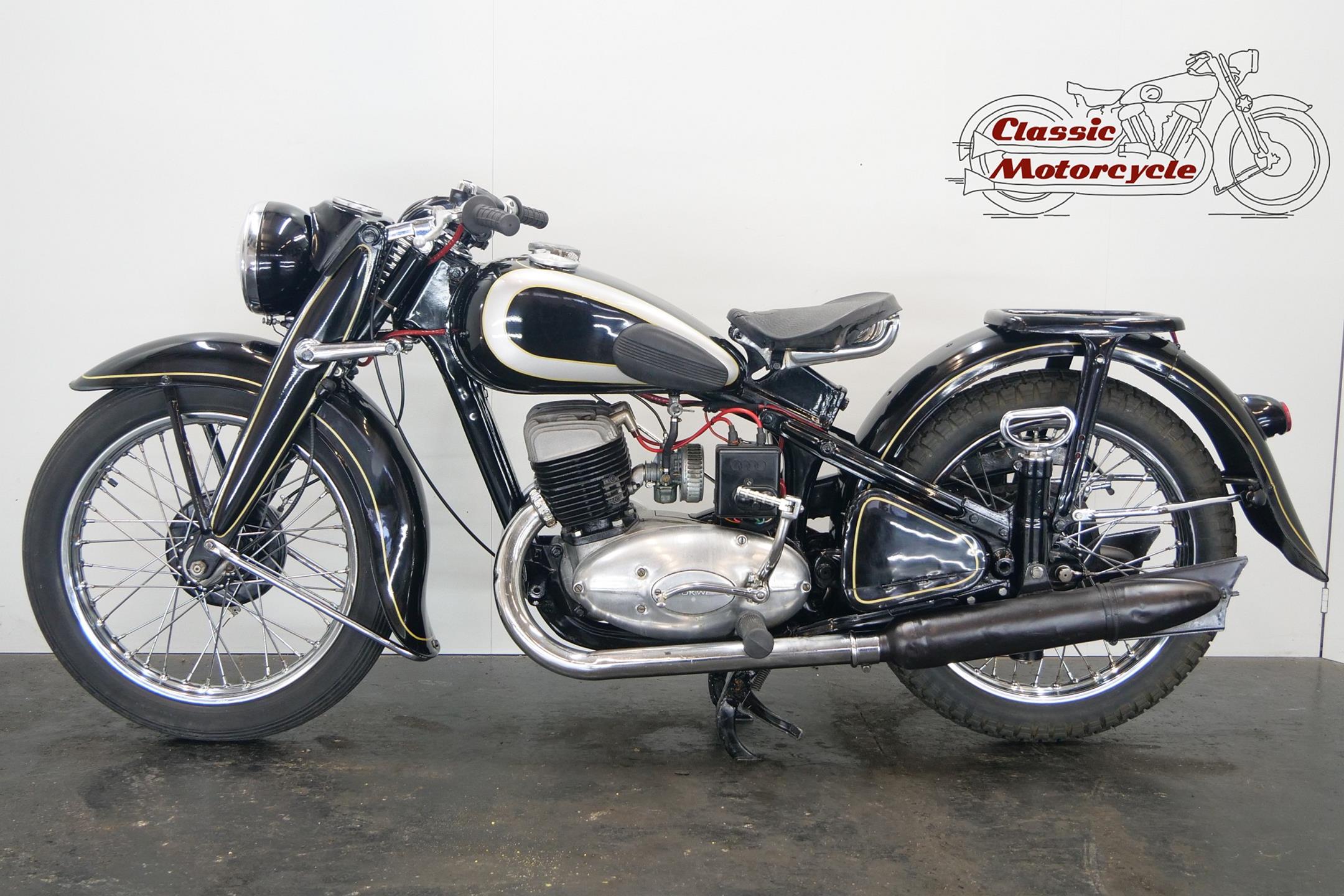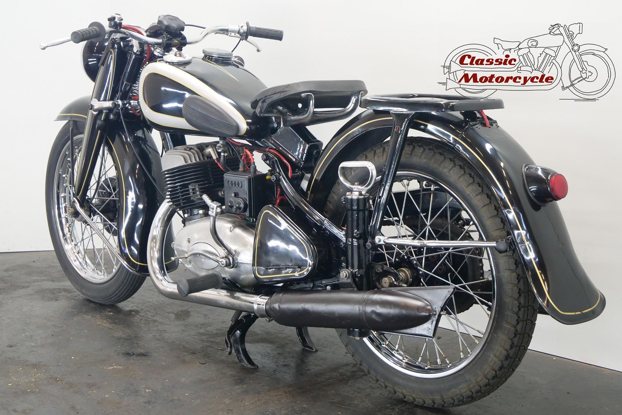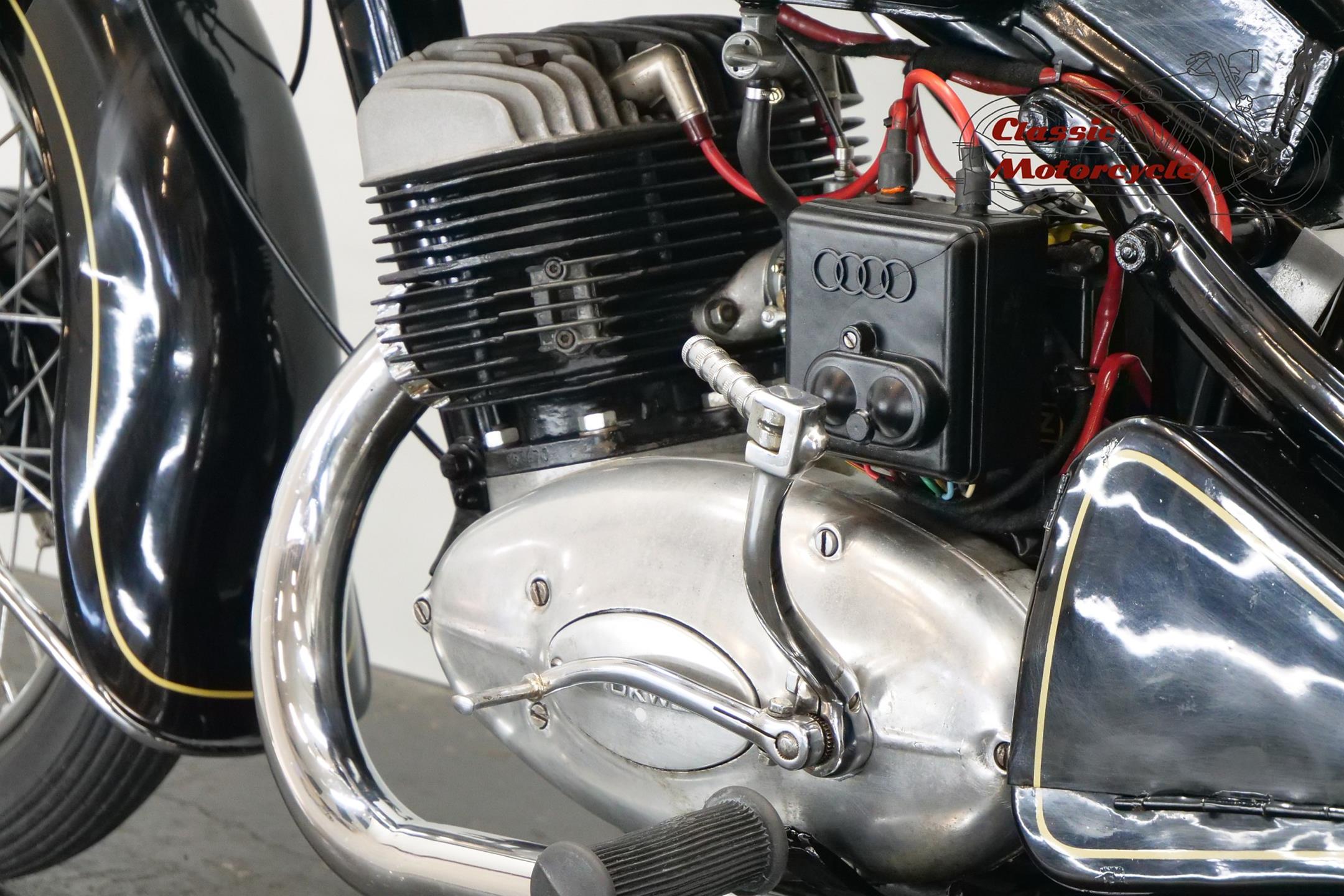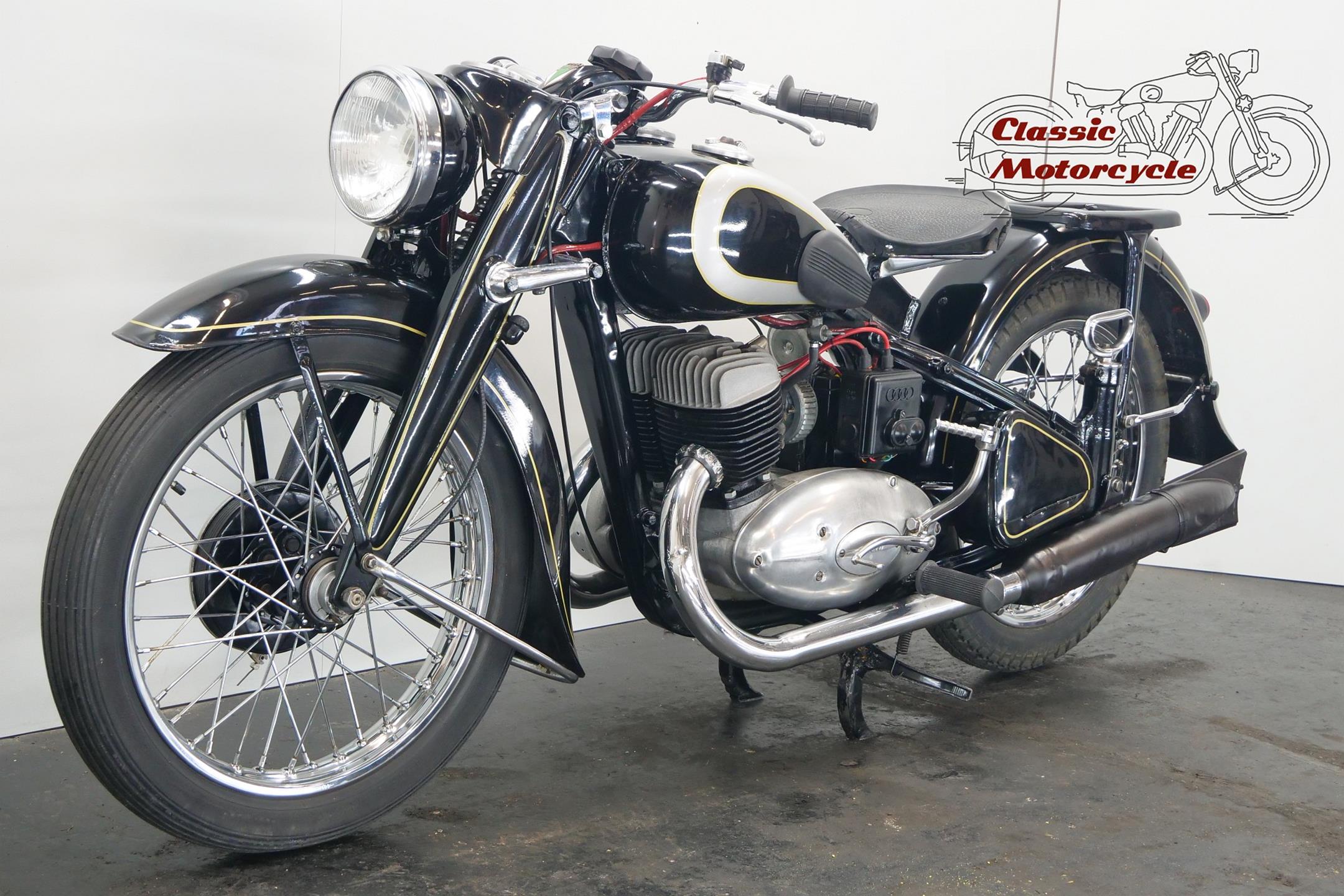DKW was founded in Zschopau in 1919 by Danish engineer Jorgen Rasmussen and built its first motorcycle power unit, a single-cylinder, clip-on engine for bicycle attachment, in 1921. Designed by Hugo Ruppe, this 122cc motor was a two-stroke, and DKW would remain faithful to this engine type from then on, becoming world leaders in two-stroke design in the 1930s thanks to the prescient adoption of the Schnuerle loop-scavenge system. The latter used flat-topped pistons rather than the then-conventional deflector-crown type, relying on carefully angled transfer ports to direct the incoming charge around the cylinder. DKW was Continental Europe’s largest motorcycle maker at this time, manufacturing a huge and diverse range of road bikes during the 1930s, the NZ500 being one of the fastest and most powerful. An air-cooled twin of advanced design featuring swinging-arm rear suspension, the NZ500 employed engine dimensions of 64x76mm bore/stroke (for a capacity of 489cc) and produced 18.5hp. Representing the pinnacle of pre-war DKW motorcycle design, approximately 4,200 of these rare and desirable models were made between 1939 and 1942, almost all of which were supplied to Hitler’s SS.