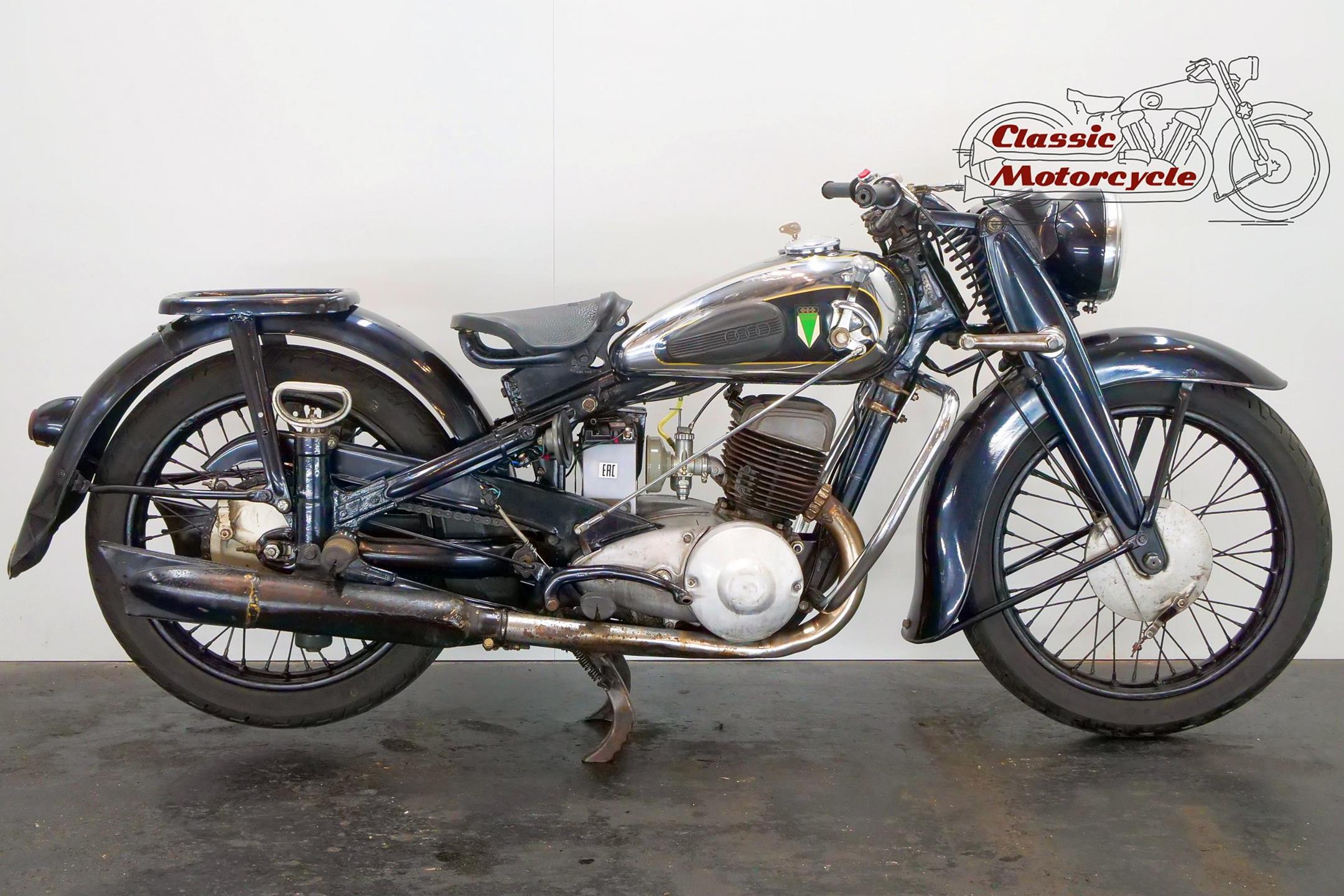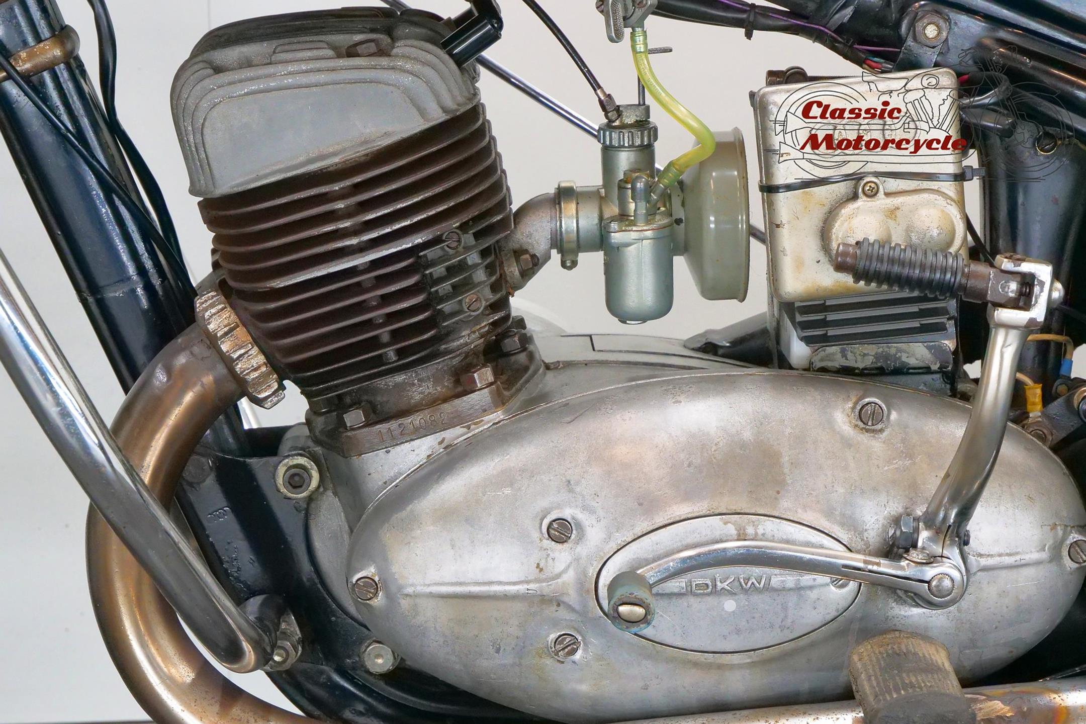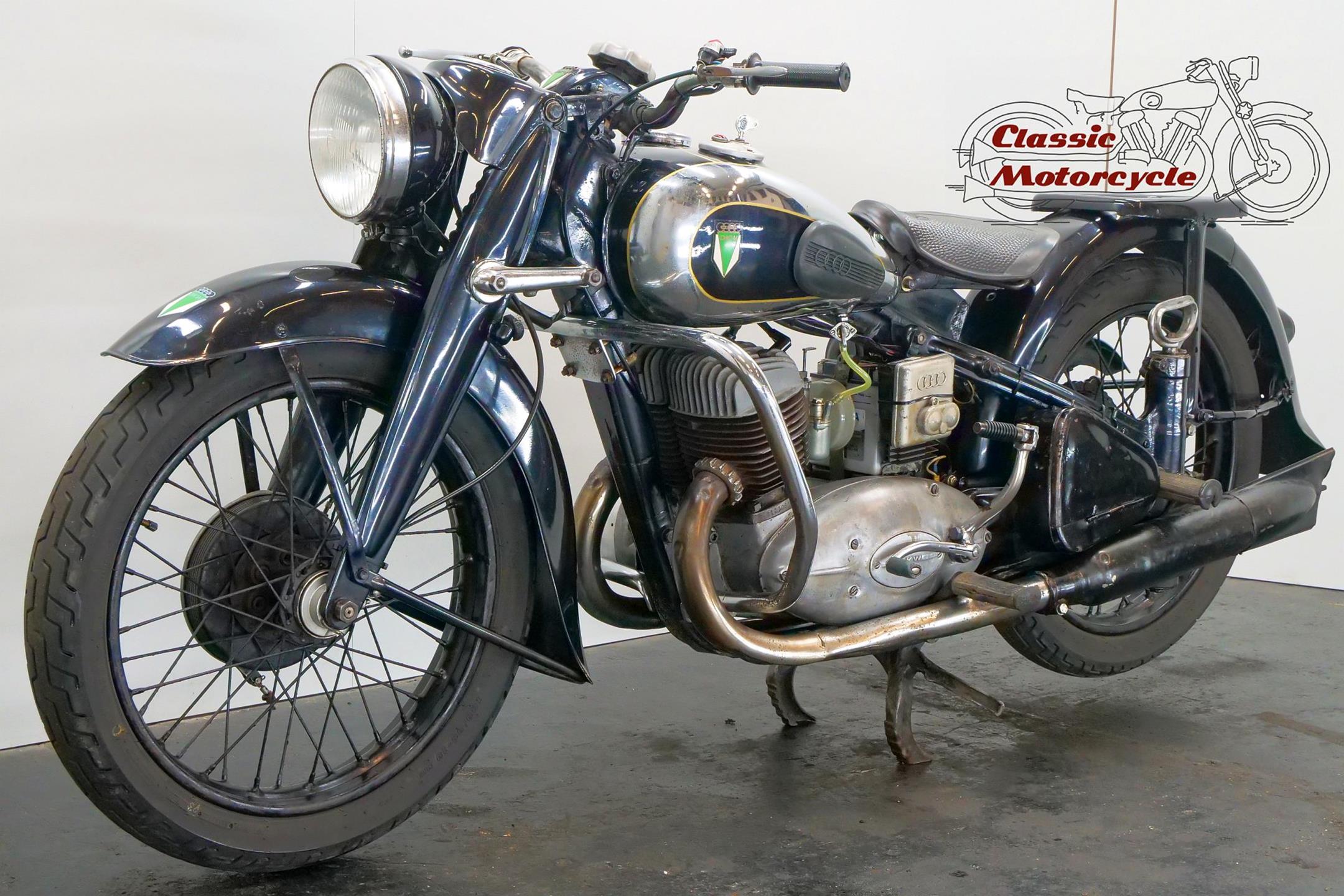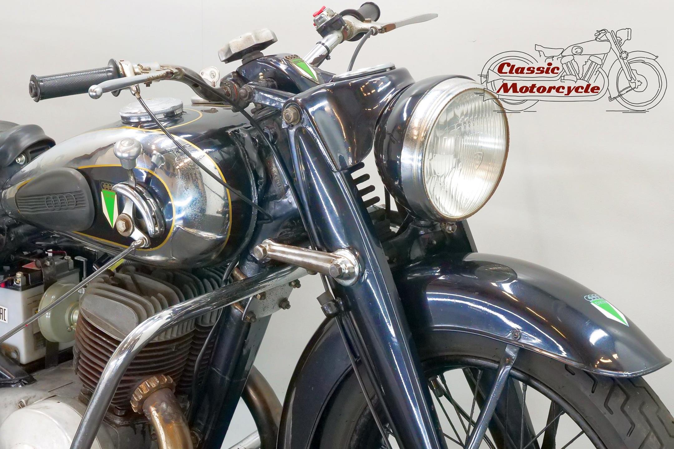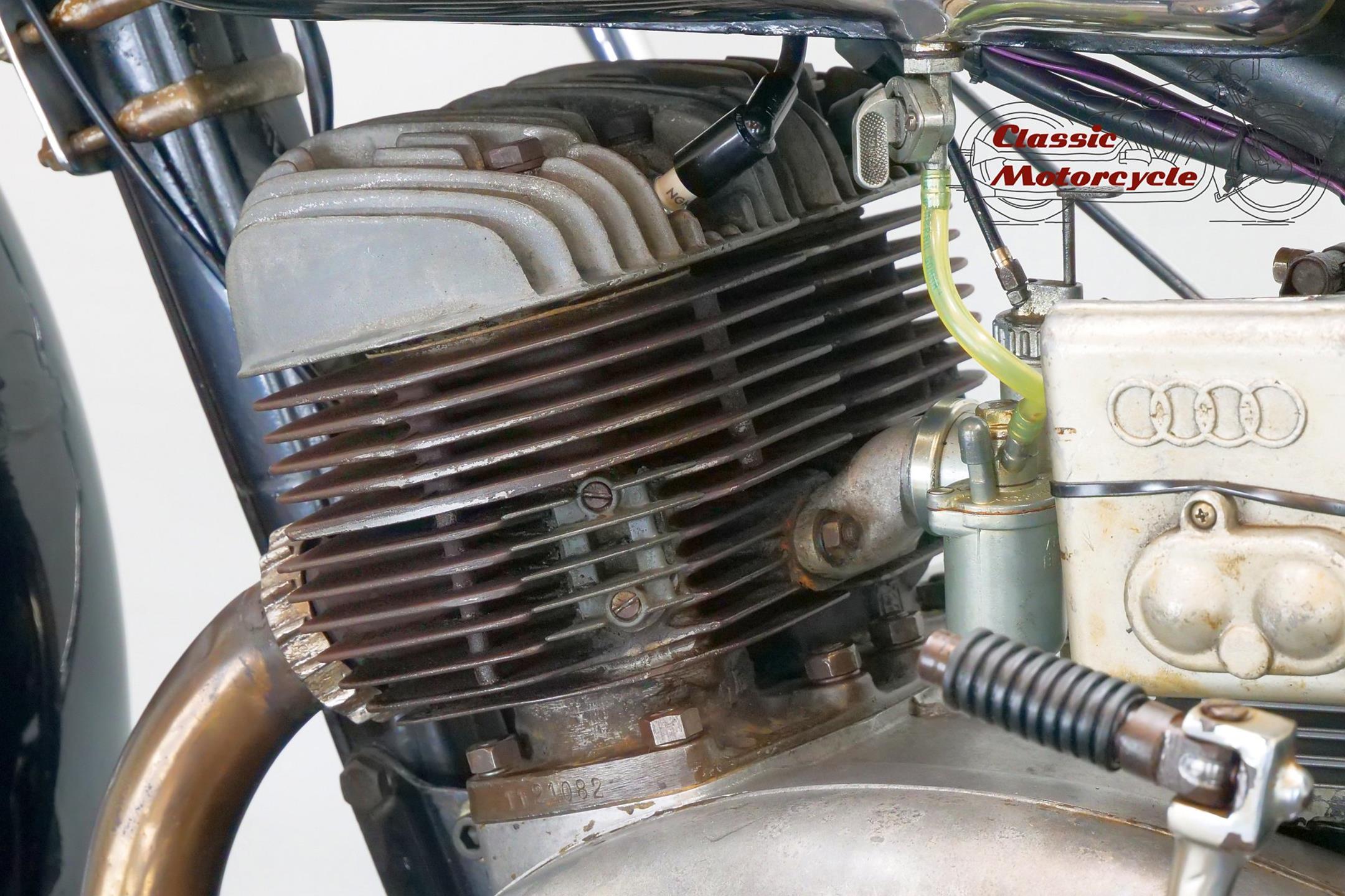 DKW was founded in Zschopau in 1919 by Danish engineer Jorgen Rasmussen and built its first motorcycle power unit, a single-cylinder, clip-on engine for bicycle attachment, in 1921. Designed by Hugo Ruppe, this 122cc motor was a two-stroke, and DKW would remain faithful to this engine type from then on, becoming world leaders in two-stroke design in the 1930s thanks to the prescient adoption of the Schnuerle loop-scavenge system. The latter used flat-topped pistons rather than the then-conventional deflector-crown type, relying on carefully angled transfer ports to direct the incoming charge around the cylinder. DKW was Continental Europe’s largest motorcycle maker at this time, manufacturing a huge and diverse range of road bikes during the 1930s, the NZ500 being one of the fastest and most powerful. An air-cooled twin of advanced design featuring swinging-arm rear suspension, the NZ500 employed engine dimensions of 64x76mm bore/stroke (for a capacity of 489cc) and produced 18.5bhp. Representing the pinnacle of pre-war DKW motorcycle design, approximately 4,200 of these rare and desirable models were made between 1939 and 1942, almost all of which were supplied to Hitler’s SS.