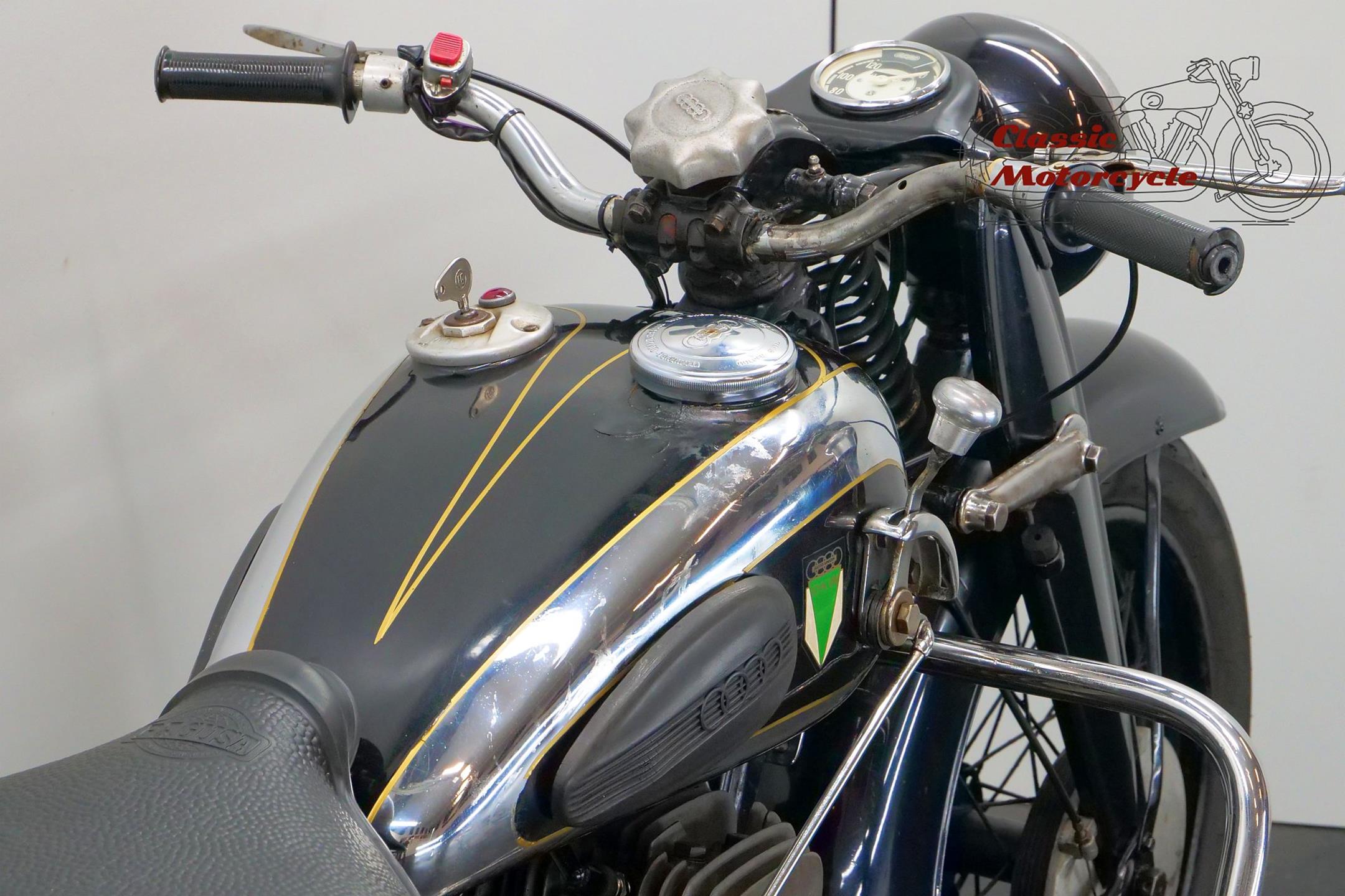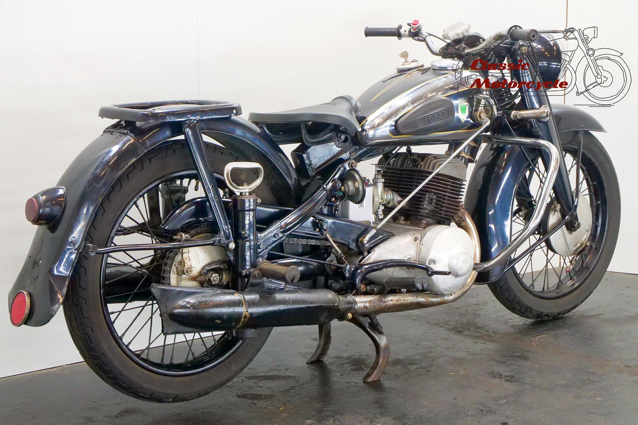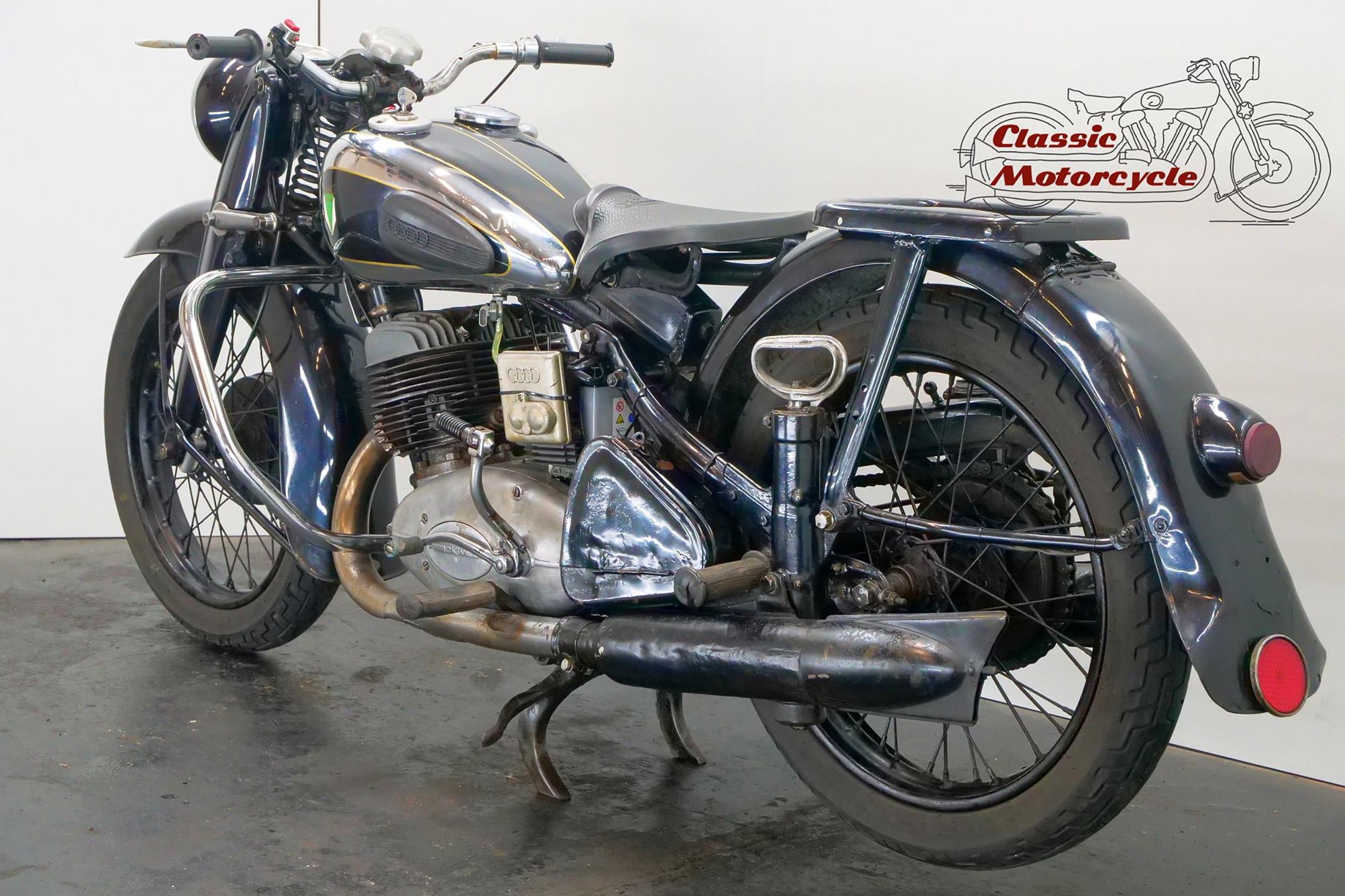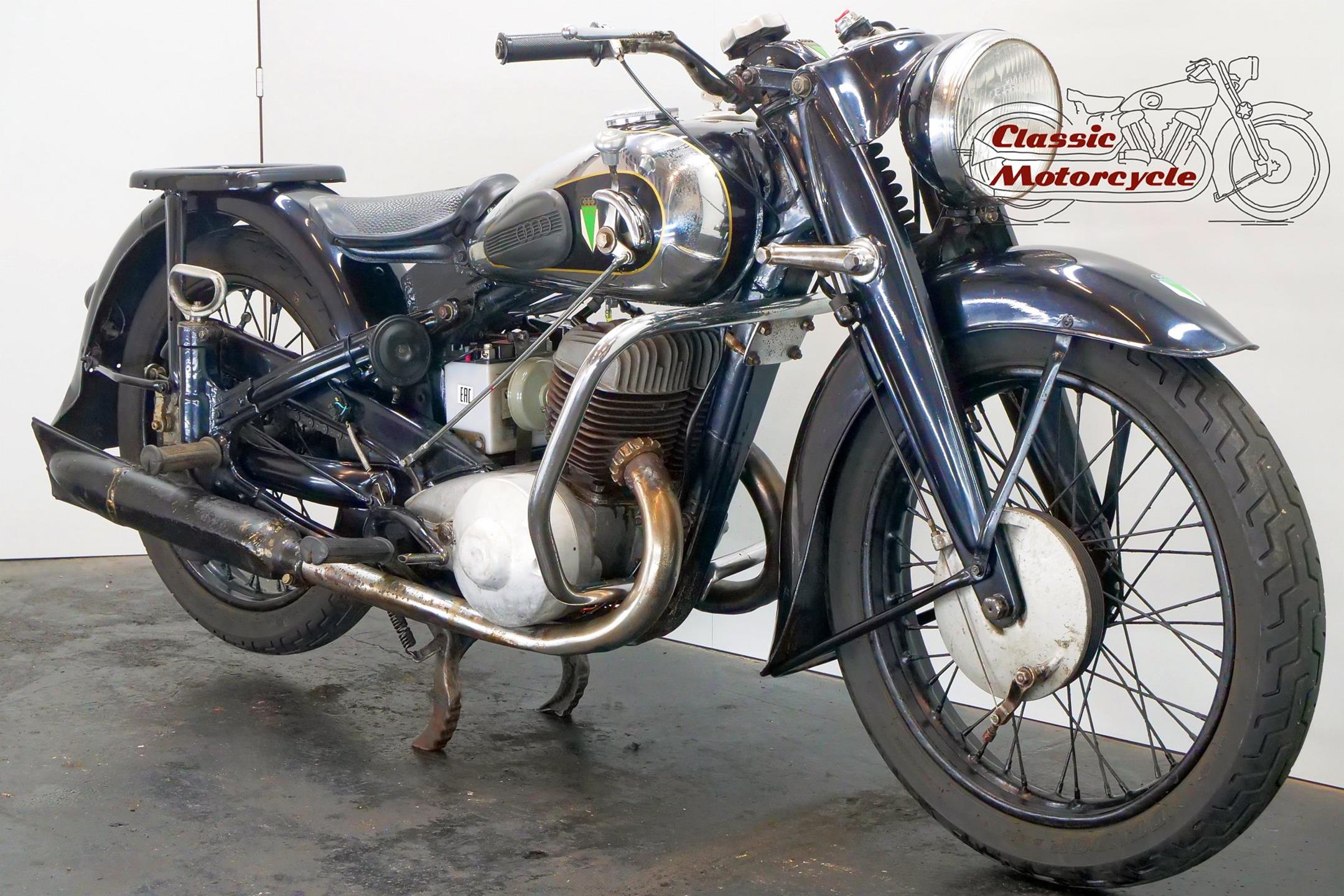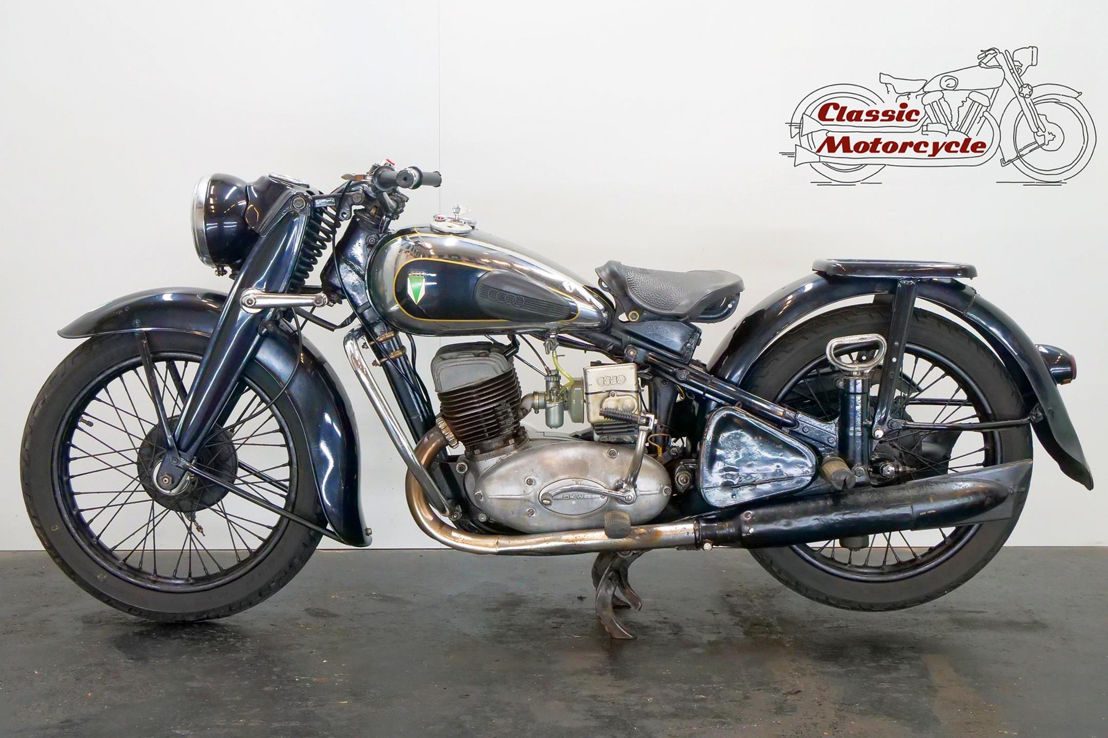 DKW was founded in Zschopau in 1919 by Danish engineer Jorgen Rasmussen and built its first motorcycle power unit, a single-cylinder, clip-on engine for bicycle attachment, in 1921. Designed by Hugo Ruppe, this 122cc motor was a two-stroke, and DKW would remain faithful to this engine type from then on, becoming world leaders in two-stroke design in the 1930s thanks to the prescient adoption of the Schnuerle loop-scavenge system. The latter used flat-topped pistons rather than the then-conventional deflector-crown type, relying on carefully angled transfer ports to direct the incoming charge around the cylinder. DKW was Continental Europe’s largest motorcycle maker at this time, manufacturing a huge and diverse range of road bikes during the 1930s, the NZ500 being one of the fastest and most powerful. An air-cooled twin of advanced design featuring swinging-arm rear suspension, the NZ500 employed engine dimensions of 64x76mm bore/stroke (for a capacity of 489cc) and produced 18.5bhp. Representing the pinnacle of pre-war DKW motorcycle design, approximately 4,200 of these rare and desirable models were made between 1939 and 1942, almost all of which were supplied to Hitler’s SS.