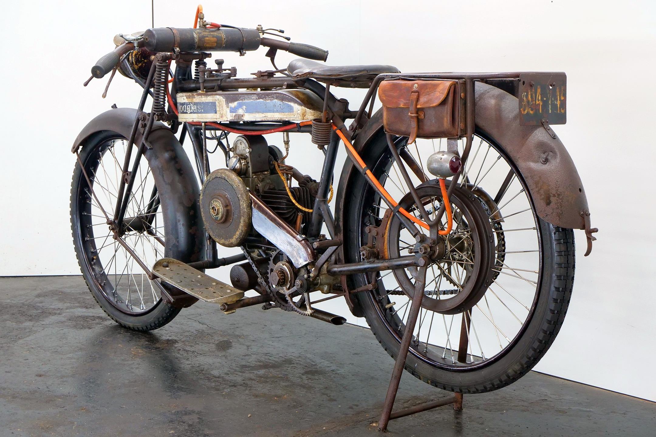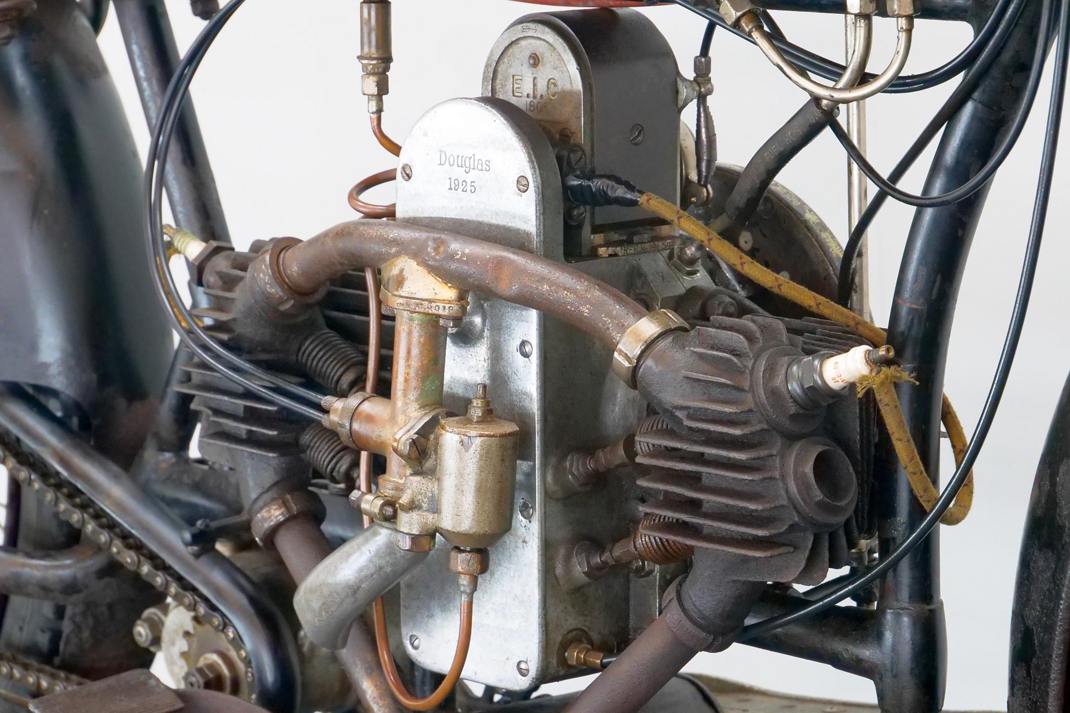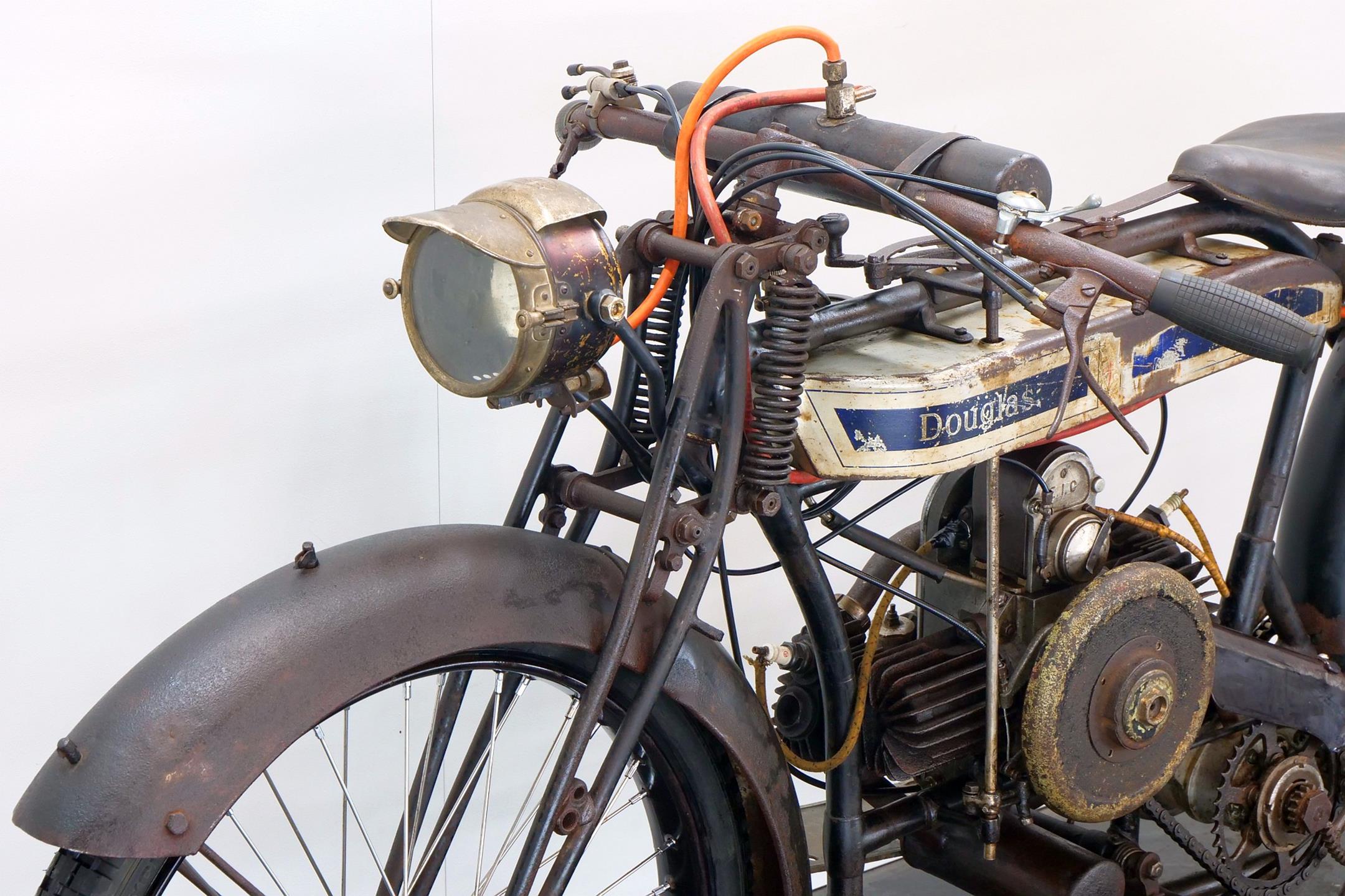 The Bristol-based Douglas Foundry took up motorcycle production in 1907 with a machine powered by a horizontally-opposed twin, and the company would keep faith with this engine layout until it ceased motorcycle production in 1957. Fore-and-aft installation made for a slim machine with a low centre of gravity, and the design's virtues were soon demonstrated in competition, Douglas machines taking first, second, and fourth places in the 1912 Junior TT in the Isle of Man. Douglas were quick realise the advantages of the countershaft gearbox, its three-speed entries gaining the Team Prize in the 1914 Six Days Trial, a conspicuous success which resulted in the firm obtaining a wartime contract for the supply of military machines. This Douglas CW has a 350cc sidevalve engine of 'fixed head' type with outside flywheel and magneto ignition, while the transmission comprises chain primary drive to a three-speed gearbox with chain final drive. The front fork is of the side-spring type while retardation is by means of v-block belt-rim brakes front and rear.
