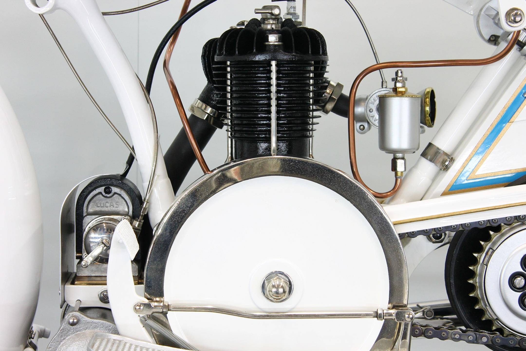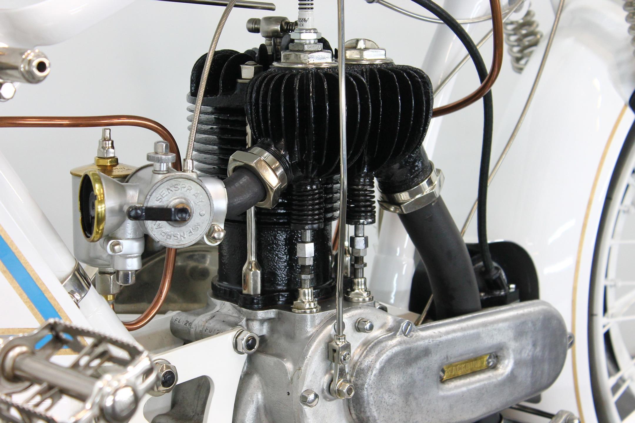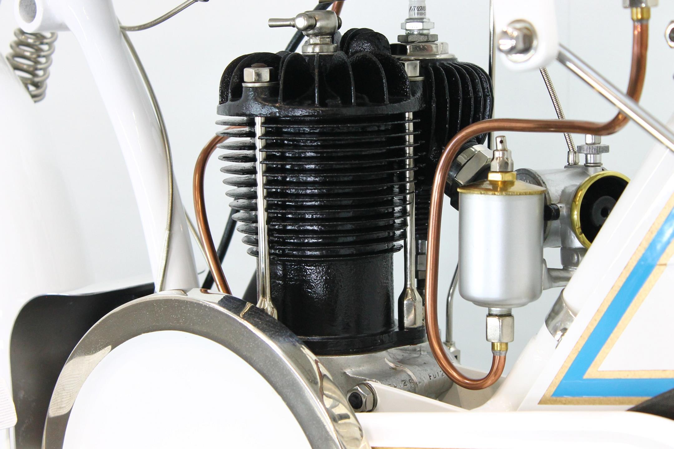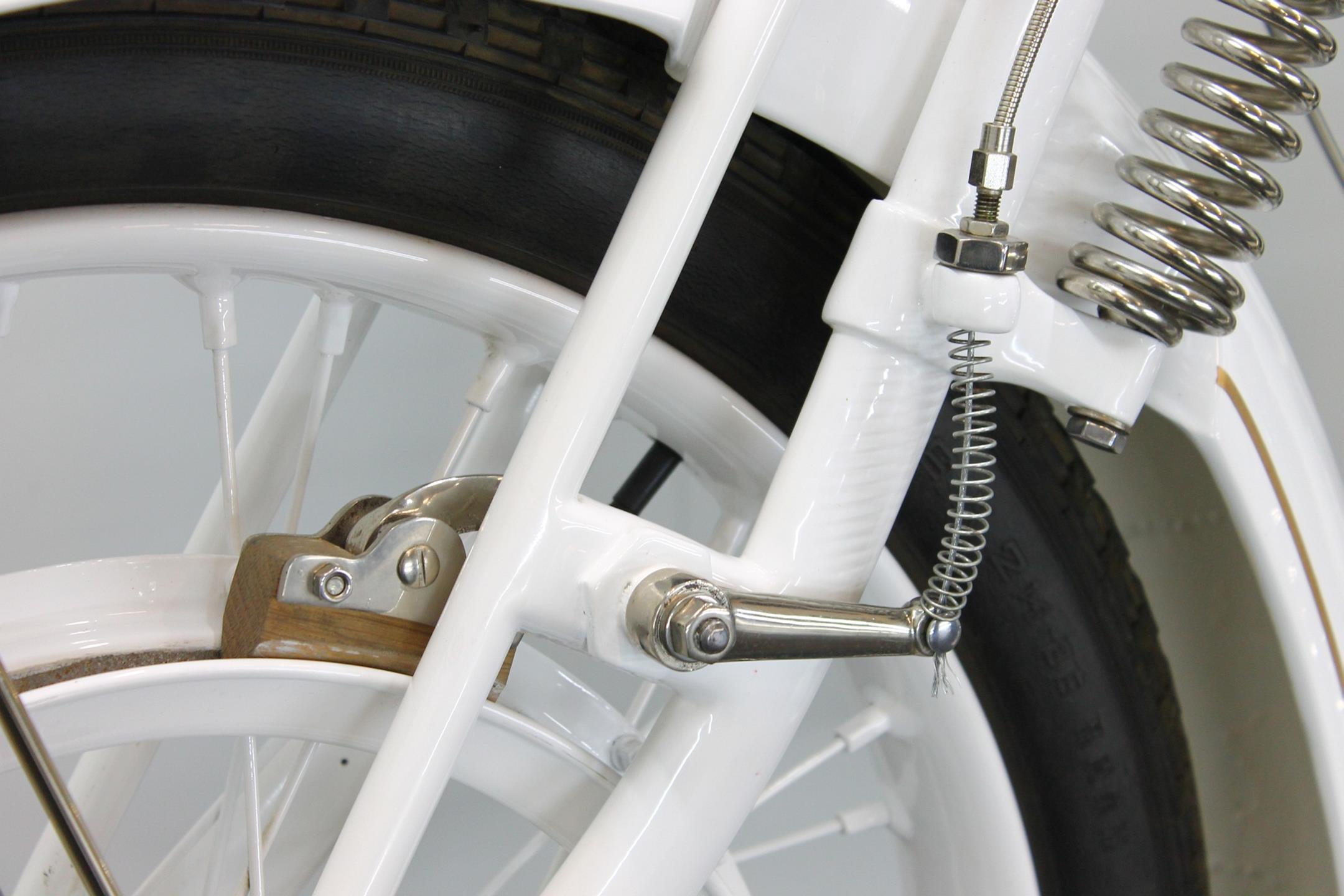 This sturdy bike is equipped with a 548cc Blackburne engine, heavy duty four bolt Sturmey Archer three speed gearbox, senspray carburetor and a massive flywheel to make sure that the engine runs very smooth. Special feature on this bike is the three bolt detachable cylinder head. This fine running chain-cum-belt Excelsior has been restored to highest possible standard the paint is perfect and the stripping is painted as well how it should be. The white paint gives the motorcycle a noble appearance.