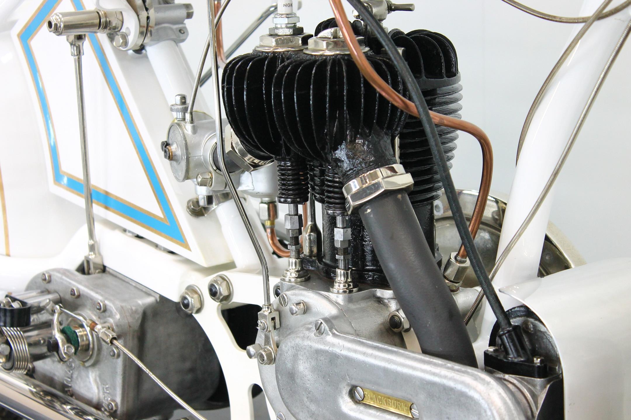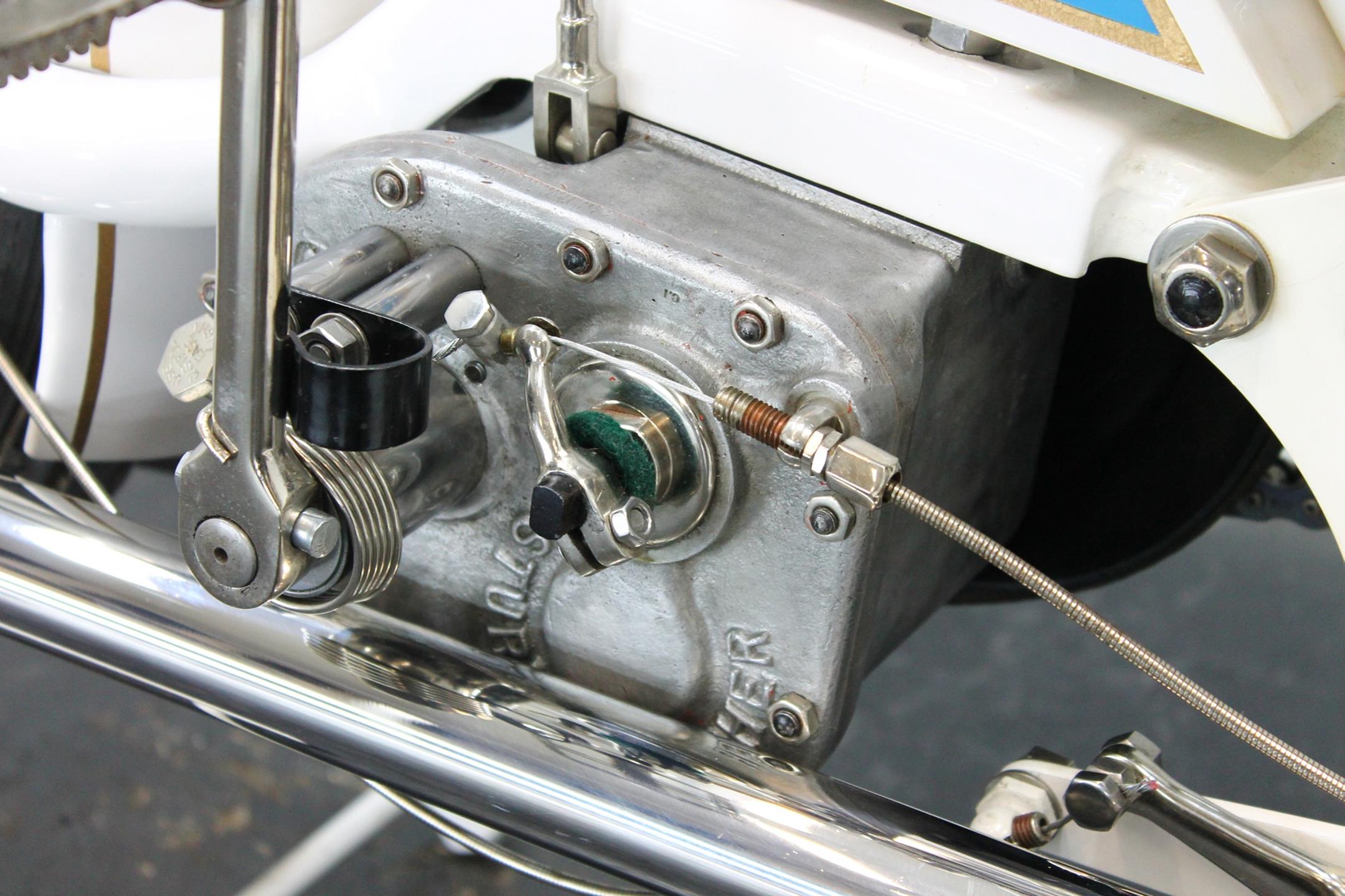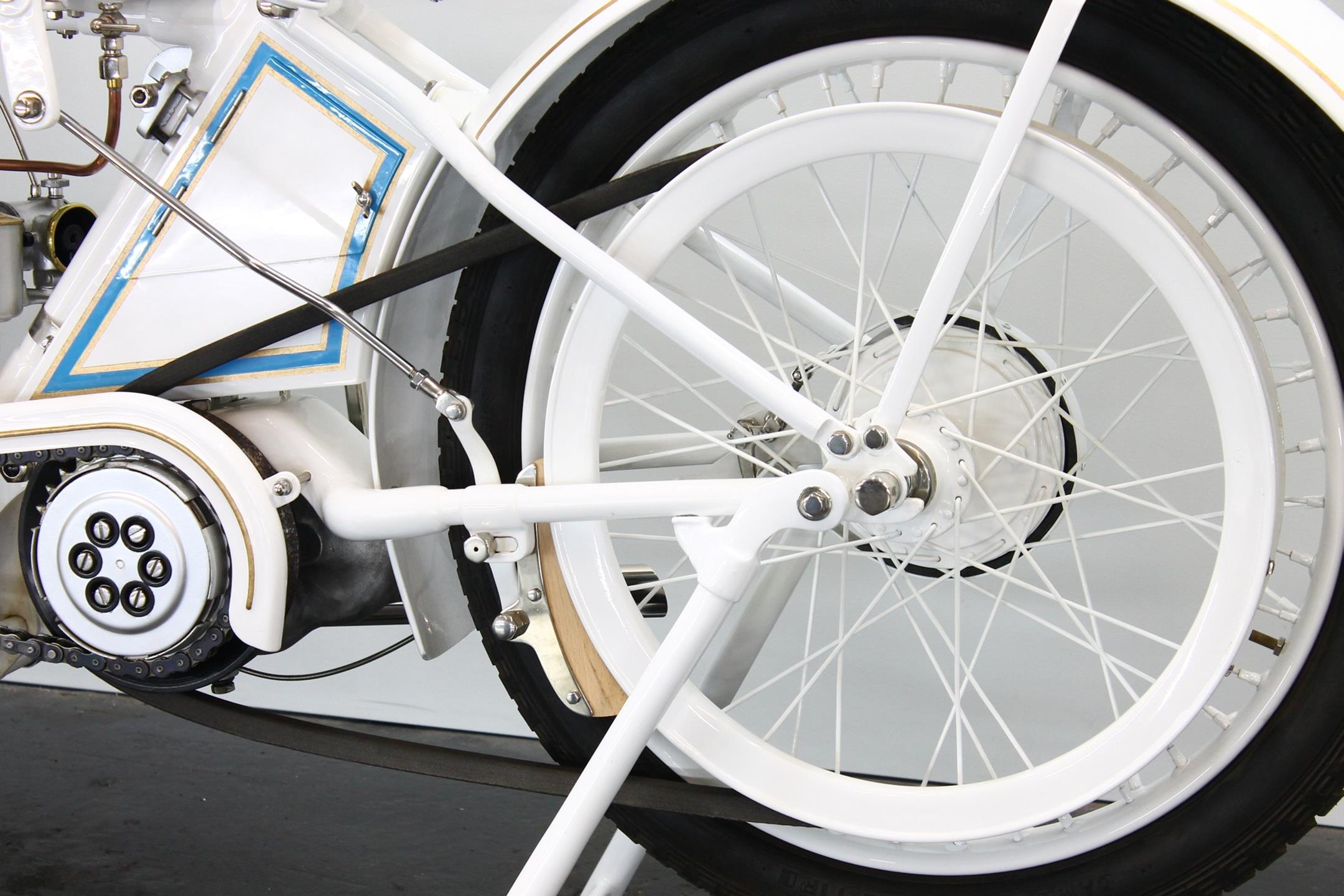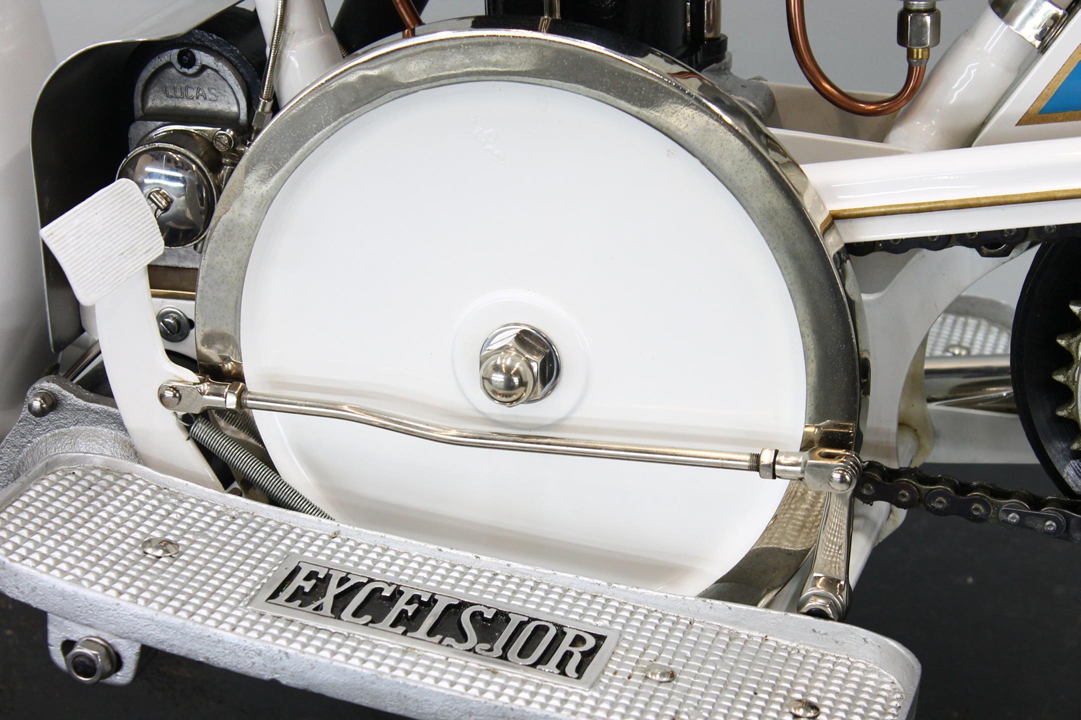 This sturdy bike is equipped with a 548cc Blackburne engine, heavy duty four bolt Sturmey Archer three speed gearbox, senspray carburetor and a massive flywheel to make sure that the engine runs very smooth. Special feature on this bike is the three bolt detachable cylinder head. This fine running chain-cum-belt Excelsior has been restored to highest possible standard the paint is perfect and the stripping is painted as well how it should be. The white paint gives the motorcycle a noble appearance.