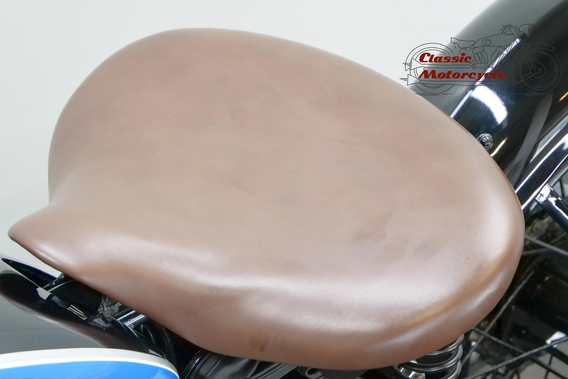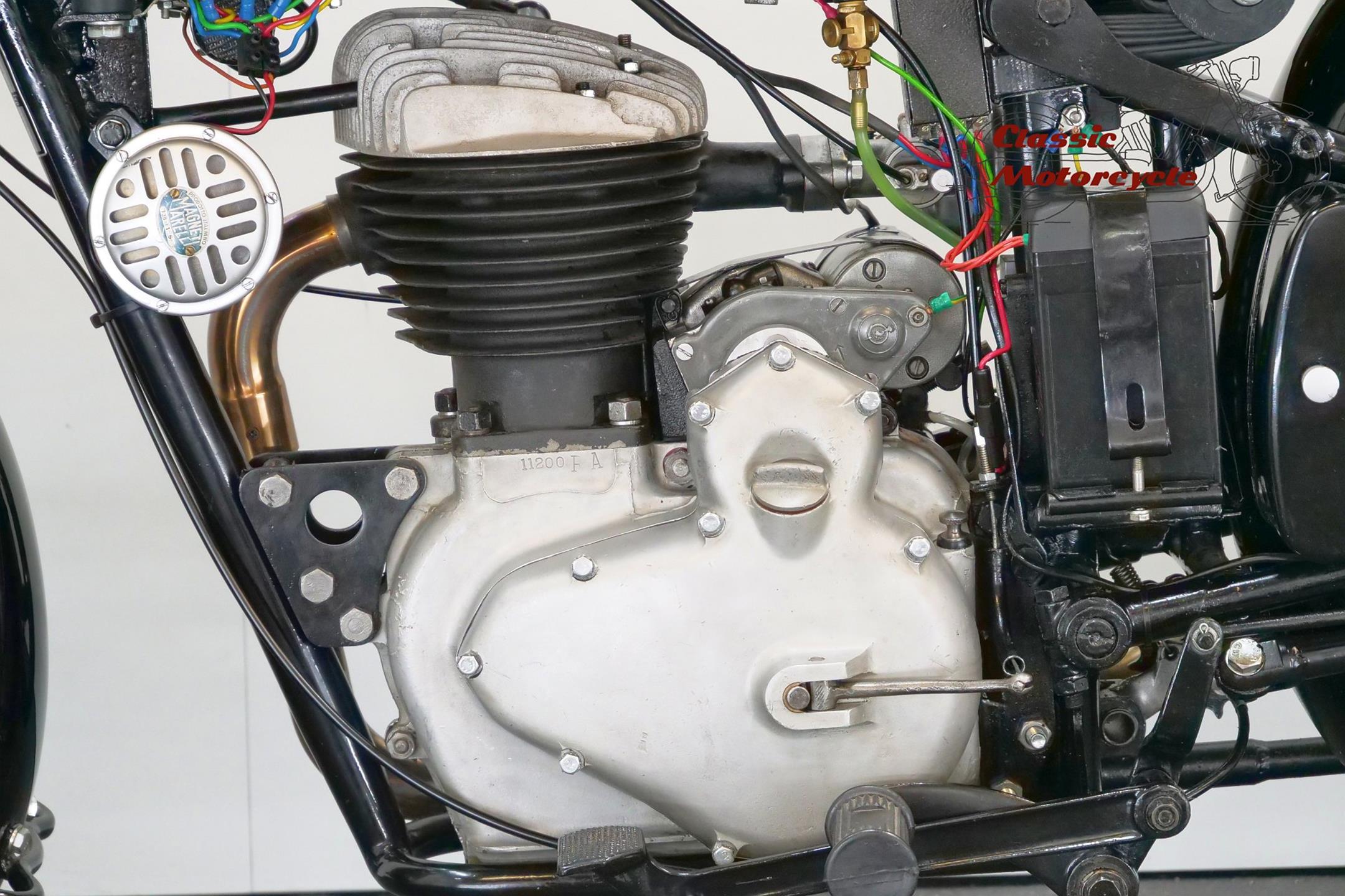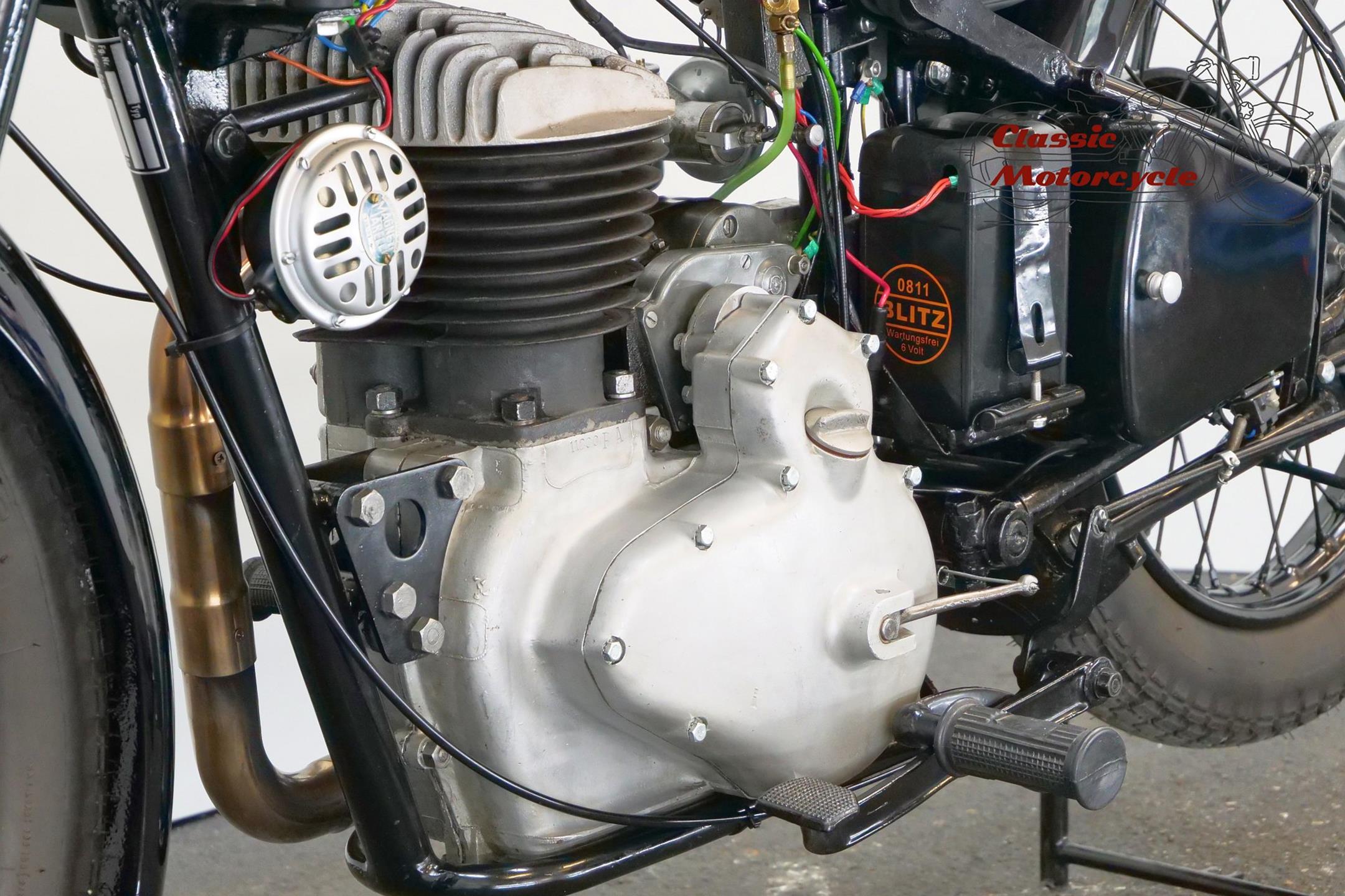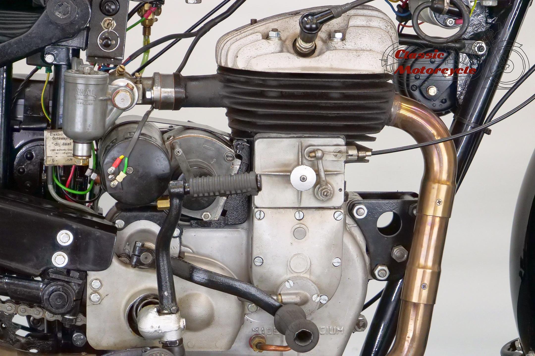 Fabrique Nationale d’Armes de Guerre, S.A., of Herstal, Belgium, had a long history with military organisations as suppliers of arms, notably guns, and only later did they achieve similar renown as manufacturers of military motorcycles. This example, believed to be the Model 13, which was introduced in 1947, is powered by a 448cc, side-valve engine which developed 11hp and drove through a four-speed, unit construction, foot-change gearbox. The distinctive rubber band suspension system, which this example features, was retained until 1951 when it was replaced by more conventional telescopic front suspension and trailing rear forks.