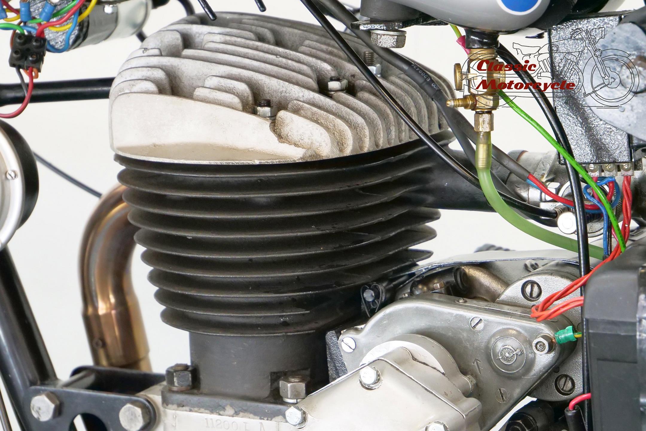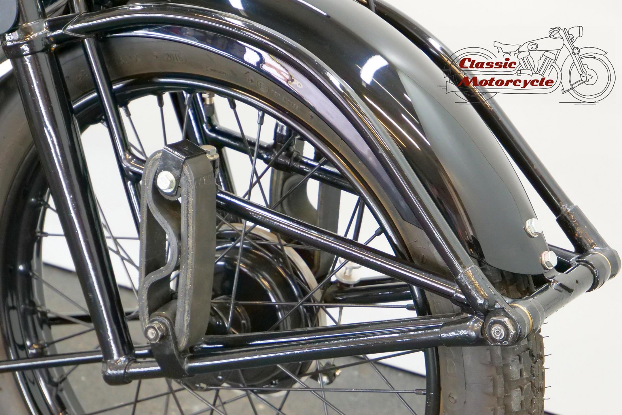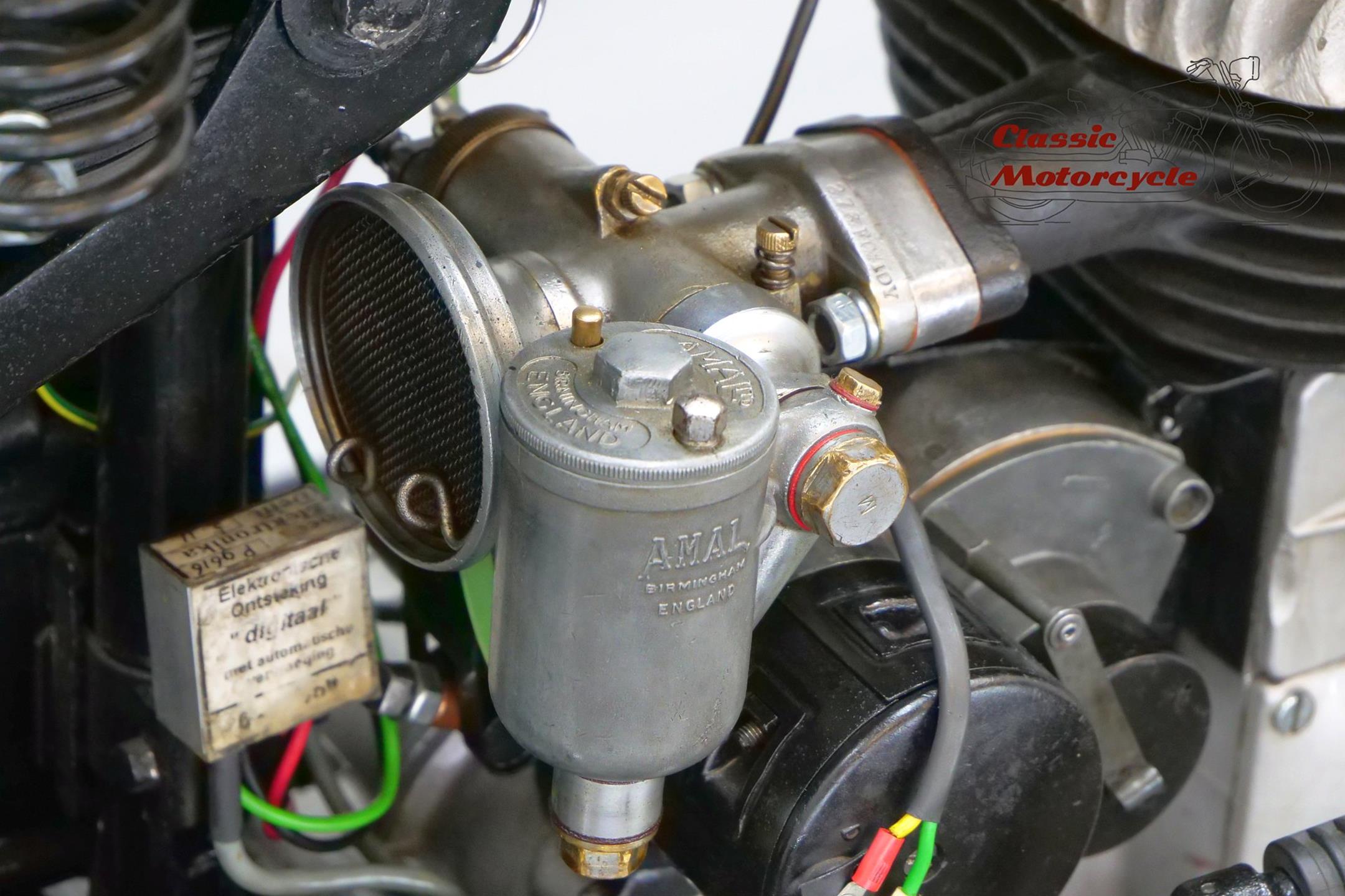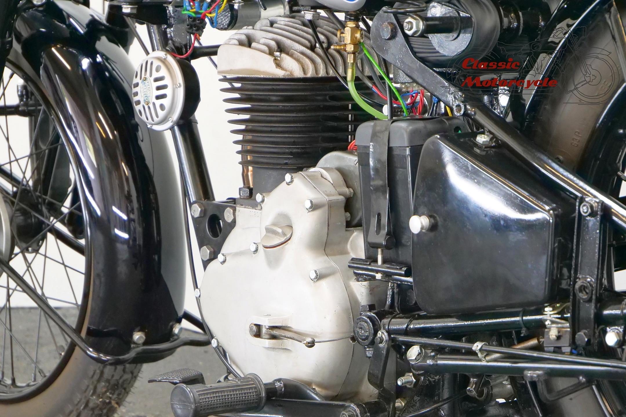 Fabrique Nationale d’Armes de Guerre, S.A., of Herstal, Belgium, had a long history with military organisations as suppliers of arms, notably guns, and only later did they achieve similar renown as manufacturers of military motorcycles. This example, believed to be the Model 13, which was introduced in 1947, is powered by a 448cc, side-valve engine which developed 11hp and drove through a four-speed, unit construction, foot-change gearbox. The distinctive rubber band suspension system, which this example features, was retained until 1951 when it was replaced by more conventional telescopic front suspension and trailing rear forks.