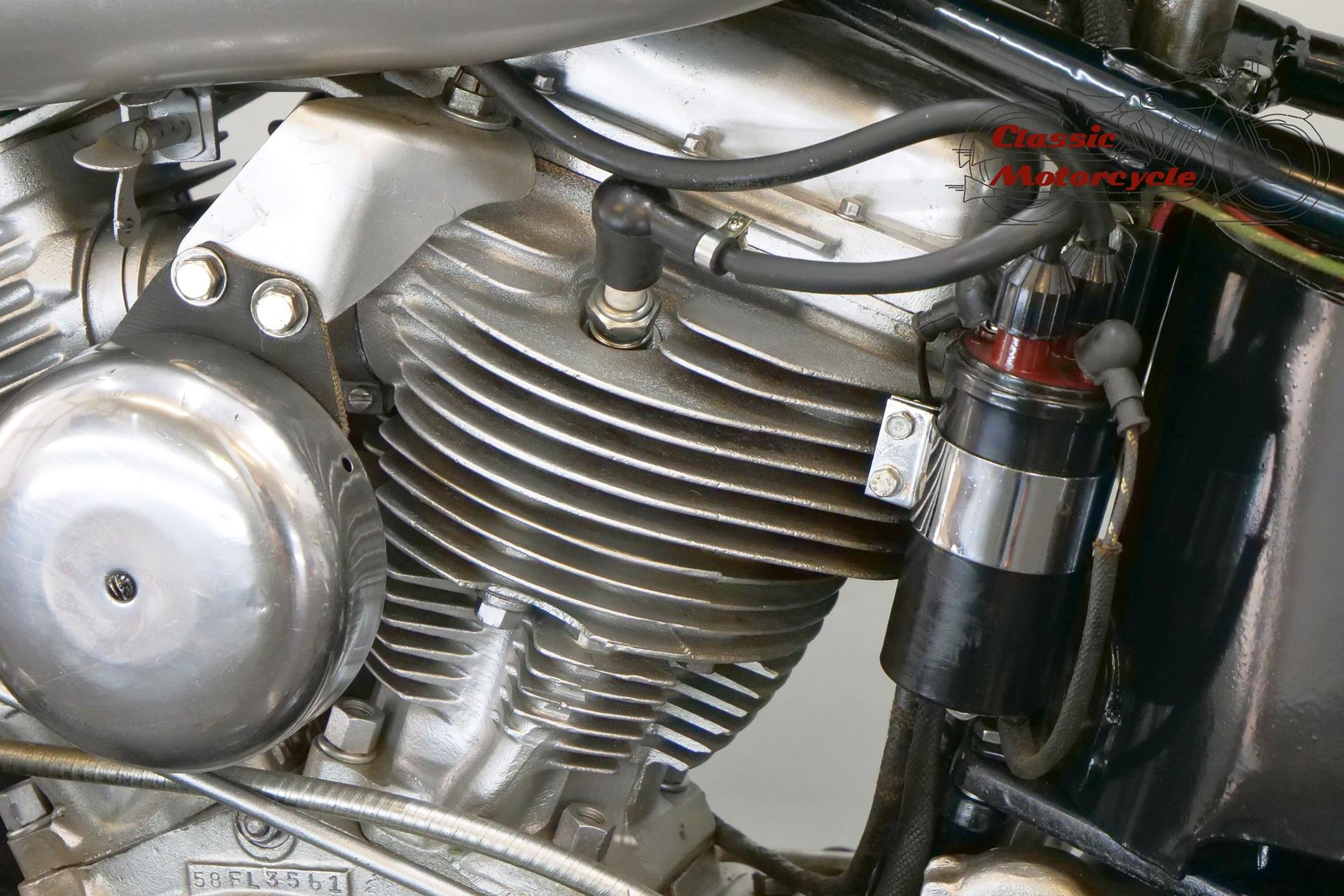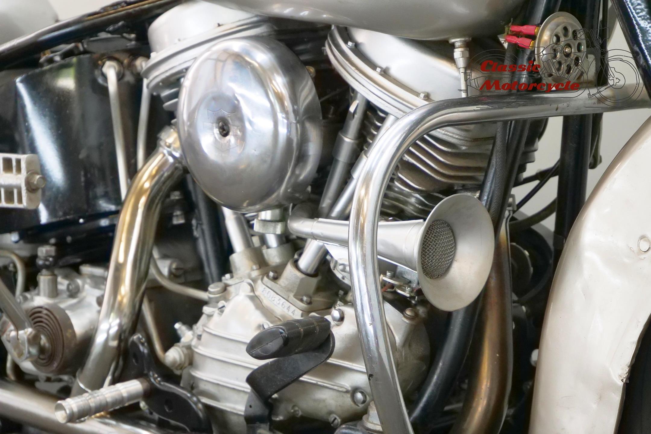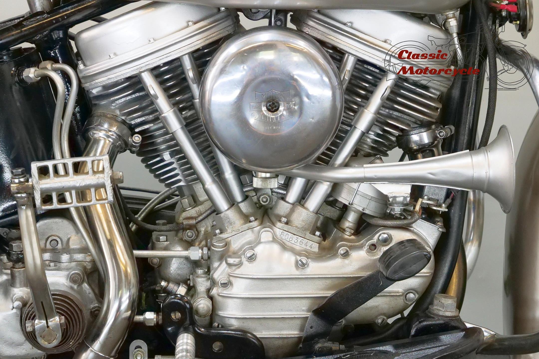 By the late 1940s the ‘Knucklehead’ - Harley-Davidson’s first overhead-valve twin-cylinder roadster - was beginning to show its age, prompting the Milwaukee firm to engage in a wholesale revision of the engine for 1948, the new top end giving rise to the unofficial nickname ‘Panhead’. While the engine’s bottom end remained fundamentally unchanged, the top end gained aluminum cylinder heads and those distinctive pan-shaped rocker covers. Oil lines were internalized and hydraulic valve lifters adopted, an innovation that greatly reduced tappet noise and simplified maintenance. Maximum power went up to 50hp in the 1200cc in FL model, but the main advantage of the many improvements was greater reliability. The Panhead featured a new ‘wishbone’ frame incorporating bowed front down-tubes, and in 1949 gained a hydraulically damped telescopic front fork, becoming the ‘Hydra-Glide’, though this name was originally applied only to the fork and did not become an official model title until 1952. The advent of rear suspension in 1958 saw the Panhead renamed ‘Duo-Glide’, while with the addition of an electric starter in 1965 it became the ‘Electra Glide’.