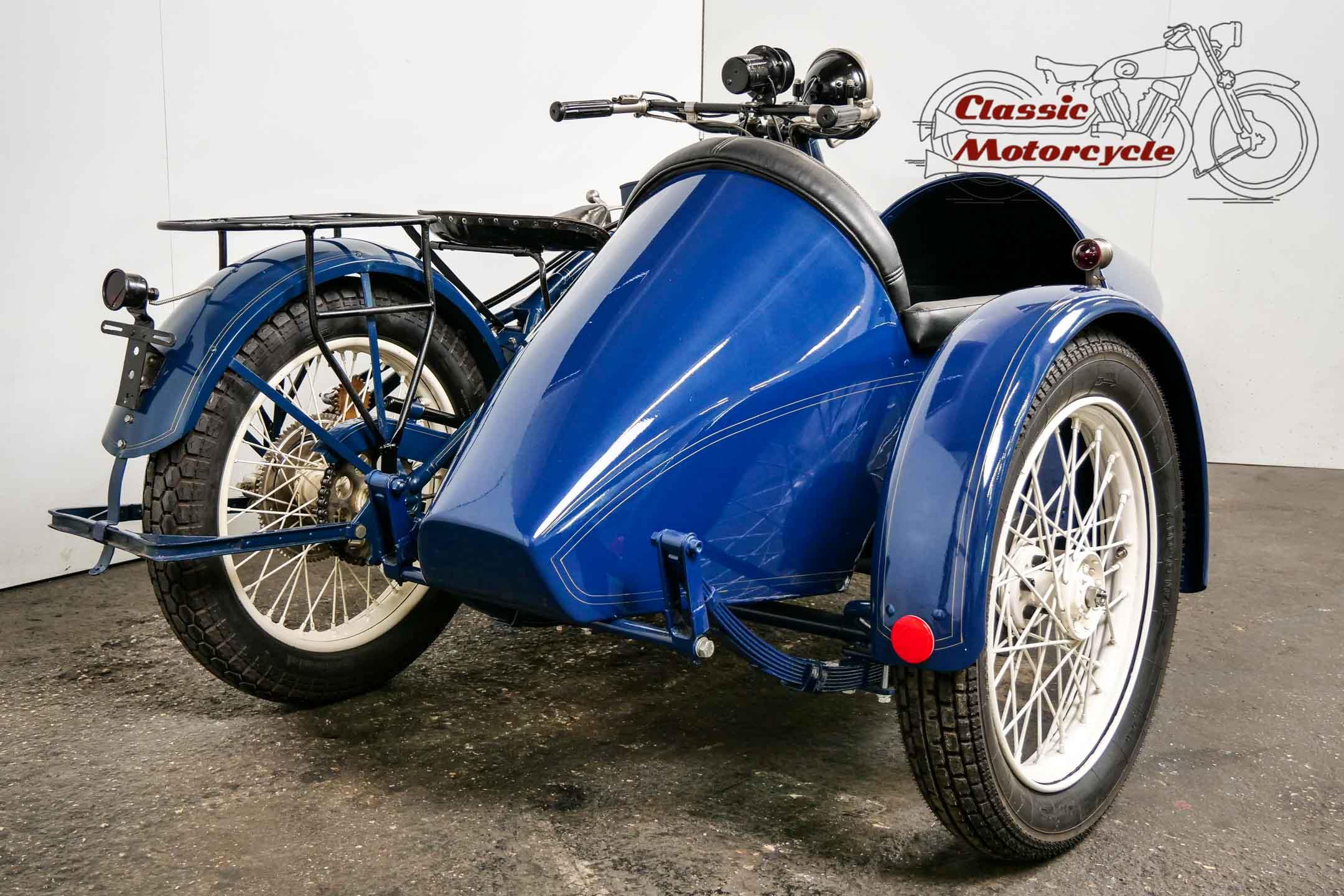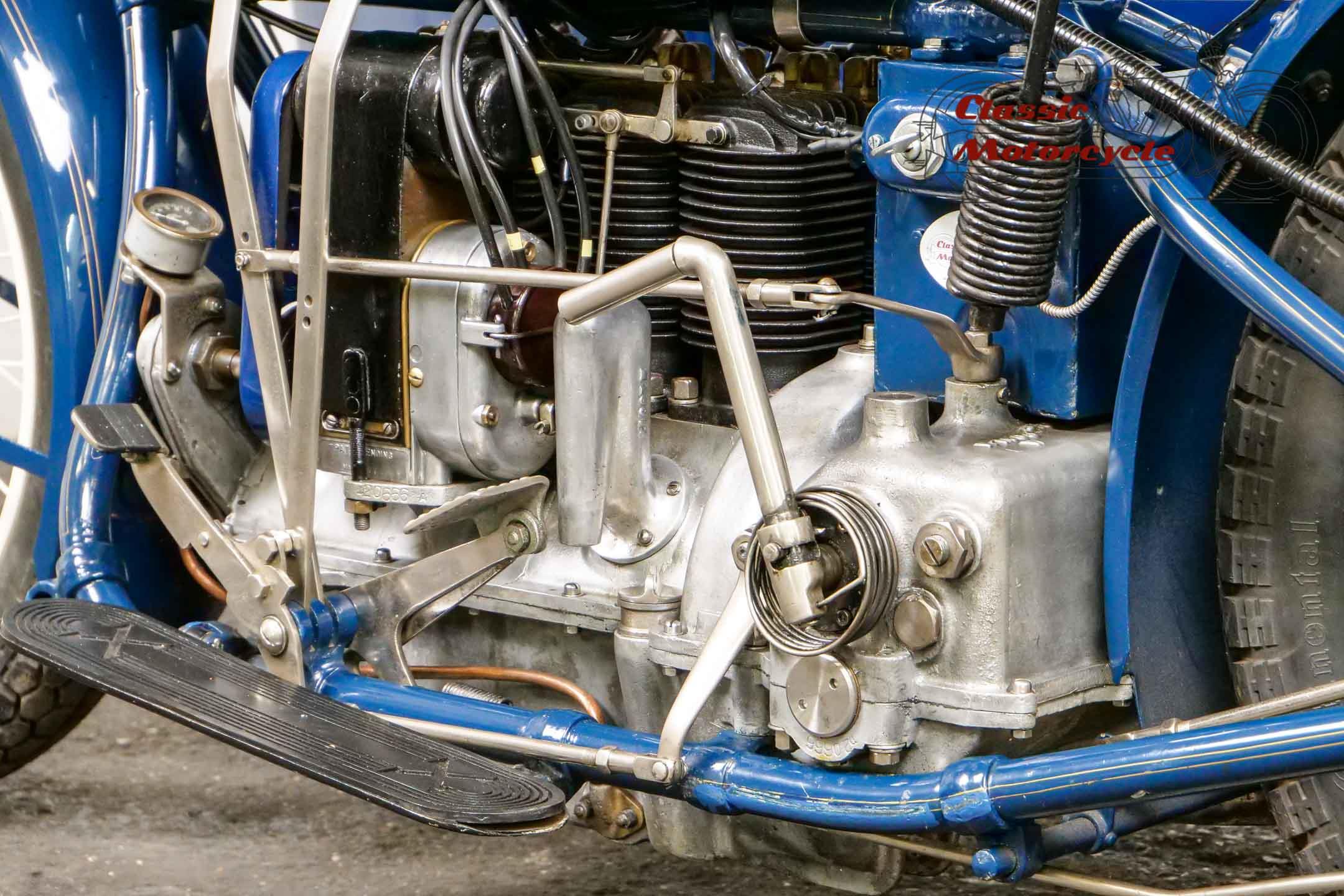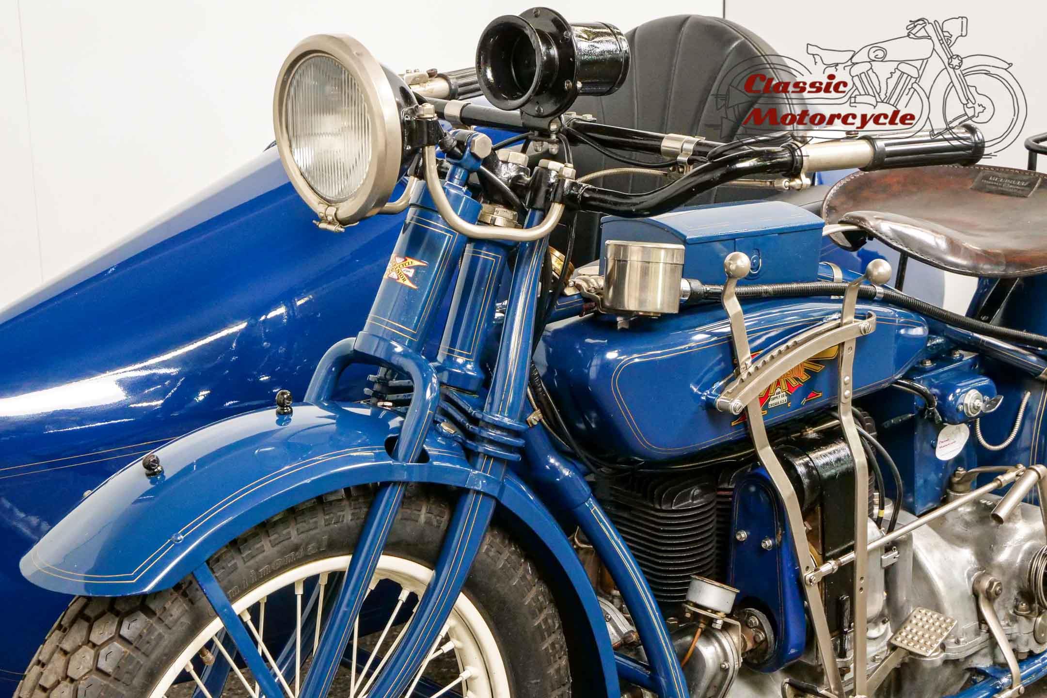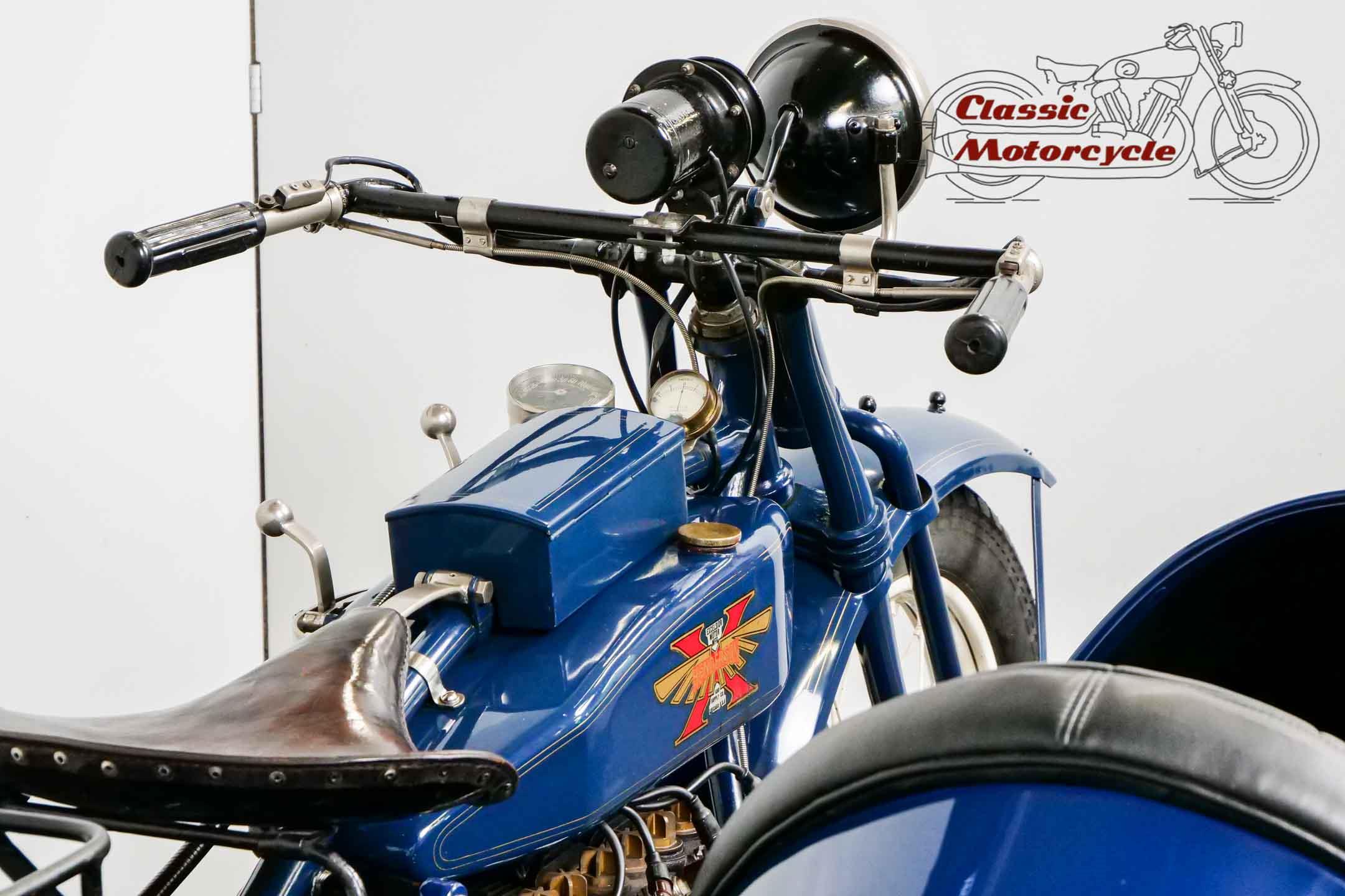 Henderson, a brand from the USA that has thundered with passion for the big 4-cylinder engines. The machine was imported from the USA in the 1990s and was completely restored in Holland at that time. A few years later this Henderson was completed with a sidecar. The displacement of 1300cc complements perfectly with the sidecar. She is equipped with a Zenith carburetor, lighting system, Weston ammeter, horn and a Corbin speedometer. This noble motorcycle should not be missing at any historical event. This bike The Henderson runs very fine.