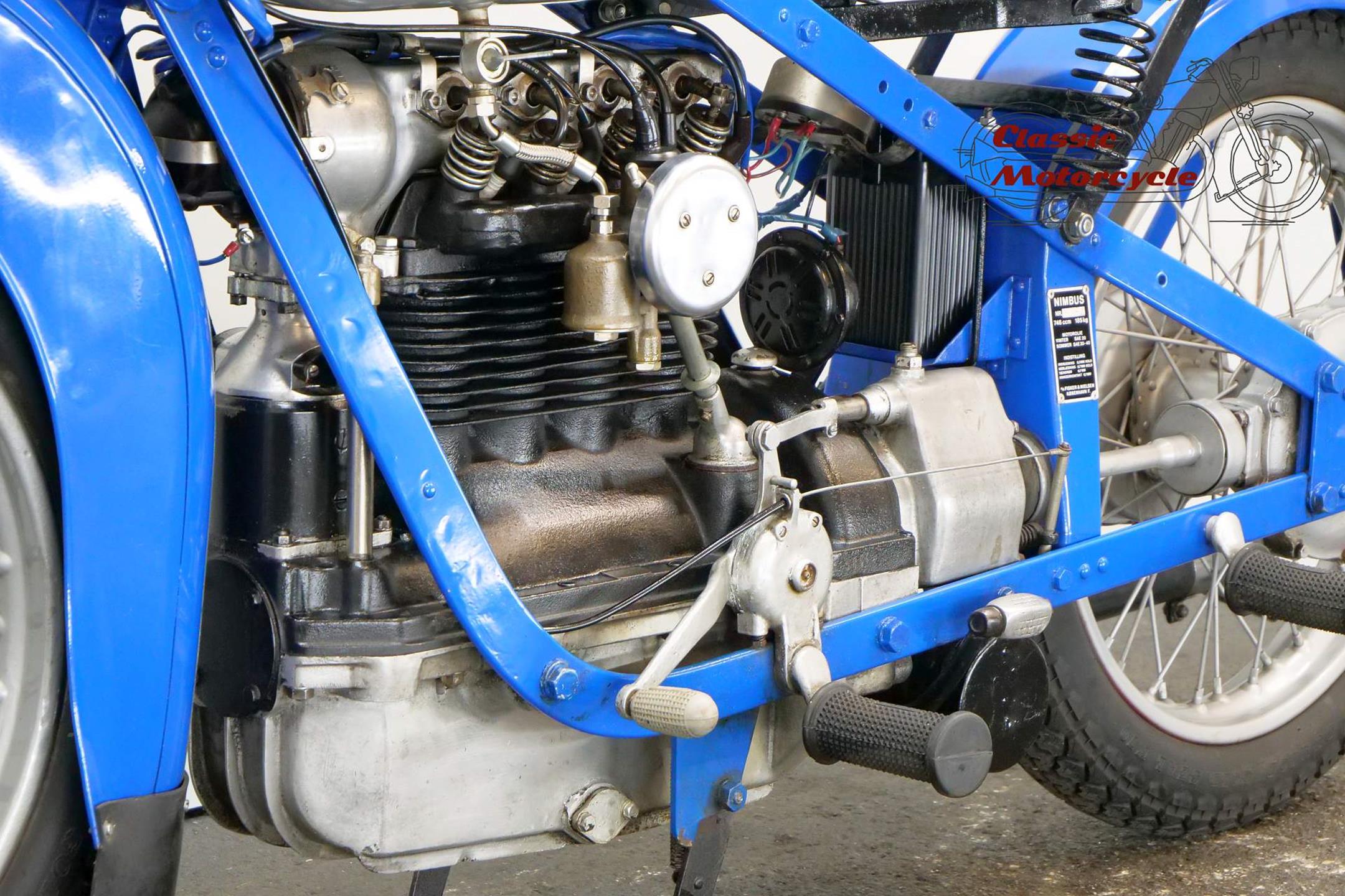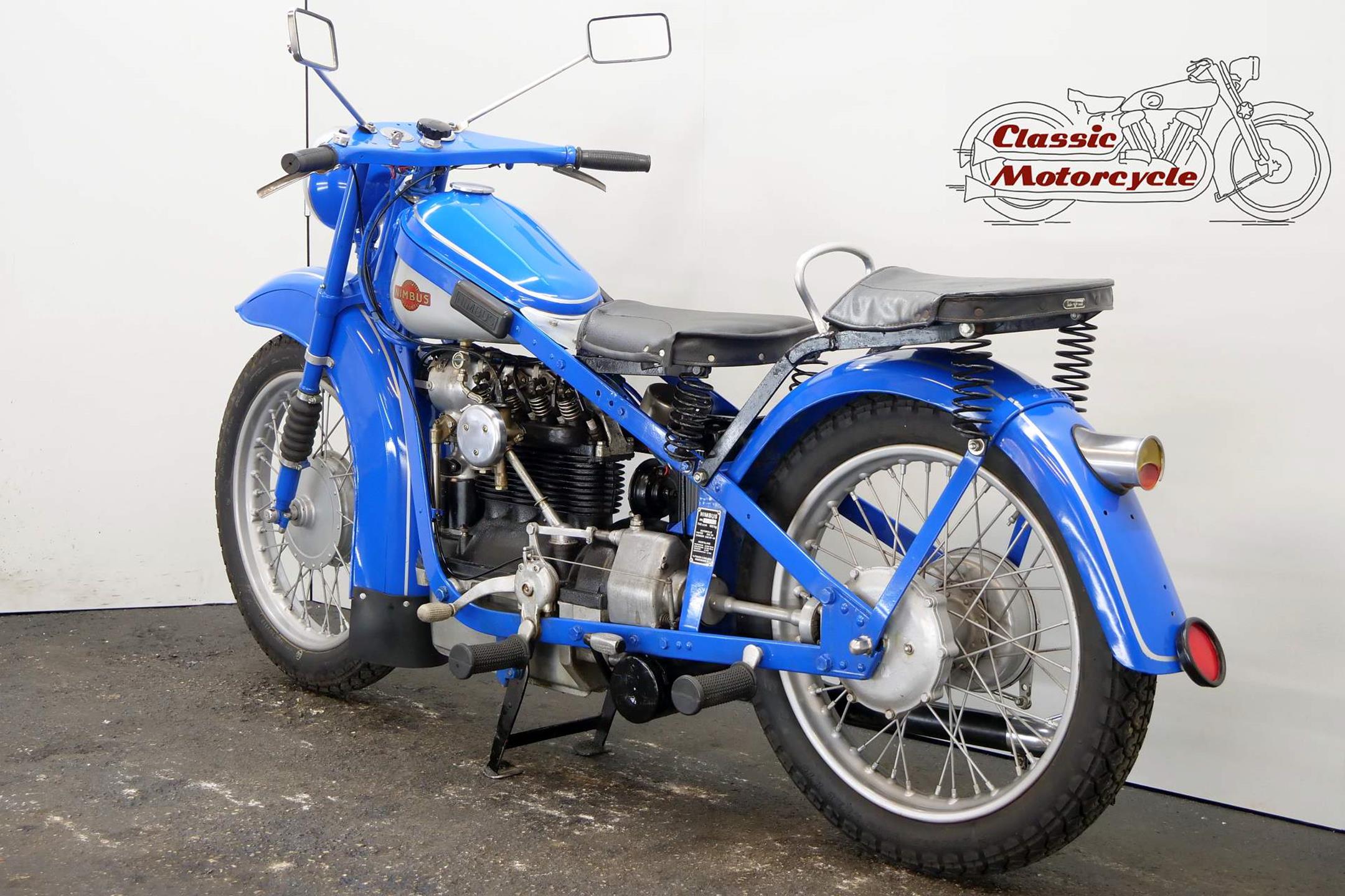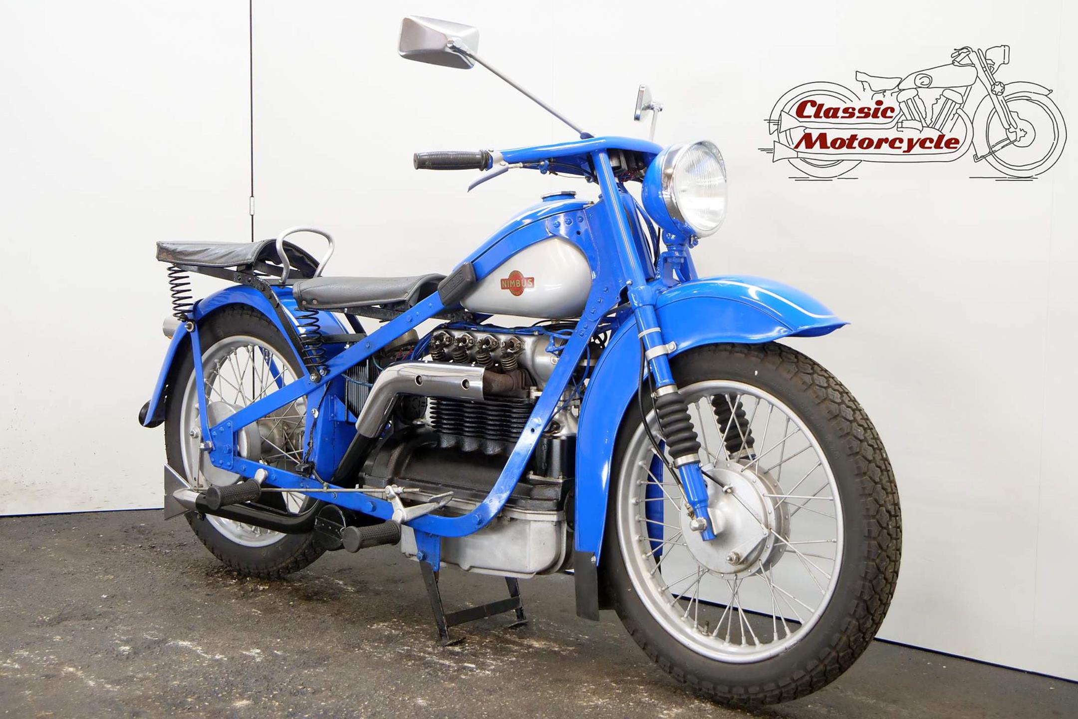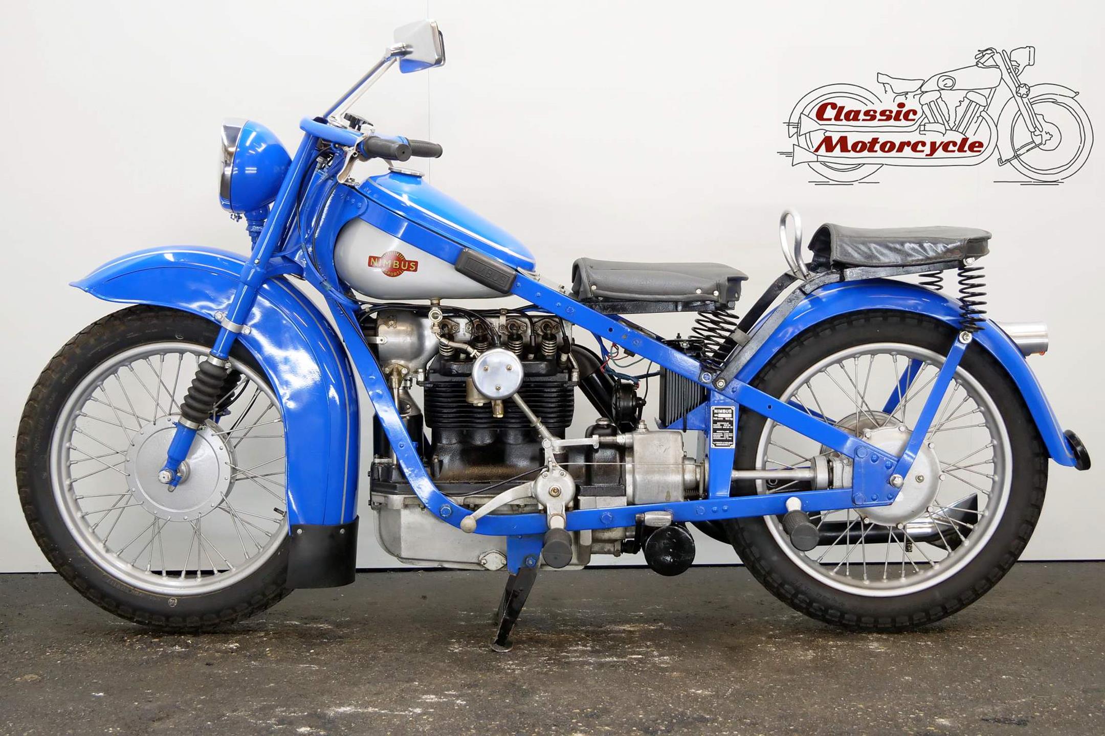 The result of diversification by the Danish vacuum cleaner manufacturer, Fisker & Nielsen, the Nimbus motorcycle first appeared in 1919. Unusually, only inline four-cylinder models were built. These were of advanced design, using shaft final drive and pressed steel frames right from the start of production, and pioneered the use of the telescopic front fork in the mid-1930s. The early models featured a distinctive tubular spine frame that doubled as the fuel tank, soon gaining the nickname 'stovepipe'. The low-compression Nimbus engine was noted for its smoothness and flexibility. In 1928, motorcycle production was suspended to enable the company to concentrate on producing its Nilfisk vacuum cleaners, and when the new Nimbus appeared in 1934 it was with a power unit that showed strong motor-industry influence, being constructed along car lines with integral crankcase/cylinder block in cast iron and a detachable alloy sump. The cast-iron one-piece cylinder head was topped by an alloy housing for the single overhead camshaft, which was driven by shaft-and-bevel gears. A single-plate clutch transmitted power to the three-speed gearbox. The original 'stovepipe' frame had been superseded by one made from flat spring steel, while foot change for the gearbox, a beefier front fork, and larger brakes had been added by the end of the 1930s. Nimbus was ahead of its time in many ways, introducing its first telescopic front fork in 1934 and adopting closed-circuit crankcase ventilation many years before the automobile industry. From then onwards the Nimbus changed little until series production was ended in 1954, once again to free up resources for the vacuum cleaner business. An additional few machines were assembled from spares between 1954 and 1959 but none have been made since then. Production was always on a limited scale, but such is the quality of the Nimbus that many remain in service today.