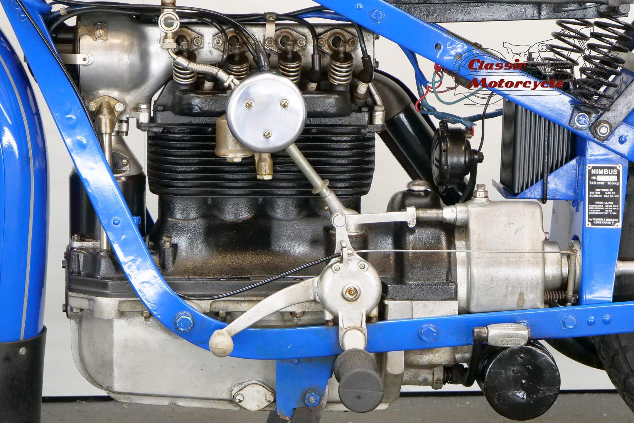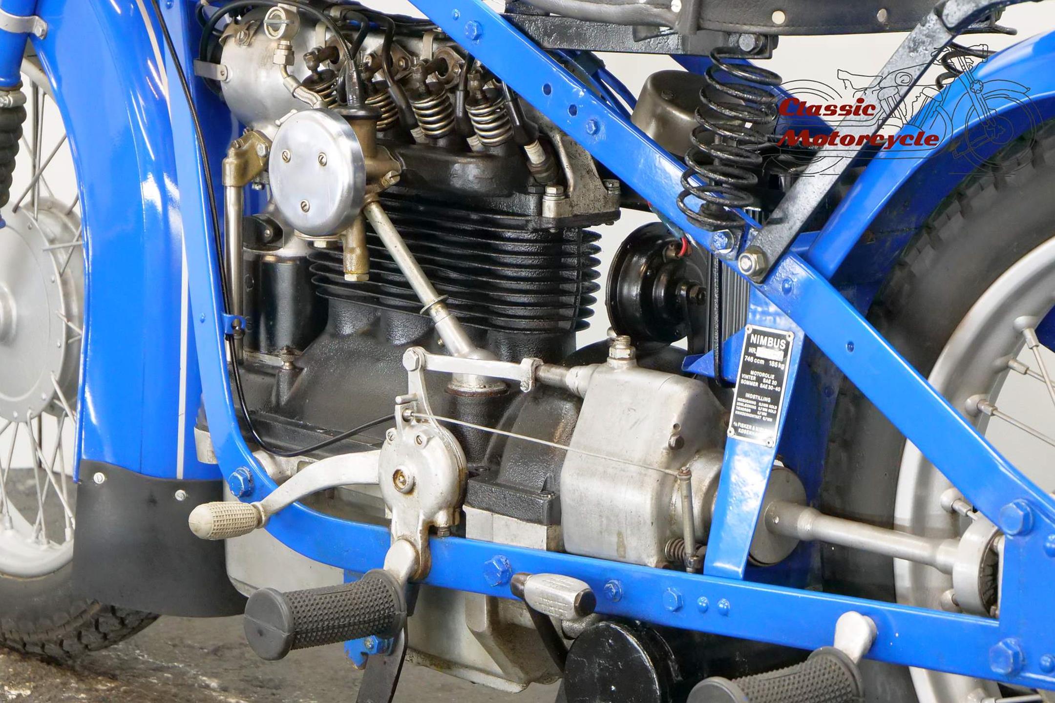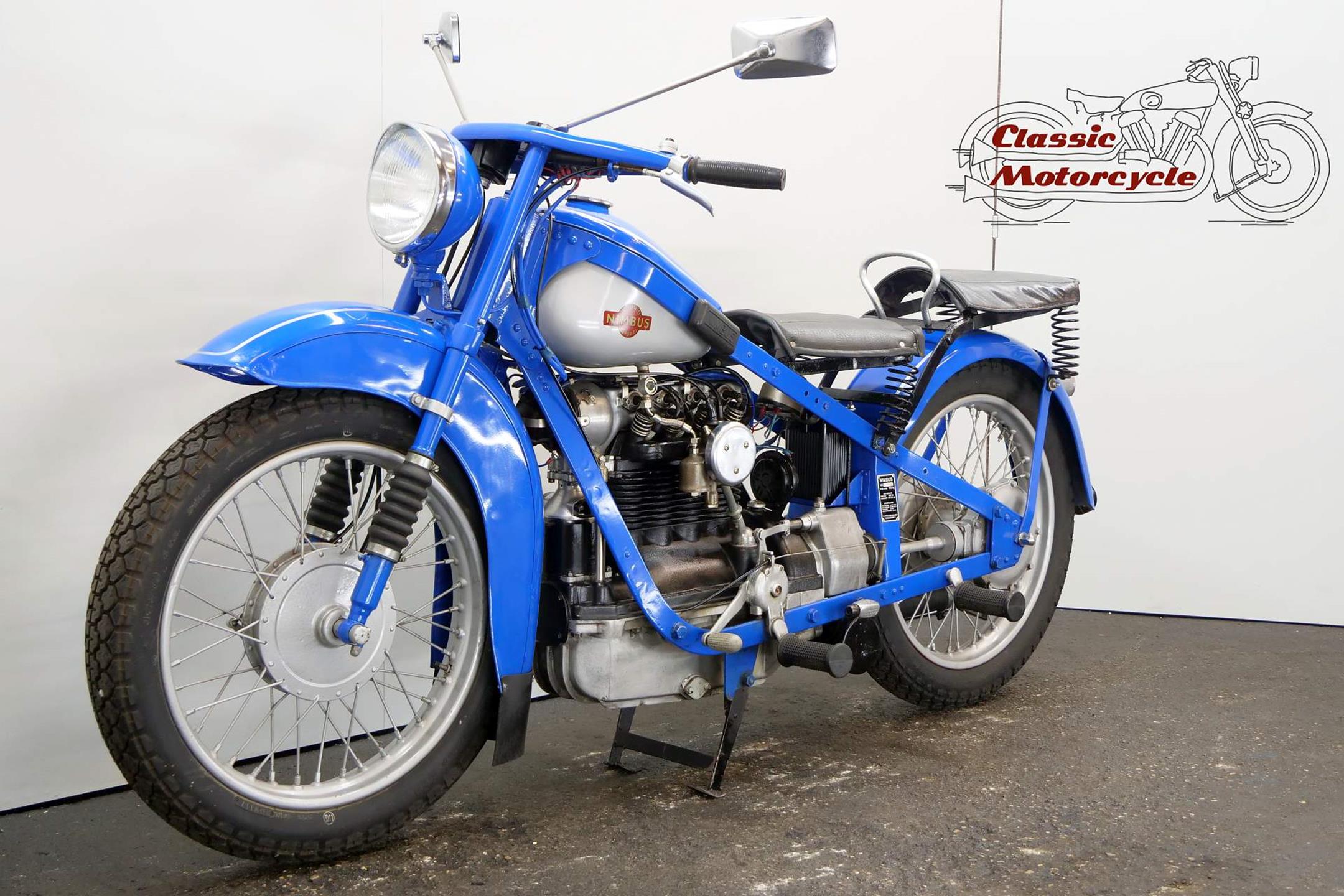The result of diversification by the Danish vacuum cleaner manufacturer, Fisker & Nielsen, the Nimbus motorcycle first appeared in 1919. Unusually, only inline four-cylinder models were built. These were of advanced design, using shaft final drive and pressed steel frames right from the start of production, and pioneered the use of the telescopic front fork in the mid-1930s. The early models featured a distinctive tubular spine frame that doubled as the fuel tank, soon gaining the nickname 'stovepipe'. The low-compression Nimbus engine was noted for its smoothness and flexibility. In 1928, motorcycle production was suspended to enable the company to concentrate on producing its Nilfisk vacuum cleaners, and when the new Nimbus appeared in 1934 it was with a power unit that showed strong motor-industry influence, being constructed along car lines with integral crankcase/cylinder block in cast iron and a detachable alloy sump. The cast-iron one-piece cylinder head was topped by an alloy housing for the single overhead camshaft, which was driven by shaft-and-bevel gears. A single-plate clutch transmitted power to the three-speed gearbox. The original 'stovepipe' frame had been superseded by one made from flat spring steel, while foot change for the gearbox, a beefier front fork, and larger brakes had been added by the end of the 1930s. Nimbus was ahead of its time in many ways, introducing its first telescopic front fork in 1934 and adopting closed-circuit crankcase ventilation many years before the automobile industry. From then onwards the Nimbus changed little until series production was ended in 1954, once again to free up resources for the vacuum cleaner business. An additional few machines were assembled from spares between 1954 and 1959 but none have been made since then. Production was always on a limited scale, but such is the quality of the Nimbus that many remain in service today.