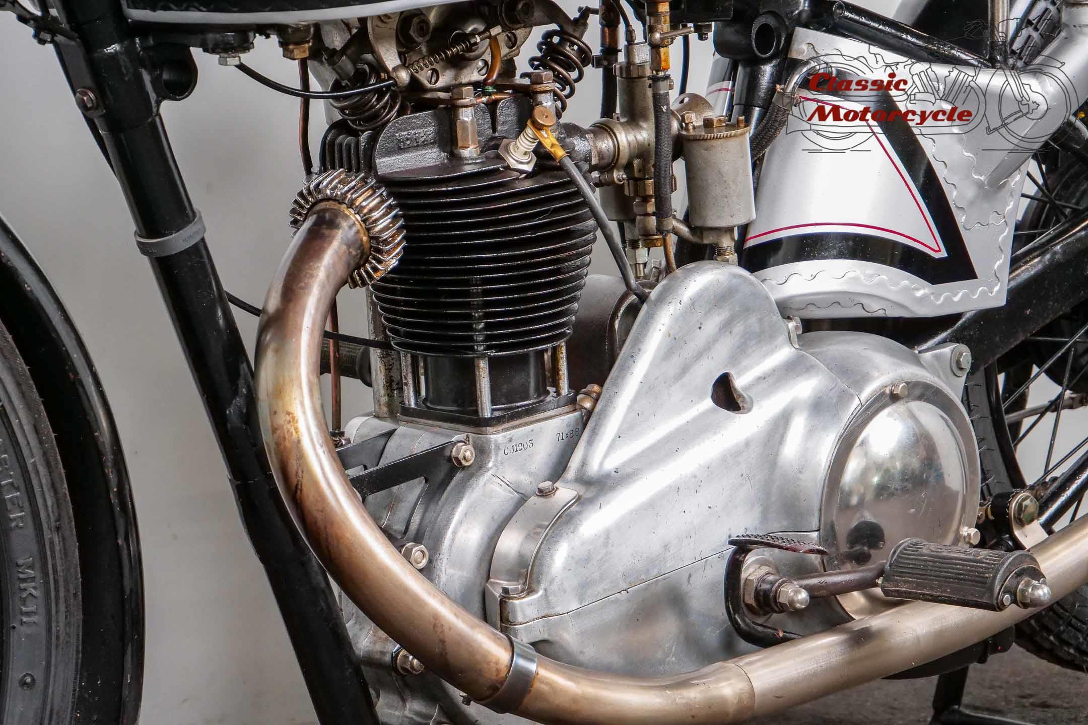 Norton Camshaft Junior, a name that has presented well in terms of design and performance. At that time, the flagship were the CS1 and CJ in the first OHC engine design. The CS was sold more often but is hardly seen today. The production numbers of the CJ were much lower than the CS which makes it an attractive collector's item today. Most of the produced CJ were delivered in the street version. Only a few were produced in "racing trim" like this machine offered here.