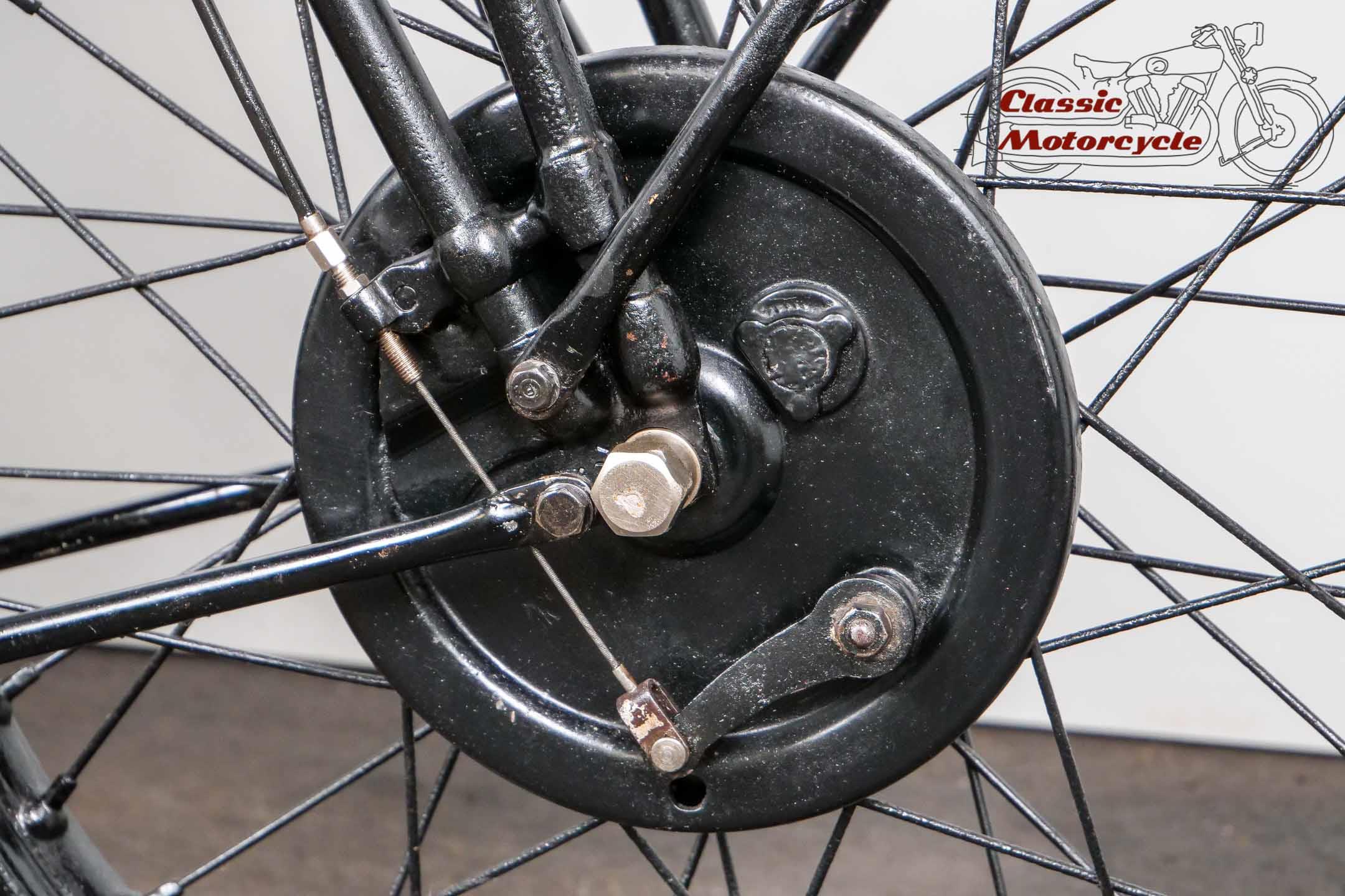 The engine number and frame number match the records. It was equipped with an Amal carburetor, 26 x 3 tires and closed Druid suspension forks. The LS transmission number was 108475. It had a 500cc gas tank, narrow fenders, twist grip and an oil tank with filler neck on the left. The machine came with high compression replacement pistons. Delivered to Piet van Wijngaarden, Netherlands, on 5/14/1929, records also state that the bike was for Mr. Davids and is "specially made by W. Moore".