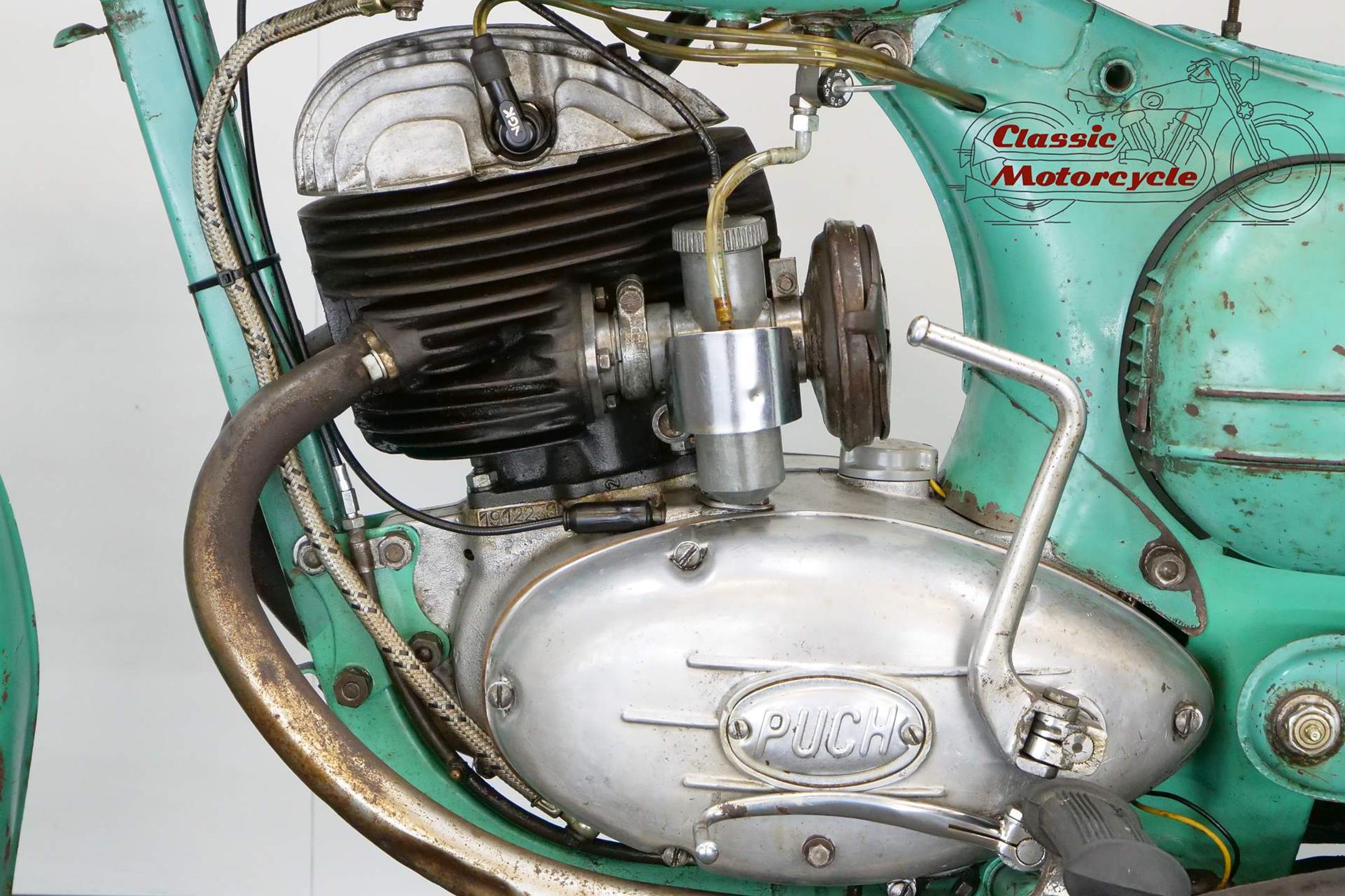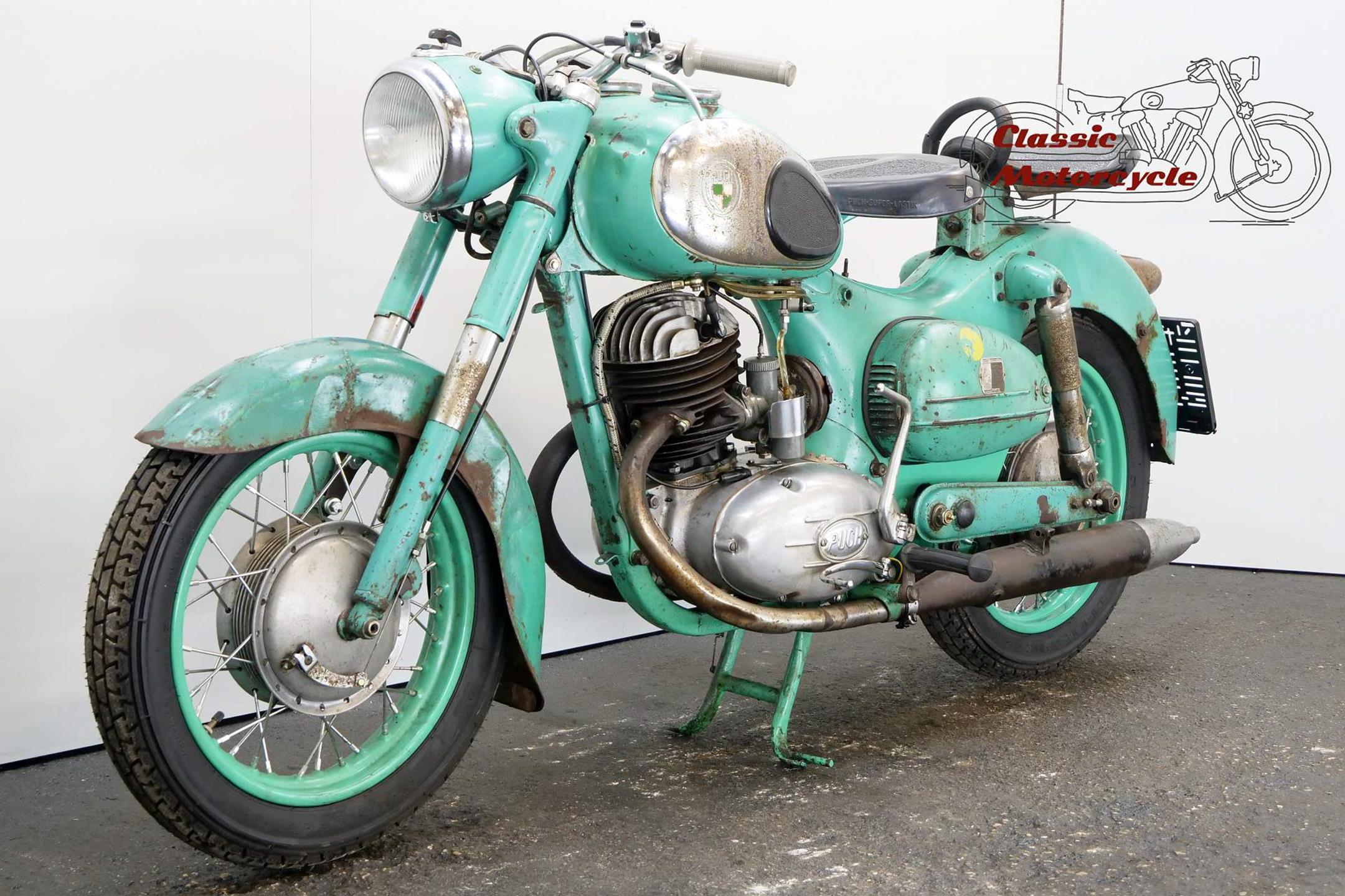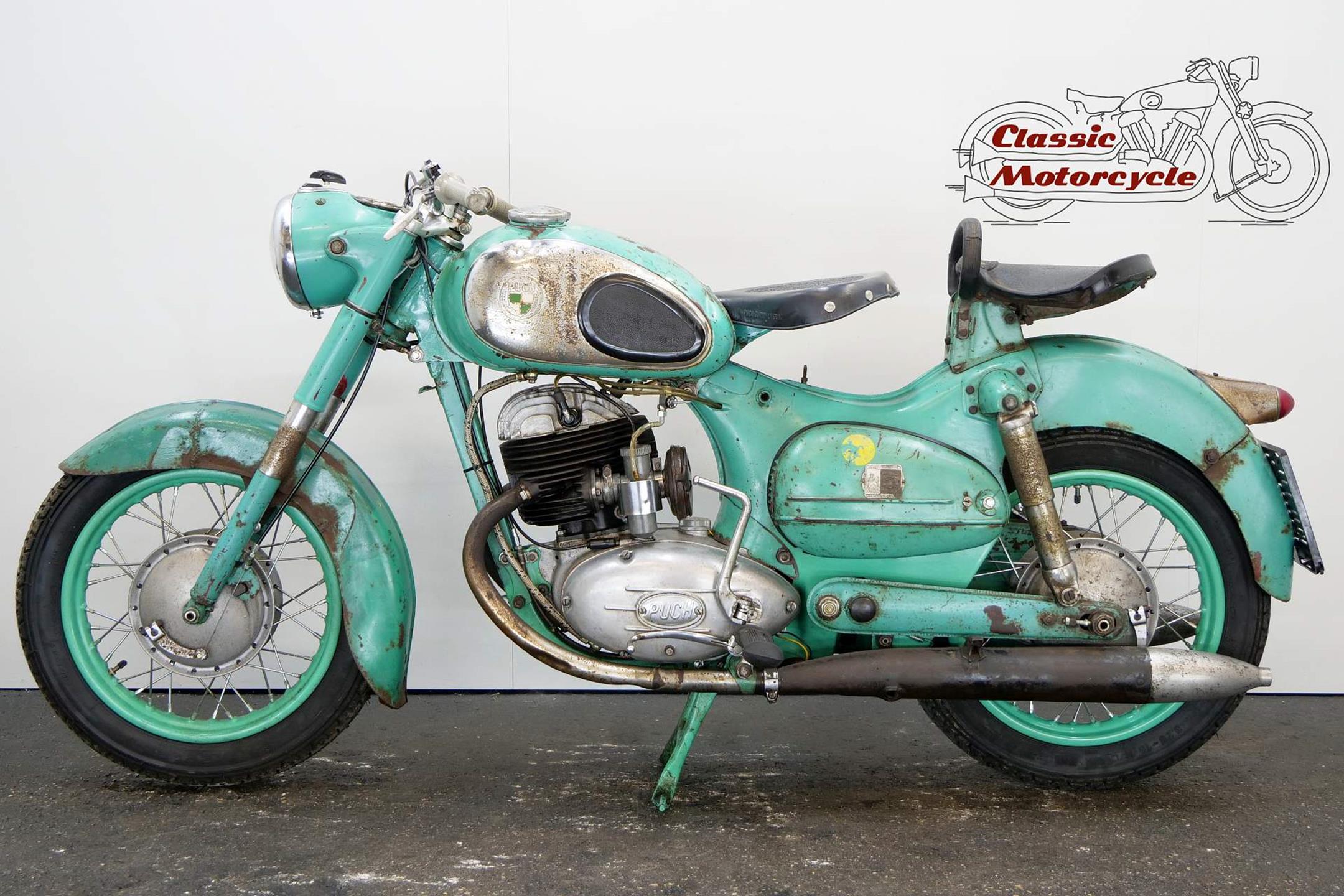 The motorcycle part of the Austrian Steyr-Daimler-Puch combine, Puch introduced its first motorcycle in the early 1900s. These days the firm is best remembered for its pioneering 'split-single' two-strokes, the first of which was developed in the 1920s. In its final form the engine featured tandem cylinders whose pistons were driven via a single connecting rod. After WW2 Puch built two-strokes only, commencing with split-singles in 125, 150, 175 and 250cc capacities built in both tourer and sport guises. Cycle parts were conventional for the time and featured plunger rear suspension and twin 'swing' saddles. Updated in 1954 with revised engine and a swinging-arm frame, Puch's split-single range remained in production well into the 1960s.