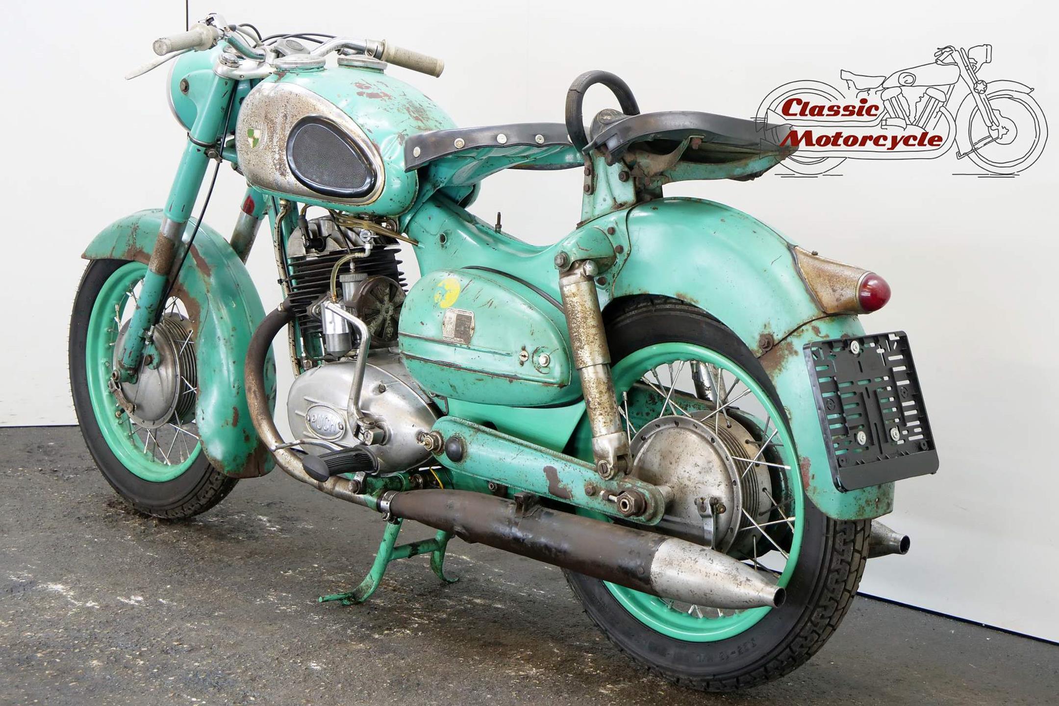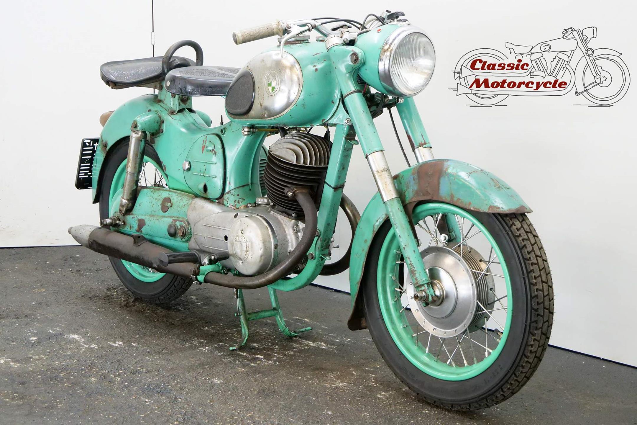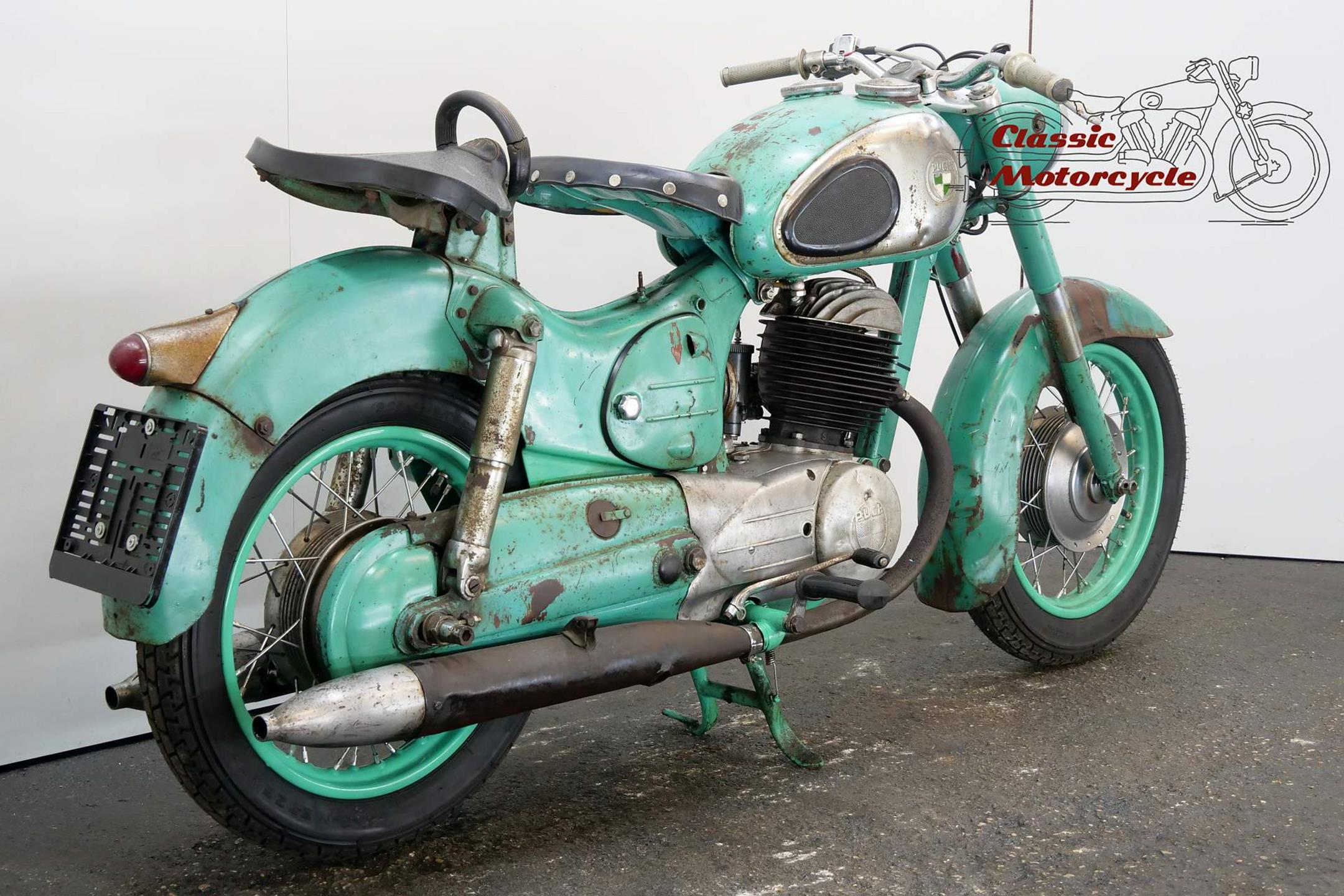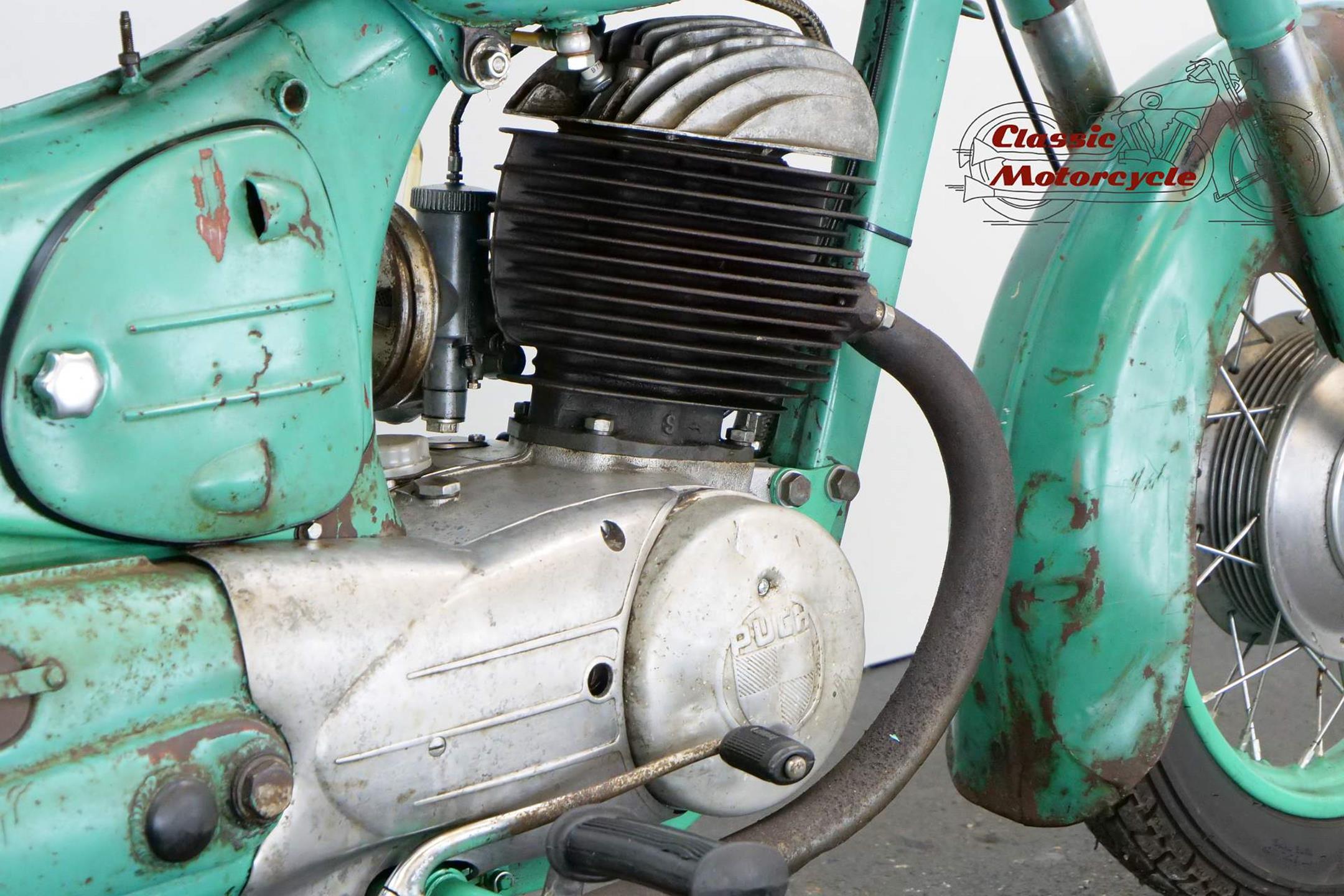 The motorcycle part of the Austrian Steyr-Daimler-Puch combine, Puch introduced its first motorcycle in the early 1900s. These days the firm is best remembered for its pioneering 'split-single' two-strokes, the first of which was developed in the 1920s. In its final form the engine featured tandem cylinders whose pistons were driven via a single connecting rod. After WW2 Puch built two-strokes only, commencing with split-singles in 125, 150, 175 and 250cc capacities built in both tourer and sport guises. Cycle parts were conventional for the time and featured plunger rear suspension and twin 'swing' saddles. Updated in 1954 with revised engine and a swinging-arm frame, Puch's split-single range remained in production well into the 1960s.