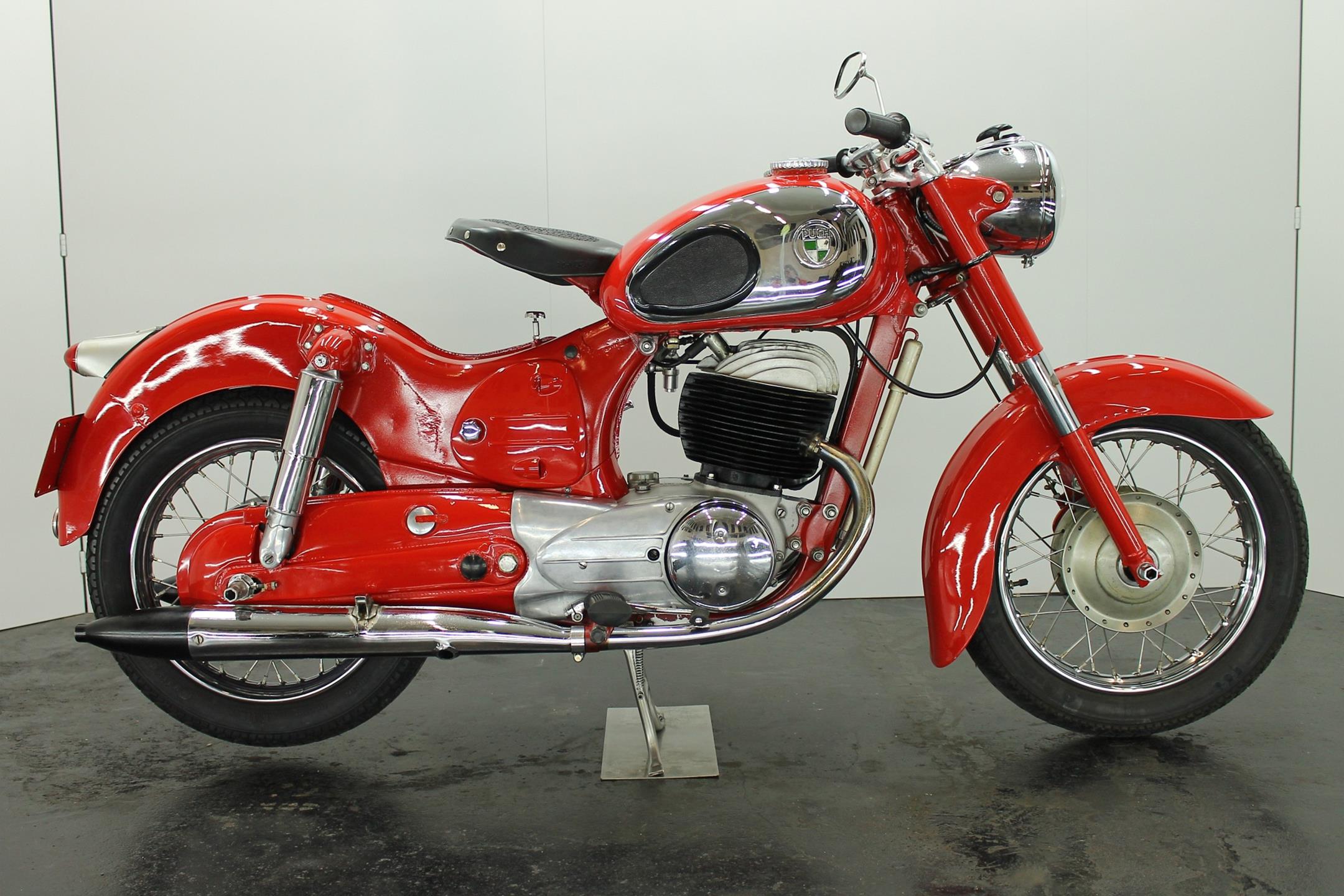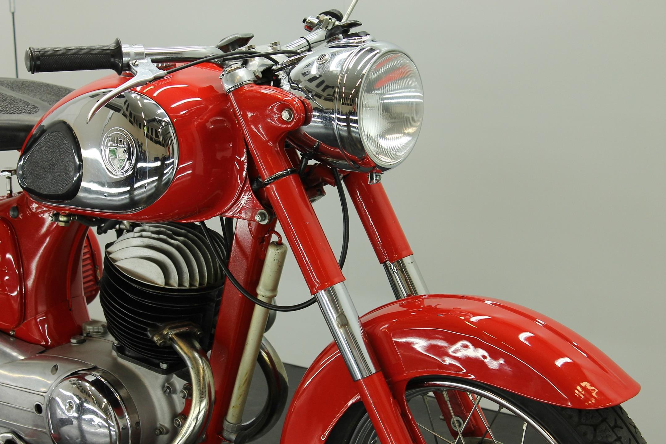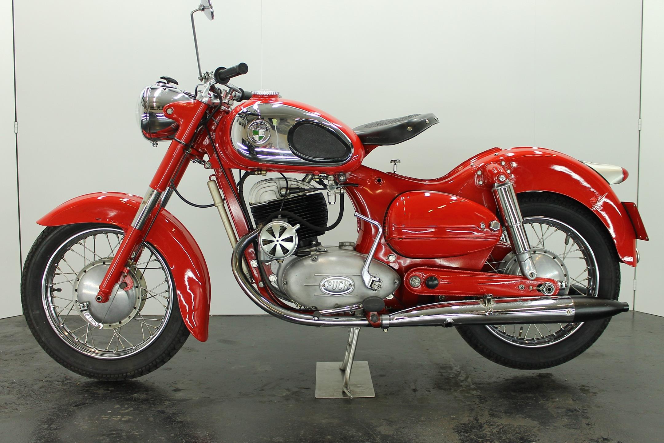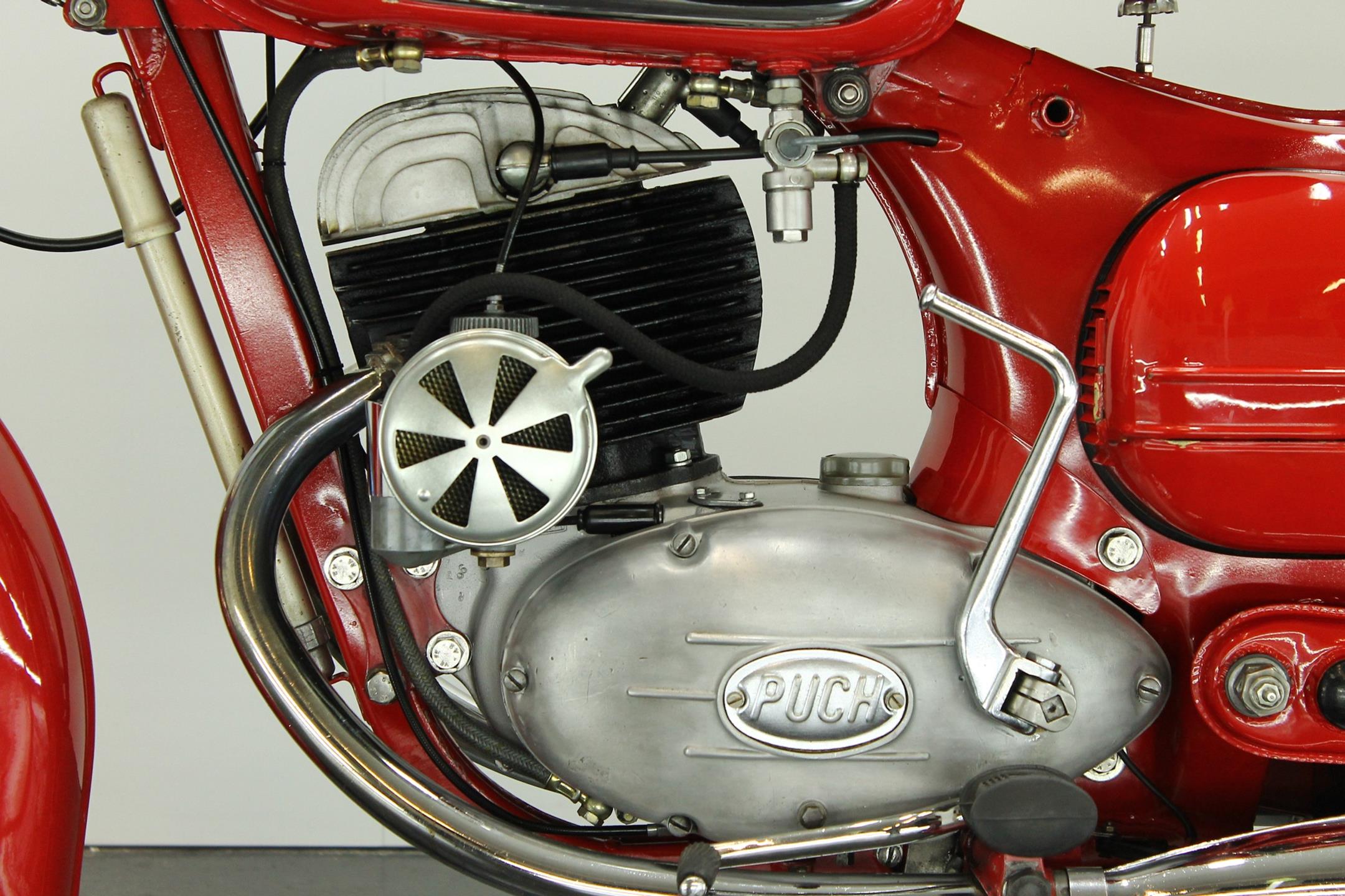 The motorcycle part of the Austrian Steyr-Daimler-Puch combine, Puch introduced its first motorcycle in the early 1900s. These days the firm is best remembered for its pioneering 'split-single' two-strokes, the first of which was developed in the 1920s. In its final form the engine featured tandem cylinders whose pistons were driven via a single connecting rod. After WW2 Puch built two-strokes only, commencing with split-singles in 125, 150, 175 and 250cc capacities built in both tourer and sport guises. Cycle parts were conventional for the time and featured plunger rear suspension and twin 'swing' saddles. Updated in 1954 with revised engine and a swinging-arm frame, Puch's split-single range remained in production well into the 1960s.