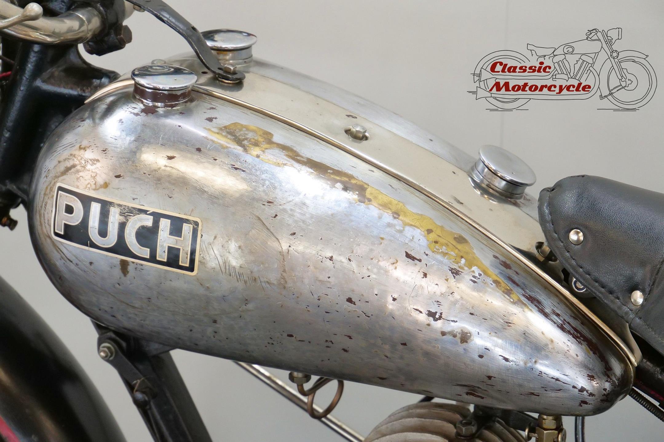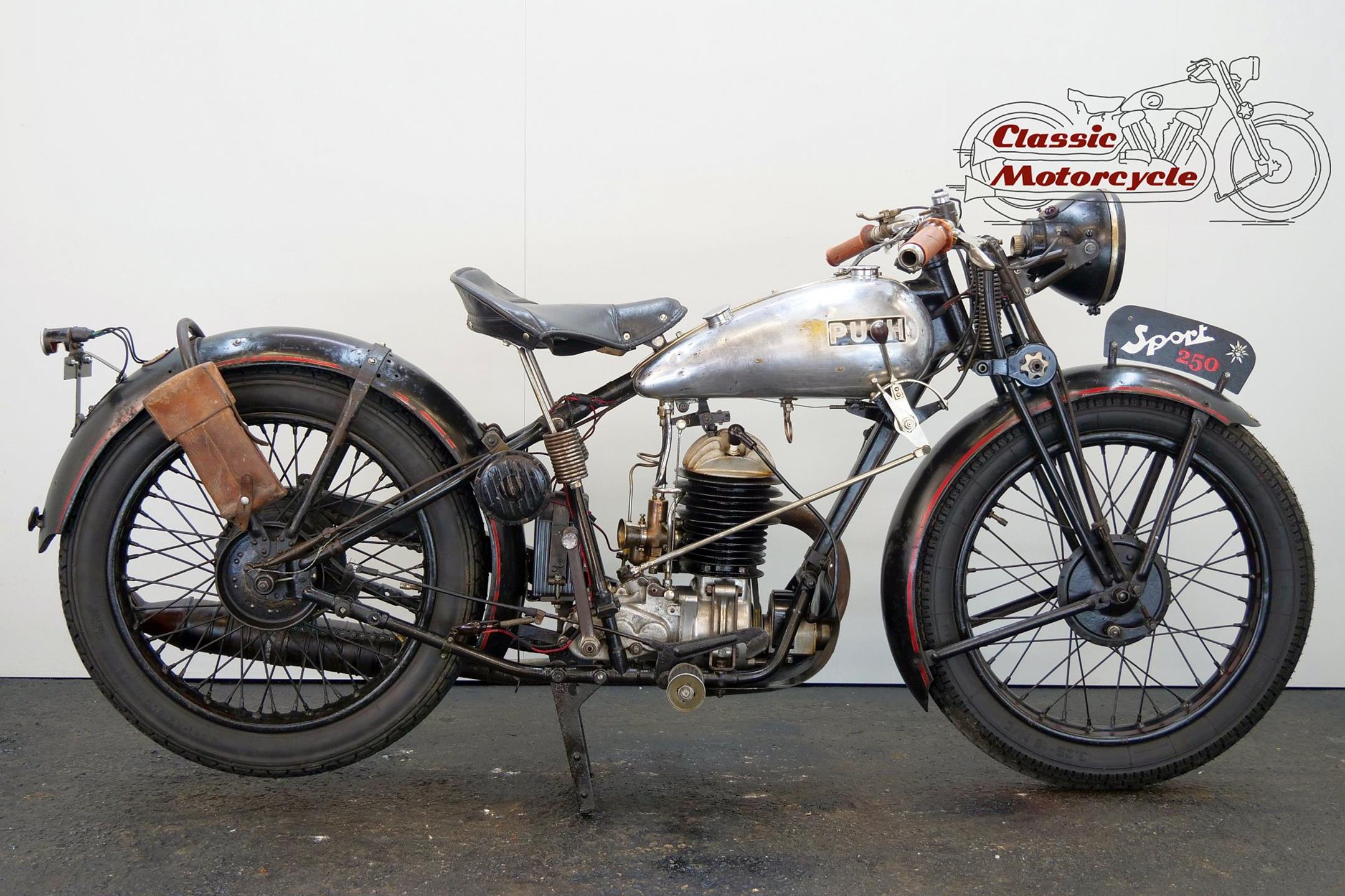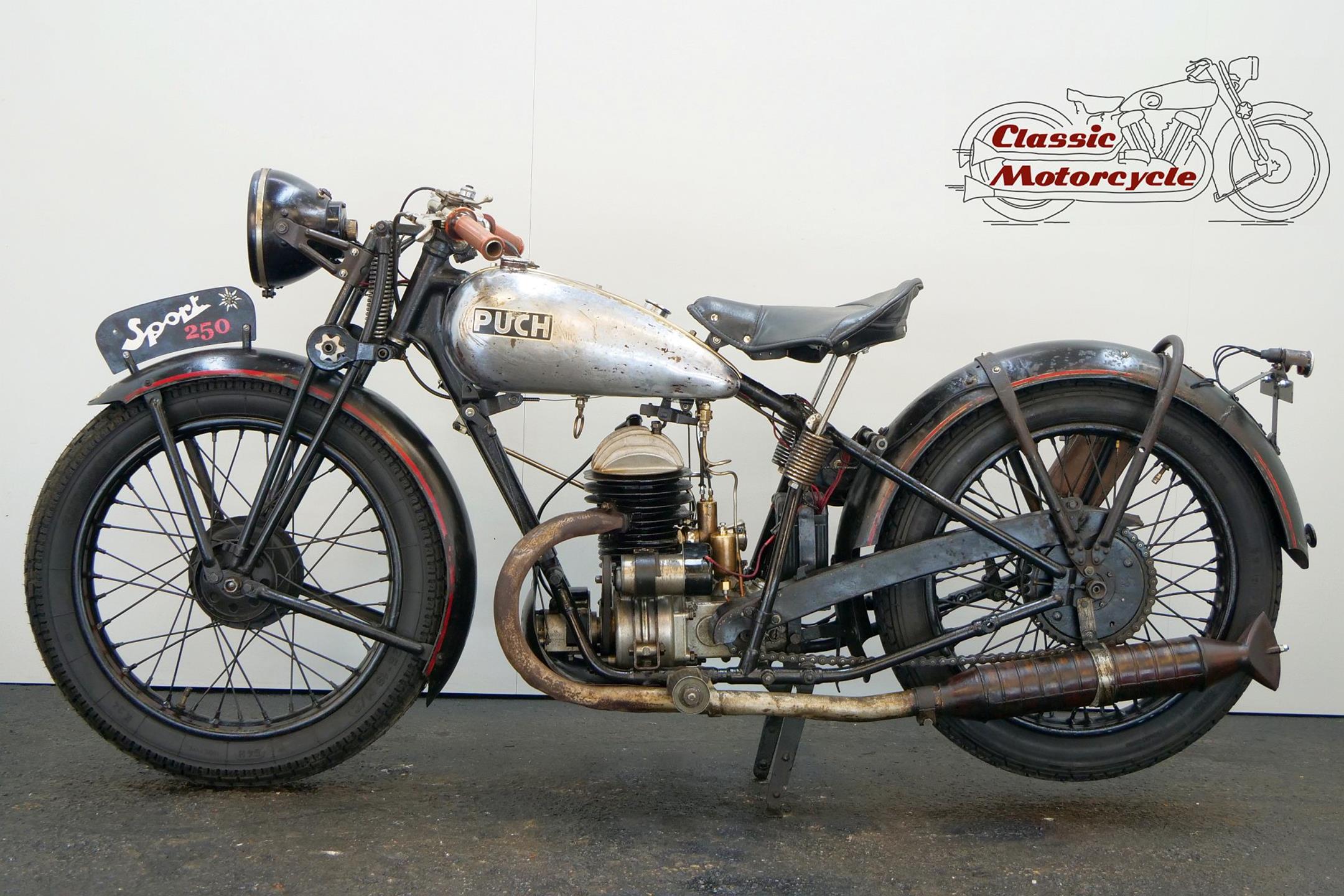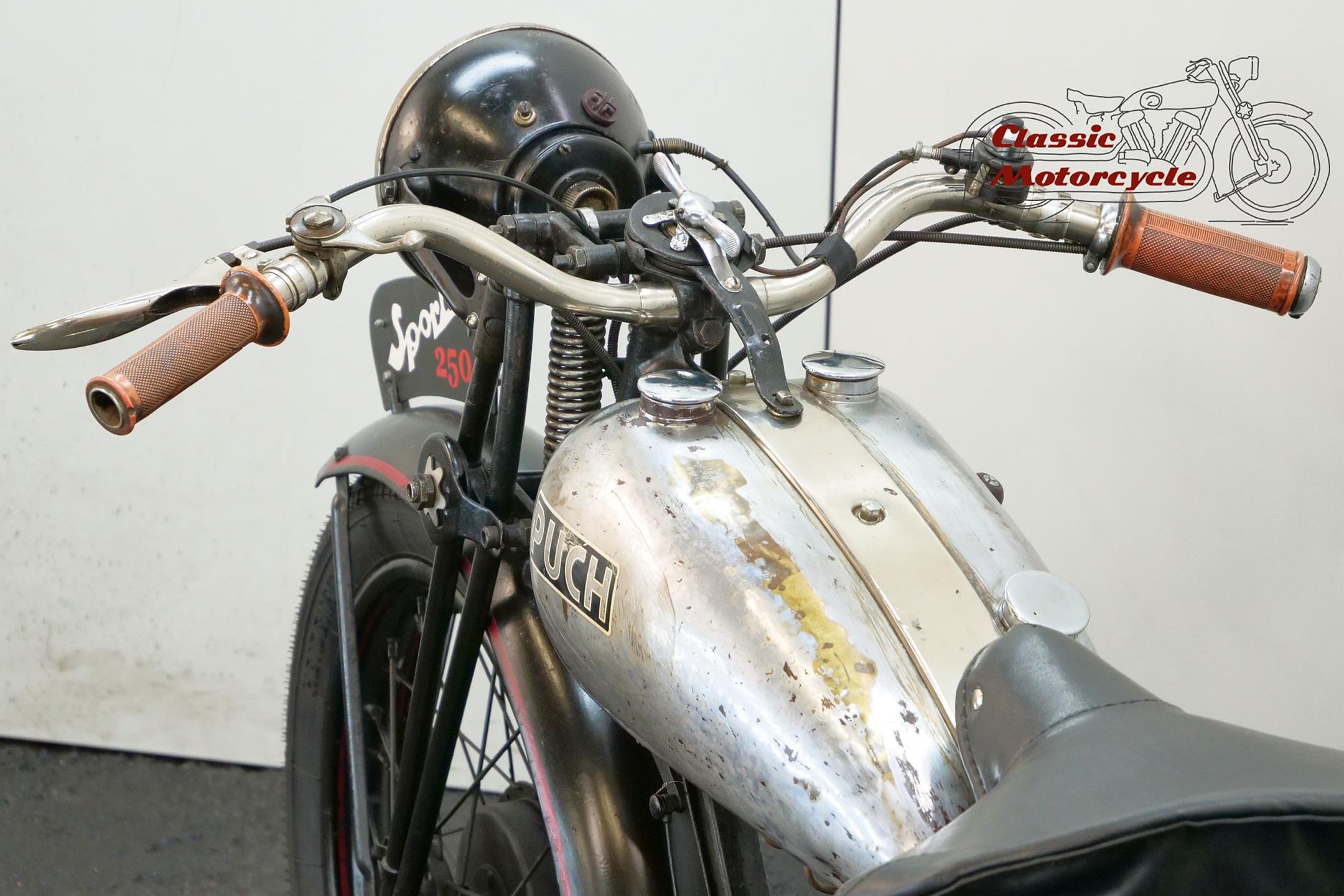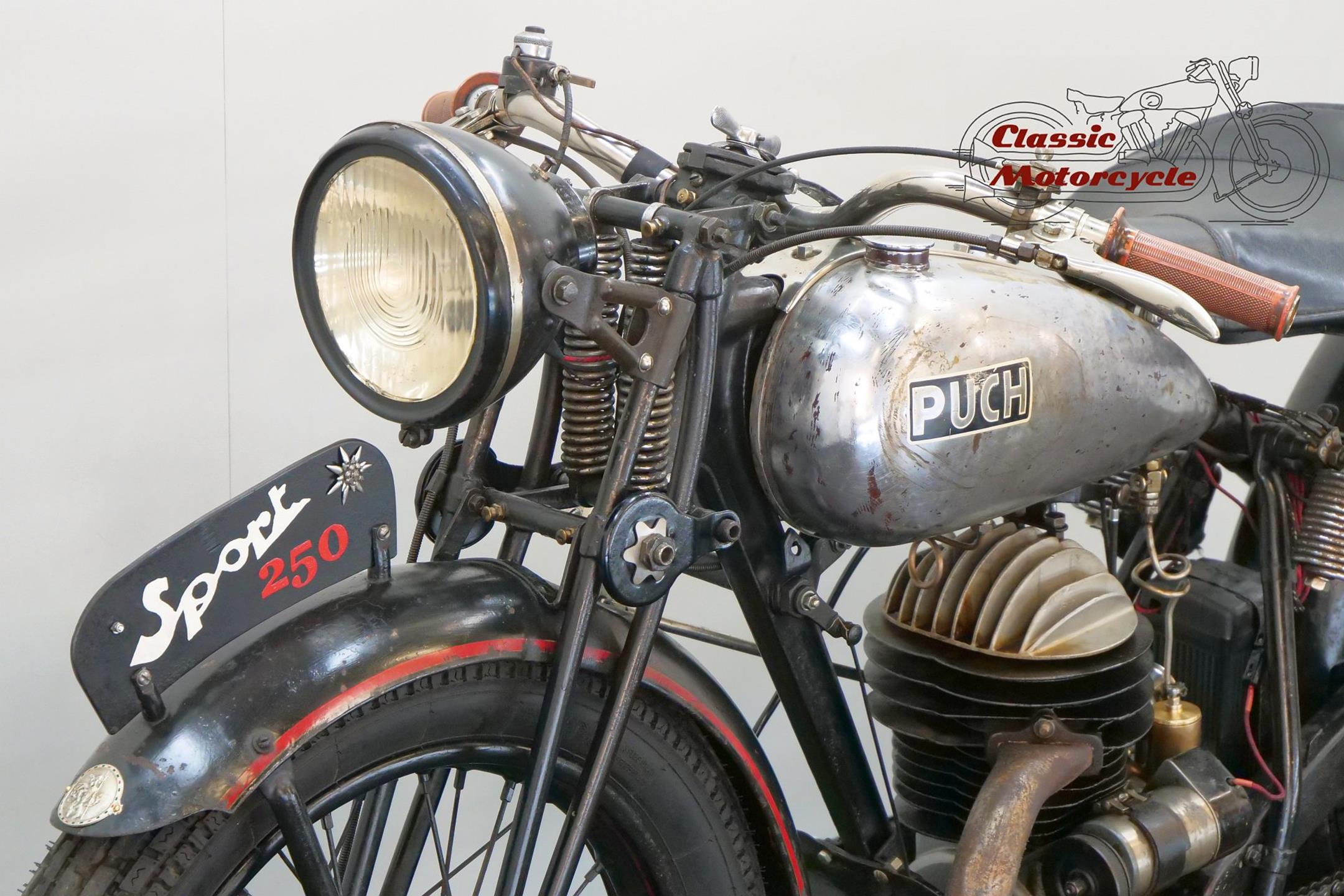 1932, Puch offered two models the “250T (T= touren)” with 6hp and “250 Sport” with 9hp both with 250cc split single engine. Only in 1930 the first 250 Sport models had a Bronze-cylinderhead with 7hp, the later machines from 1931-1932 are fitted with a Silumin-cylinder head and had a power output of 9hp. All 250 Sport models had a chromed tank.