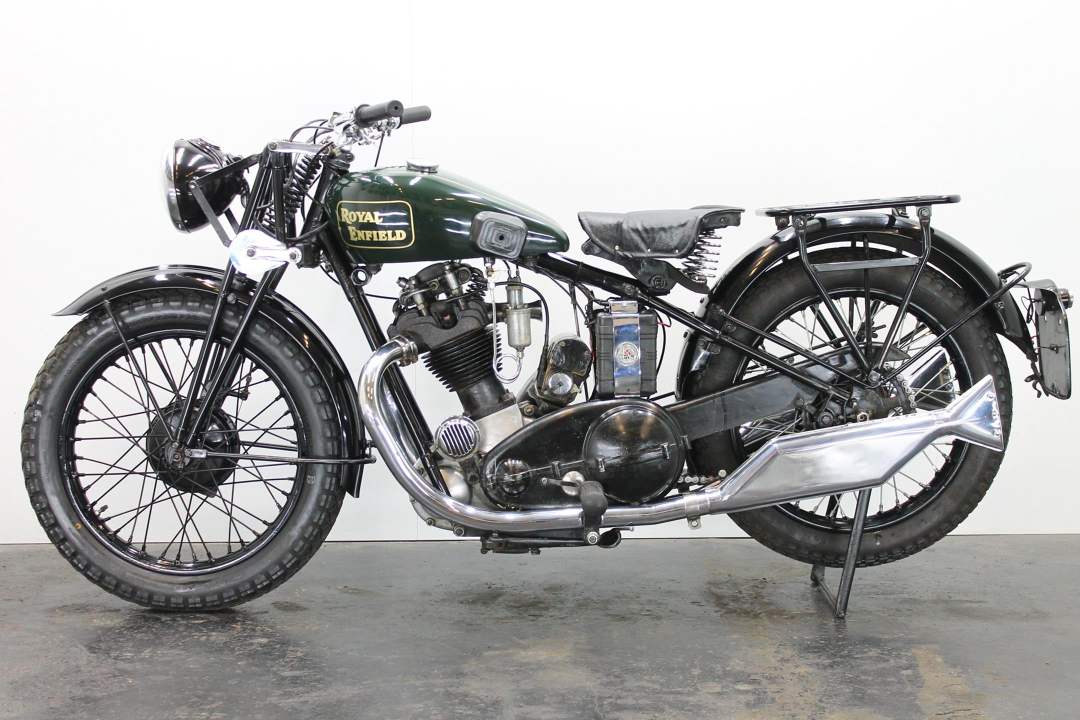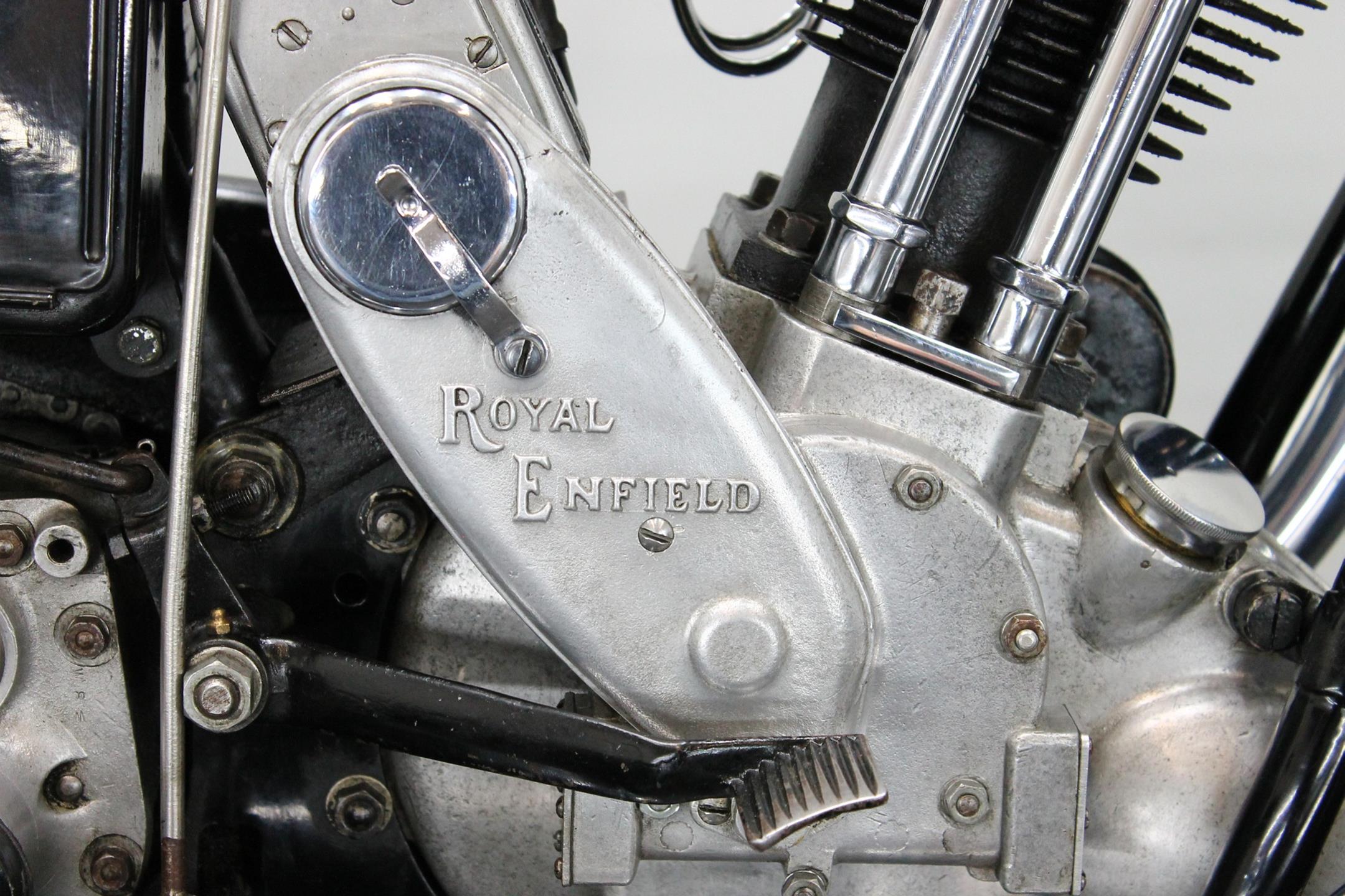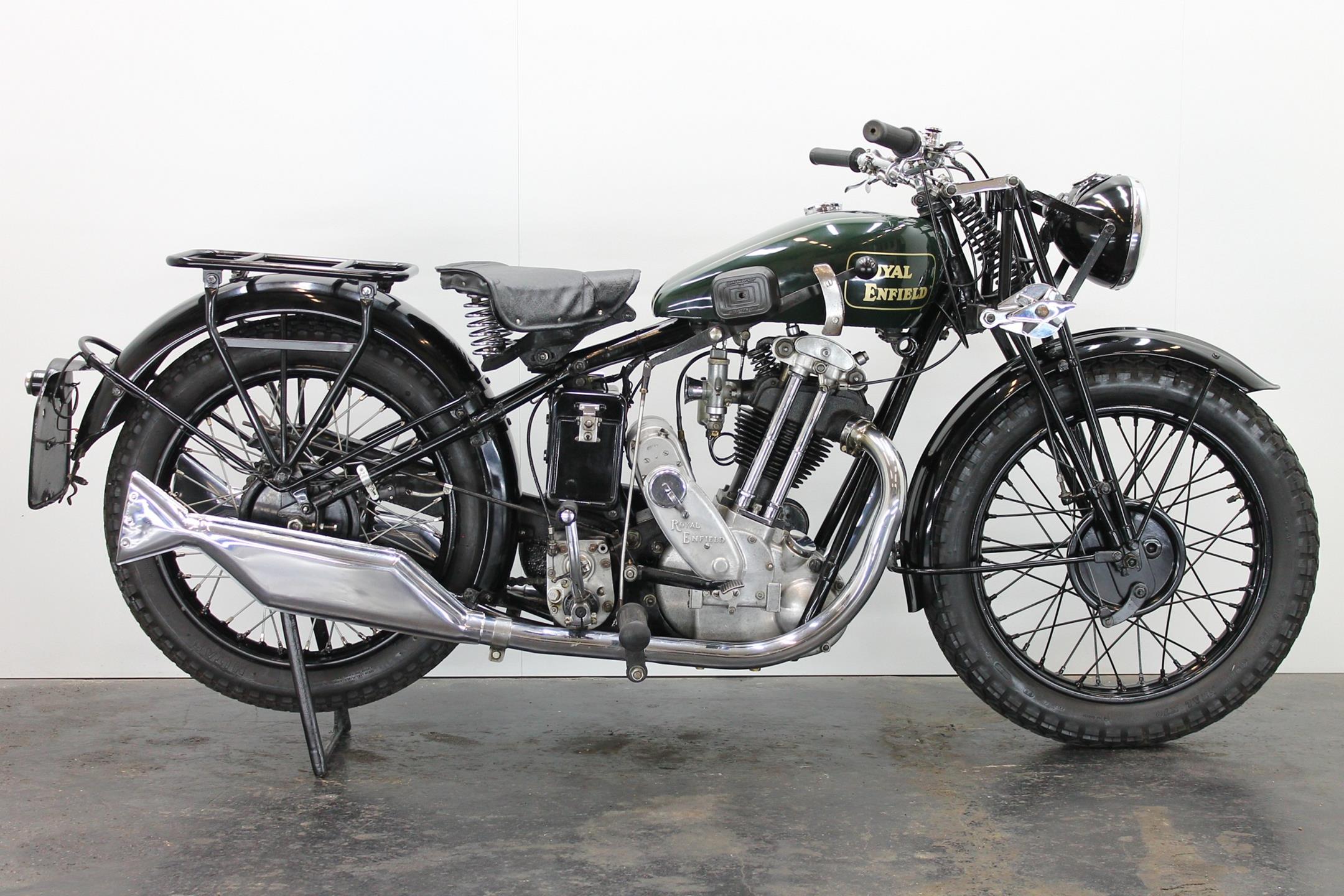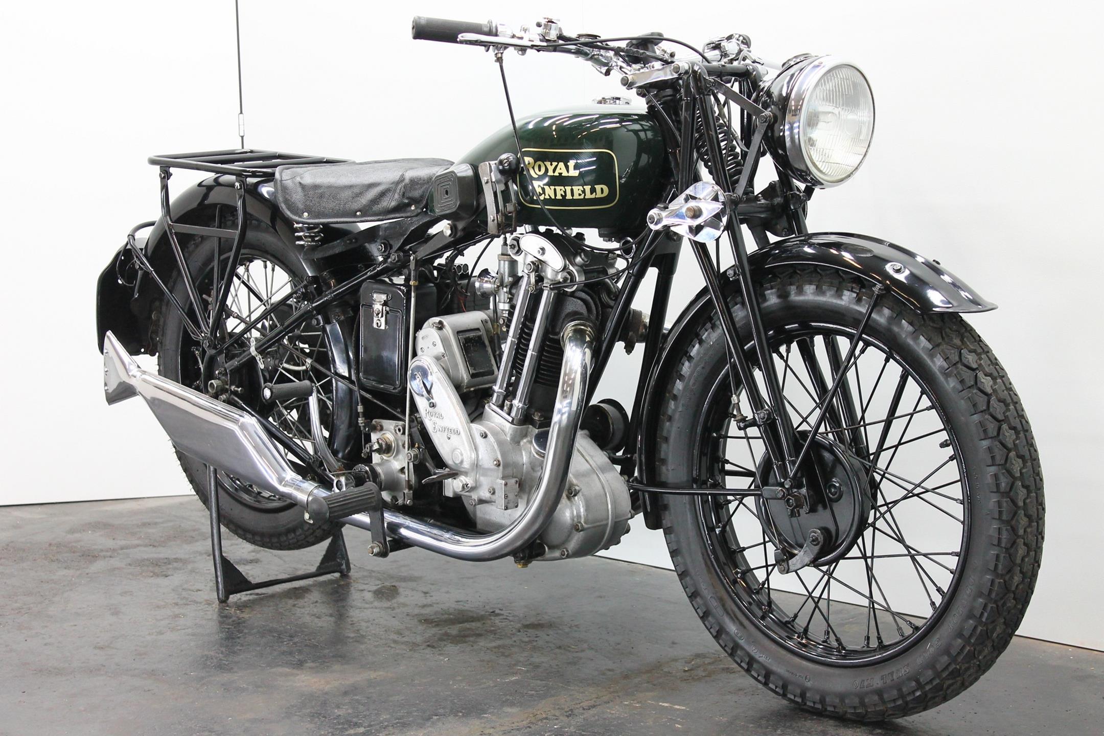 Royal Enfield’s origins can be traced back to a small light engineering firm - George Townsend & Company - founded in Redditch, Worcestershire, in mid-Victorian times. The firm moved into bicycle manufacture and by the turn of the Century had been reorganised as the Enfield Cycle Company, makers of the ‘Royal Enfield’. By 1904 the firm was concentrating on car production, resuming motorcycle manufacture in 1910 with a v-twin Motosacoche-powered lightweight which was followed by the famous JAP v-twin-engined 7hp sidecar outfit for 1912. Enfield’s first 350cc single appeared in 1924 in overhead-valve and sidevalve versions, both of which used engines supplied by J A Prestwich. The JAP engine gave way to one of Royal Enfield’s own manufacture for 1925, and in 1927 the firm introduced its first 500cc (3½hp) model, which used the 1,000cc v-twin’s 85.5x85mm bore/stroke dimensions for an actual capacity of 488cc. An overhead-valve version joined the sidevalve original for 1929 and both used Enfield’s own four-speed gearbox. In 1931 Royal Enfield the model J was the top model in the 500cc class.