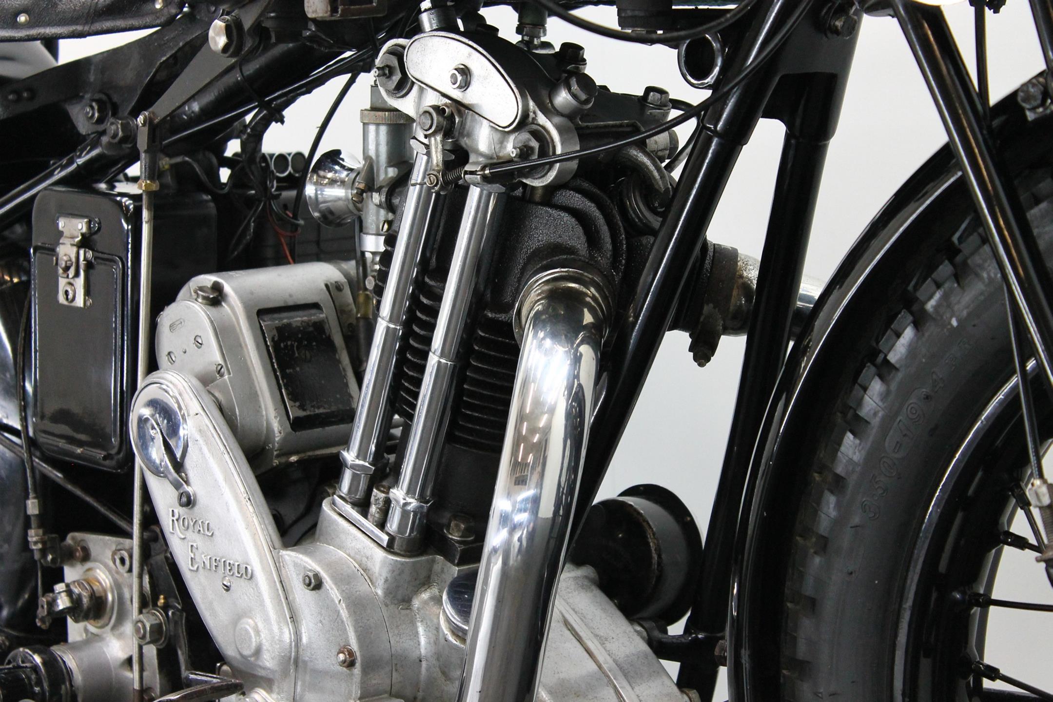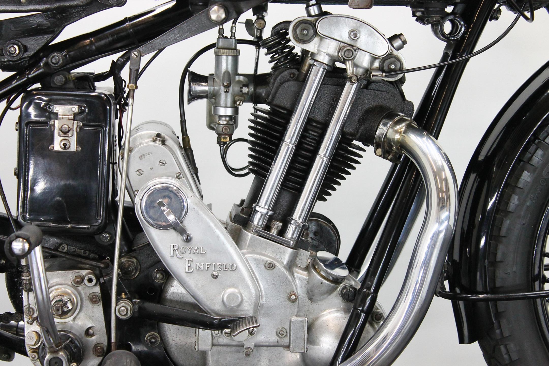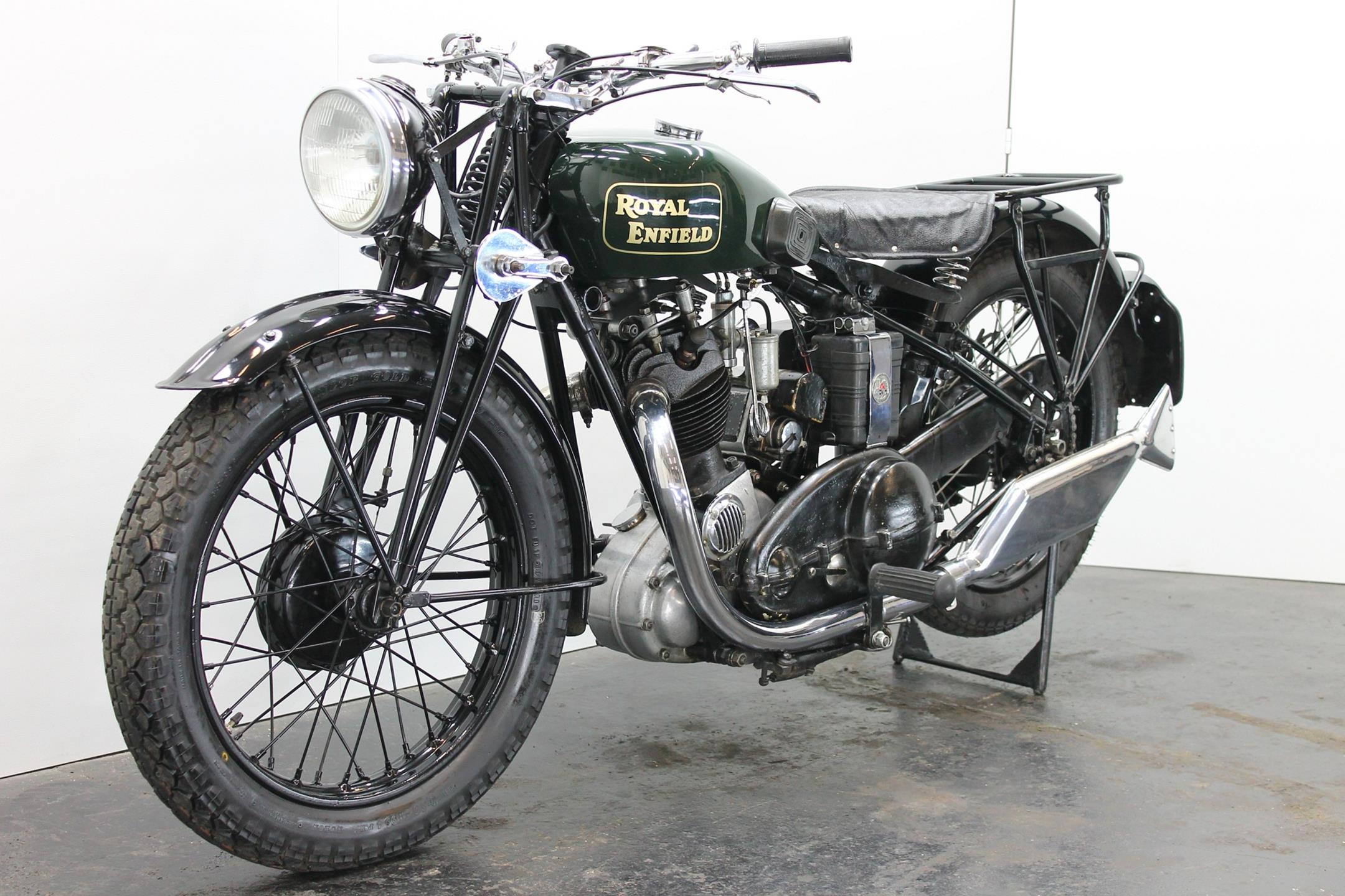 Royal Enfield’s origins can be traced back to a small light engineering firm - George Townsend & Company - founded in Redditch, Worcestershire, in mid-Victorian times. The firm moved into bicycle manufacture and by the turn of the Century had been reorganised as the Enfield Cycle Company, makers of the ‘Royal Enfield’. By 1904 the firm was concentrating on car production, resuming motorcycle manufacture in 1910 with a v-twin Motosacoche-powered lightweight which was followed by the famous JAP v-twin-engined 7hp sidecar outfit for 1912. Enfield’s first 350cc single appeared in 1924 in overhead-valve and sidevalve versions, both of which used engines supplied by J A Prestwich. The JAP engine gave way to one of Royal Enfield’s own manufacture for 1925, and in 1927 the firm introduced its first 500cc (3½hp) model, which used the 1,000cc v-twin’s 85.5x85mm bore/stroke dimensions for an actual capacity of 488cc. An overhead-valve version joined the sidevalve original for 1929 and both used Enfield’s own four-speed gearbox. In 1931 Royal Enfield the model J was the top model in the 500cc class.