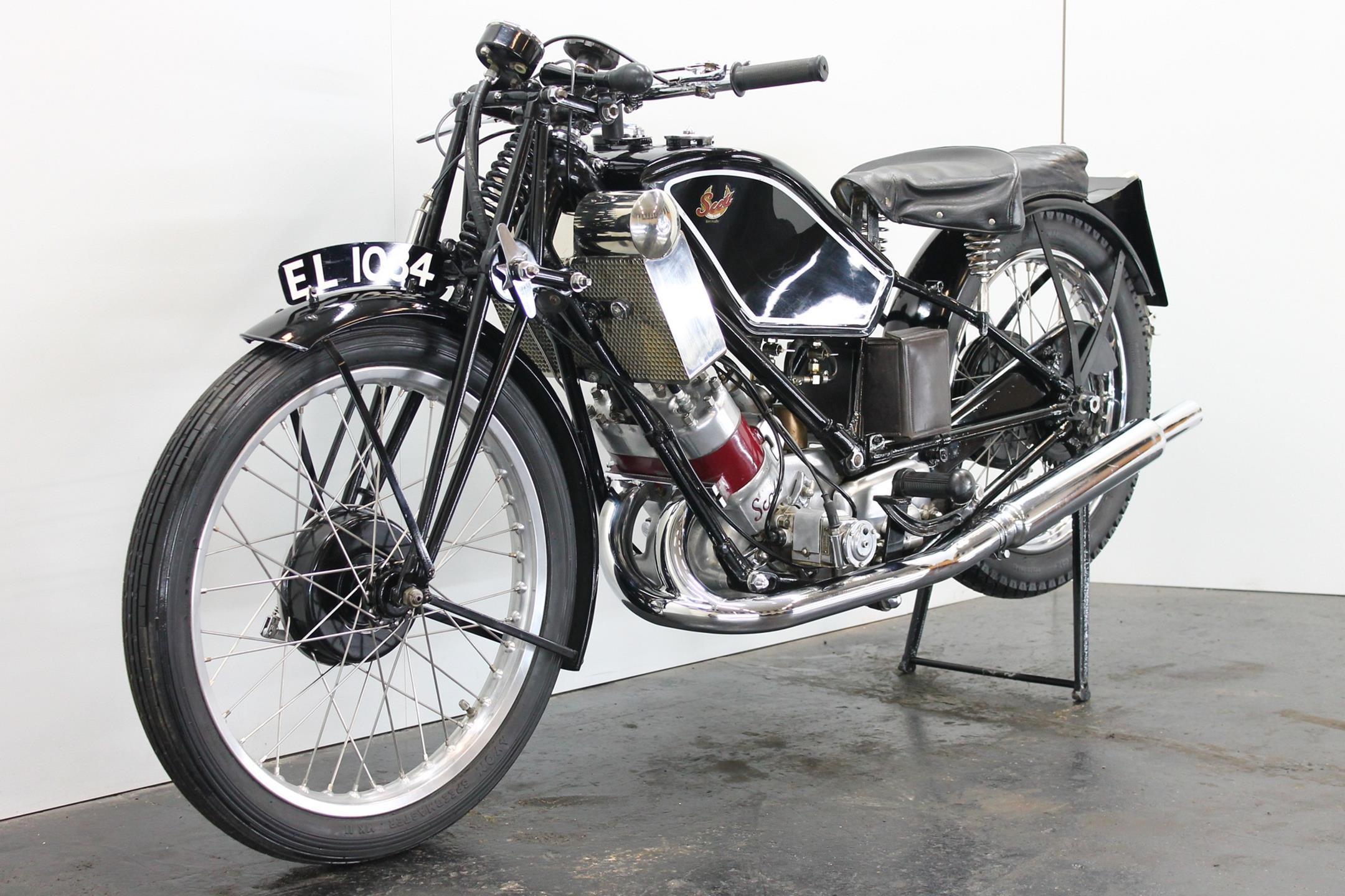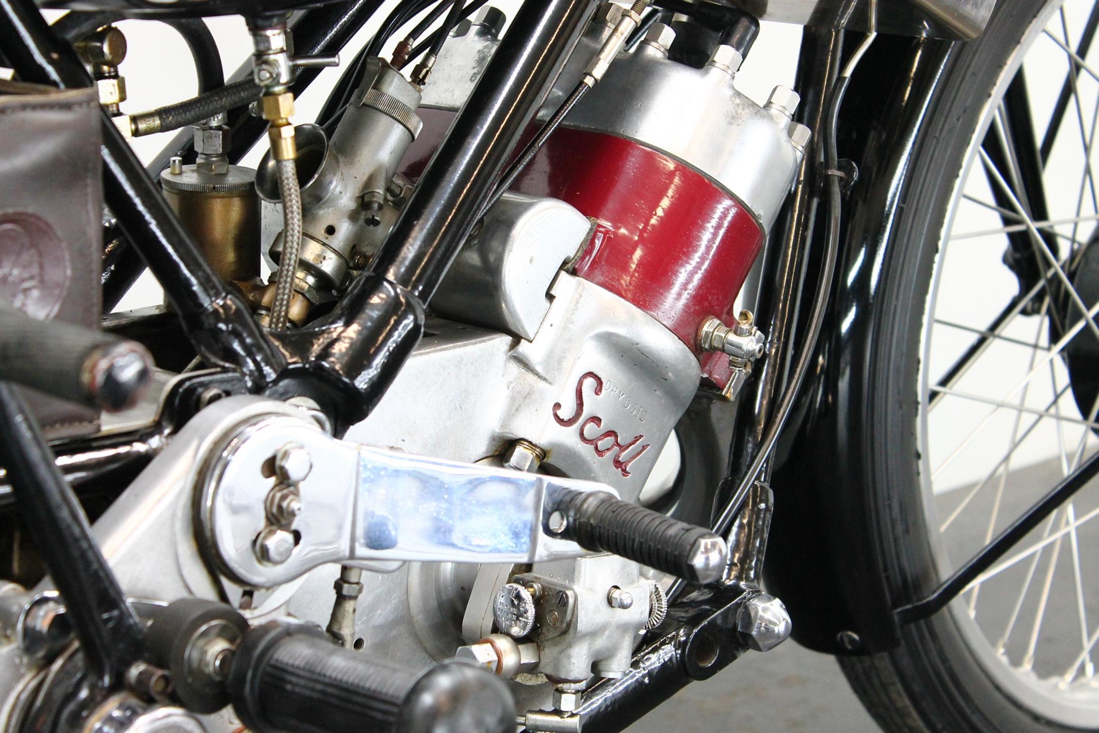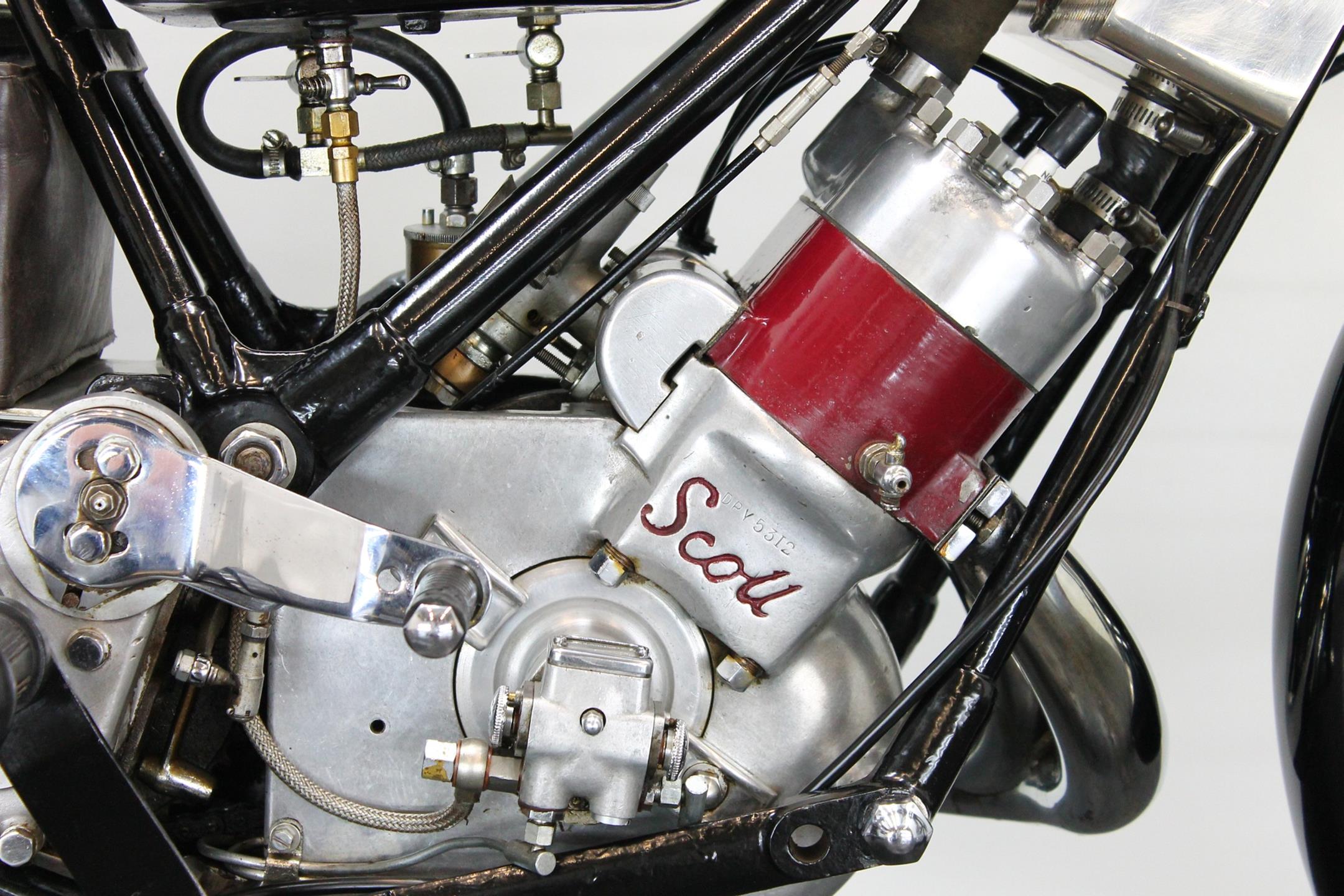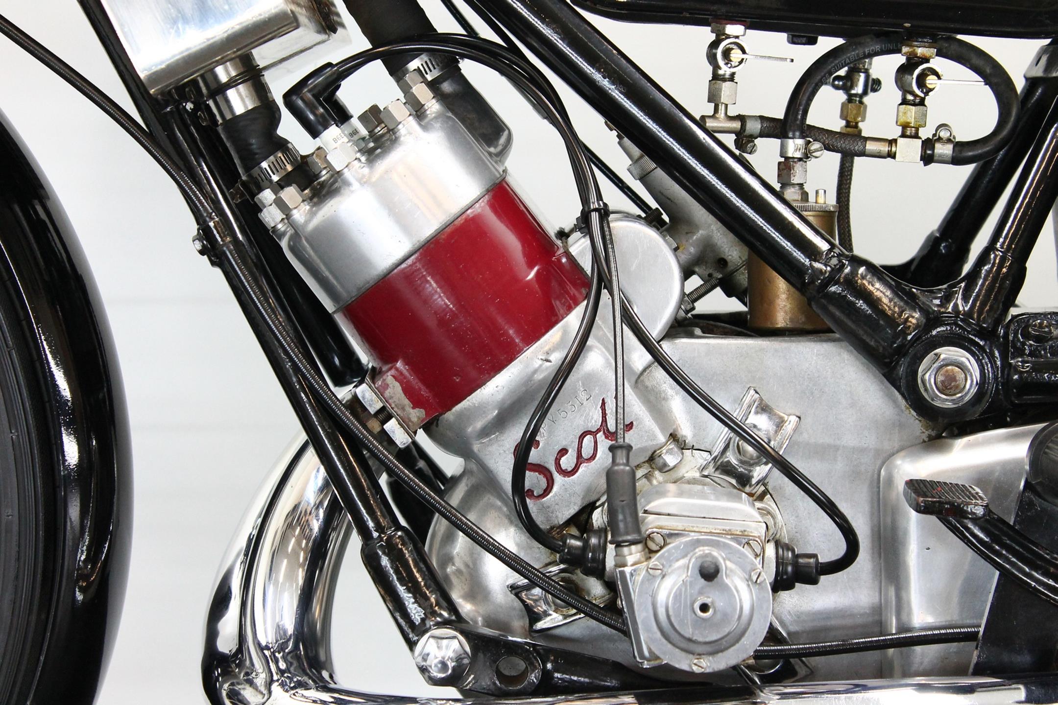 Bradford-born inventor Alfred Angas Scott's experiments with two-stroke motorcycle engines began in the closing years of the 19th Century, leading to the grant of a patent in 1904. Scott's original design for a vertical twin two-stroke engine incorporated the central flywheel with 180-degree overhung cranks and slim connecting rods that would characterize his products from then onwards. One of its chief advantages was close spacing to the cylinder axes and main bearings, thus virtually eliminating the vibratory rocking couple hitherto associated with vertical twins. The first complete Scott motorcycle prototype followed in 1908, its twin-cylinder engine, two-speed foot-change gear and all-chain drive marking it out as an exceptionally advanced design for its day. Like most of their rivals, Scott recognized the value of publicity gained from success on the racetrack - particularly at the Isle of Man TT - and first entered the latter event in 1909, becoming the first two-stroke to start in a Tourist Trophy race. Back-to-back victories in the 1912 and 1913 Senior events would turn out to be the highlights of the firm's TT record, though Harry Langman came close again in 1922 and 1924, finishing third and second respectively. The 1924 works bikes had featured 'square' engines of 68.25mm bore/stroke, and this new 498cc unit became available in the Super Squirrel introduced later in the year together with a 74.6mm-bore 596cc version, which remained essentially unchanged until Scott production petered out in the 1960s, by which time the company had changed hands and relocated from Shipley to Birmingham.