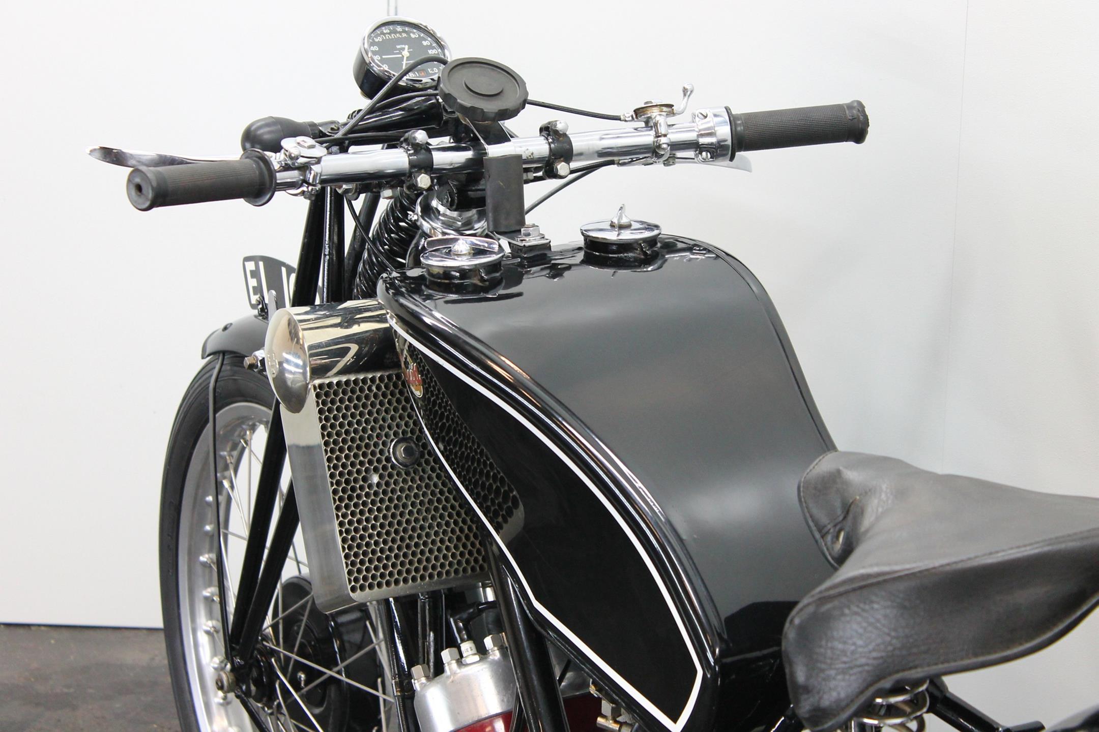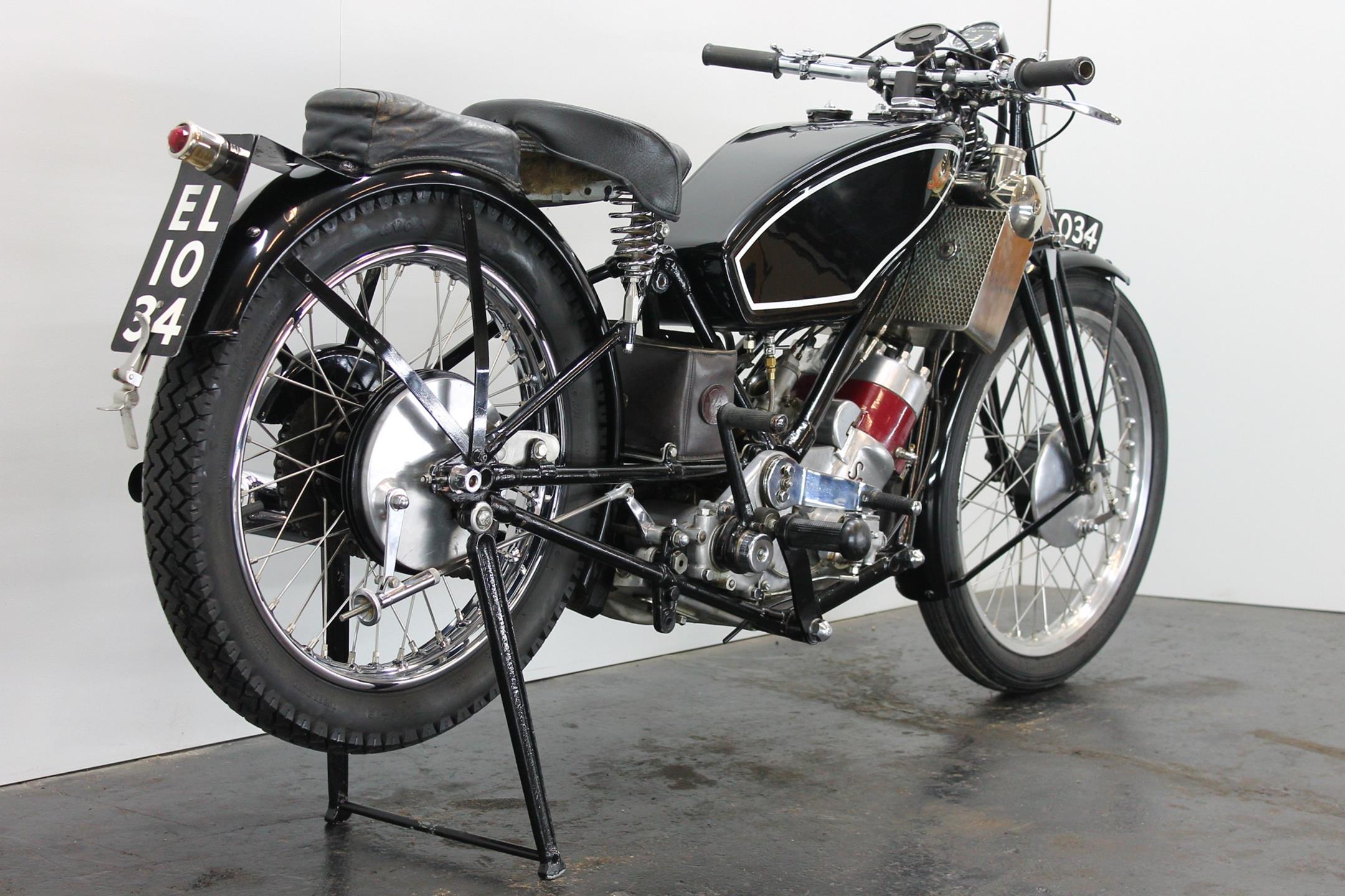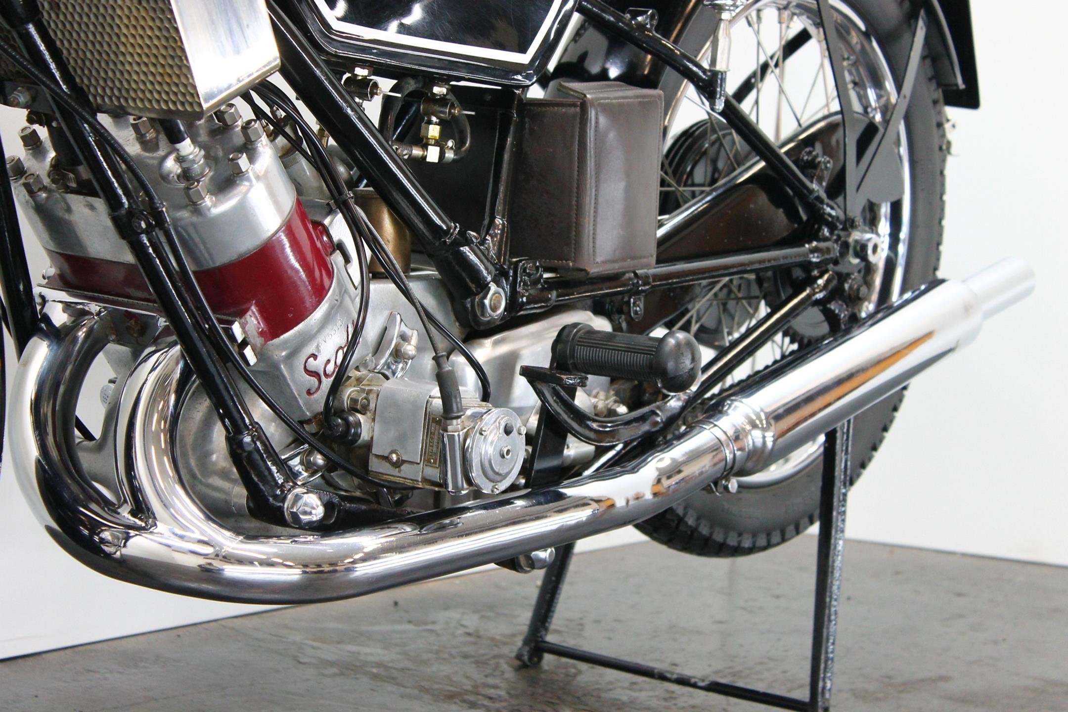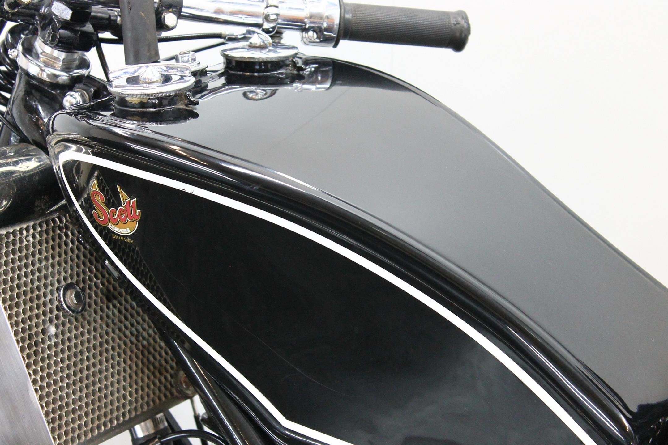 Bradford-born inventor Alfred Angas Scott's experiments with two-stroke motorcycle engines began in the closing years of the 19th Century, leading to the grant of a patent in 1904. Scott's original design for a vertical twin two-stroke engine incorporated the central flywheel with 180-degree overhung cranks and slim connecting rods that would characterize his products from then onwards. One of its chief advantages was close spacing to the cylinder axes and main bearings, thus virtually eliminating the vibratory rocking couple hitherto associated with vertical twins. The first complete Scott motorcycle prototype followed in 1908, its twin-cylinder engine, two-speed foot-change gear and all-chain drive marking it out as an exceptionally advanced design for its day. Like most of their rivals, Scott recognized the value of publicity gained from success on the racetrack - particularly at the Isle of Man TT - and first entered the latter event in 1909, becoming the first two-stroke to start in a Tourist Trophy race. Back-to-back victories in the 1912 and 1913 Senior events would turn out to be the highlights of the firm's TT record, though Harry Langman came close again in 1922 and 1924, finishing third and second respectively. The 1924 works bikes had featured 'square' engines of 68.25mm bore/stroke, and this new 498cc unit became available in the Super Squirrel introduced later in the year together with a 74.6mm-bore 596cc version, which remained essentially unchanged until Scott production petered out in the 1960s, by which time the company had changed hands and relocated from Shipley to Birmingham.