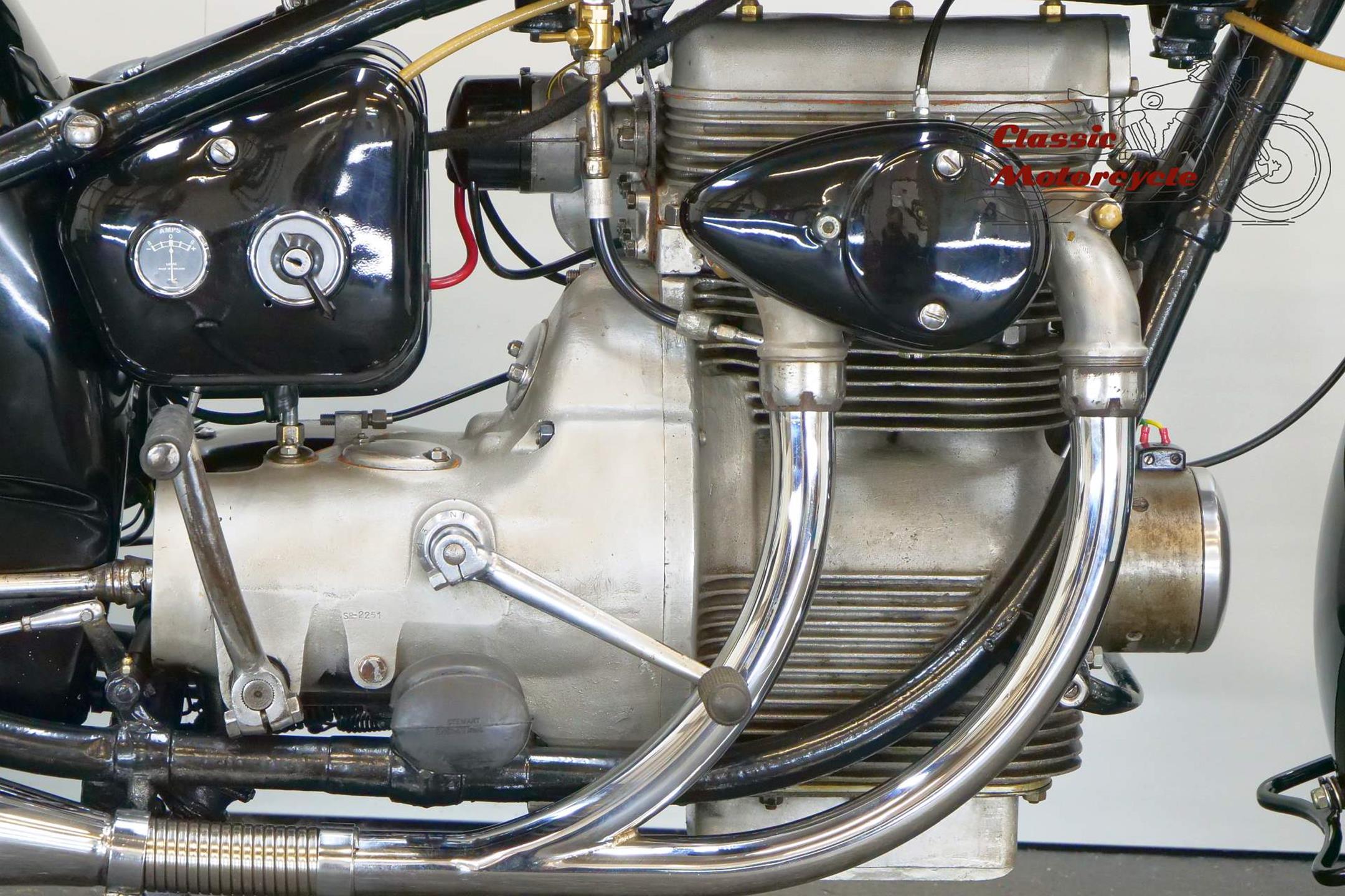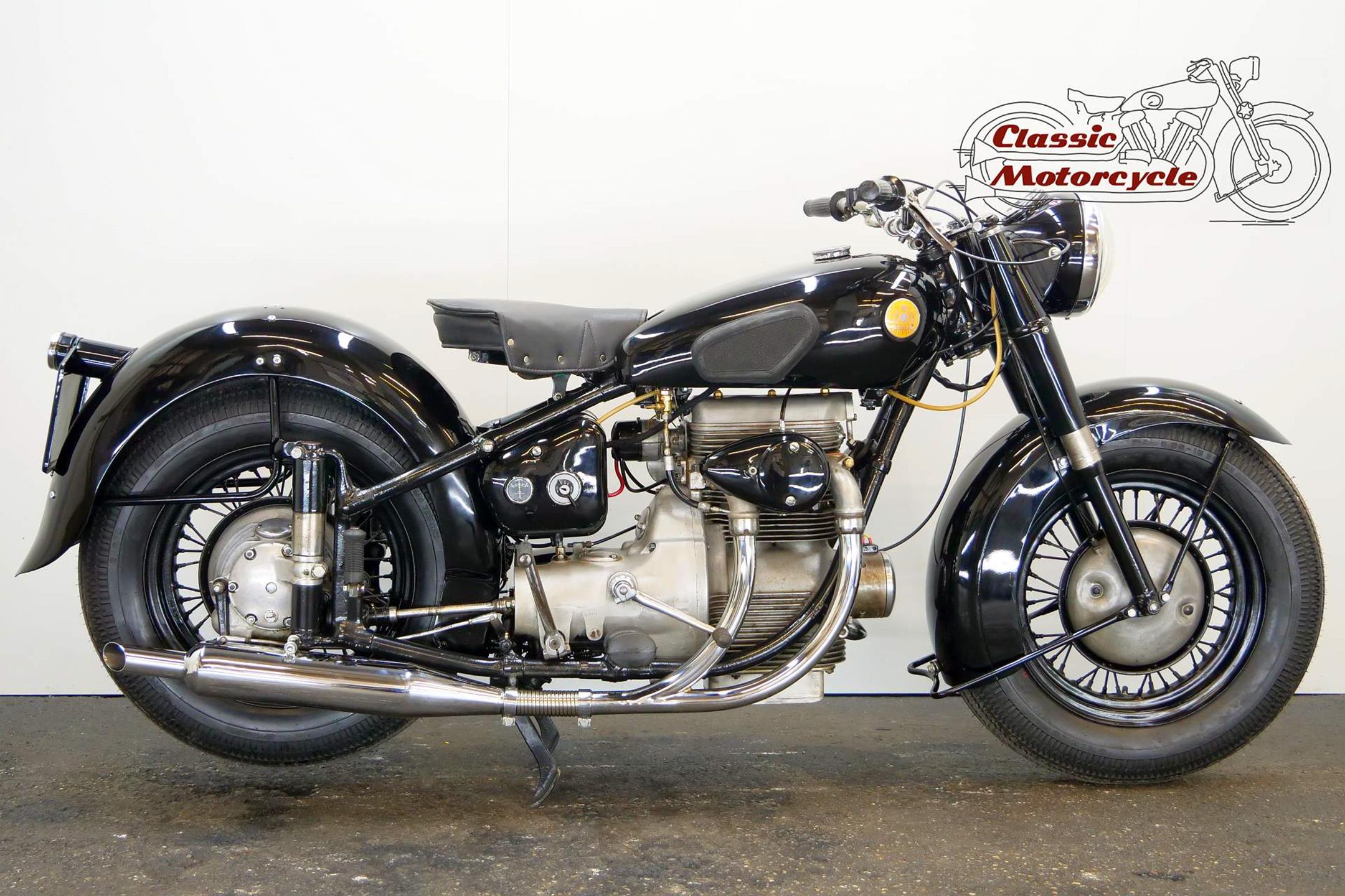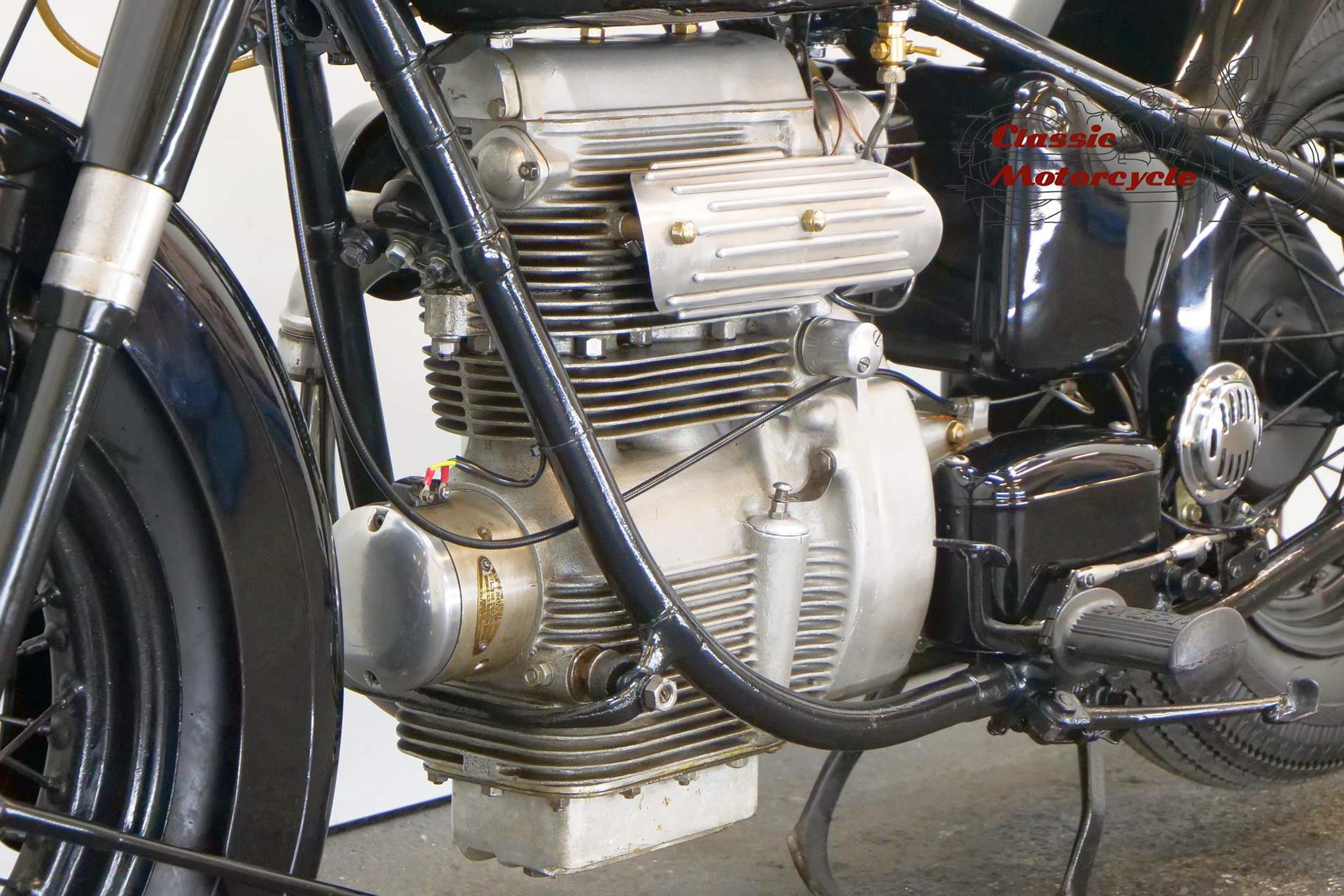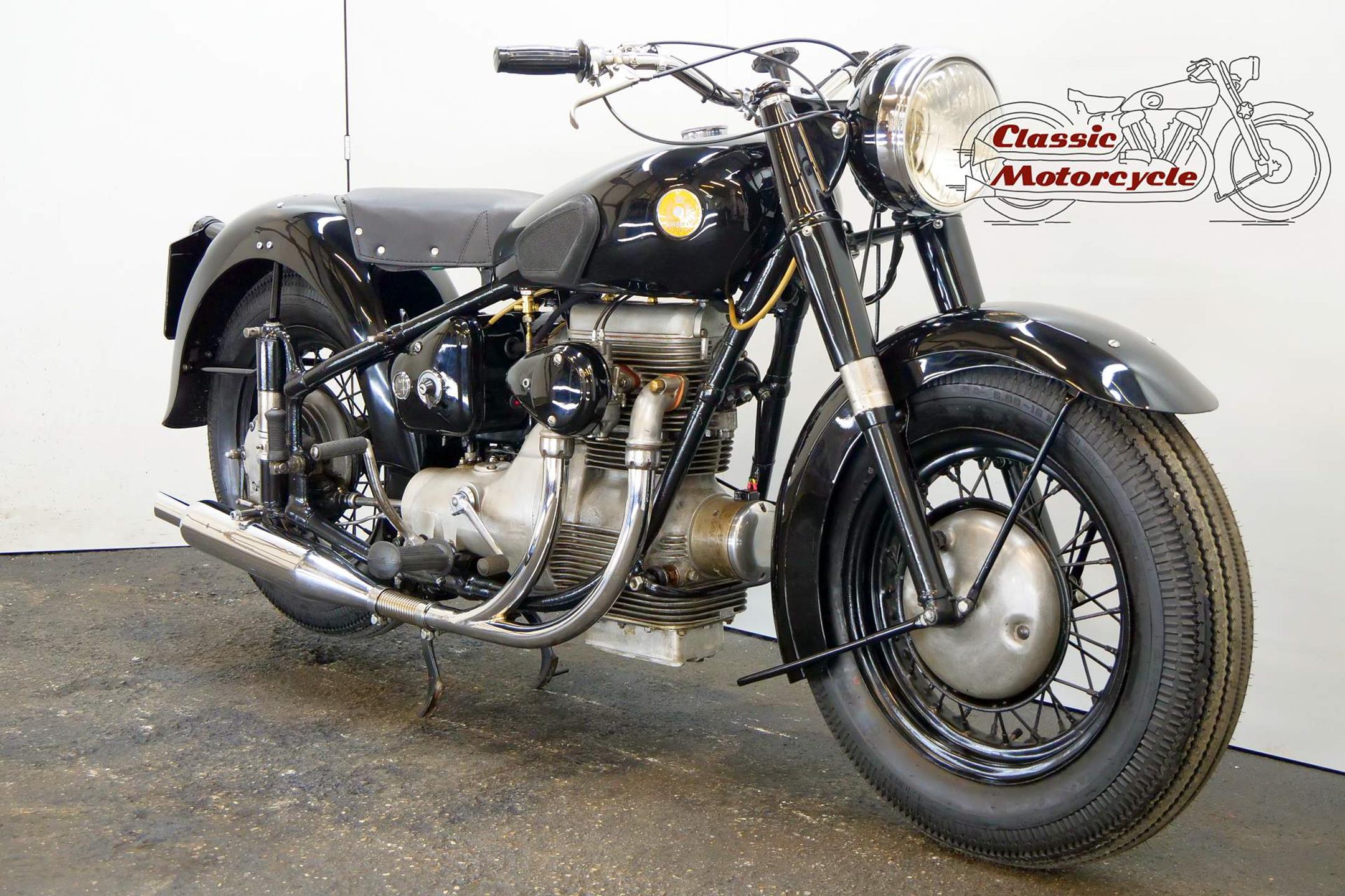 Designed in wartime, the Sunbeam inline twin was introduced in 1947. A luxury tourer inspired by the pre-war BMW, it was of advanced specification with overhead-camshaft engine, shaft drive, and plunger rear suspension. The clutch housing and four-speed gearbox bolted directly to the back of the engine, which was rubber mounted in the duplex loop frame, an innovation that required a flexible joint in the exhaust system ahead of the silencer. The first S7 version was equipped with balloon tyres, a feature not carried over to the more conventional S8 introduced in 1949. Never as popular as BSA's more performance orientated models, the gentlemanly S7 and S8 remained in production until 1957.