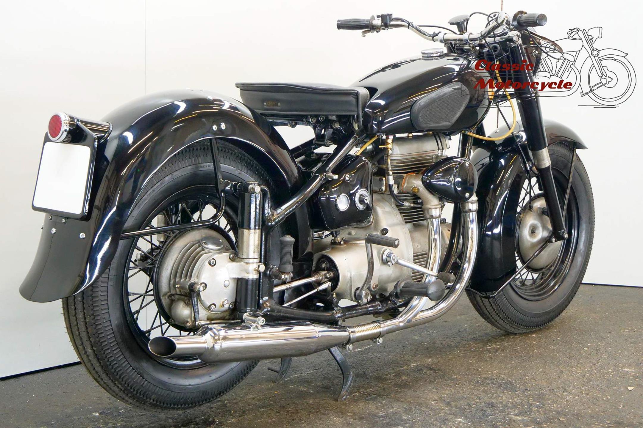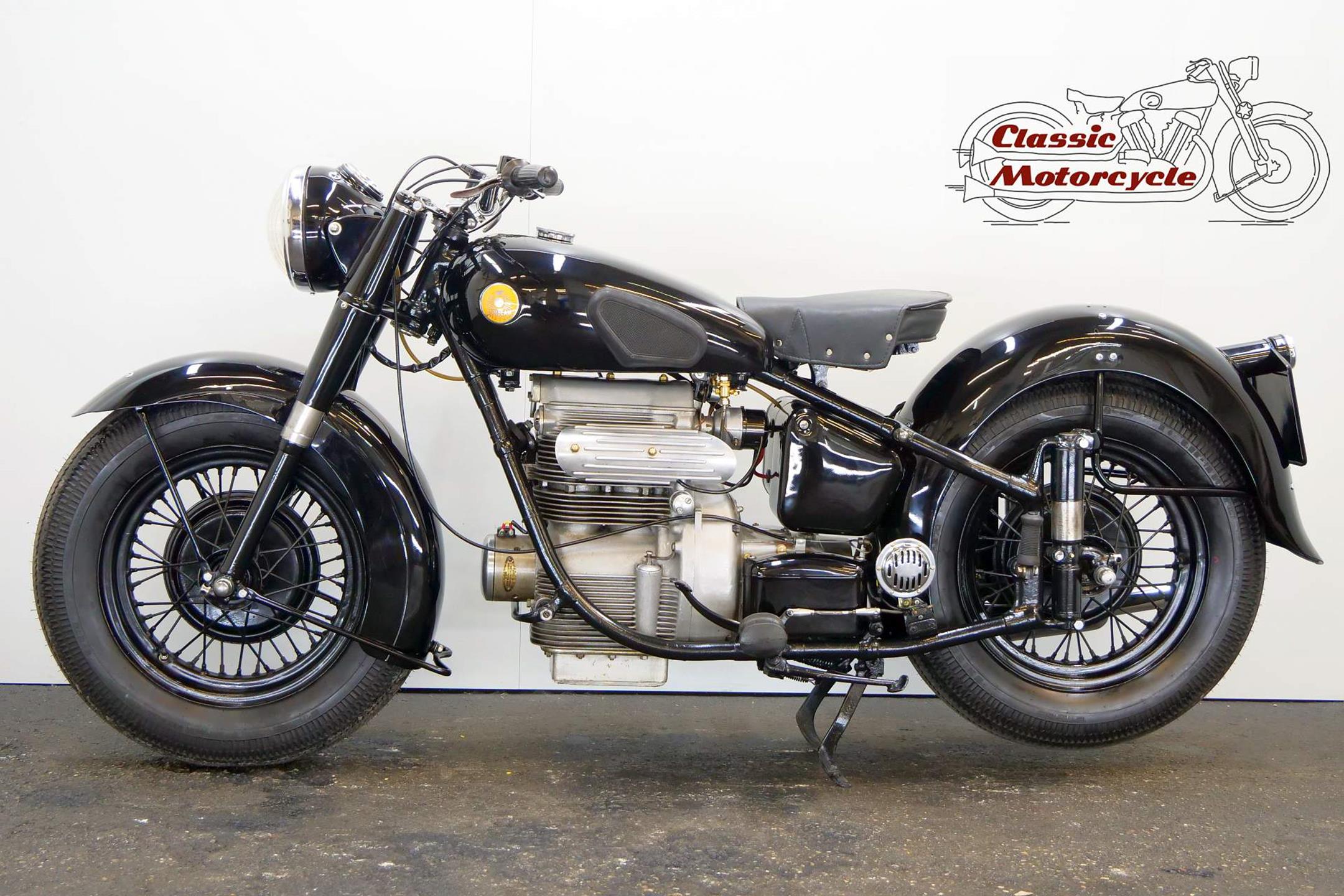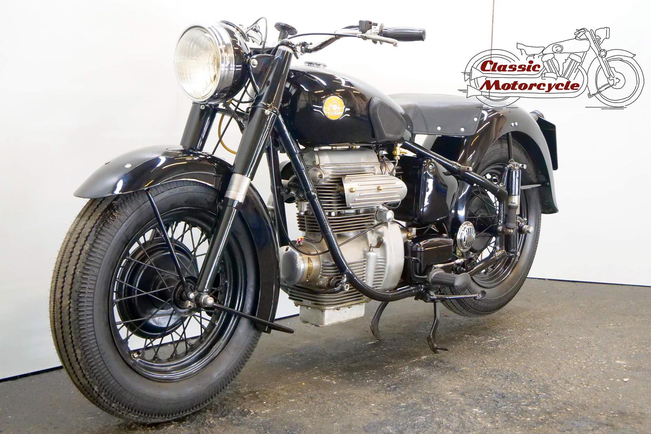 Designed in wartime, the Sunbeam inline twin was introduced in 1947. A luxury tourer inspired by the pre-war BMW, it was of advanced specification with overhead-camshaft engine, shaft drive, and plunger rear suspension. The clutch housing and four-speed gearbox bolted directly to the back of the engine, which was rubber mounted in the duplex loop frame, an innovation that required a flexible joint in the exhaust system ahead of the silencer. The first S7 version was equipped with balloon tyres, a feature not carried over to the more conventional S8 introduced in 1949. Never as popular as BSA's more performance orientated models, the gentlemanly S7 and S8 remained in production until 1957.