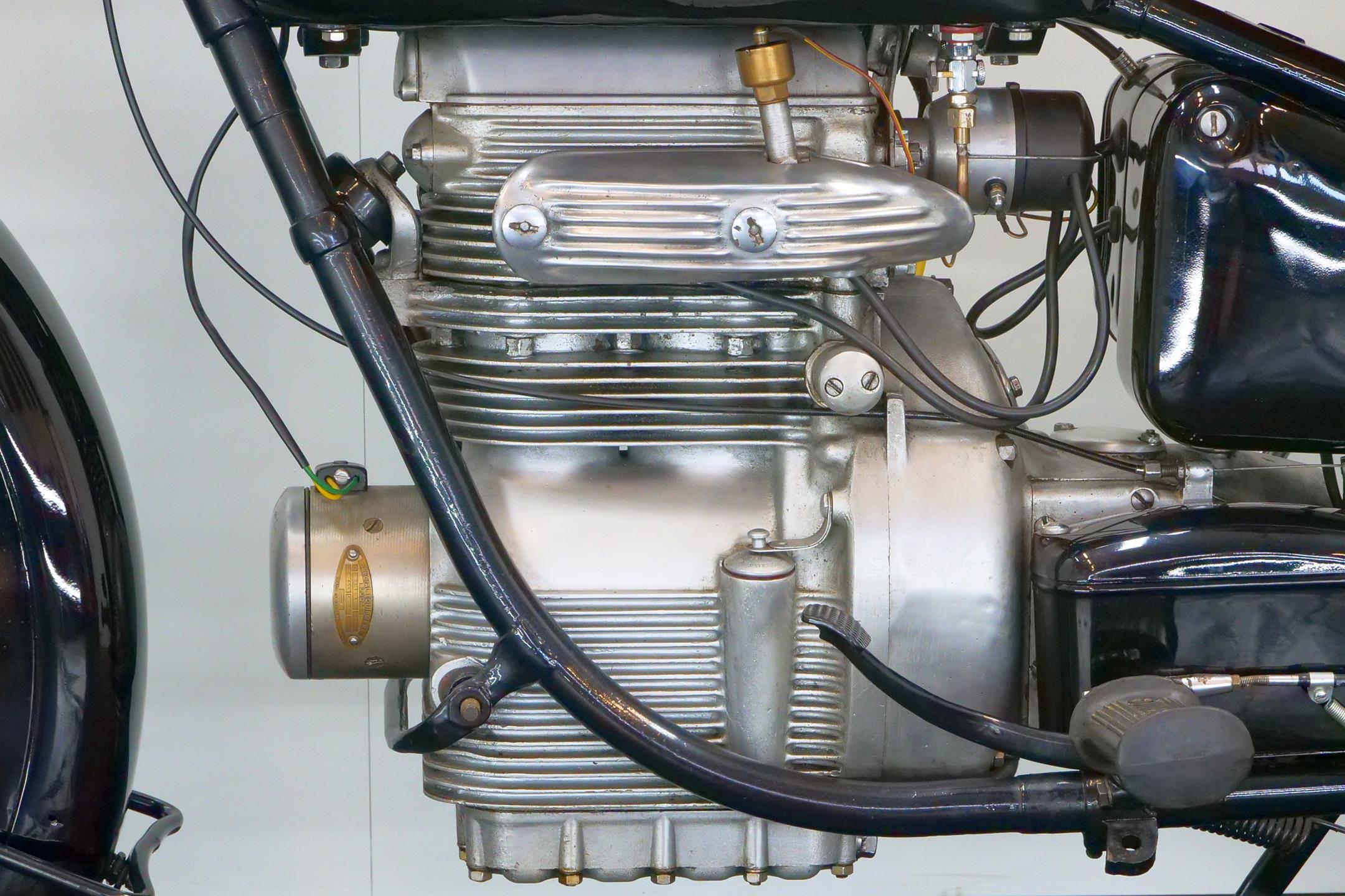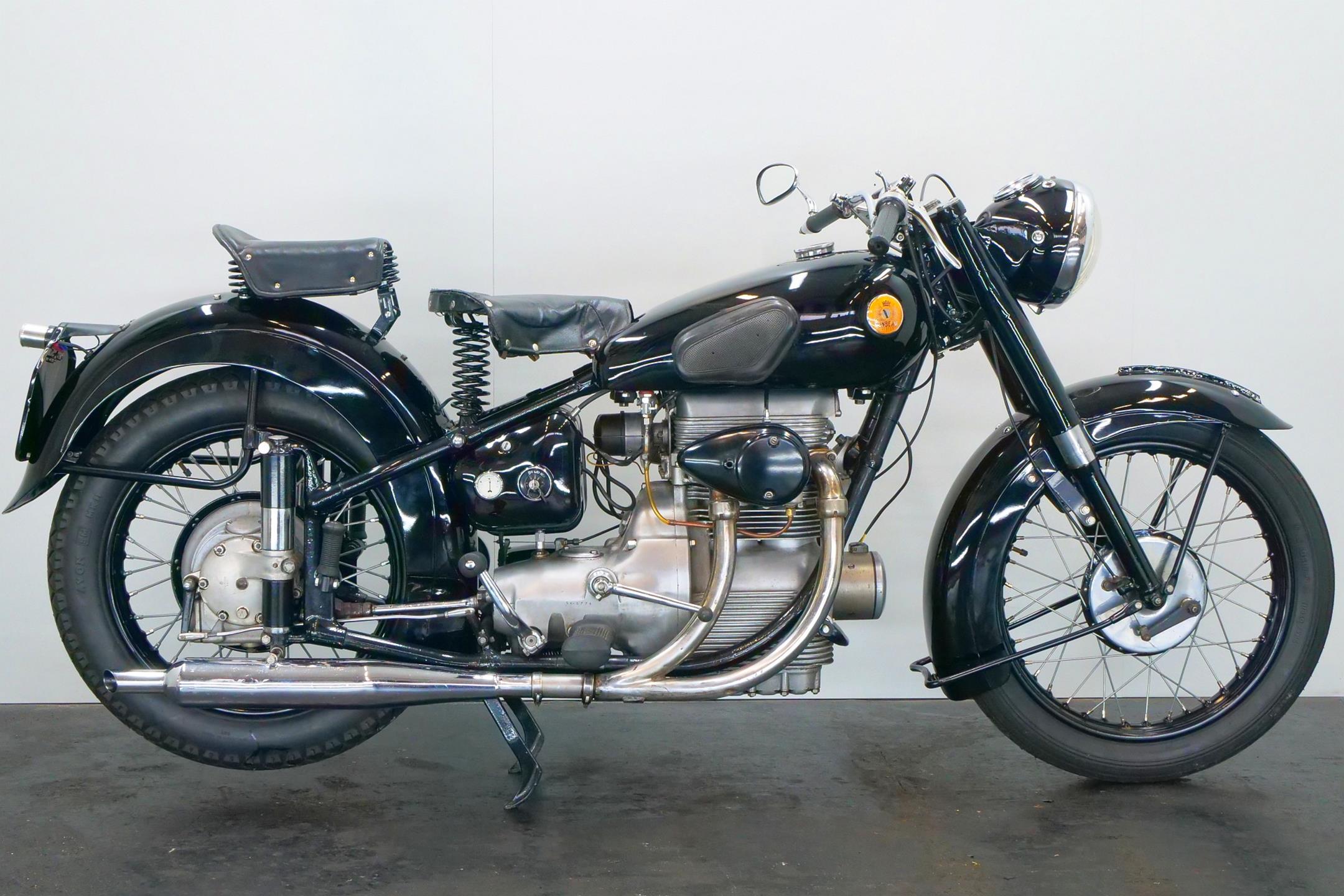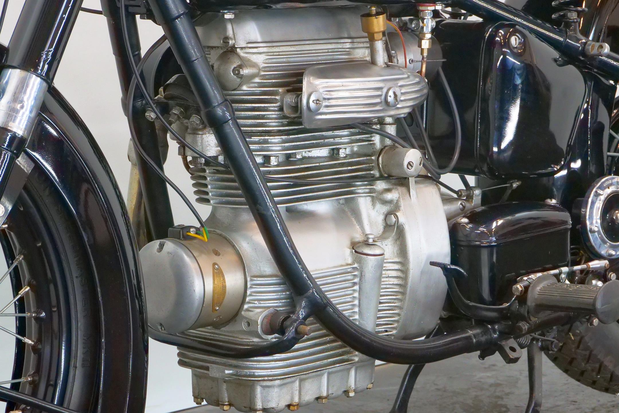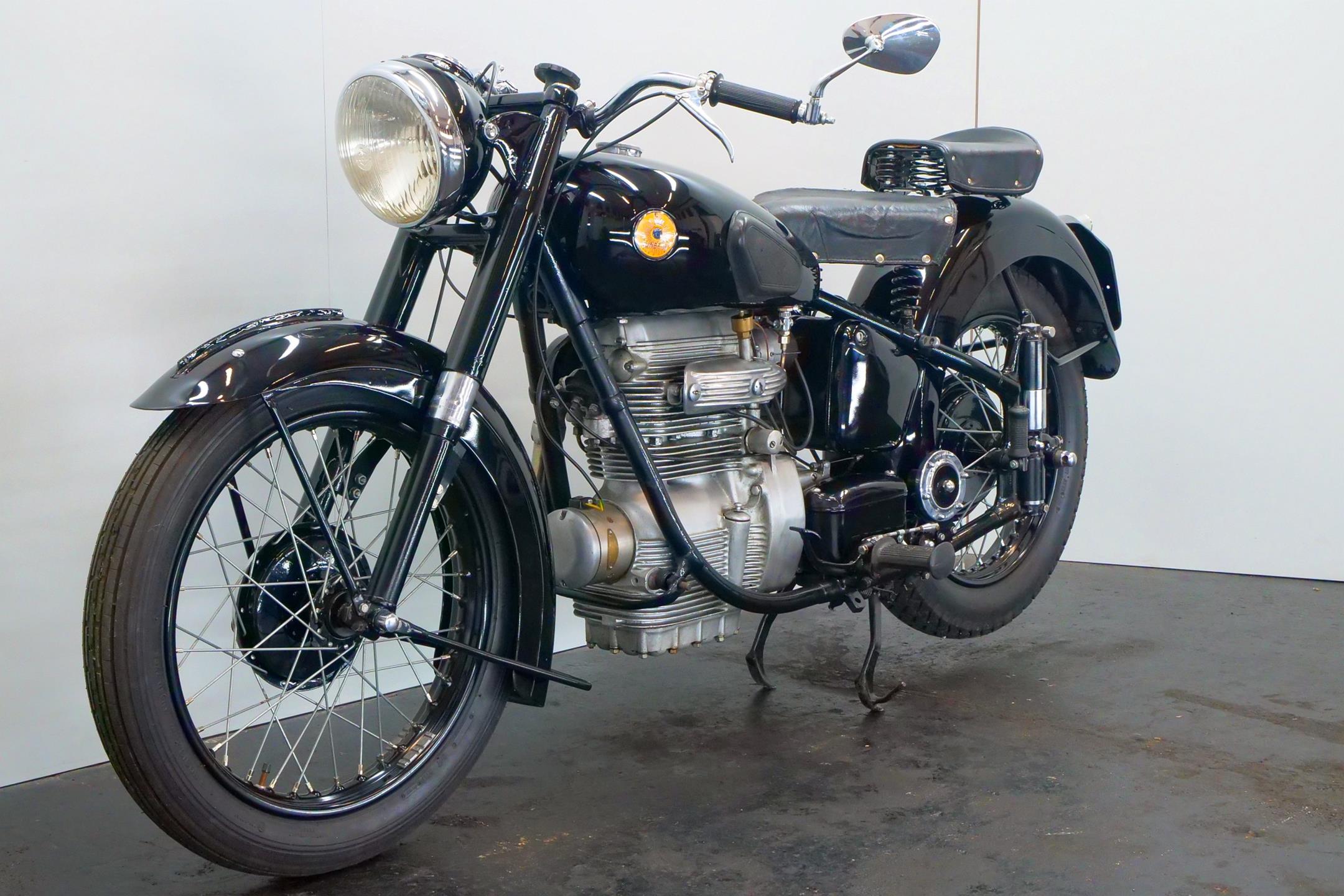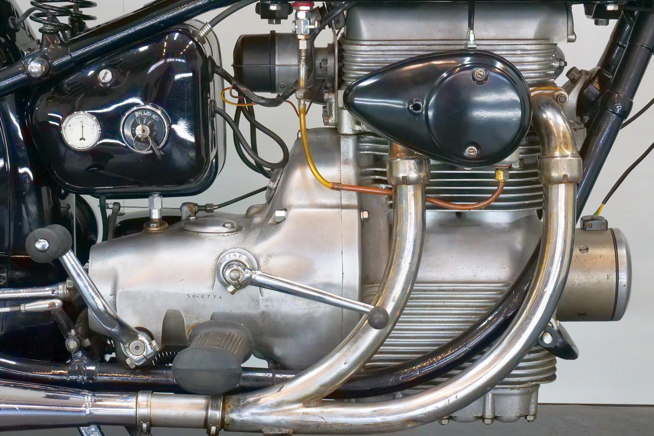 The Sunbeam inline twin was introduced in 1947. A luxury tourer inspired by the pre-war BMW, it was of advanced specification with overhead-camshaft engine, shaft drive, plunger rear suspension, and balloon tyres. A deliberately more conventional, and also lighter and cheaper, S8 version was introduced in 1949. The S8's front fork and 7" brake were now standard BSA components, and there were numerous other changes made in the interests of rationalisation. Never as popular as BSA's more performance orientated models, the gentlemanly S7 and S8 remained in production until 1957.
