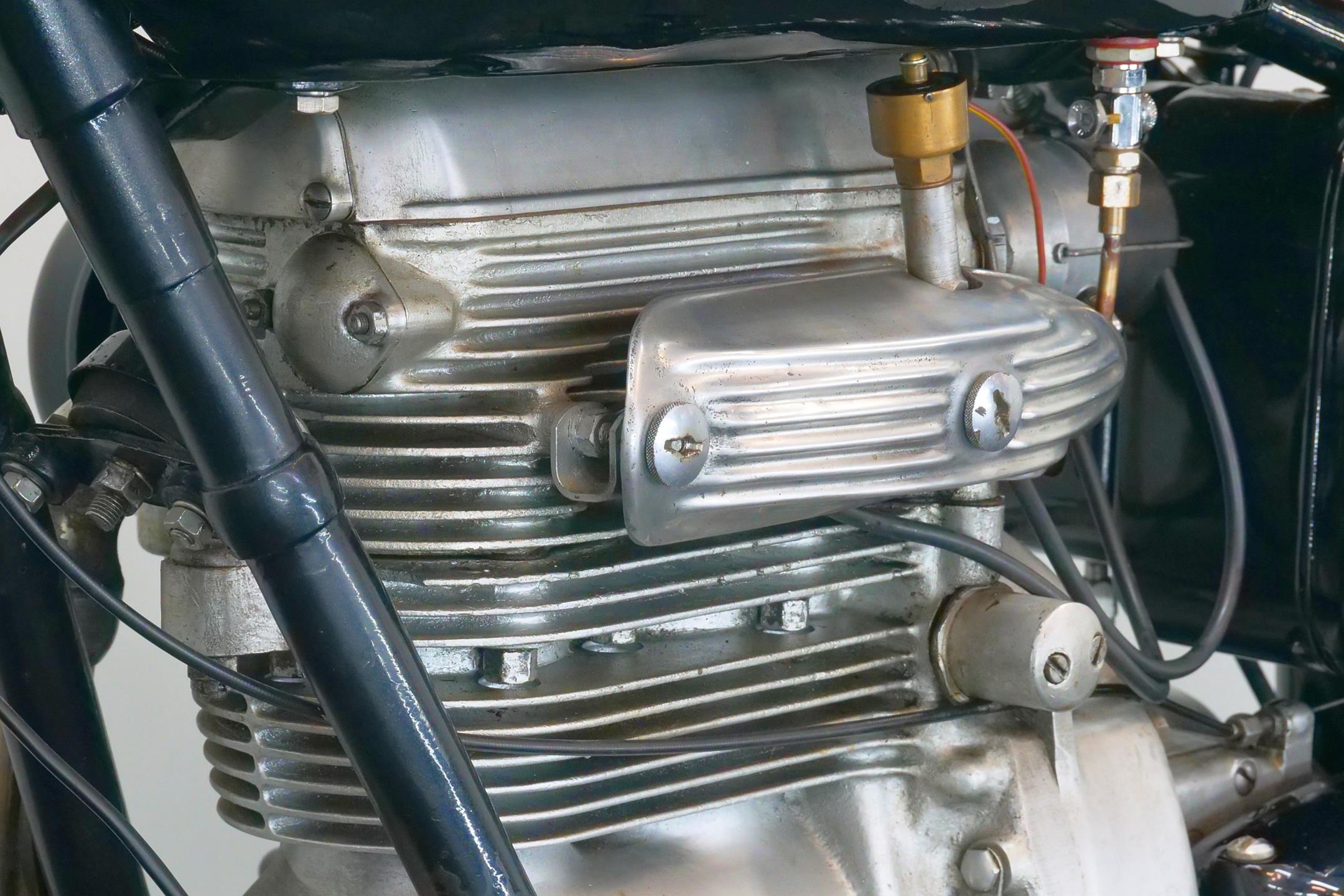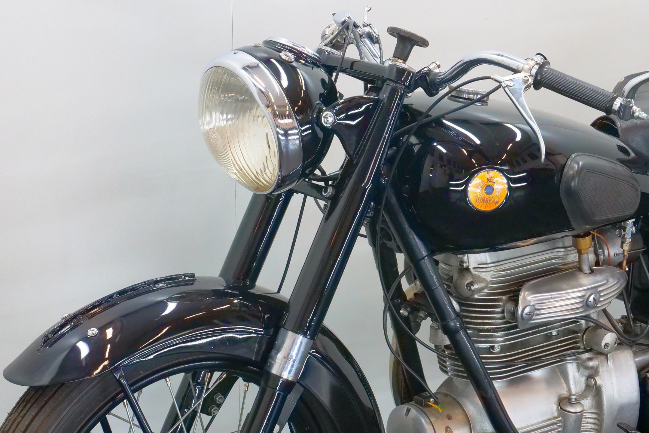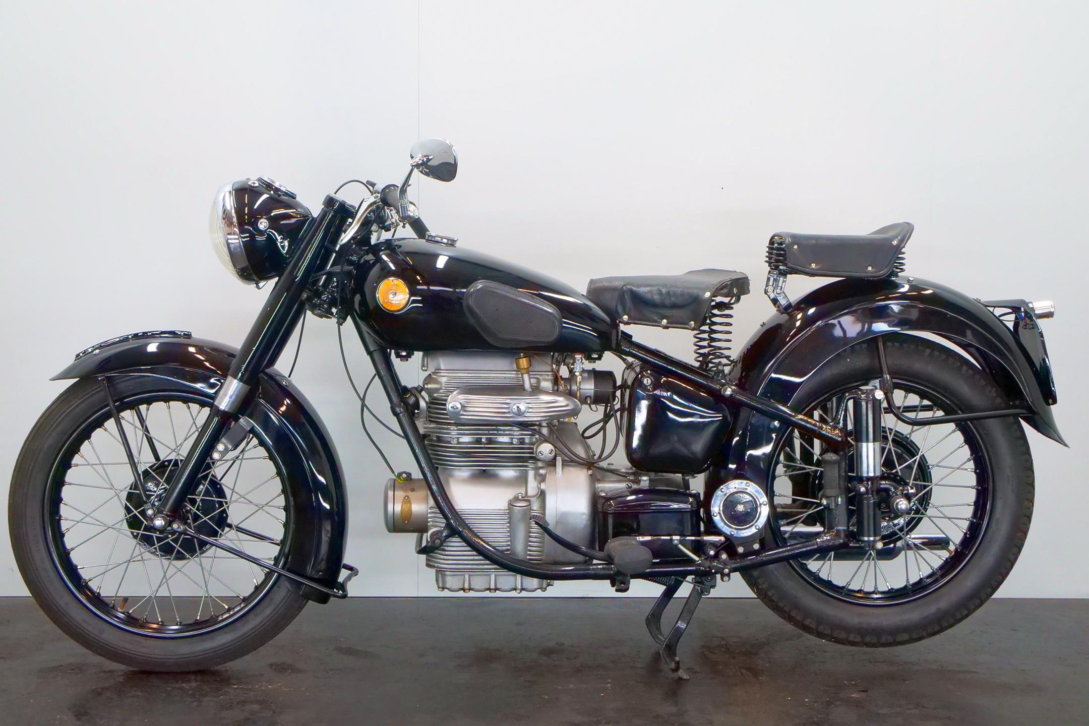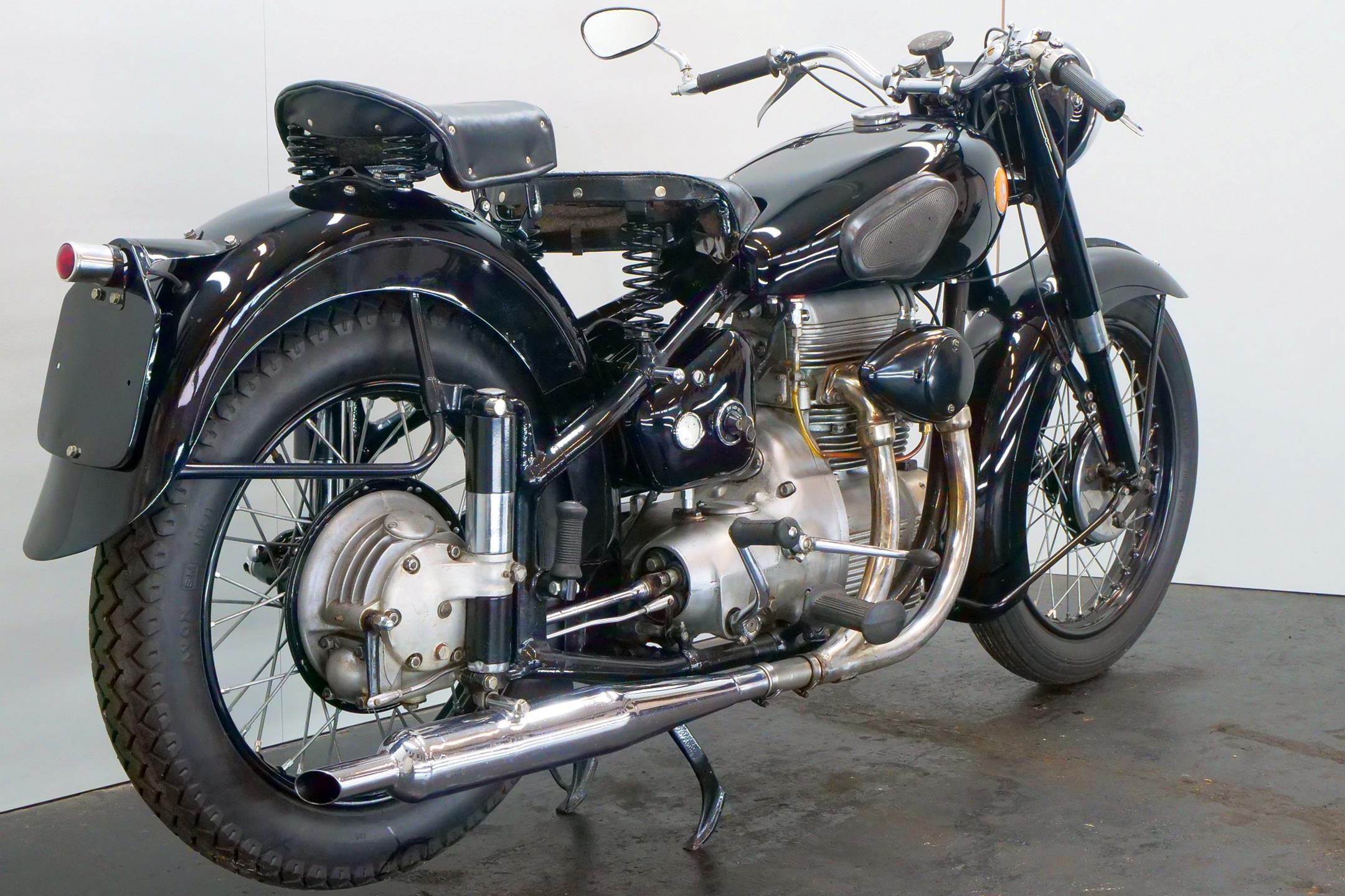 The Sunbeam inline twin was introduced in 1947. A luxury tourer inspired by the pre-war BMW, it was of advanced specification with overhead-camshaft engine, shaft drive, plunger rear suspension, and balloon tyres. A deliberately more conventional, and also lighter and cheaper, S8 version was introduced in 1949. The S8's front fork and 7" brake were now standard BSA components, and there were numerous other changes made in the interests of rationalisation. Never as popular as BSA's more performance orientated models, the gentlemanly S7 and S8 remained in production until 1957.