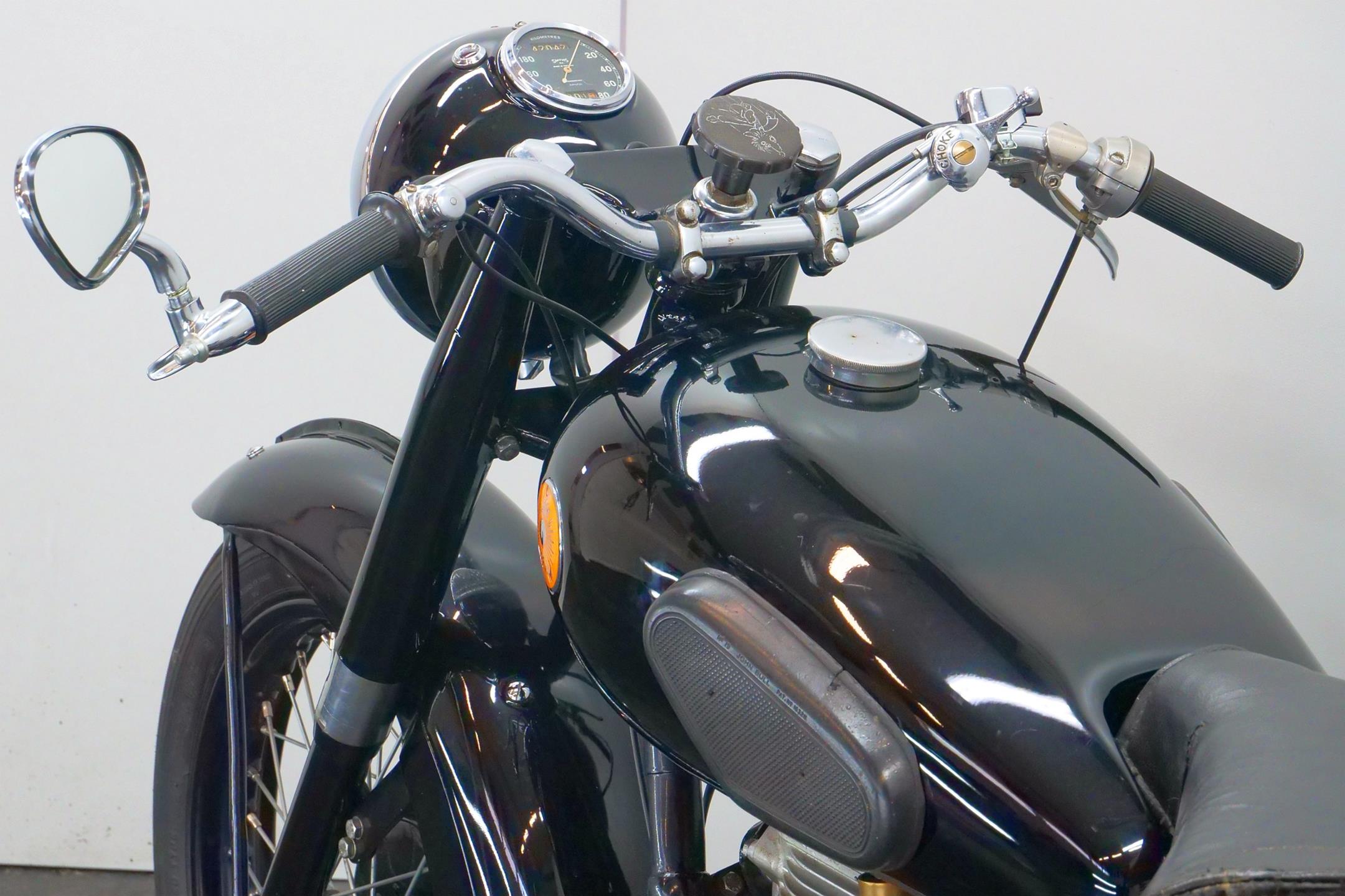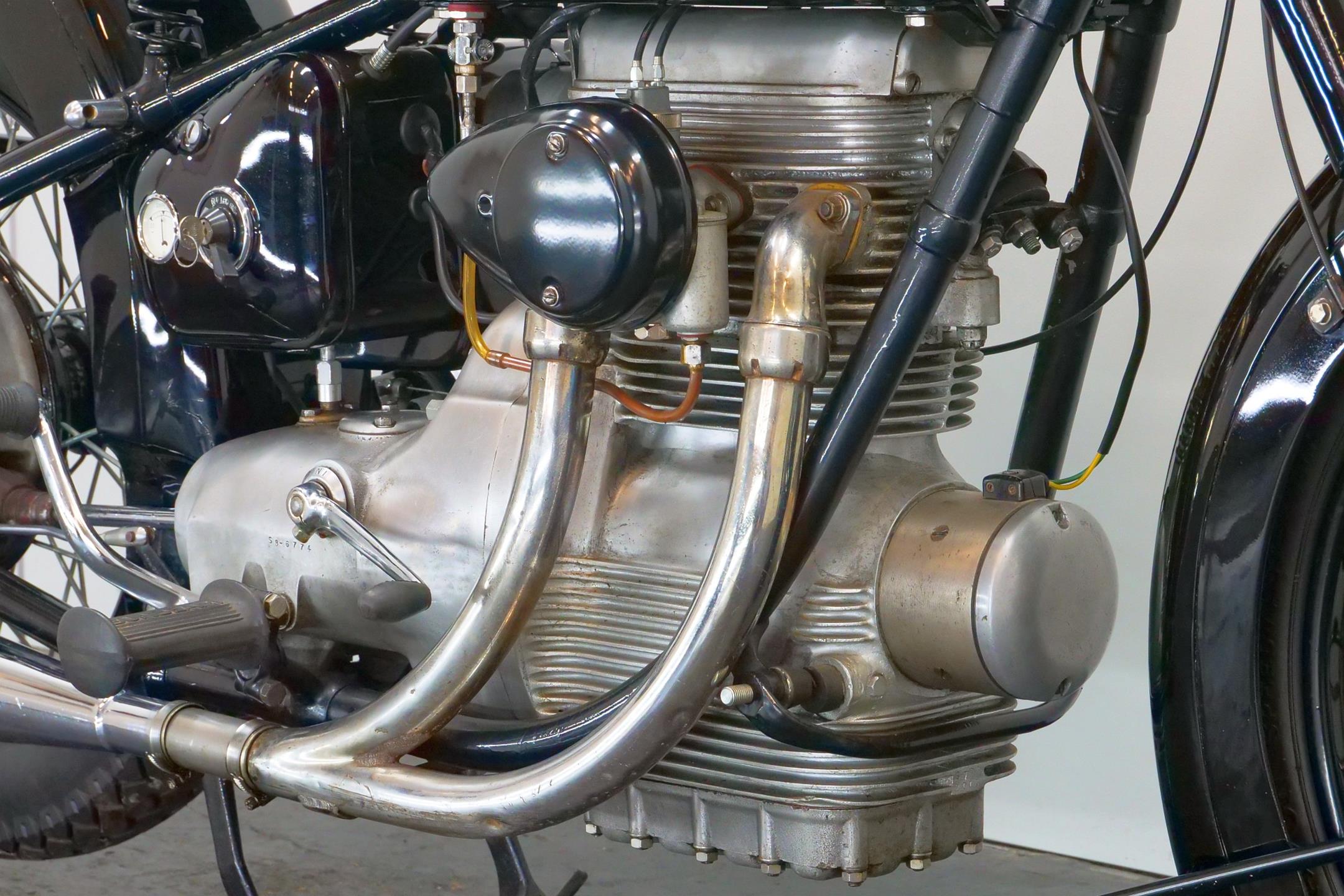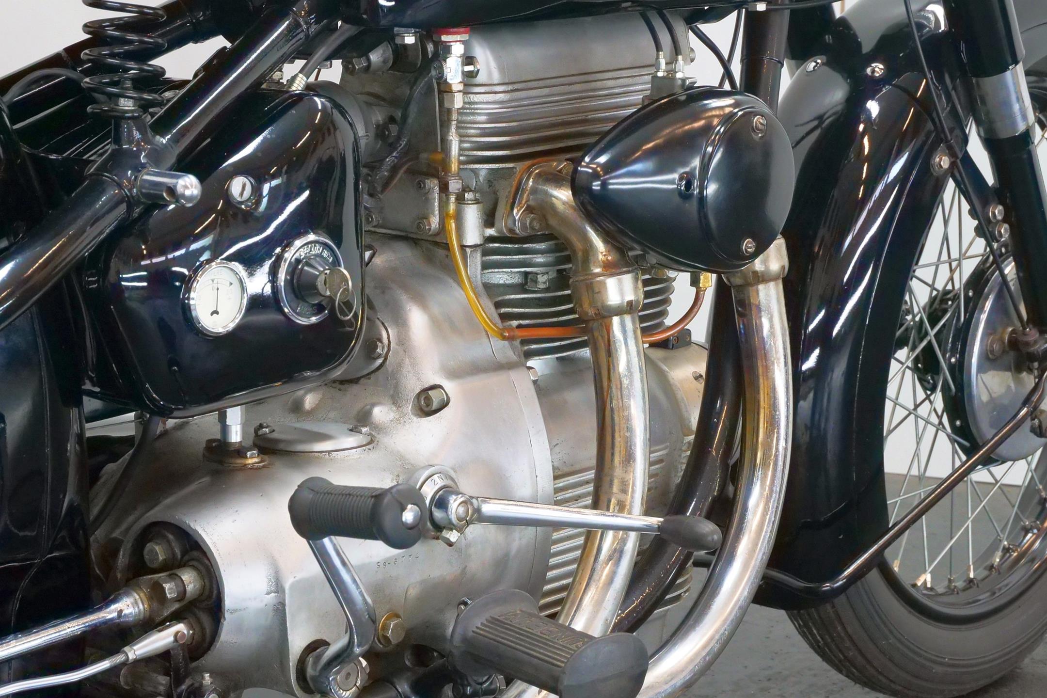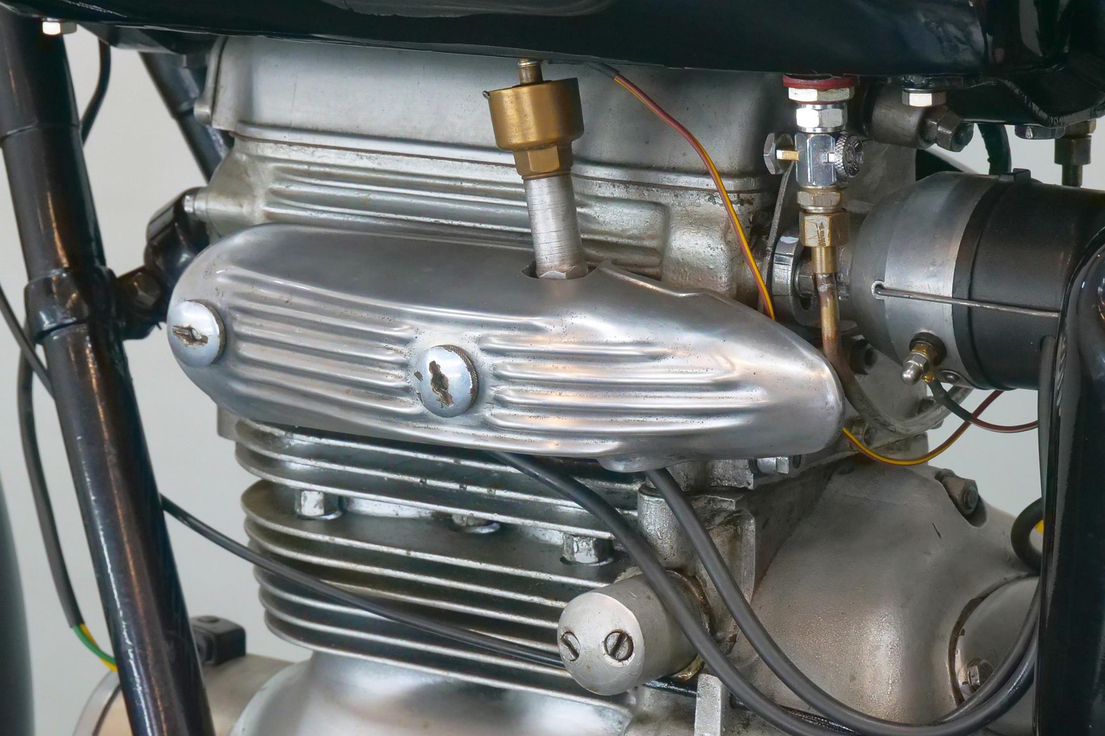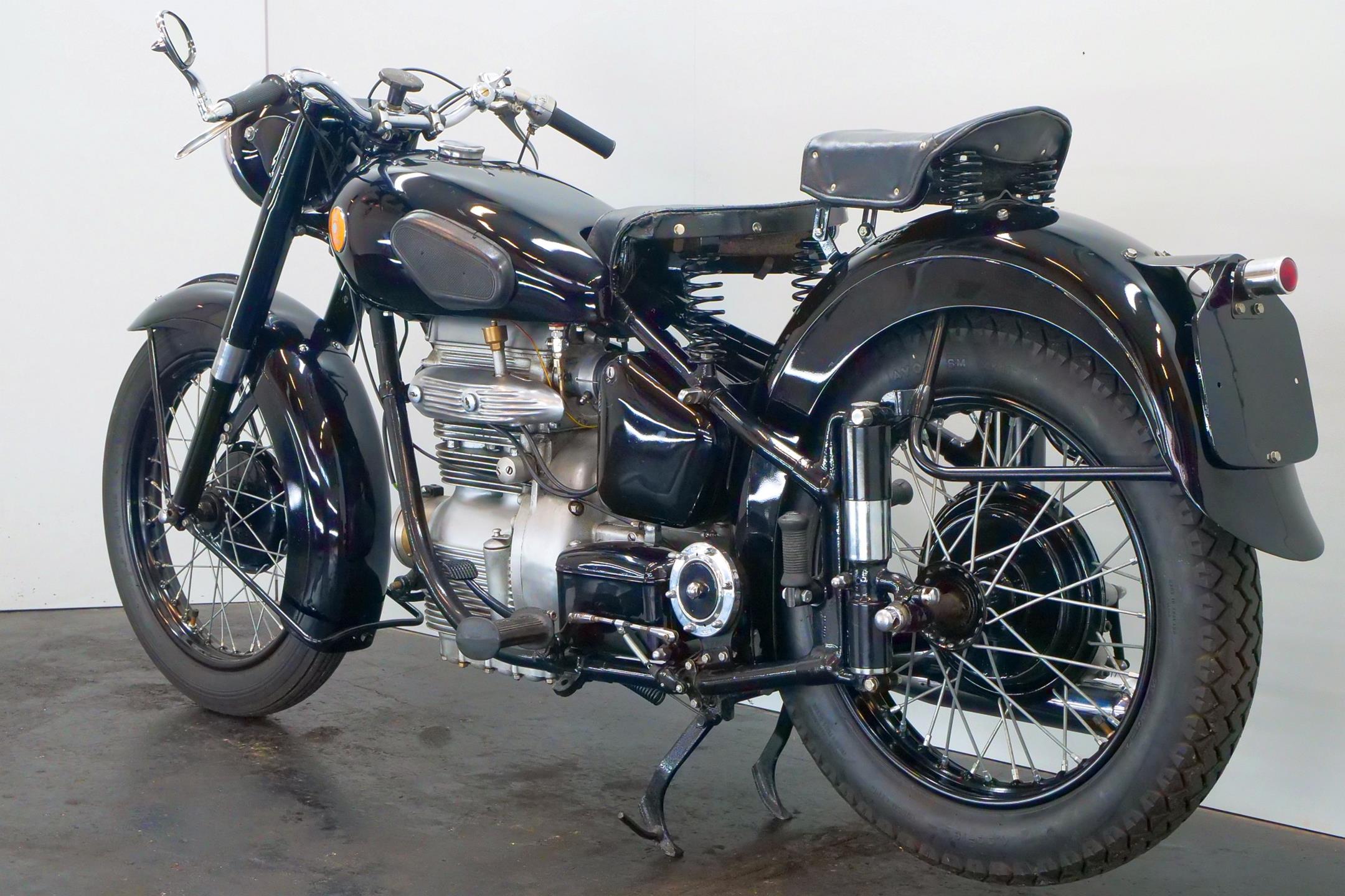 The Sunbeam inline twin was introduced in 1947. A luxury tourer inspired by the pre-war BMW, it was of advanced specification with overhead-camshaft engine, shaft drive, plunger rear suspension, and balloon tyres. A deliberately more conventional, and also lighter and cheaper, S8 version was introduced in 1949. The S8's front fork and 7" brake were now standard BSA components, and there were numerous other changes made in the interests of rationalisation. Never as popular as BSA's more performance orientated models, the gentlemanly S7 and S8 remained in production until 1957.