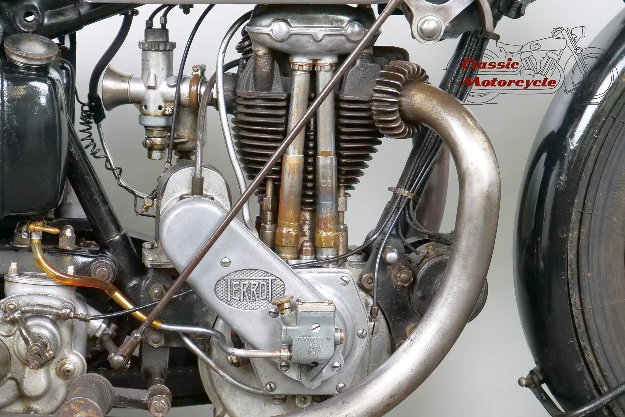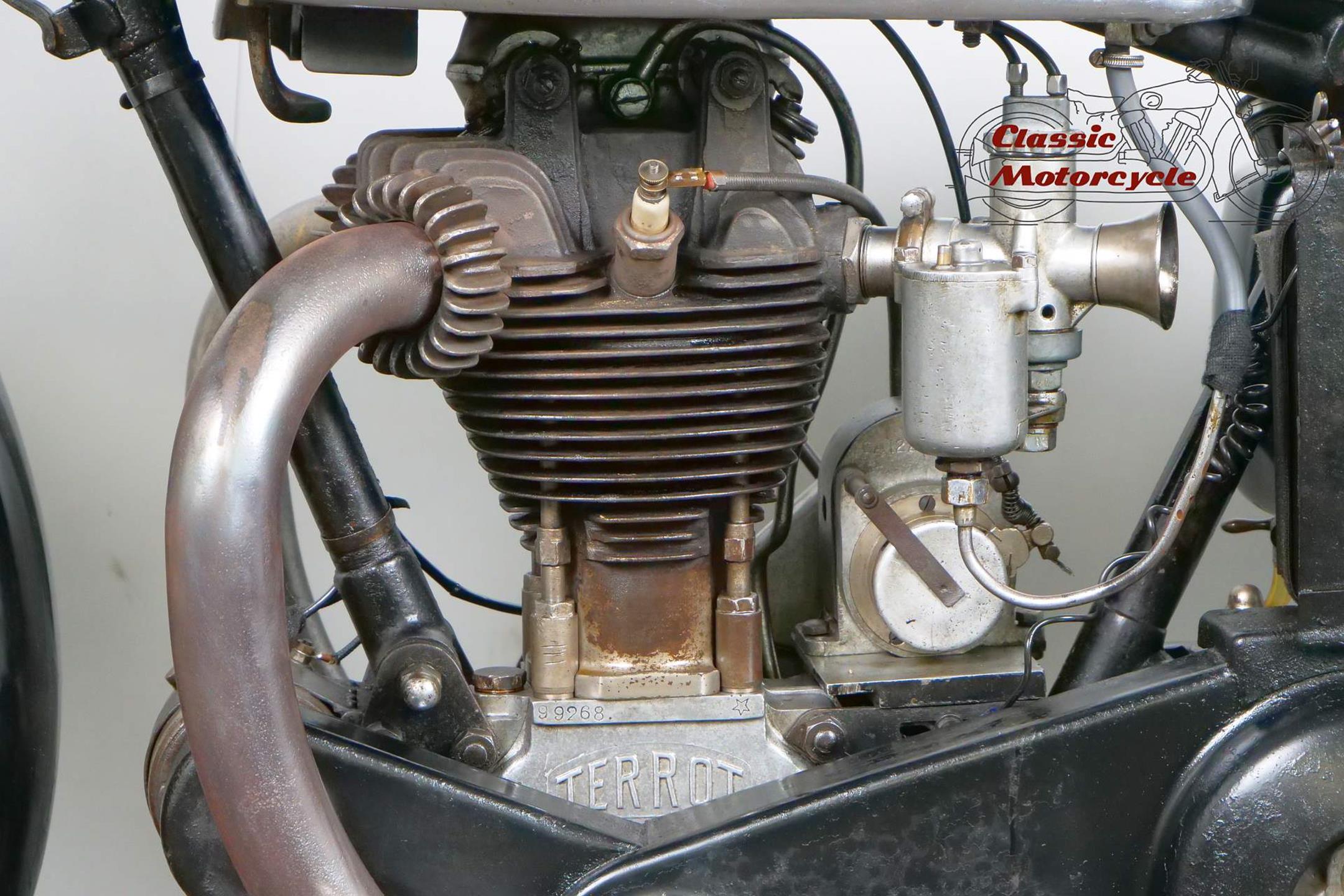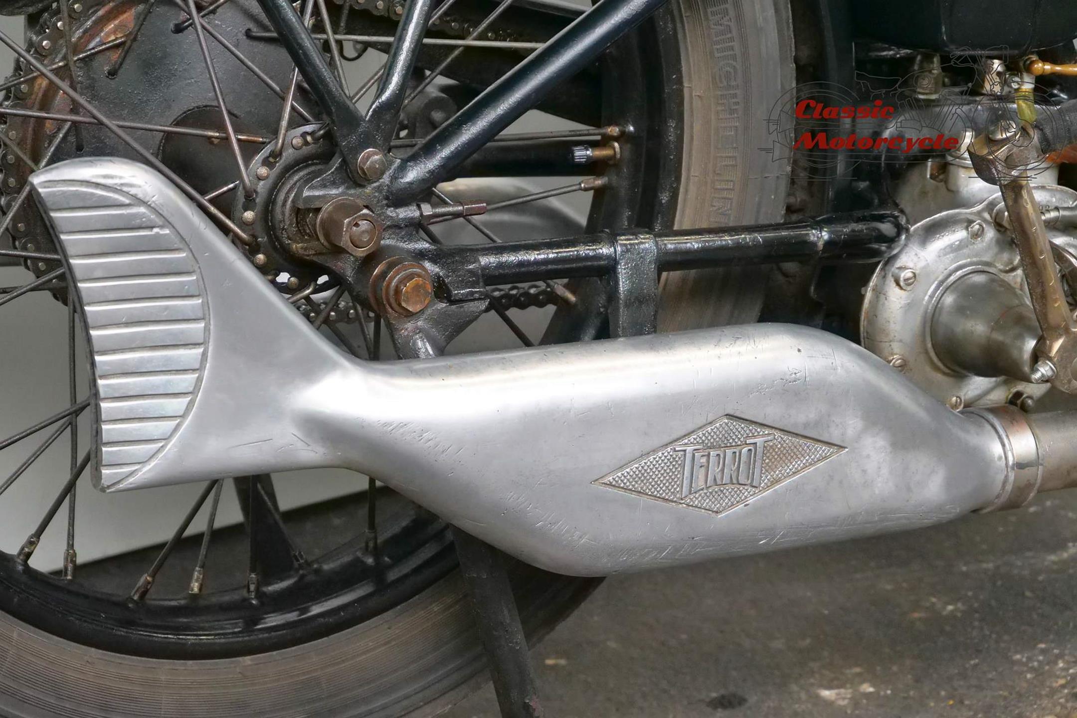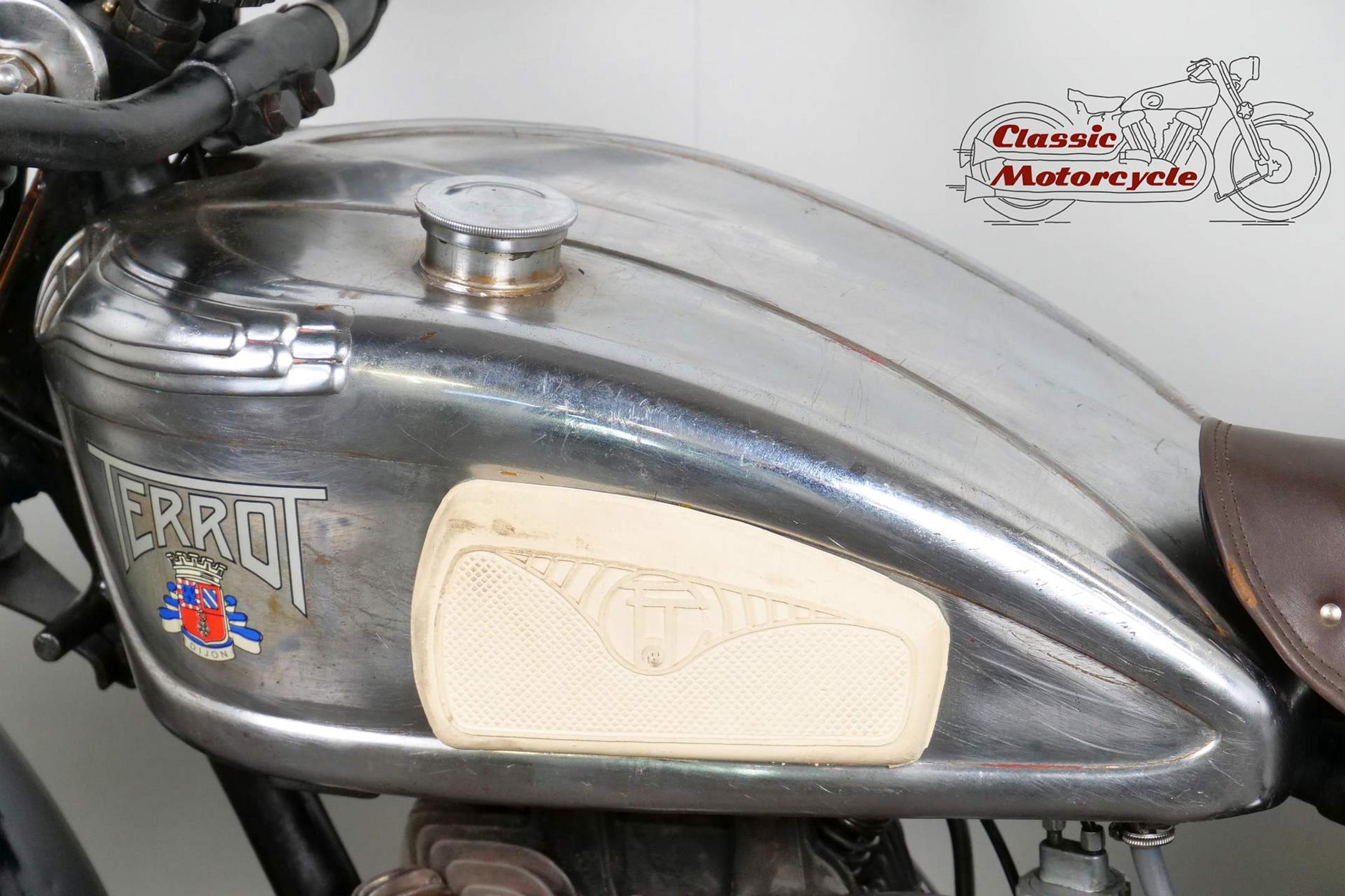 This Terrot is very detail oriented; aluminum exhaust, overhead valve, large headlight, ammeter and a tank decorated with beautiful beading. The bike is a high quality and fast machine from France. It is fully roadworthy and has full papers from France.