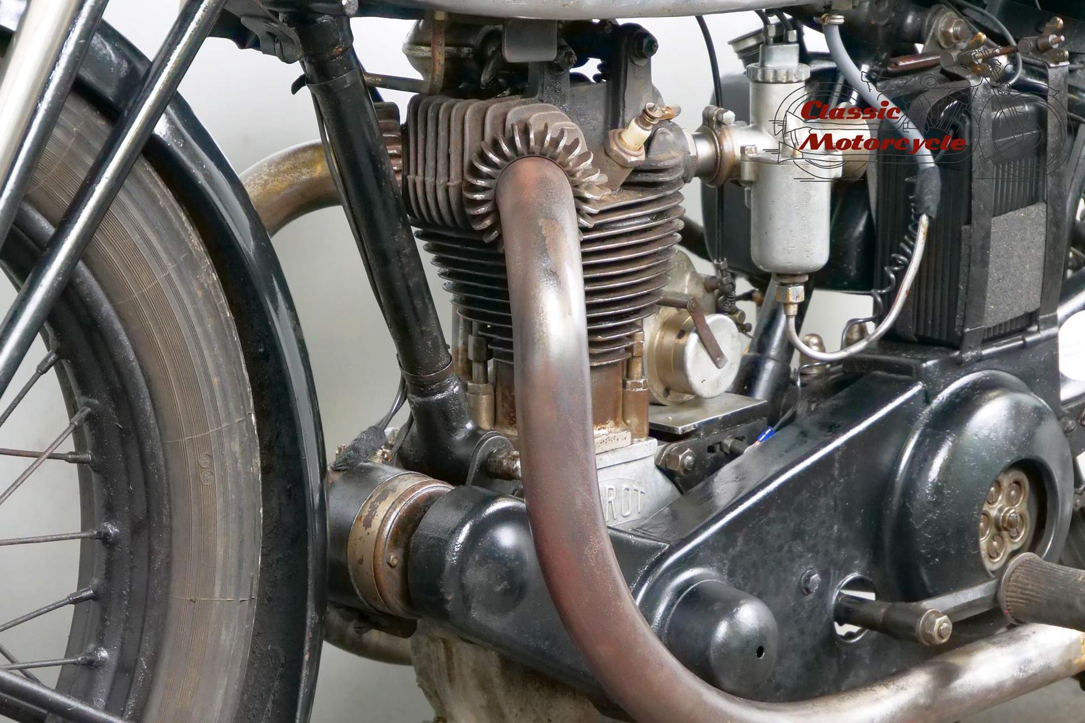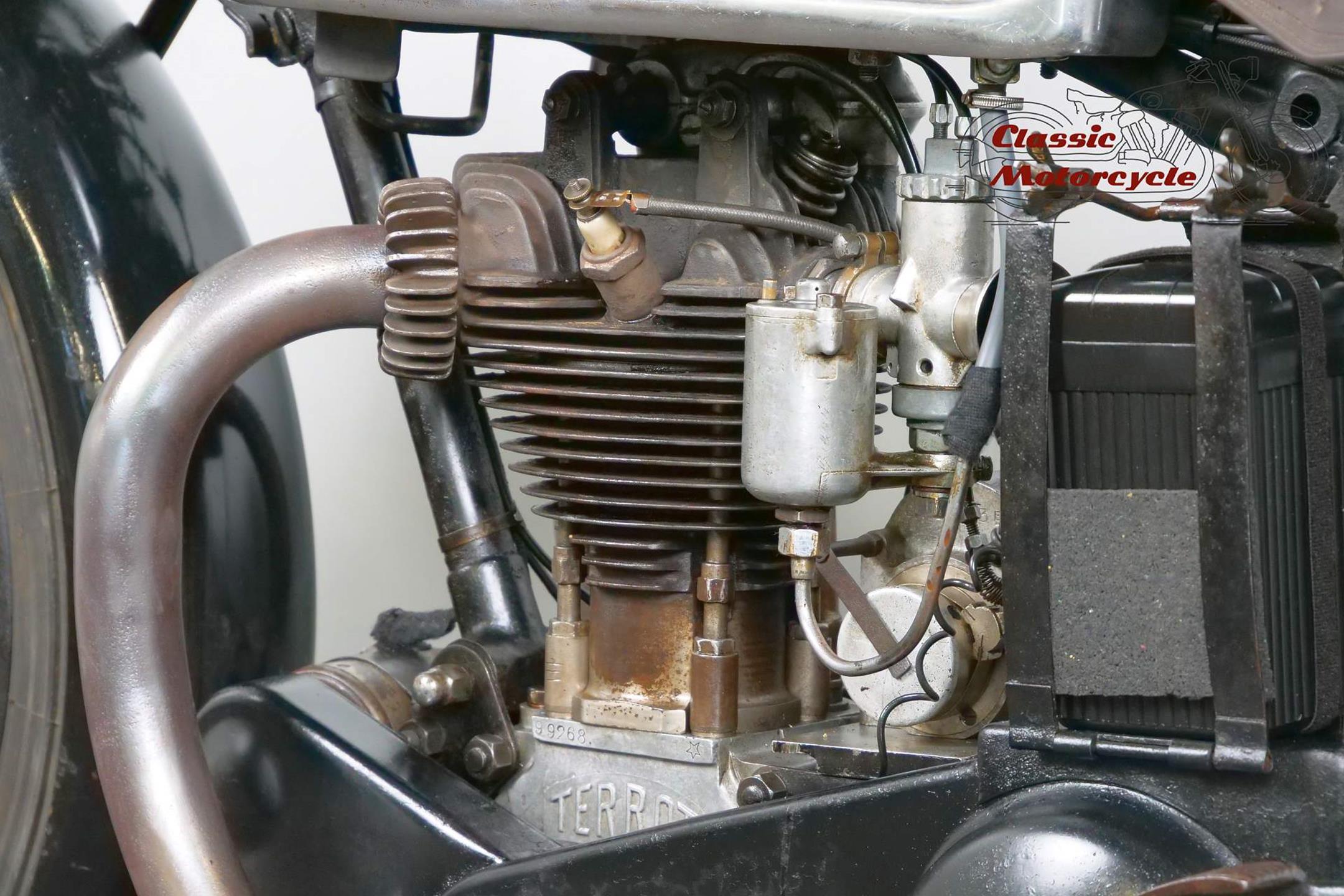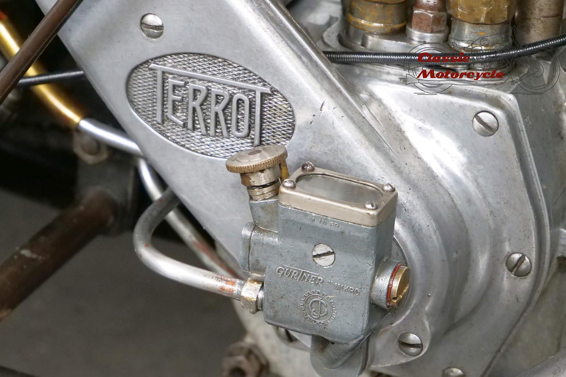 This Terrot is very detail oriented; aluminum exhaust, overhead valve, large headlight, ammeter and a tank decorated with beautiful beading. The bike is a high quality and fast machine from France. It is fully roadworthy and has full papers from France.