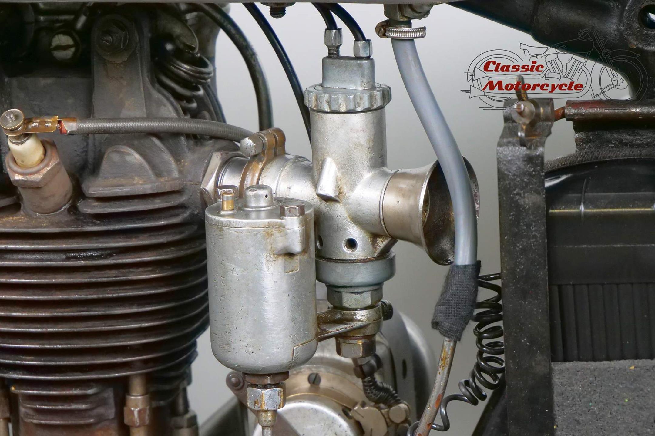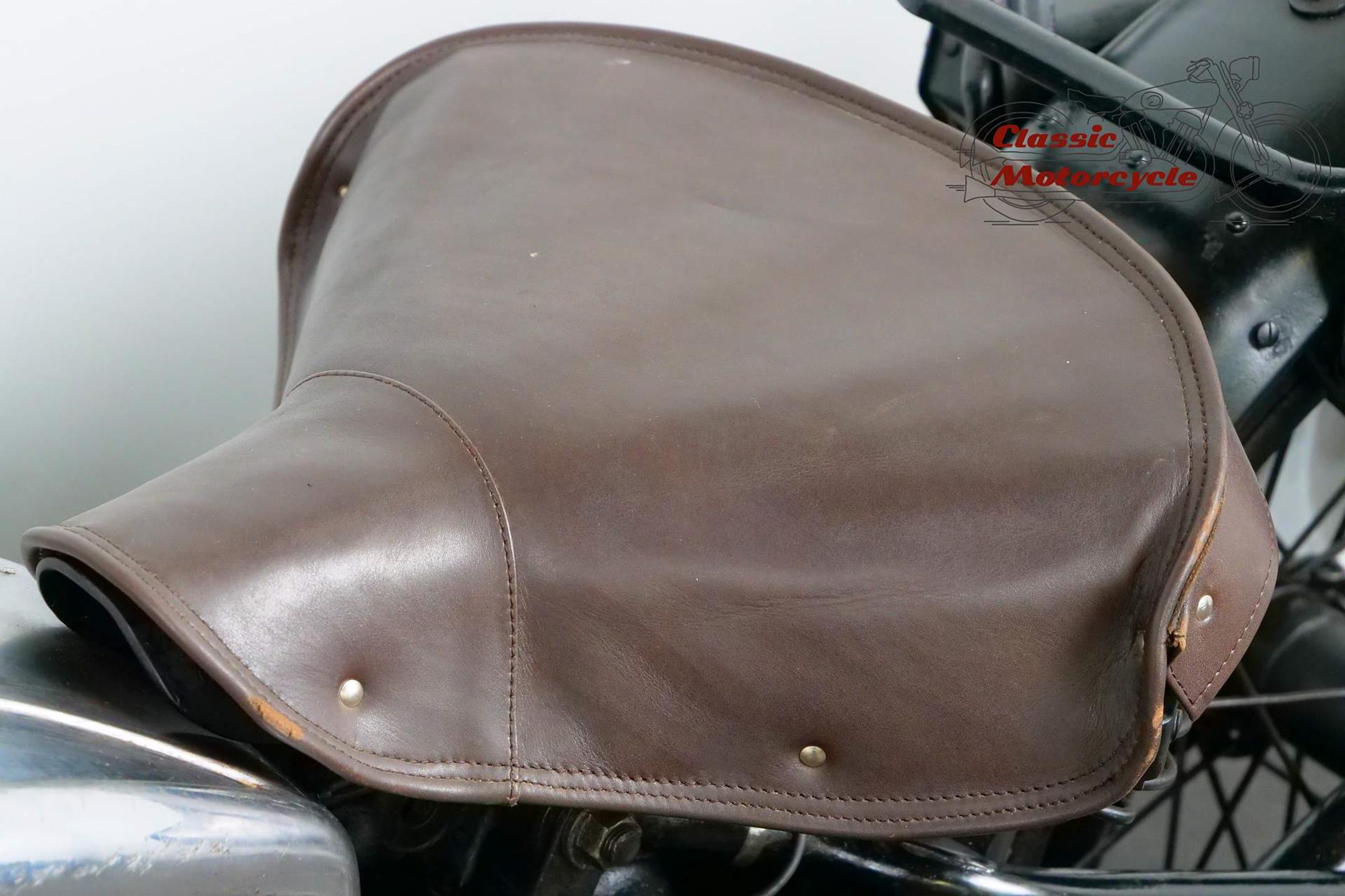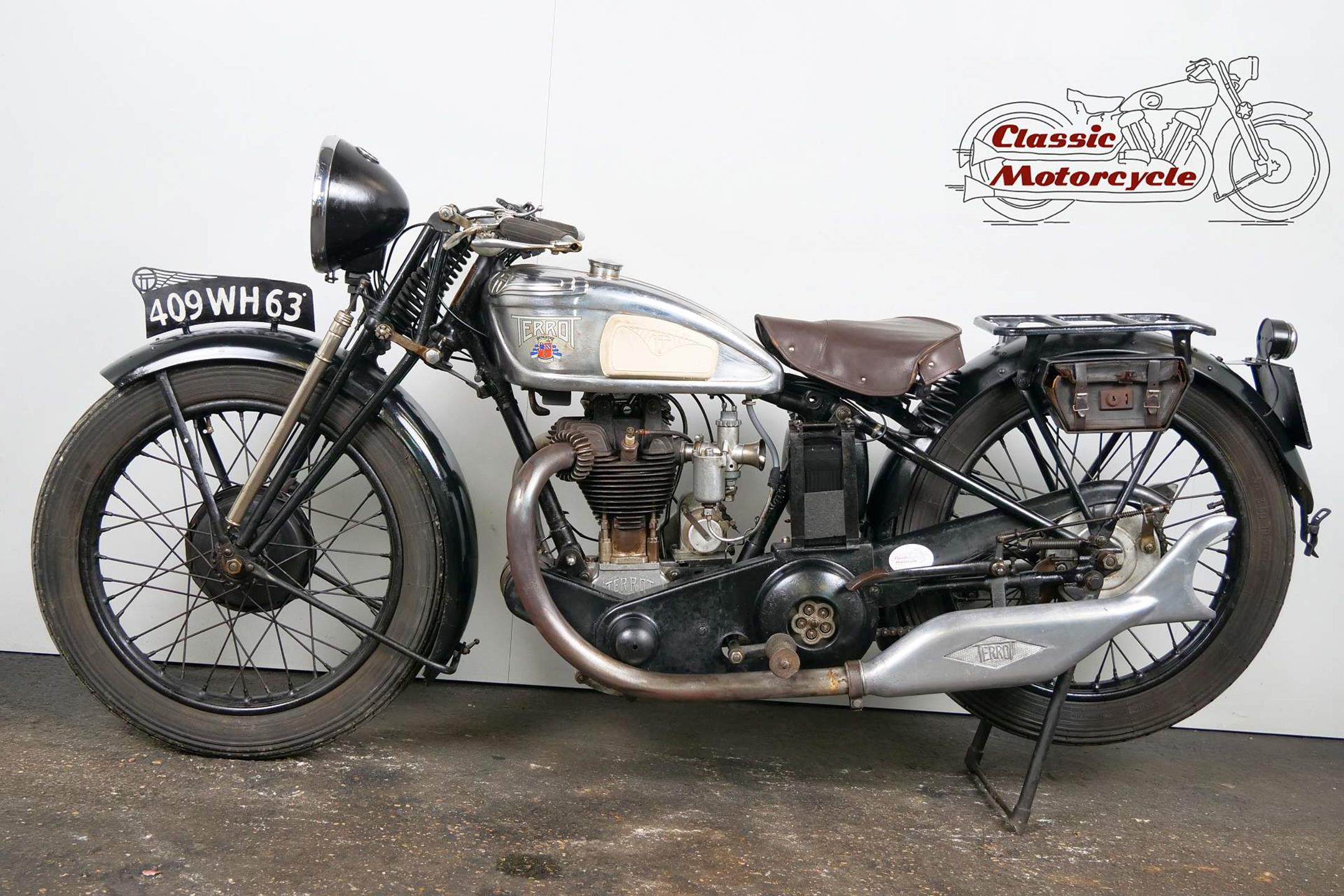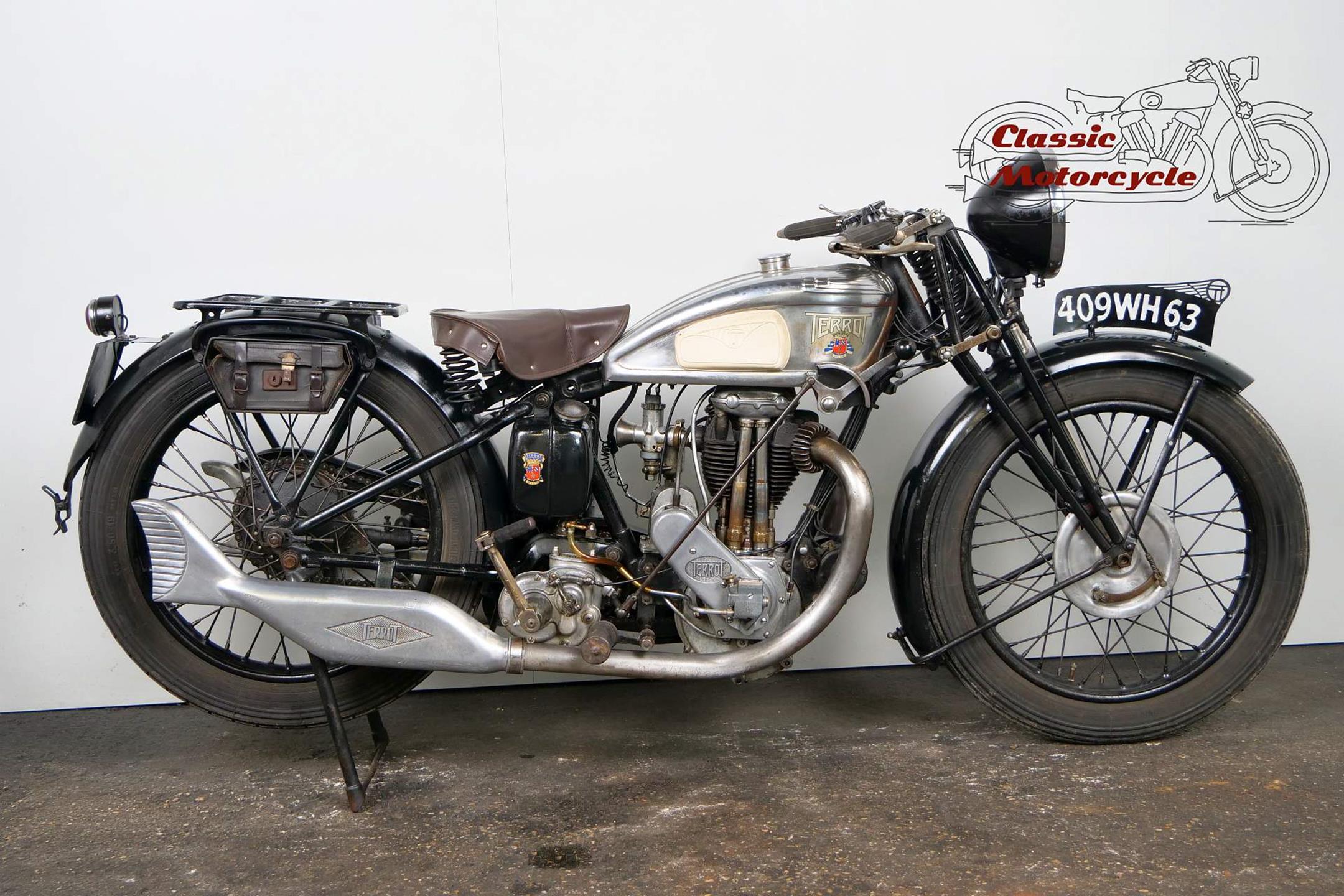This Terrot is very detail oriented; aluminum exhaust, overhead valve, large headlight, ammeter and a tank decorated with beautiful beading. The bike is a high quality and fast machine from France. It is fully roadworthy and has full papers from France.